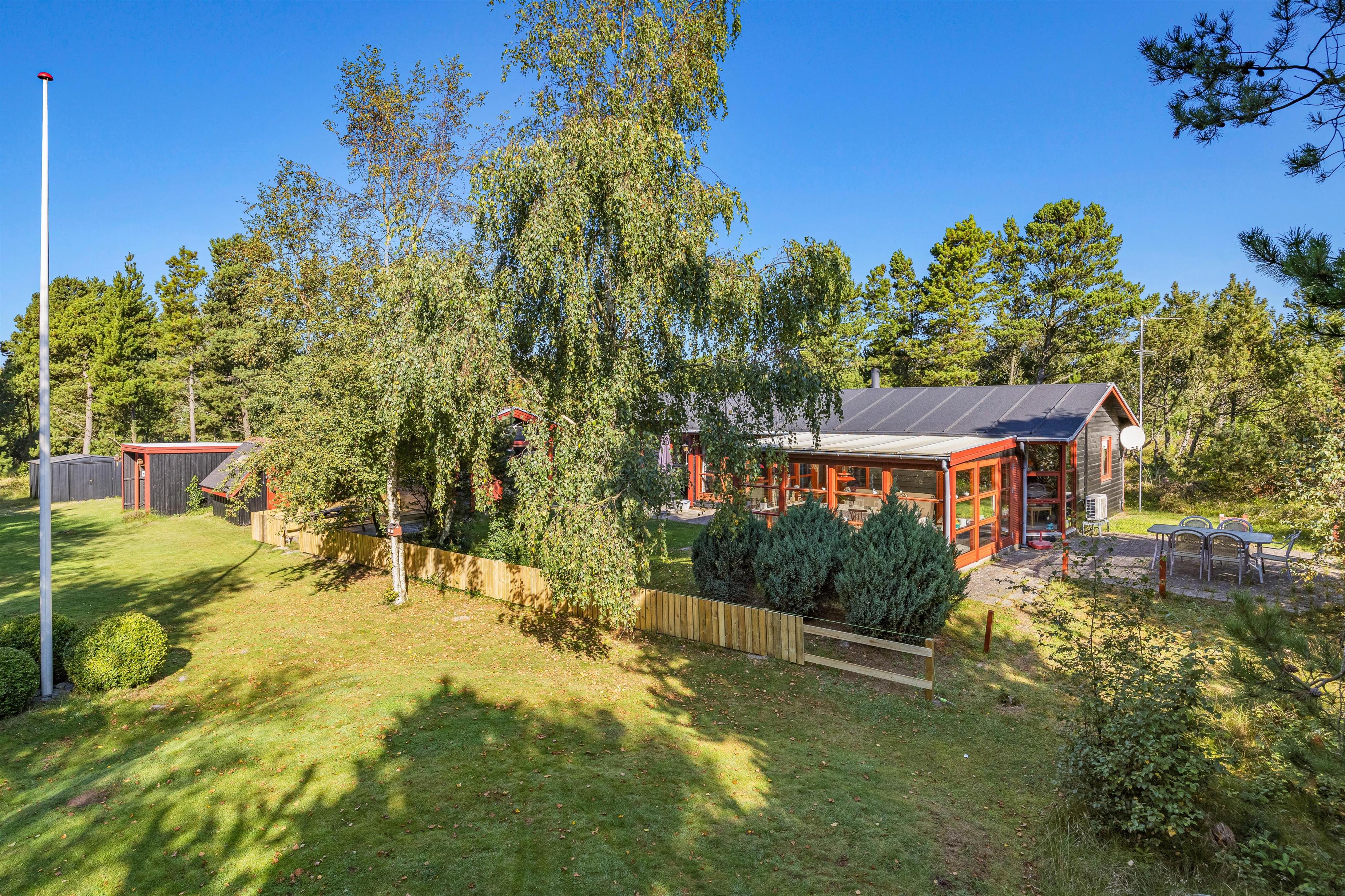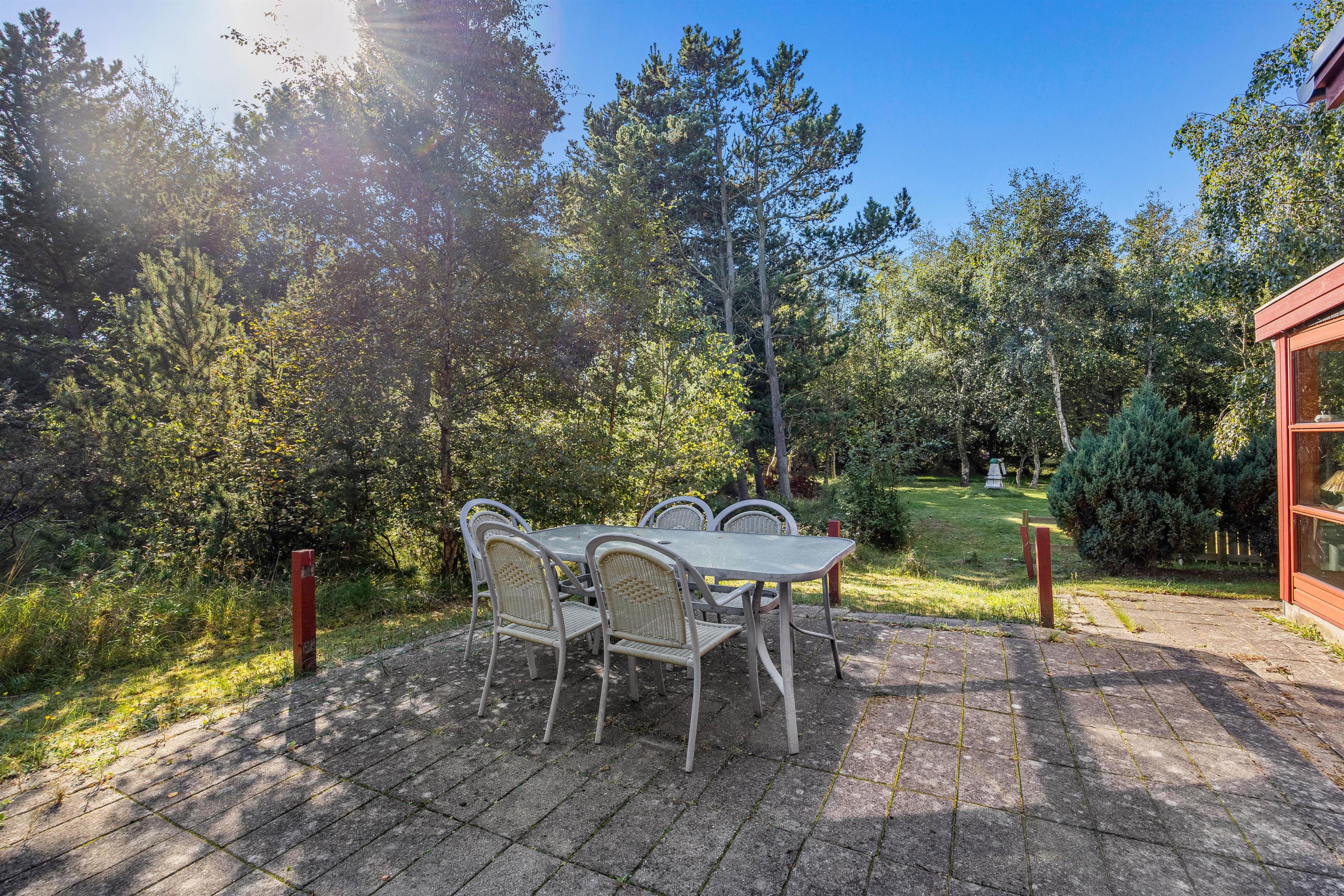 Den 2331 m2 store grund på Hedetoftvej 58 er omkranset af træer, der giver læ på blæsende dage og skygge på de solrige. Dermed er der ingen undskyldning for ikke at rykke ud på en af de to terrasser for at slappe af. Naturgrunden giver masser af plads til leg for hunde og børn, og der er også mulighed for børnene kan gynge og bygge sandslotte i sandkassen.