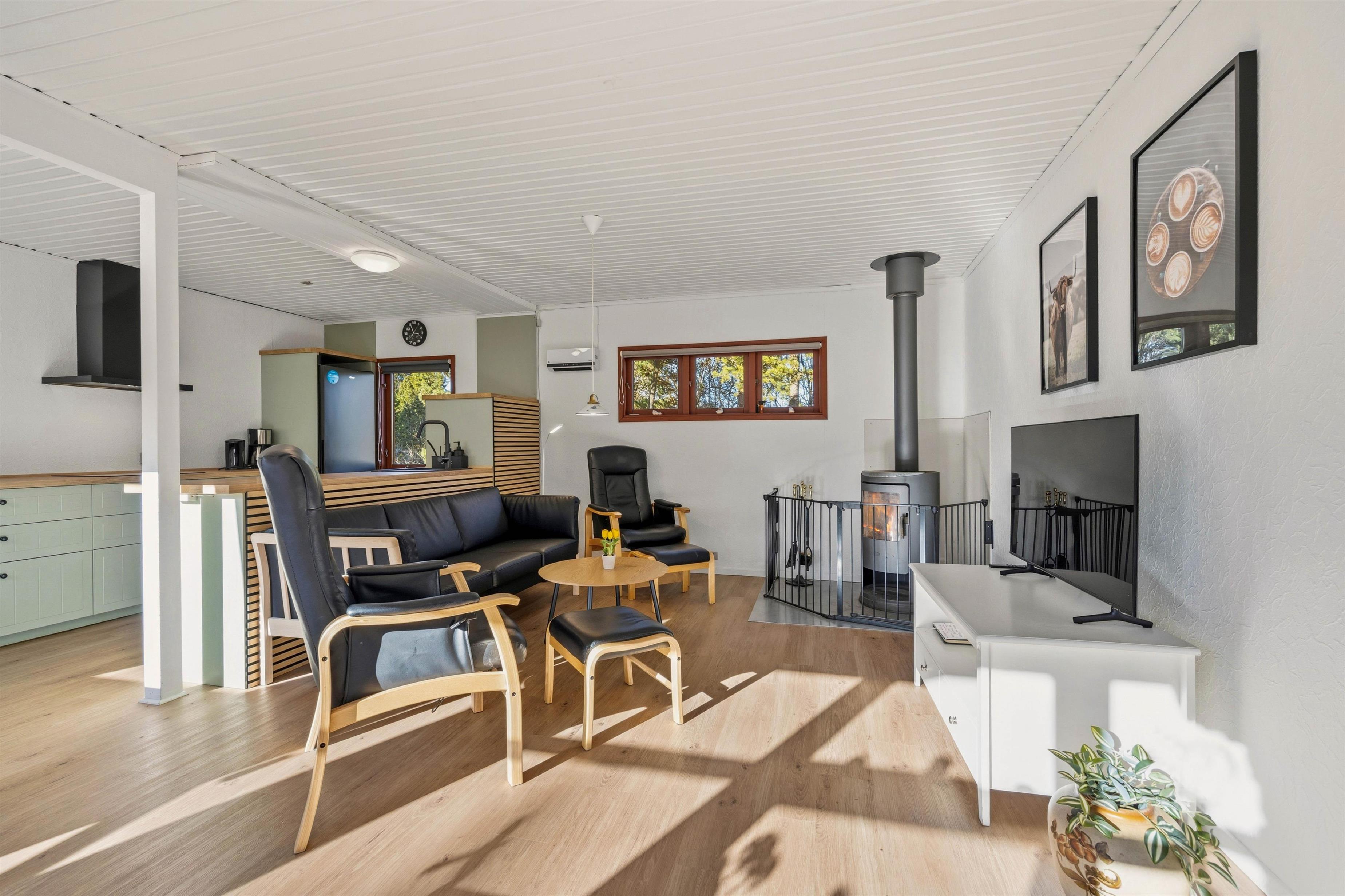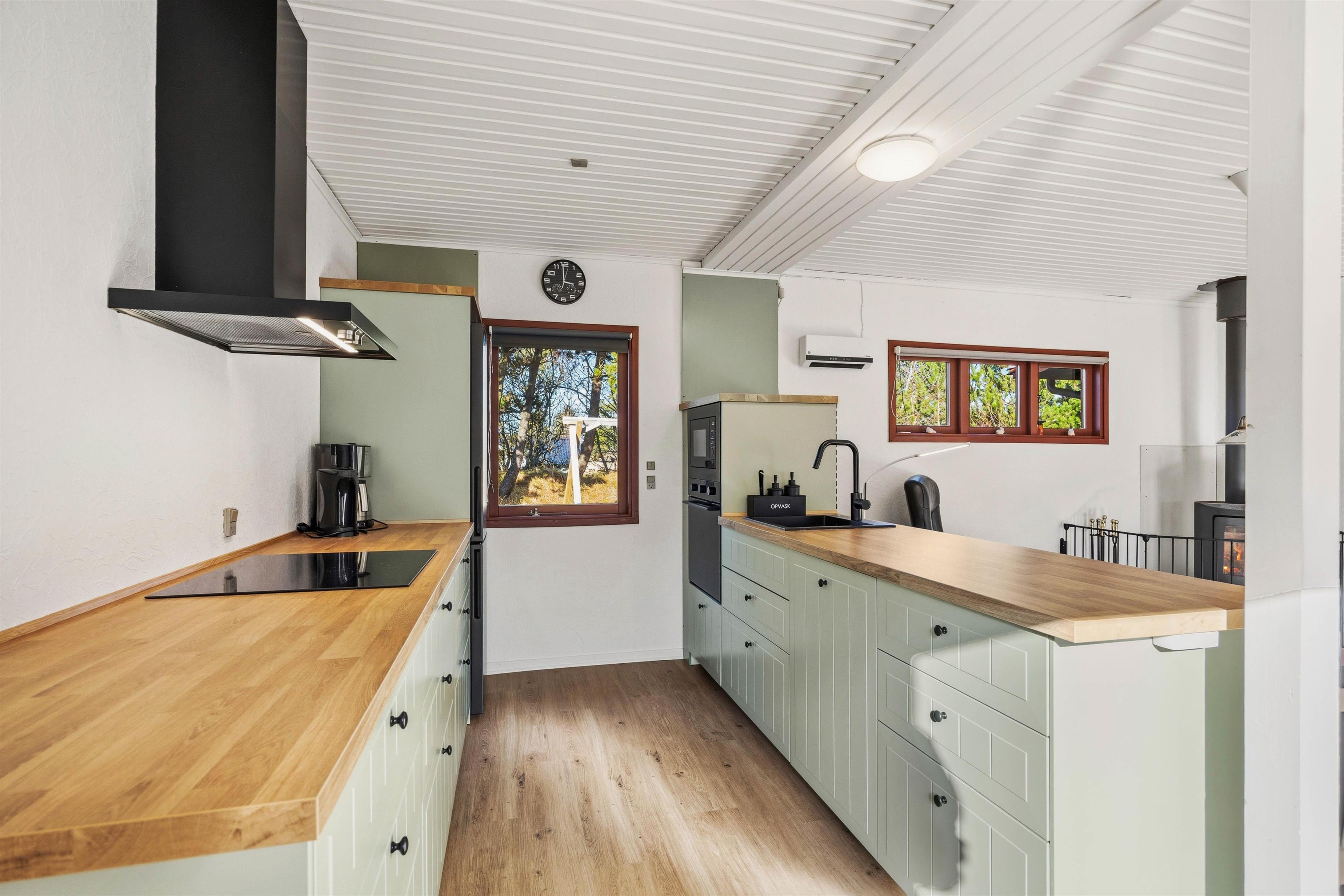 Det blå køkken understreger den personlige indretning med møbler i almuestil og mange små siddekroge. Her kan man nyde det dejlige lys fra de store vinduer, og den afskærmede brændeovn i opholdsstuen bidrager til hyggen, især i vinterhalvåret, når vestenvinden rusker i træerne, der omkranser den store grund.