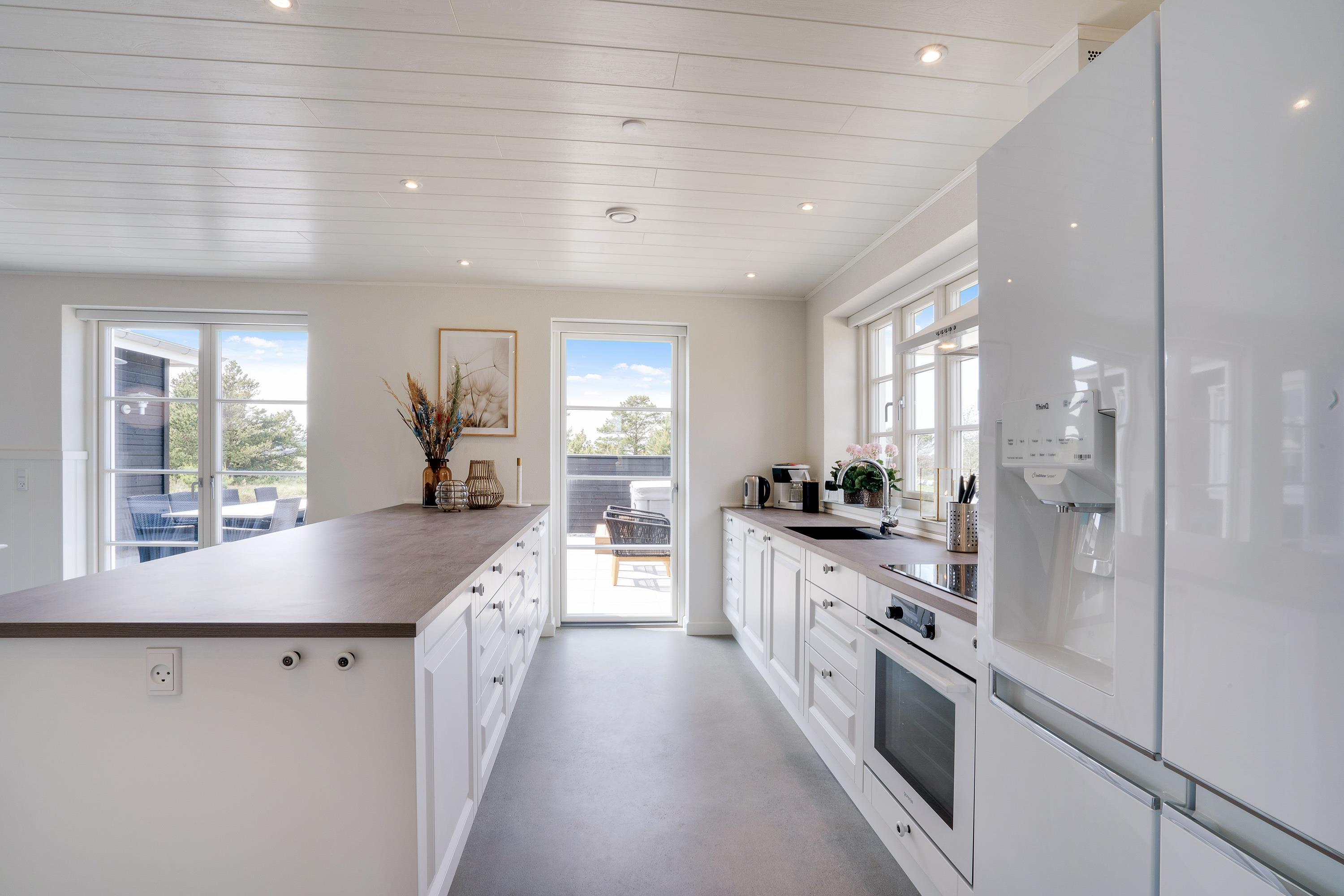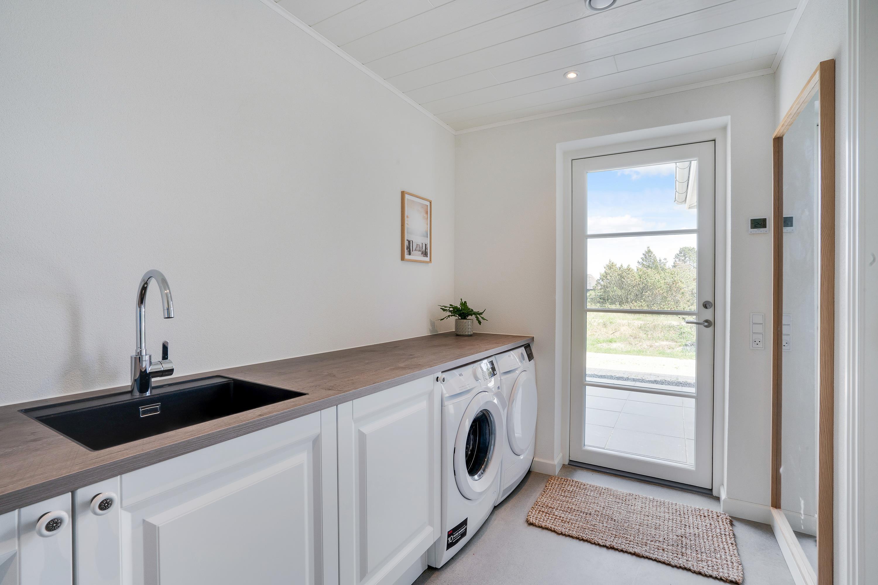 De praktiske faciliteter er selvfølgelig helt i top. Der er opvaskemaskine og en Nespresso-maskine i køkkenet, og entréen er indrettet med vaskemaskine og tørretumbler. Feriehusets to badeværelser, soveværelser og alrum er udstyret med gulvvarme. Desuden sørger den energibesparende varmepumpe for, at I altid har et behageligt indeklima.