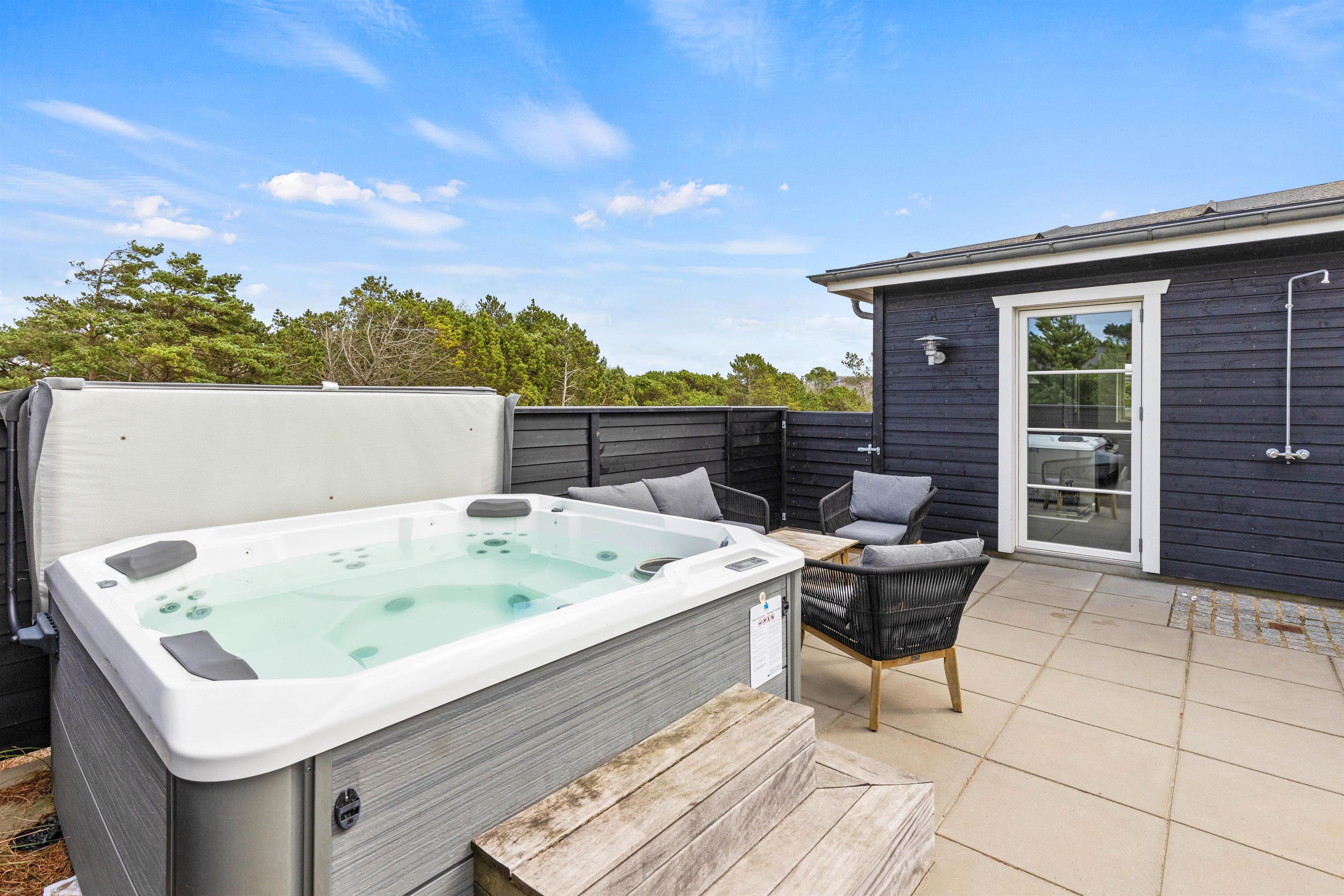 Men det stopper ikke her – træder I ud på terrassen, møder I endnu flere fede faciliteter. Her finder I et lækkert udendørs spabad; jeres helt egen lille wellnesshjørne på terrassen. Udebruseren står fra 1. april til 31. oktober også til jeres rådighed.
