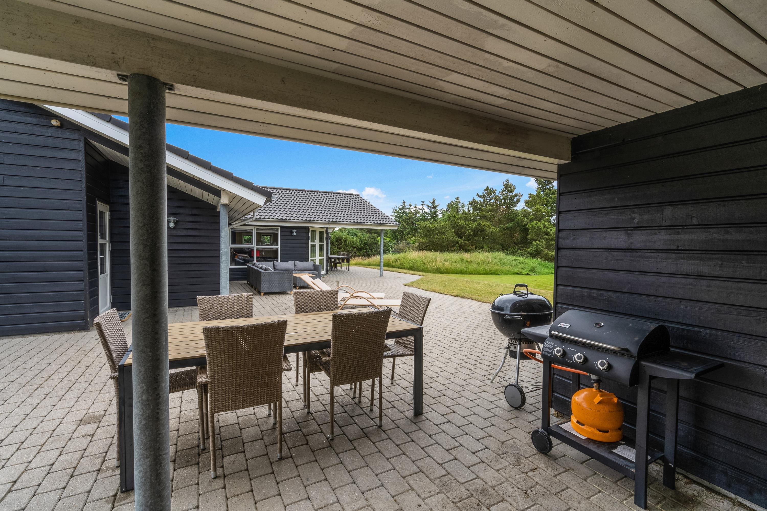 På terrassen har I også mulighed for at lave lækre måltider. Der står både en grill og et udekøkken klar til jer, så feriens kok kan lave lækker mad til jer, som I kan nyde på terrassen. Efter en dukkert i bølgen blå, råder huset også over en udebruser med både varmt og koldt vand, hvor I kan skylle sand og salt af kroppen med fuglesang og solskin.