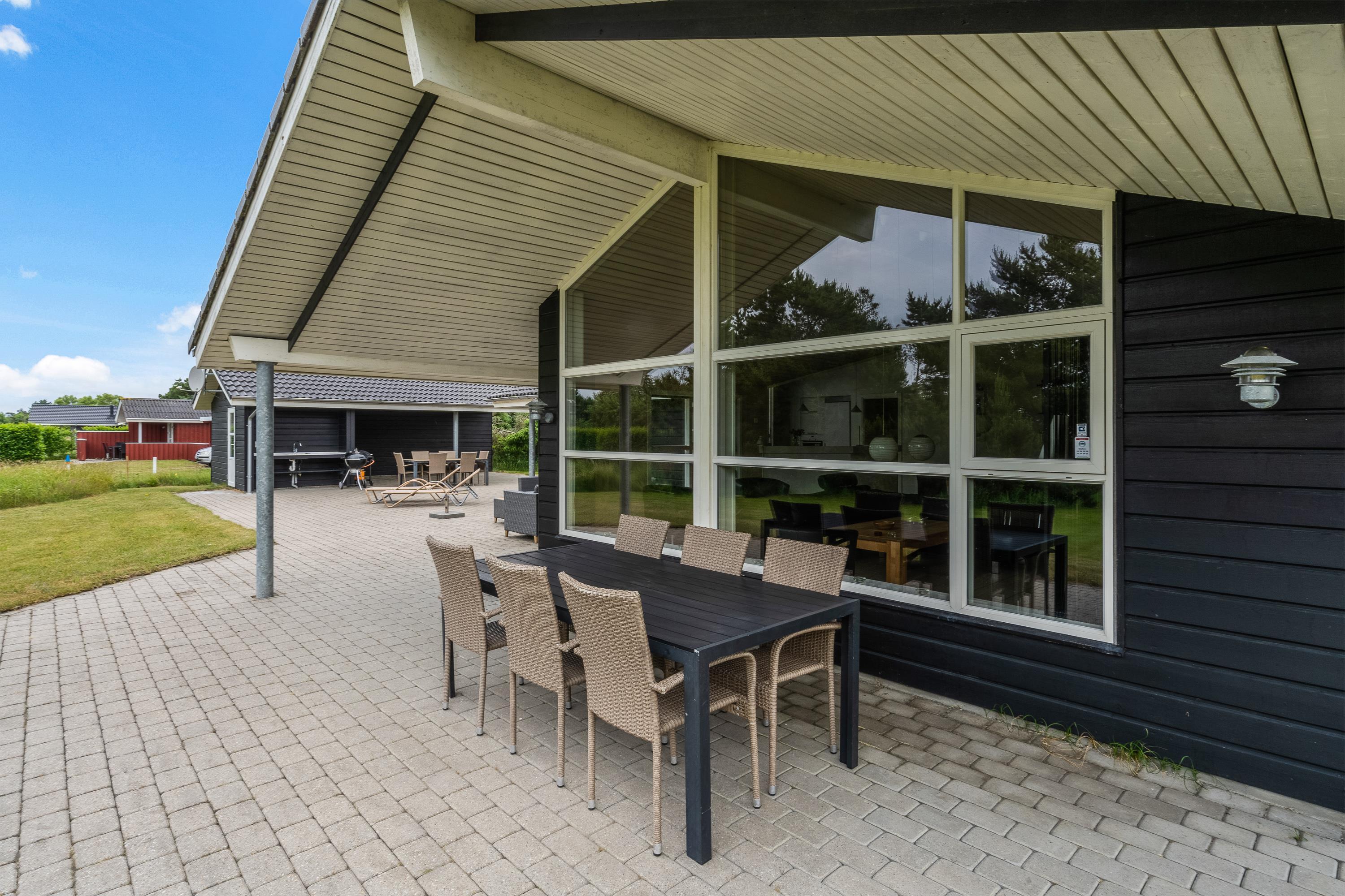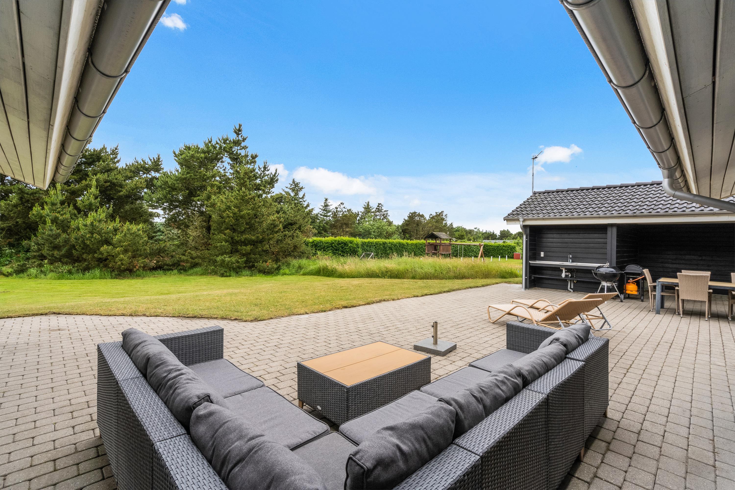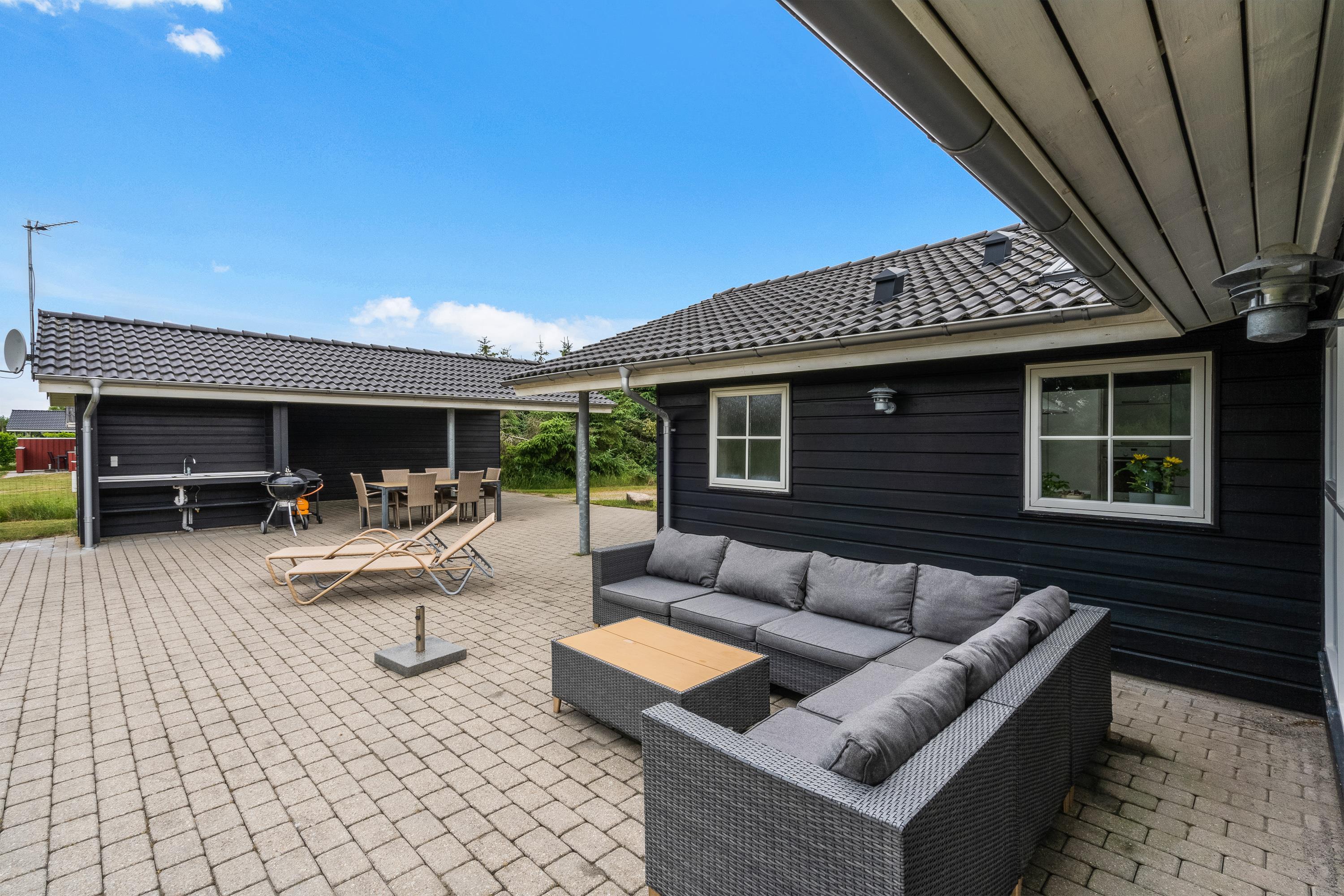 Sommerhuset har et skønt udeområde, hvor I kan tilbringe de varme feriedage. Her finder I en stor terrasse, der er åben og delvist overdækket. Uanset om I vil sidde i solens stråler eller I hellere vil sidde i skygge, har I mulighed for det på terrassen. Både havemøbler og liggestole står til rådighed, så I kan få mest muligt ud af de varme feriedage. Skulle I have lyst til en afkøling, står udebruseren klar fra 1. april til 31. oktober.