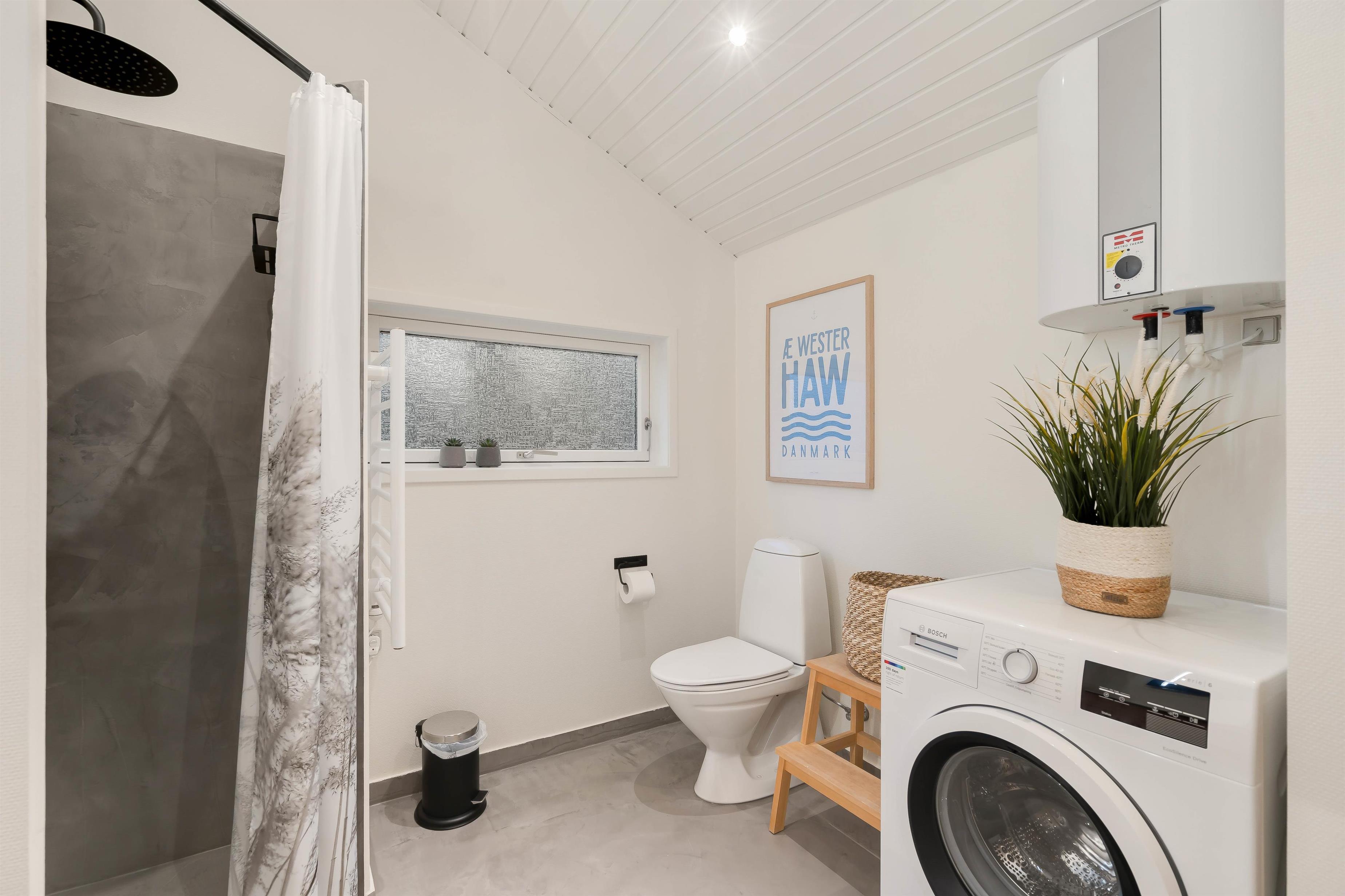 Sommerhusets køkken byder på en opvaskemaskine, så I slipper for at stå med opvasken, efter I har lavet mad. Derudover har I en vaskemaskine på badeværelset, der hjælper jer med at klare tøjvasken i løbet af ferien. Desuden er der en energivenlig varmepumpe i feriehuset, der sørger for et godt indeklima.