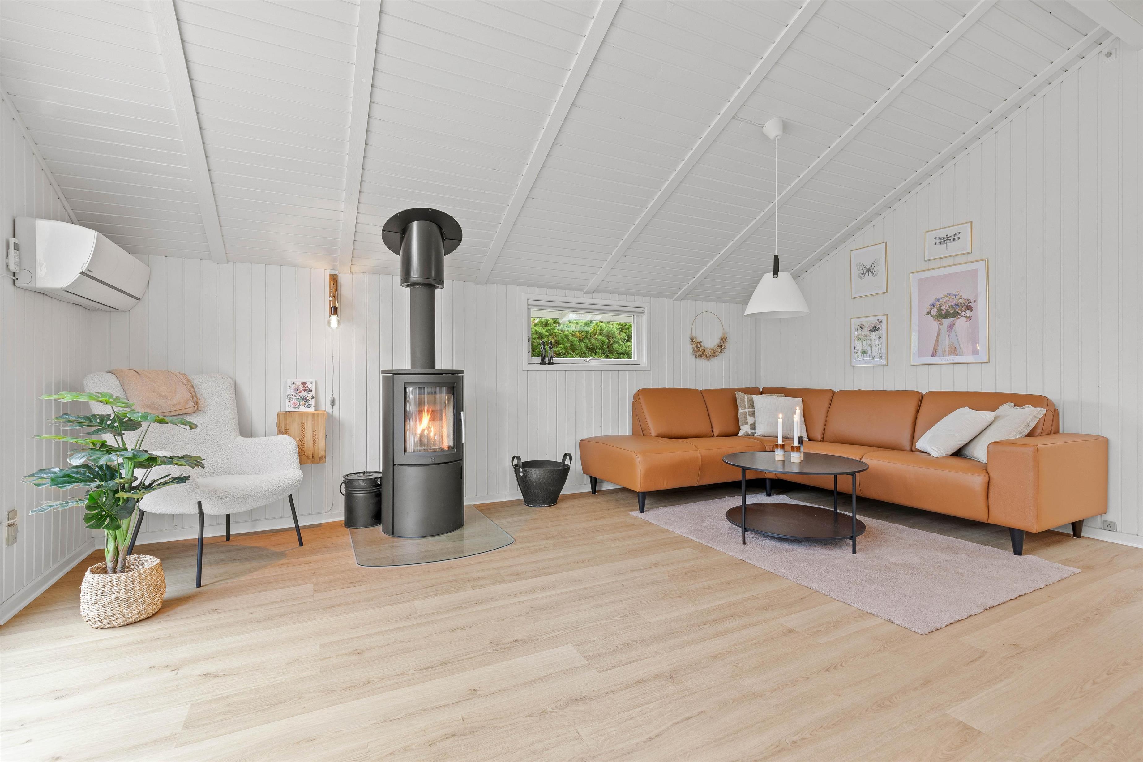 Hyggelig indretning, skønt lysindfald og brændeovn