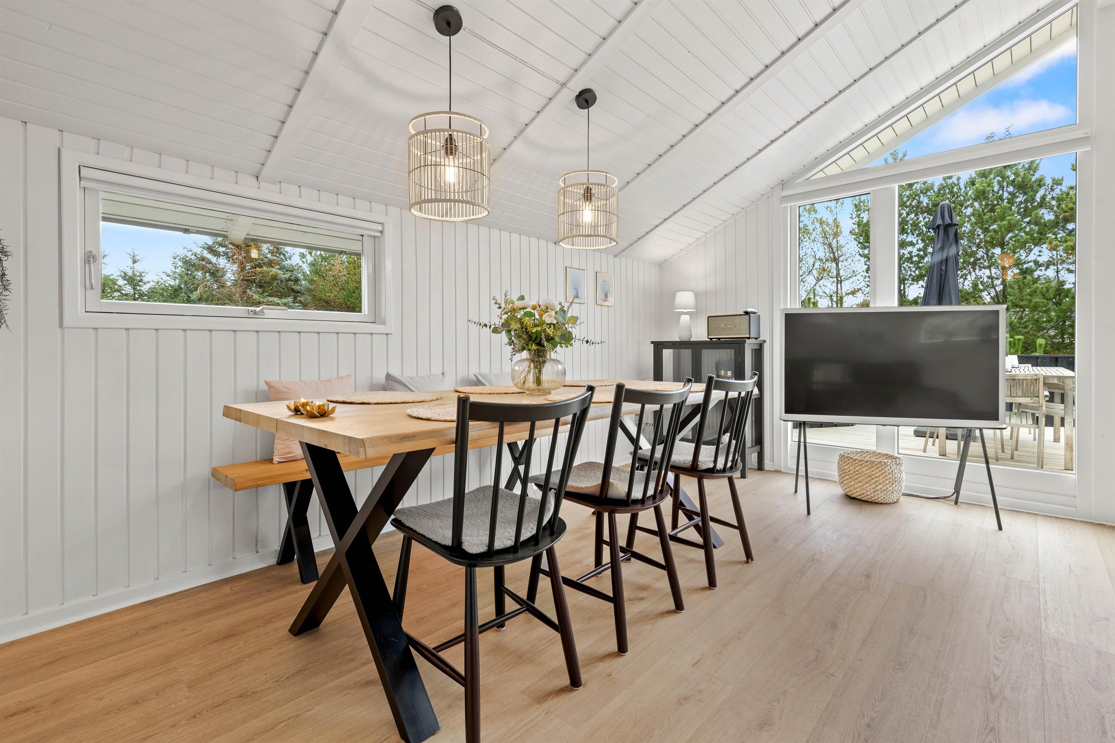 Indendørs i sommerhuset på Harestien 9 i Blåvand, der blev renoveret i 2023, venter jer en hyggelig indretning. Her vil I uden tvivl komme til at føle jer godt tilpas, så snart I træder indenfor.