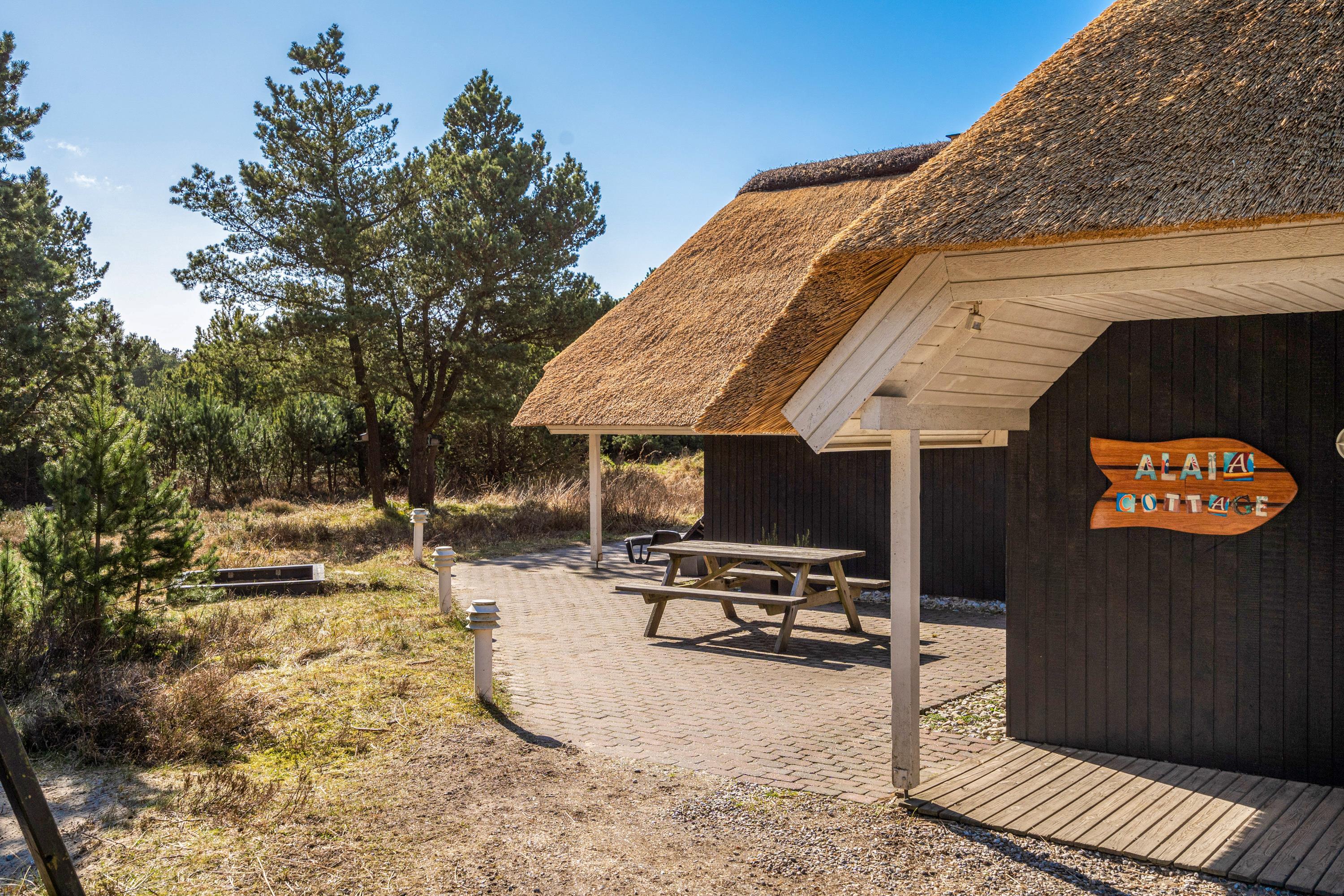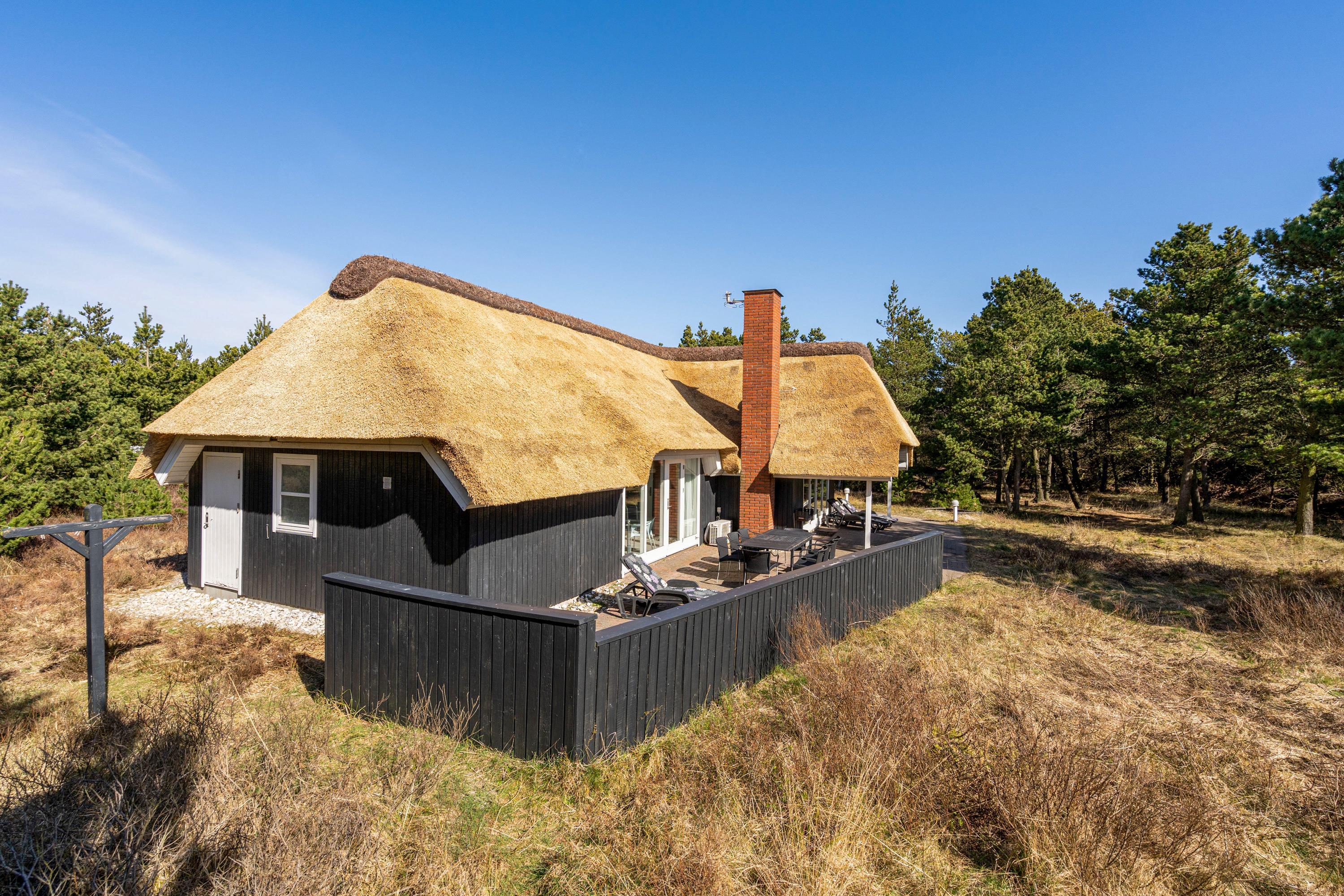 Det stråtækte sommerhus fremstår indbydende og rummeligt. Her er der god plads til 8 personer.