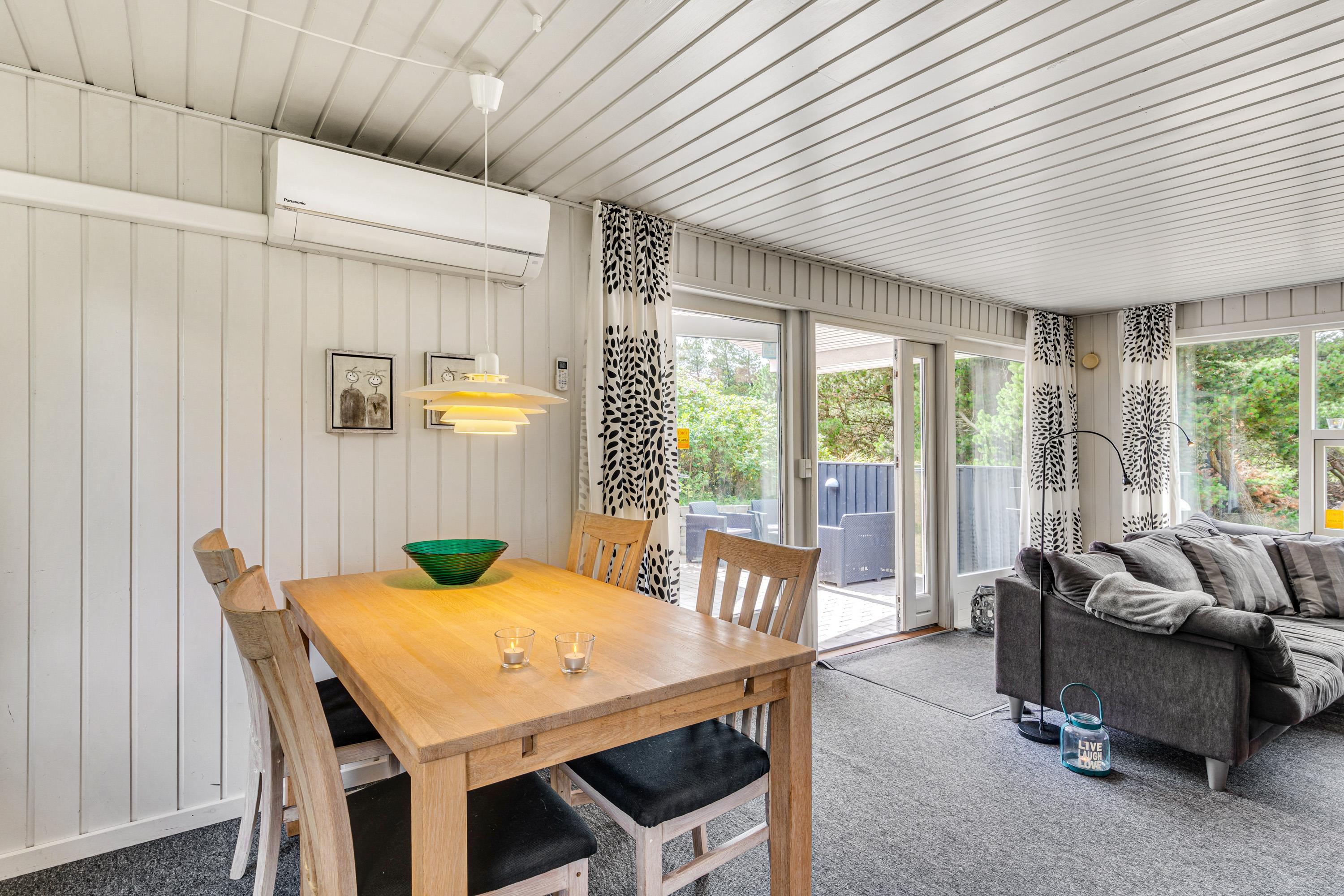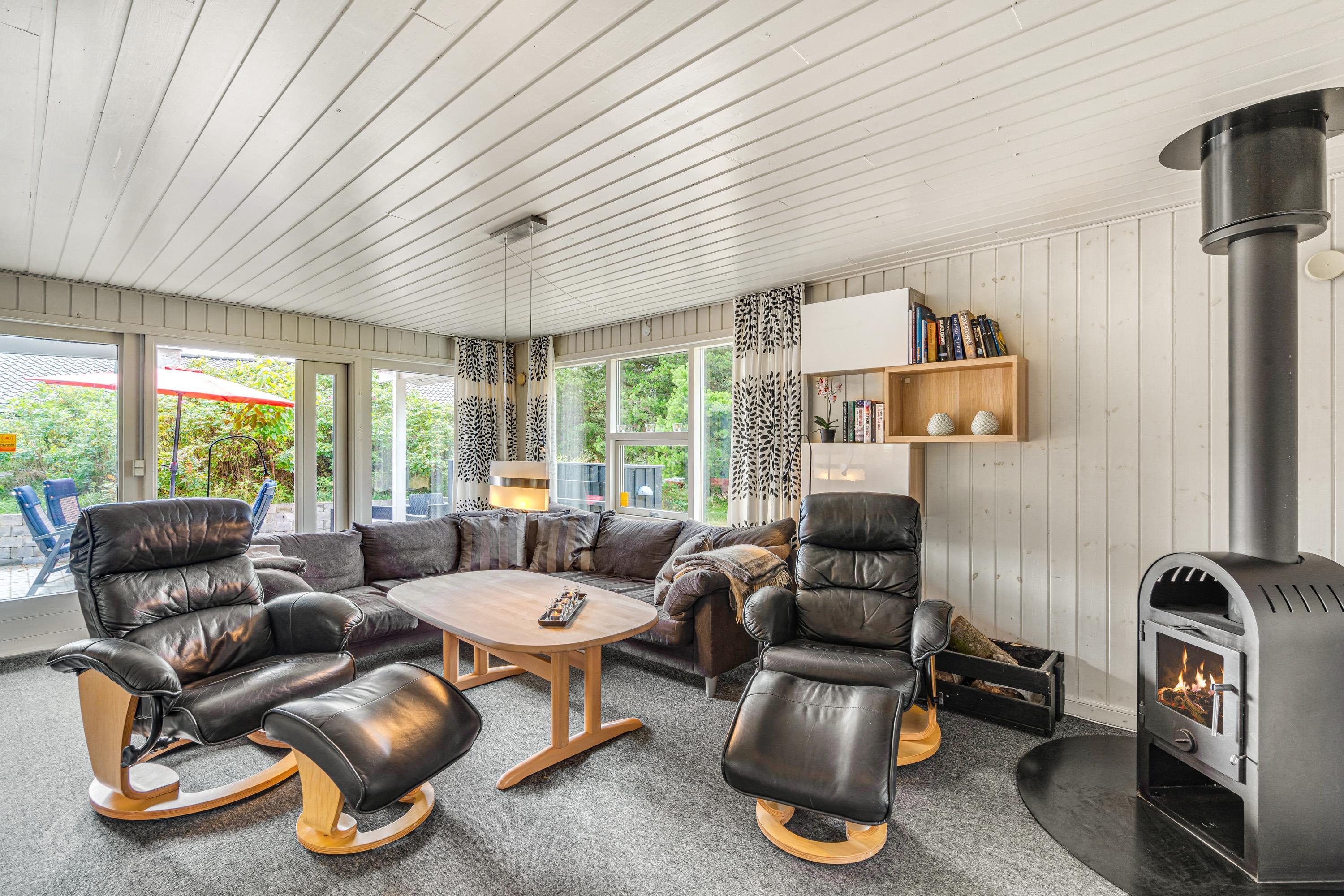 Alrummet er hjertet i sommerhuset, og her kan I samles til mange hyggelige feriestunder – blandt andet med jeres yndlingsfilm, som I kan streame via Chromecasten. I stuen står der også en brændeovn, der understreger den hyggelige feriestemning med sine knitrende flammer. Brændeovnen sørger også for ekstra varme i sommerhuset, der ellers opvarmes af en energivenlig varmepumpe.