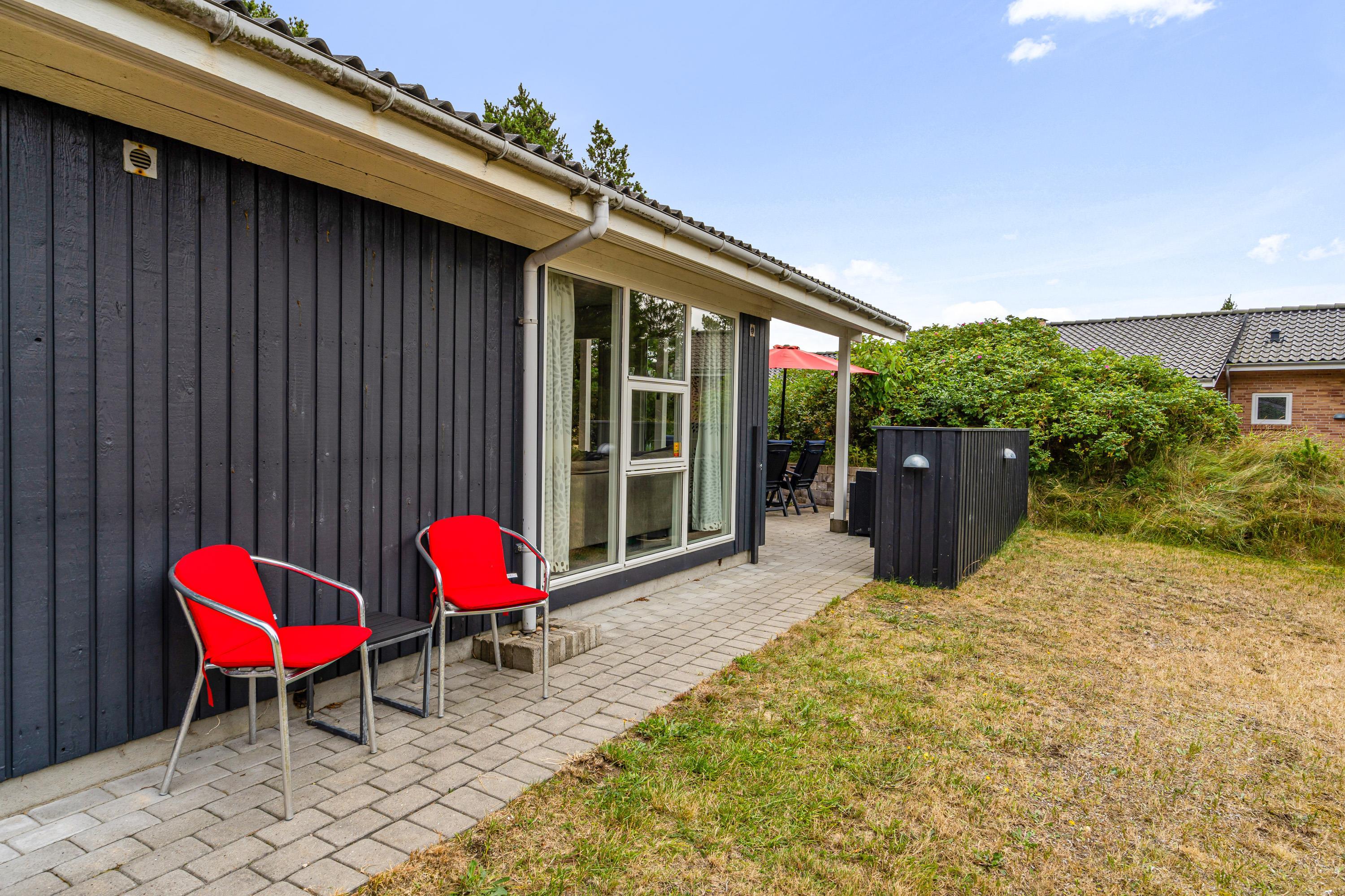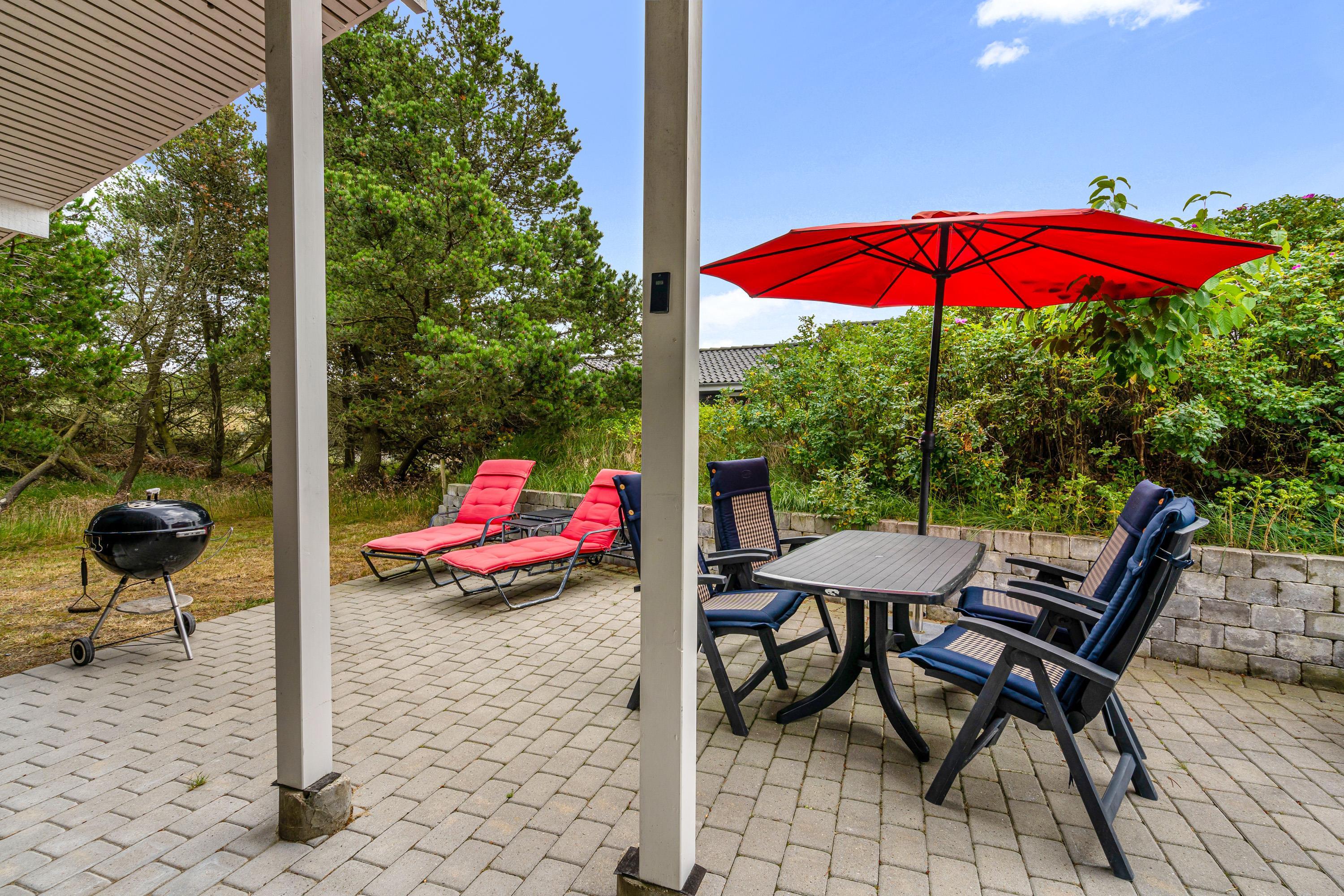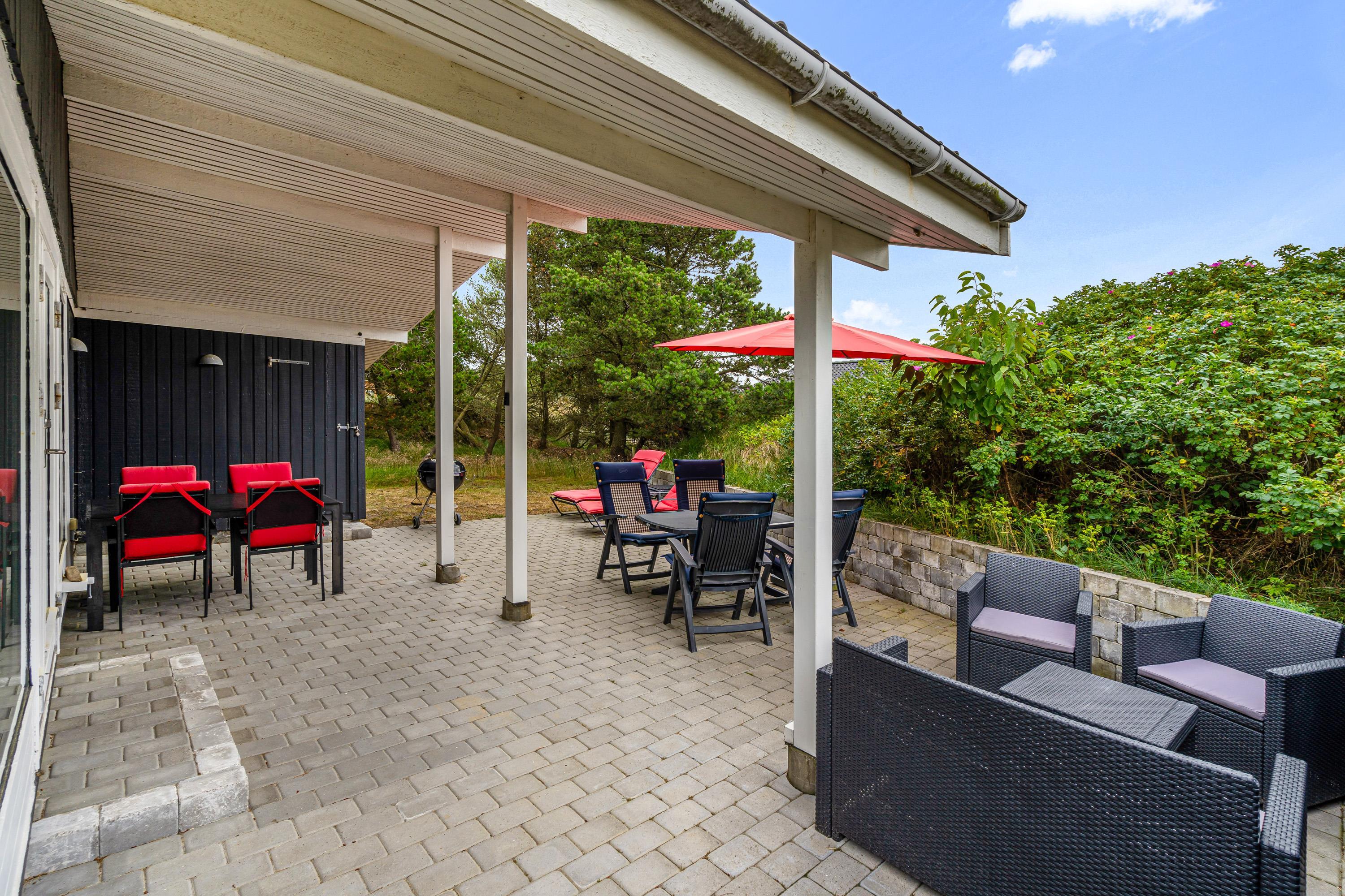 På sommerhusets udeområde har I en dejlig terrasse, der er afskærmet og delvist overdækket. Det er oplagt at søge ud på terrassen på de varme feriedage, hvor der står både havemøbler og liggestole klar til jer.
