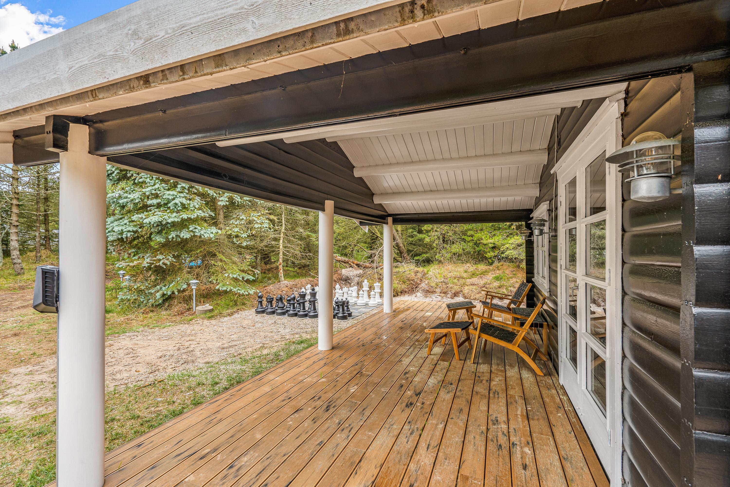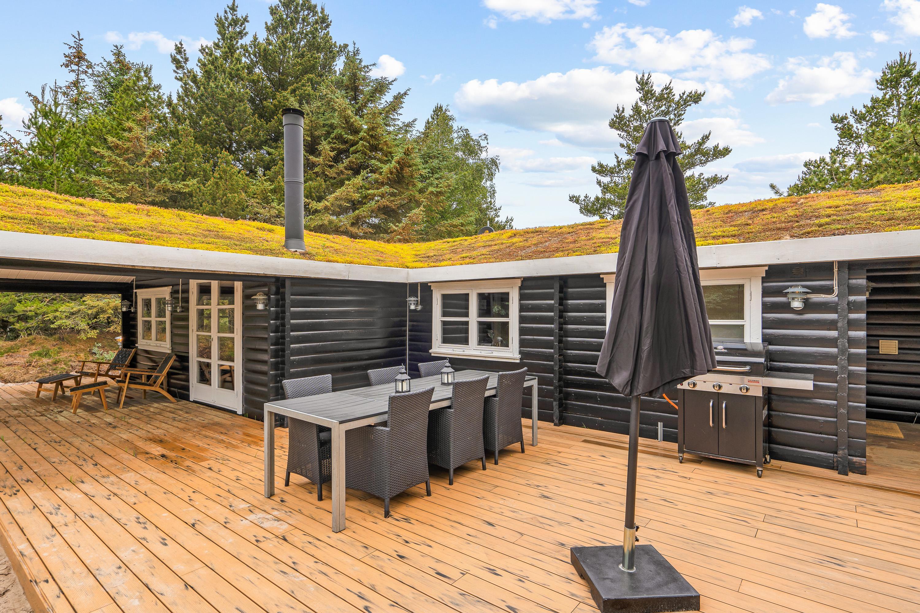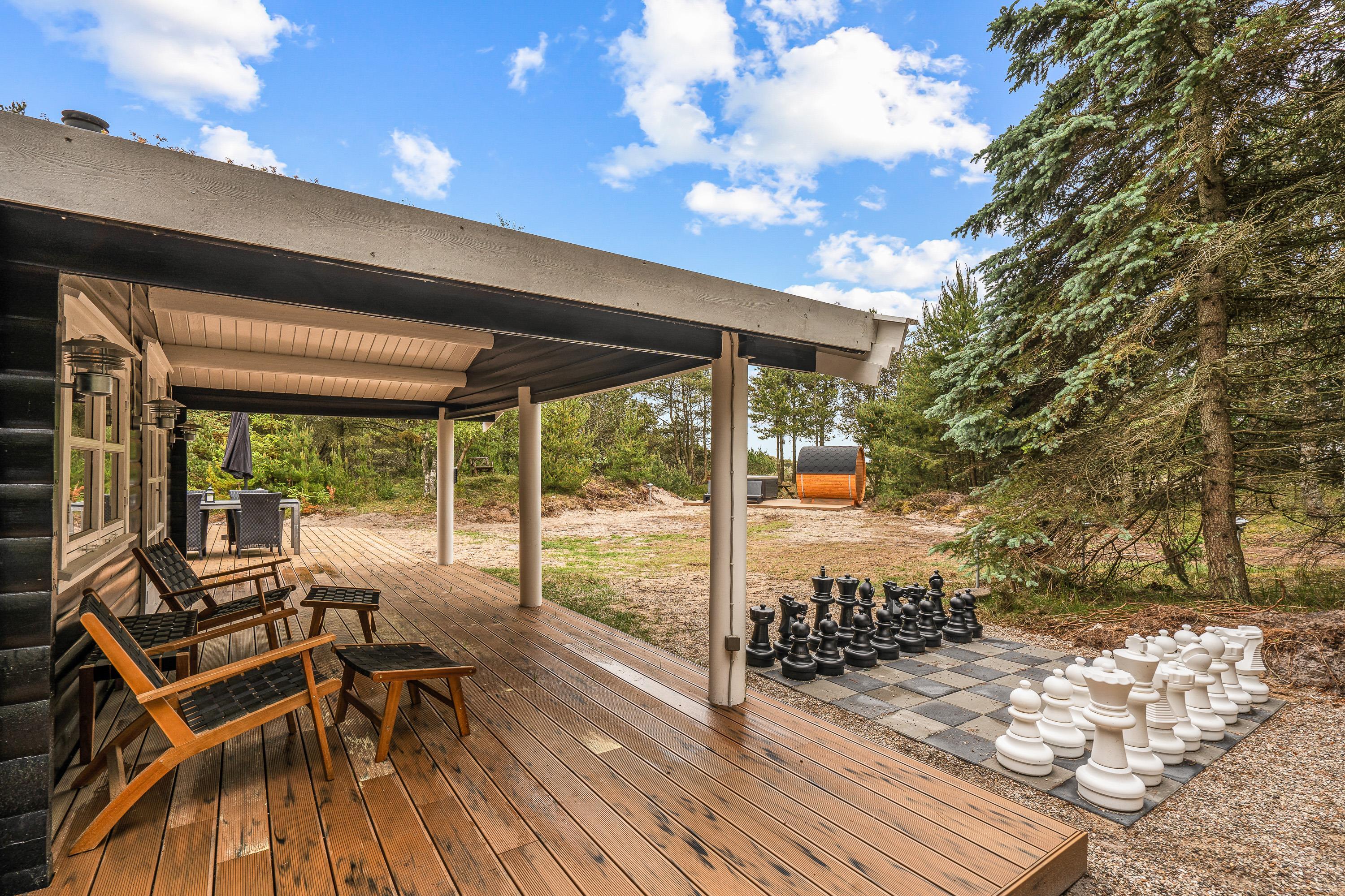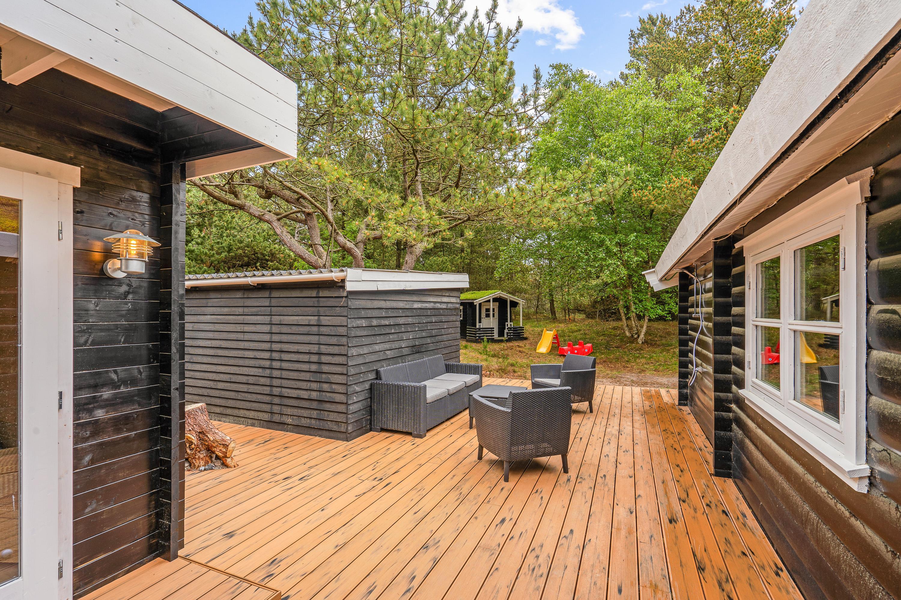 Den delvist overdækkede terrasse har både havemøbler og liggestole, så I kan finde et godt sted at sidde – både i sol og skygge. Haven byder på plads til leg, hvor børnene kan more sig ved gyngestativet, mens de voksne kan nyde roen fra terrassen. Om aftenen kan I samle familien til en middag lavet på gasgrillen, hvor I kan nyde det fredelige naturområde omkring huset.