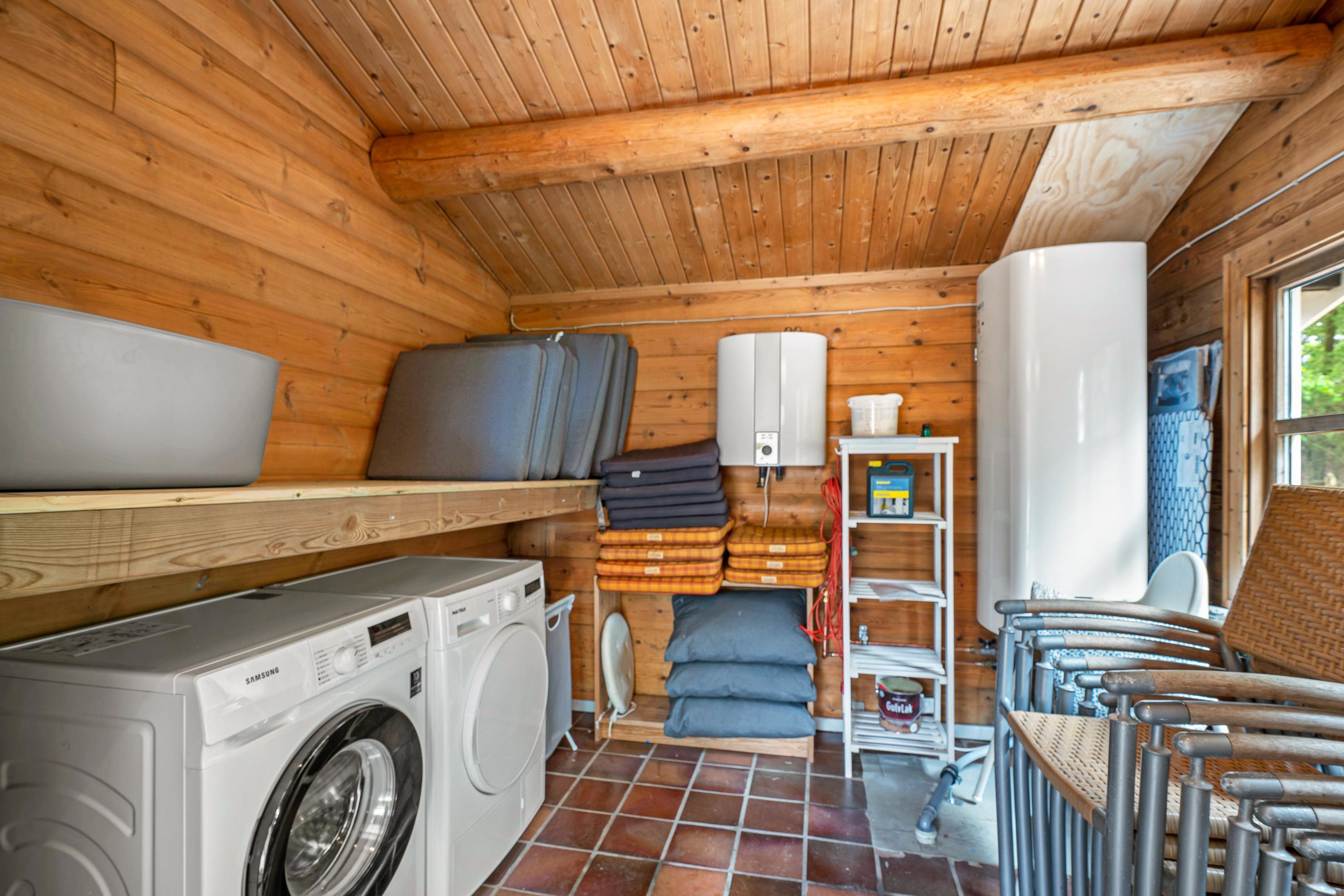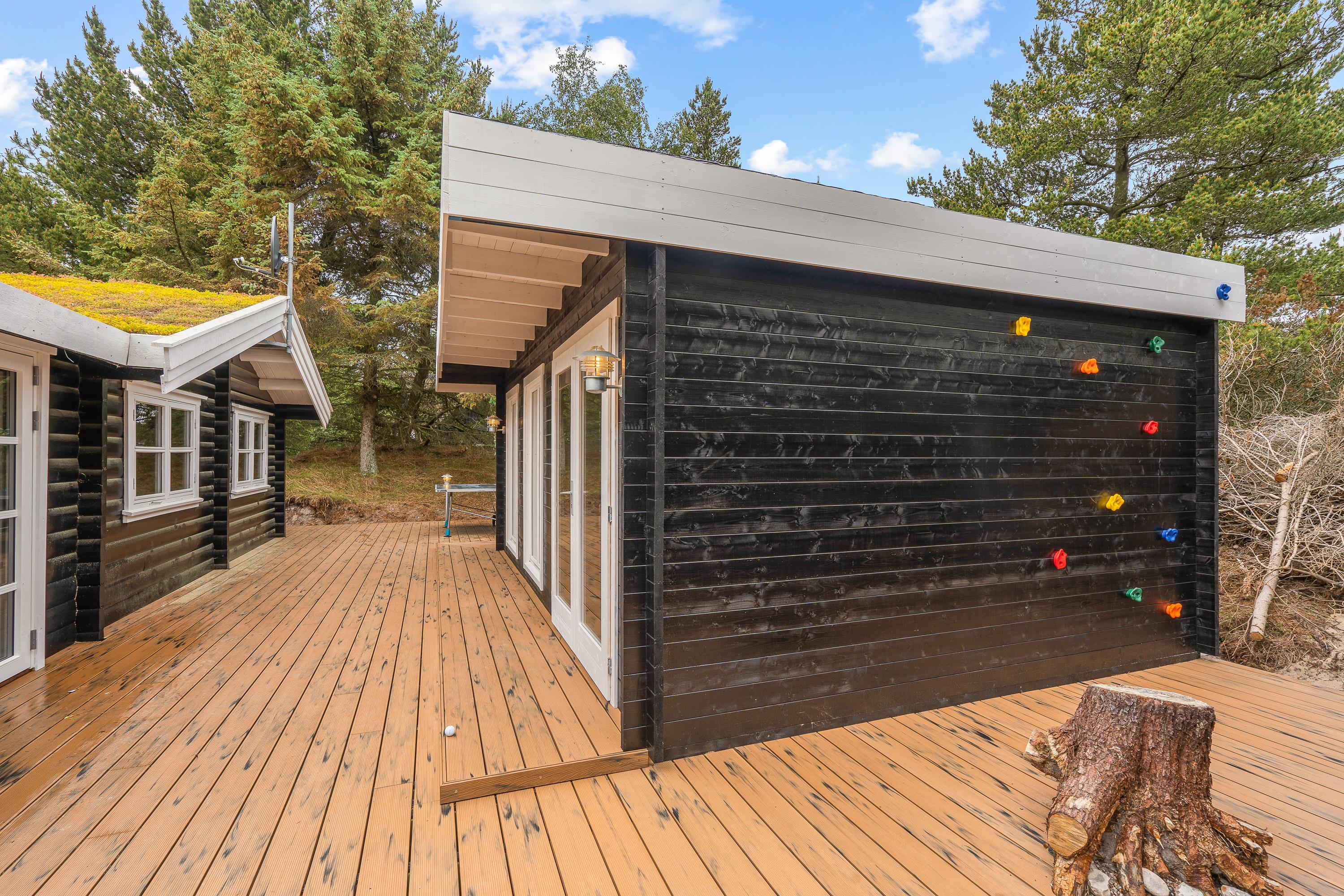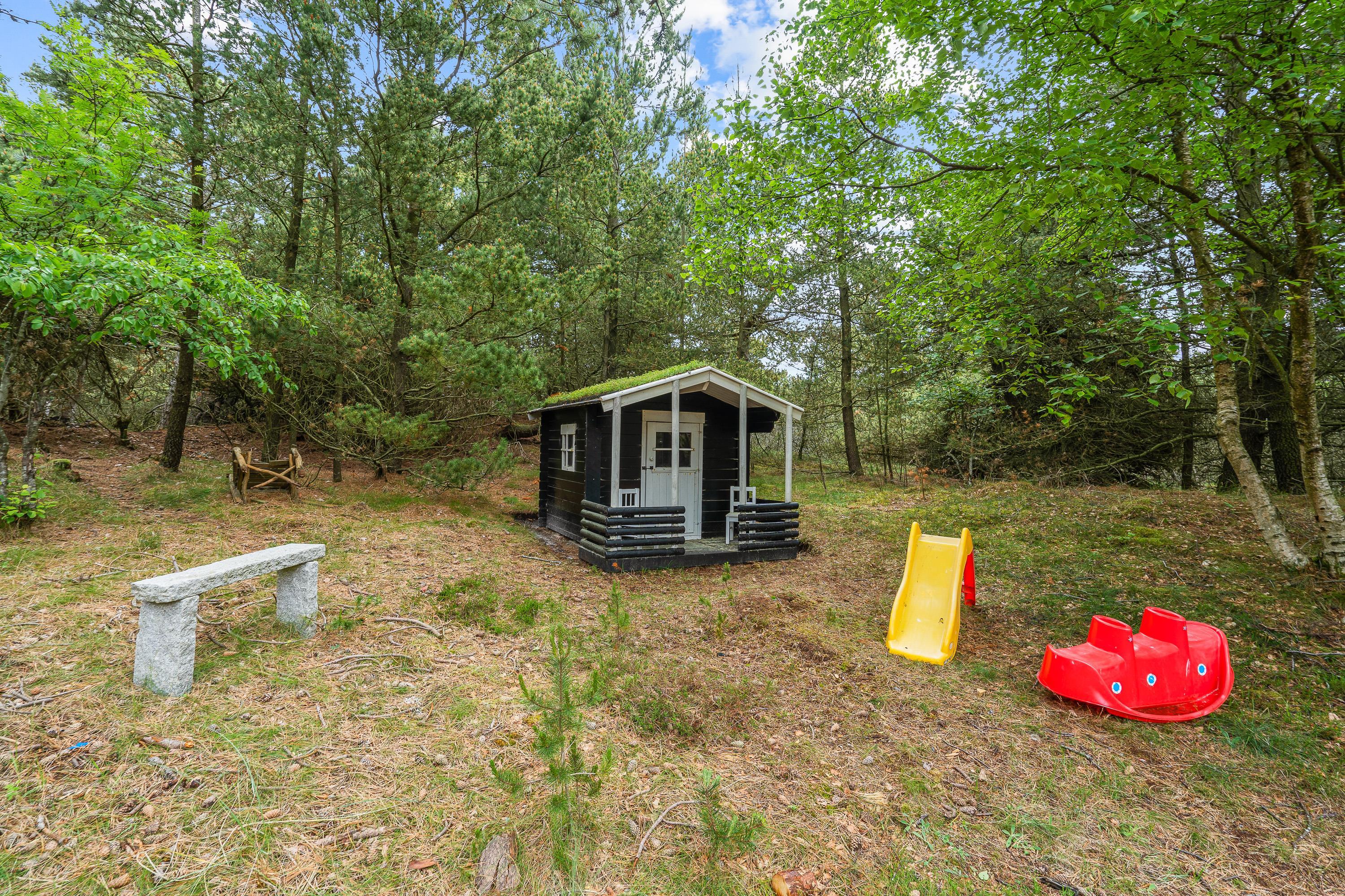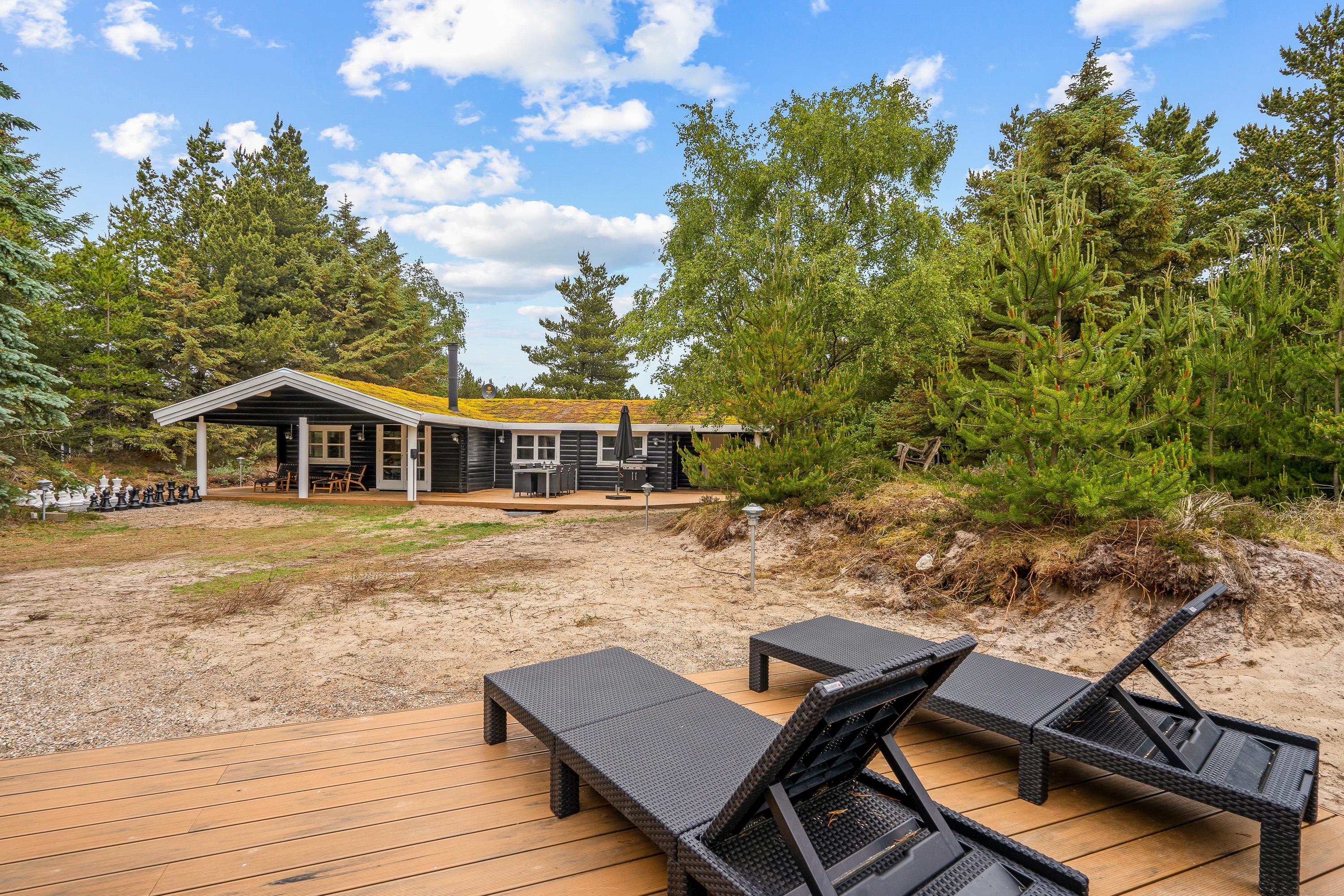Den delvist overdækkede terrasse har både havemøbler og liggestole, så I kan finde et godt sted at sidde – både i sol og skygge. Haven byder på plads til leg, hvor børnene kan more sig ved gyngestativet, mens de voksne kan nyde roen fra terrassen. Om aftenen kan I samle familien til en middag lavet på gasgrillen, hvor I kan nyde det fredelige naturområde omkring huset.