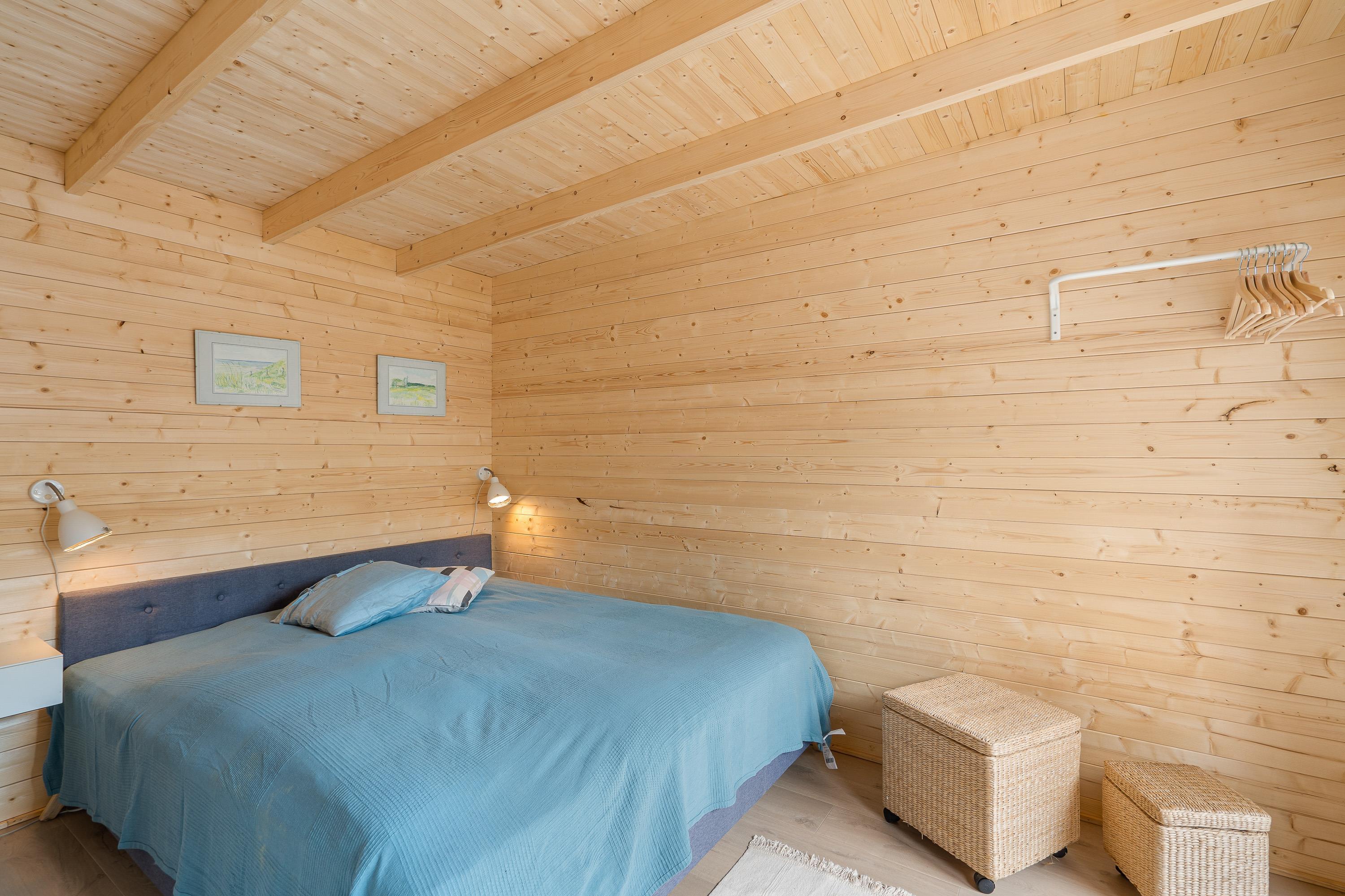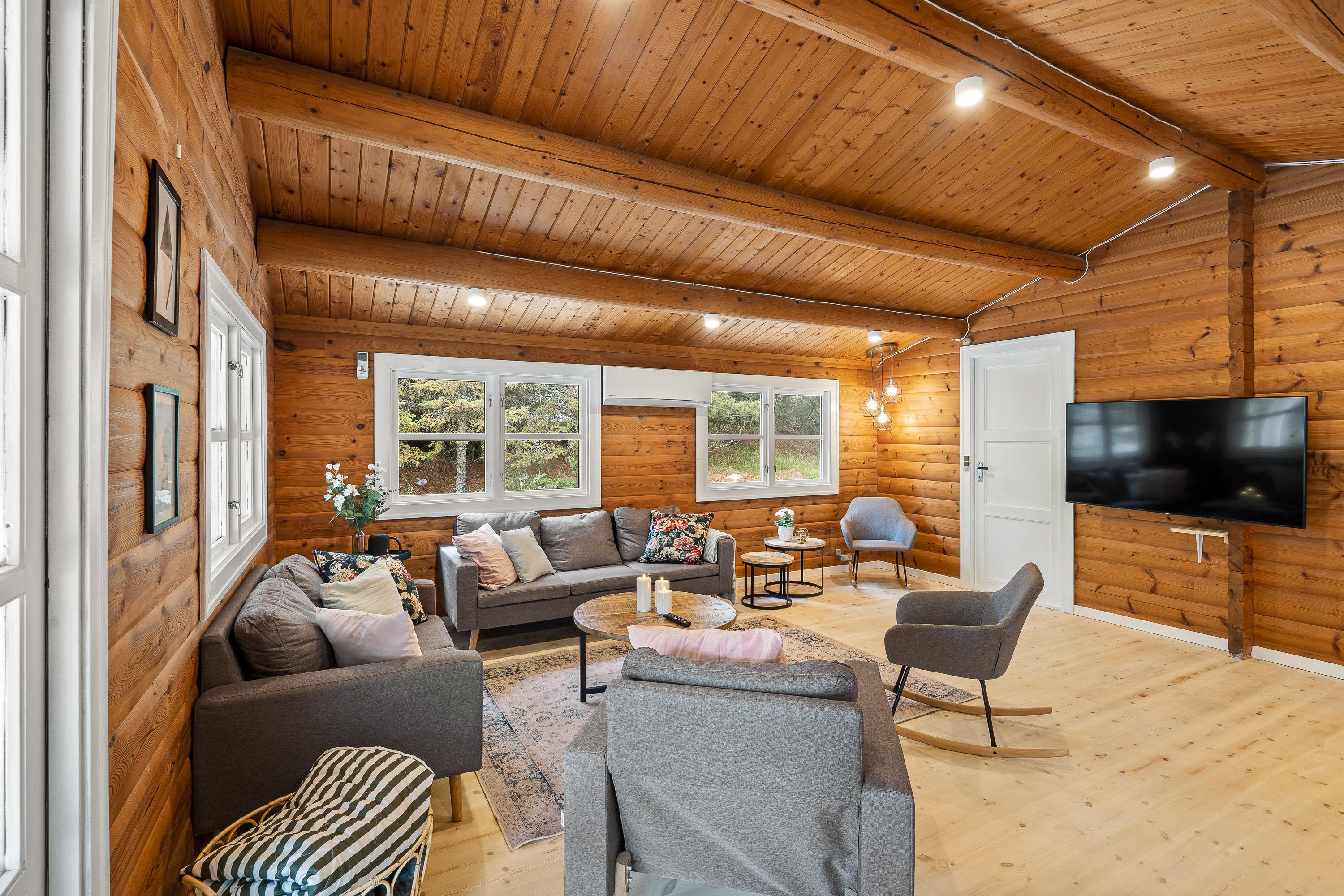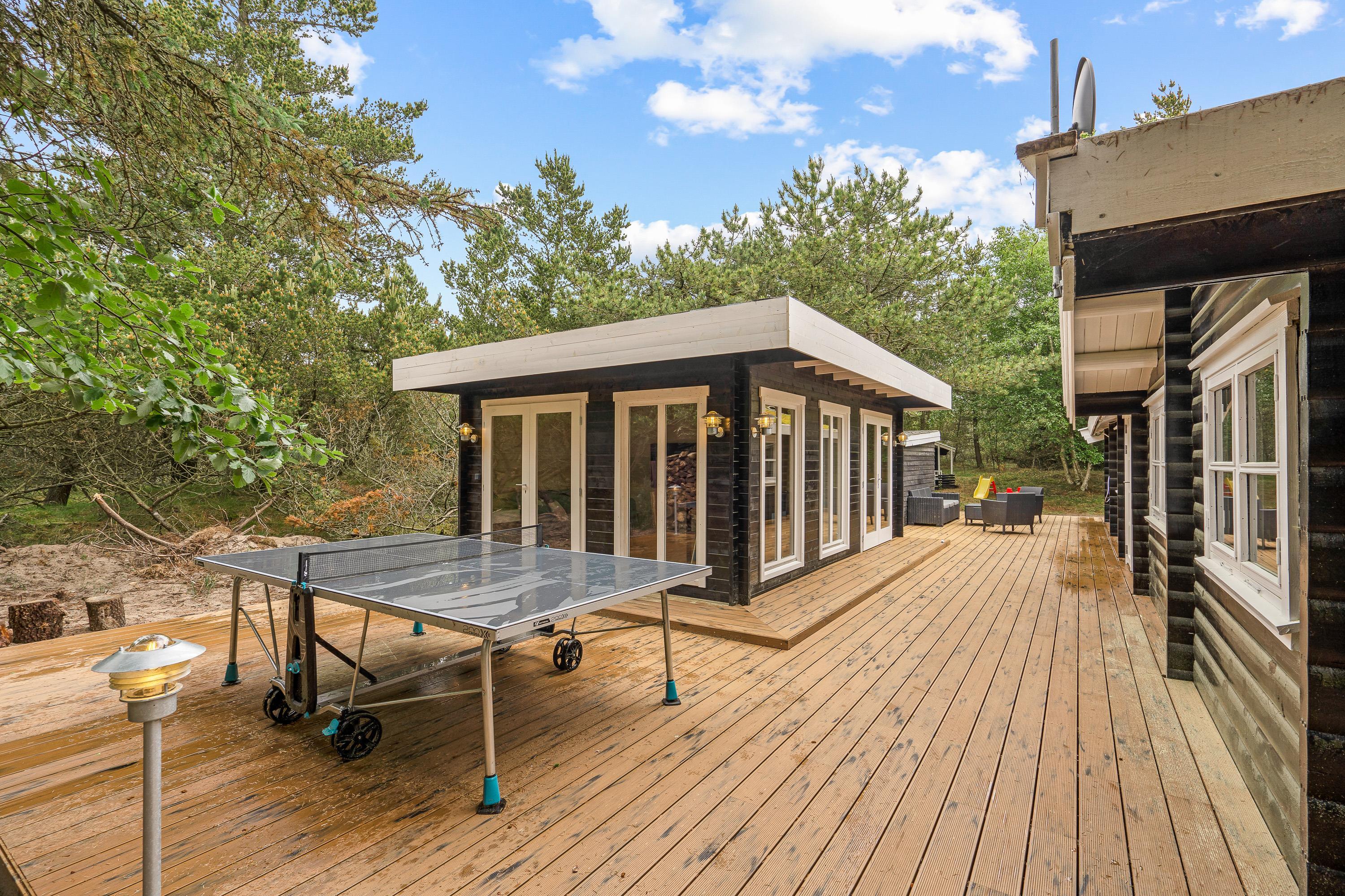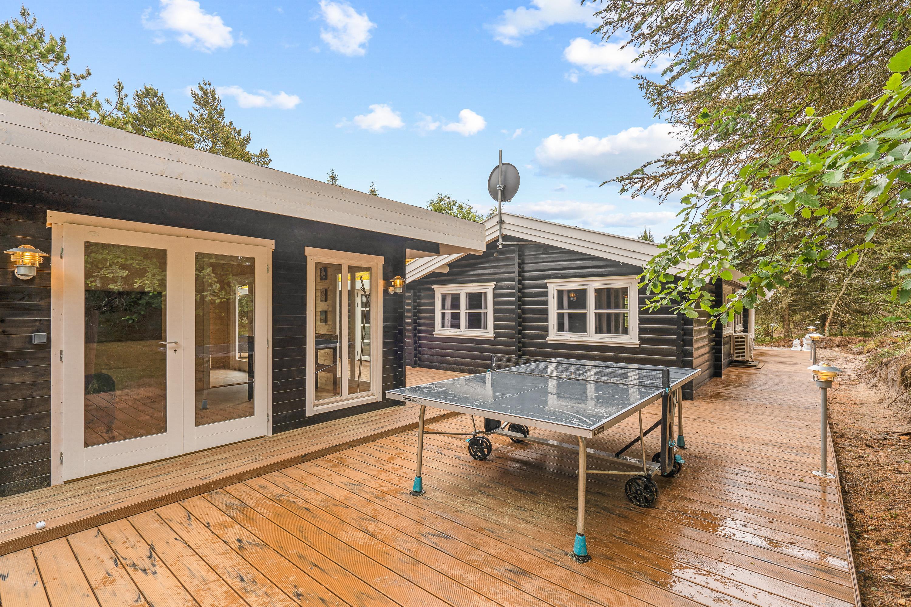 Indenfor byder sommerhuset på en rolig og enkel atmosfære med synlige loftsbjælker og træværk, som giver huset karakter. Sofaarrangementet er placeret omkring brændeovnen, der spreder en blid varme på kølige aftener og skaber hygge. Huset har store vinduer, hvor I kan kigge ud på den omkringliggende natur. Huset har tre soveværelser – ét med to enkeltsenge og to med dobbeltsenge – samt ét badeværelse, som tilsammen sikrer en behagelig nattesøvn efter dagens oplevelser. Bordtennisbordet i opholdsrummet giver mulighed for sjove og afslappede stunder for både børn og voksne.