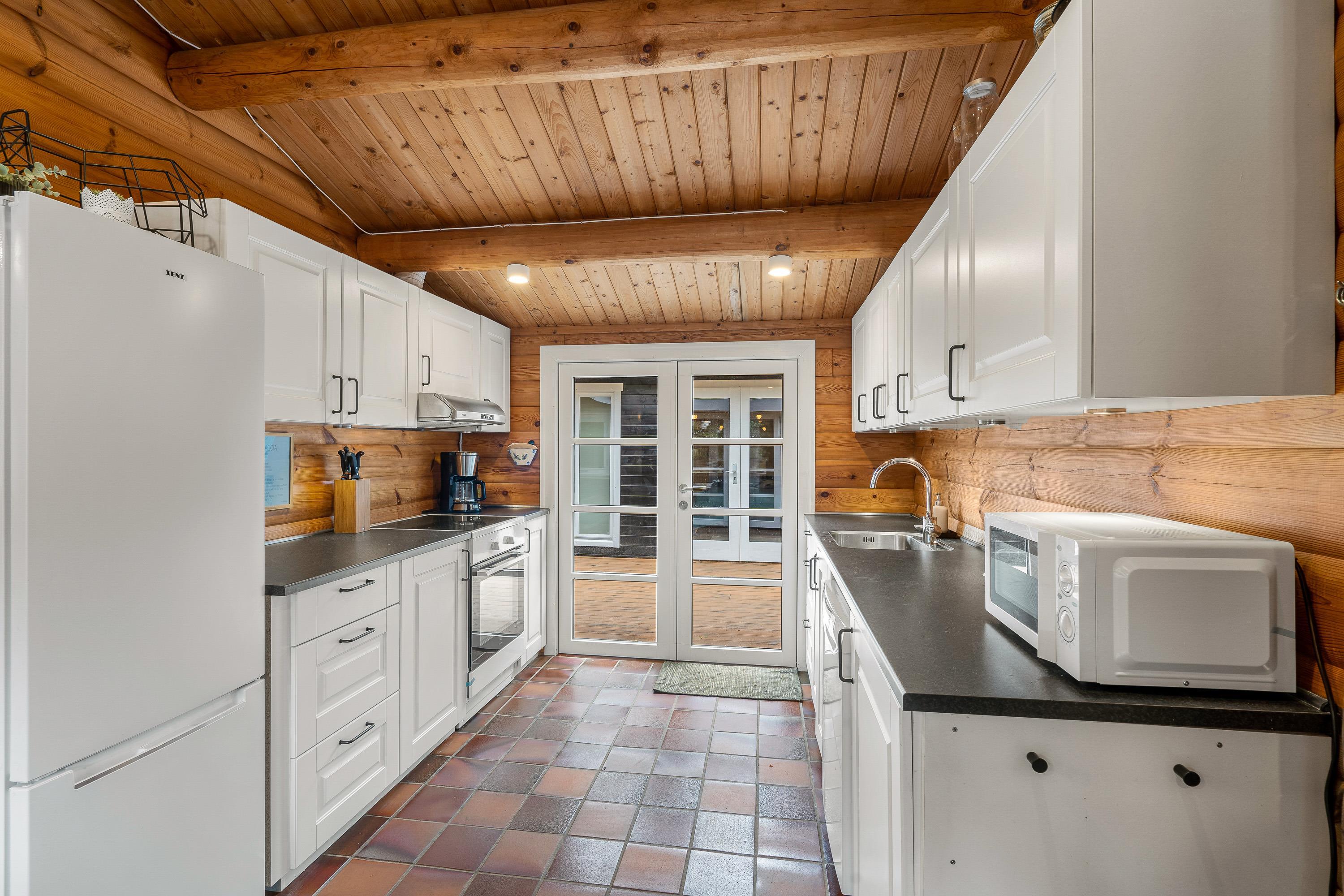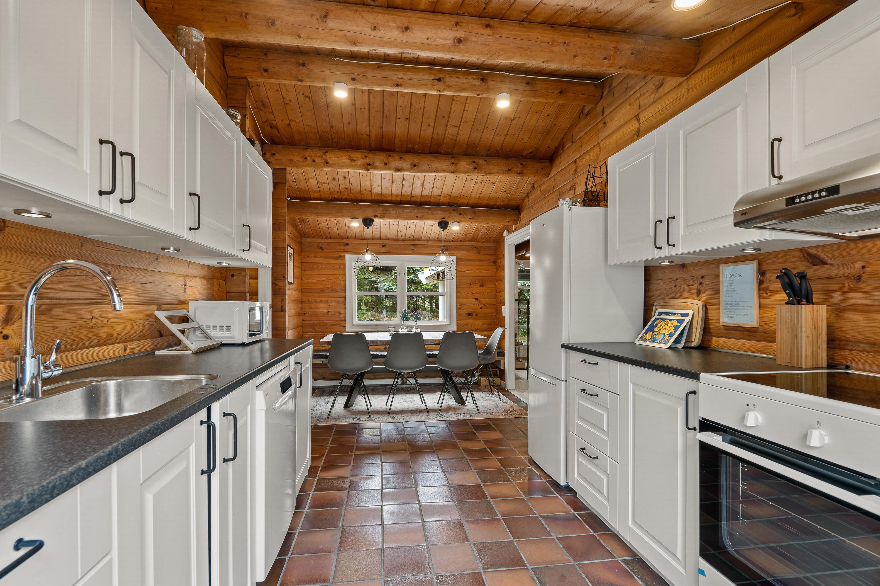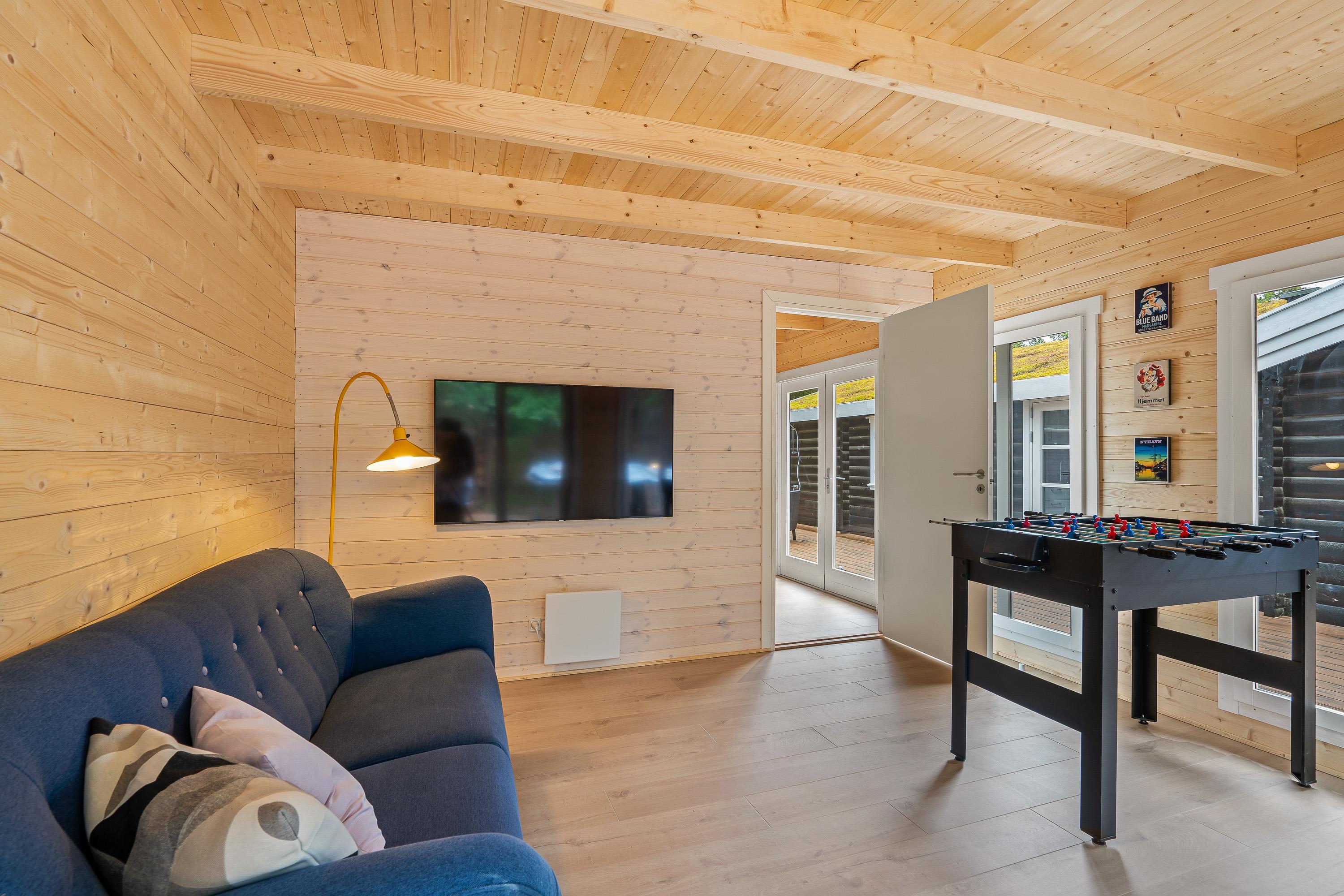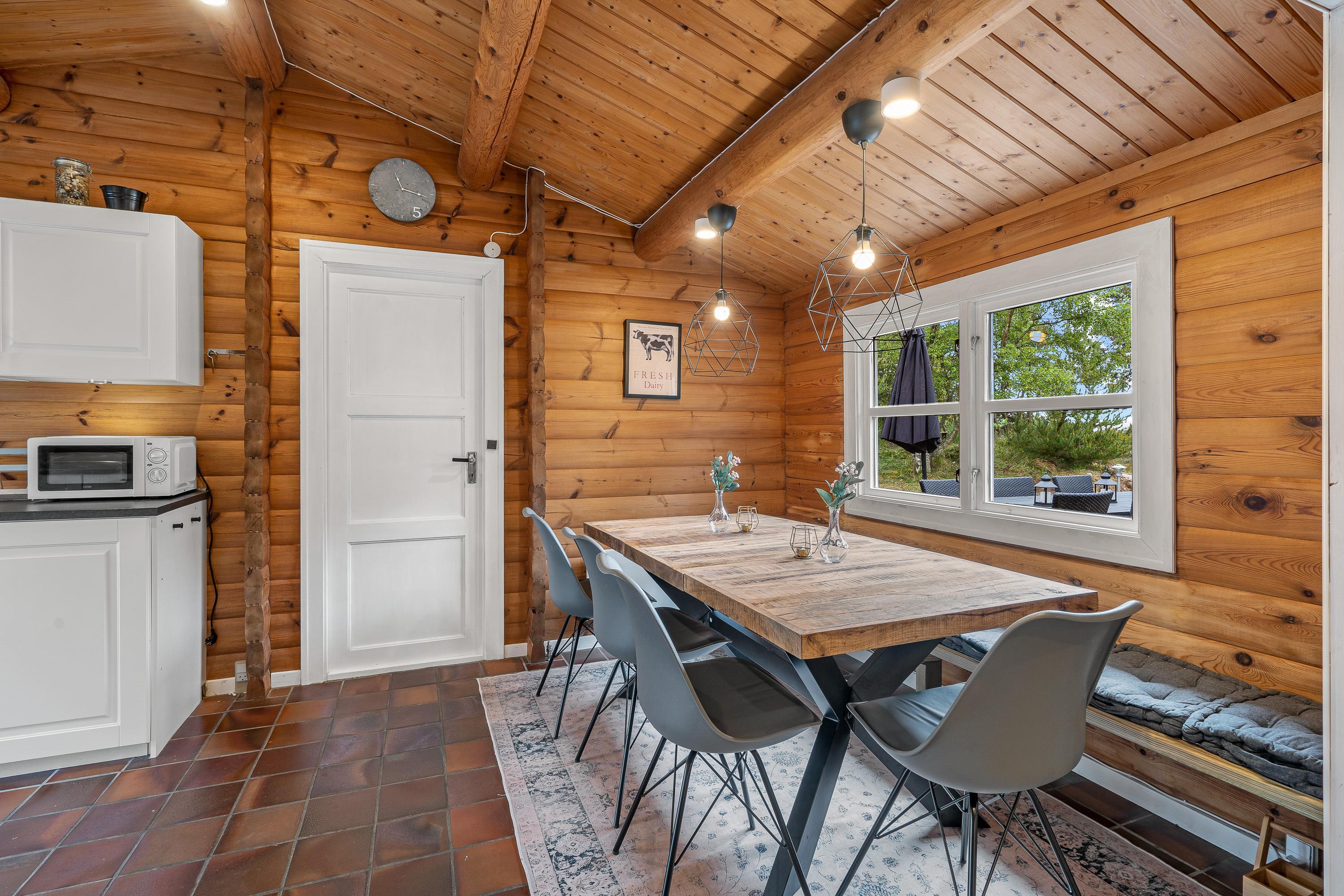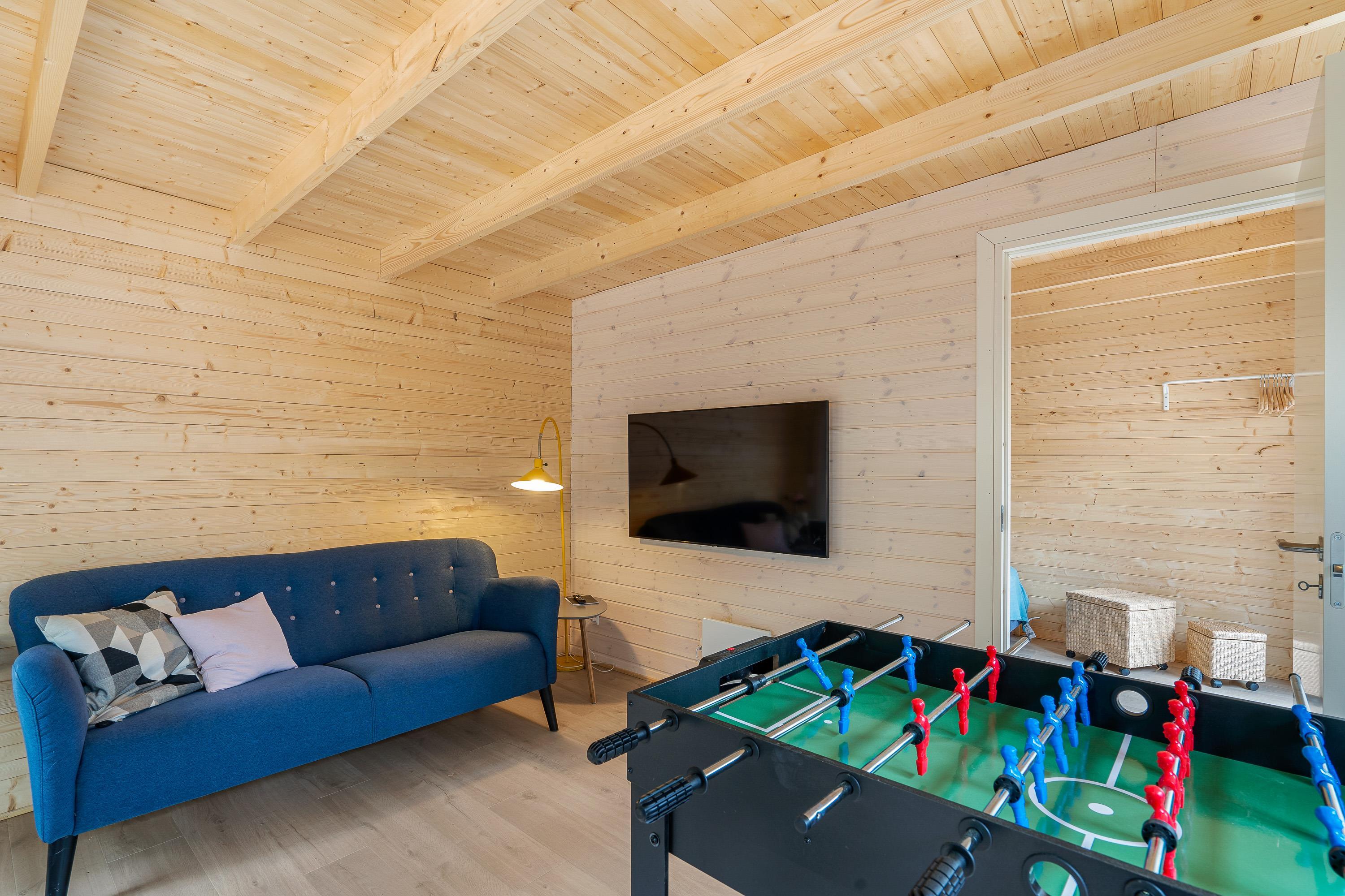 Indenfor byder sommerhuset på en rolig og enkel atmosfære med synlige loftsbjælker og træværk, som giver huset karakter. Sofaarrangementet er placeret omkring brændeovnen, der spreder en blid varme på kølige aftener og skaber hygge. Huset har store vinduer, hvor I kan kigge ud på den omkringliggende natur. Huset har tre soveværelser – ét med to enkeltsenge og to med dobbeltsenge – samt ét badeværelse, som tilsammen sikrer en behagelig nattesøvn efter dagens oplevelser. Bordtennisbordet i opholdsrummet giver mulighed for sjove og afslappede stunder for både børn og voksne.