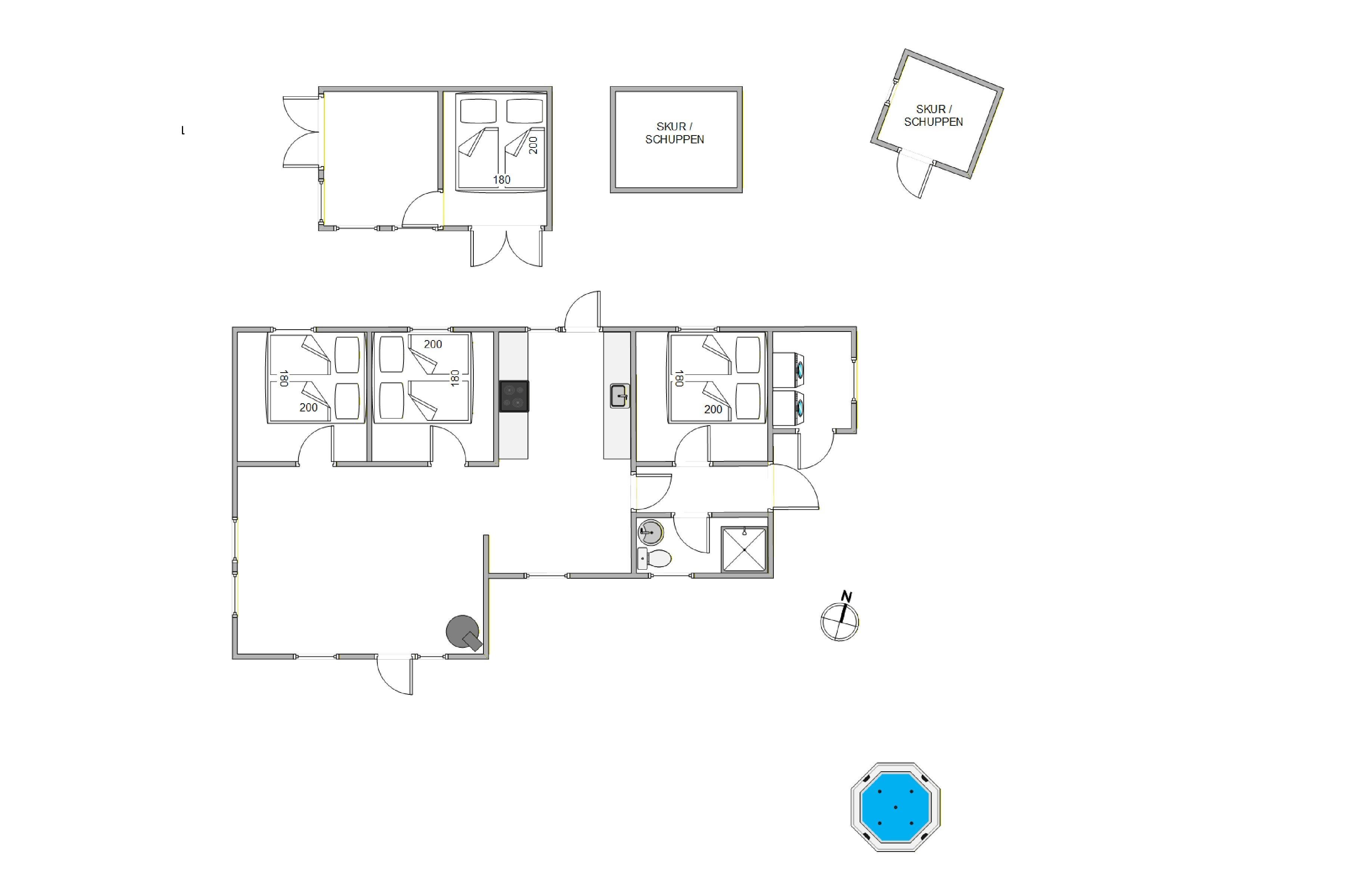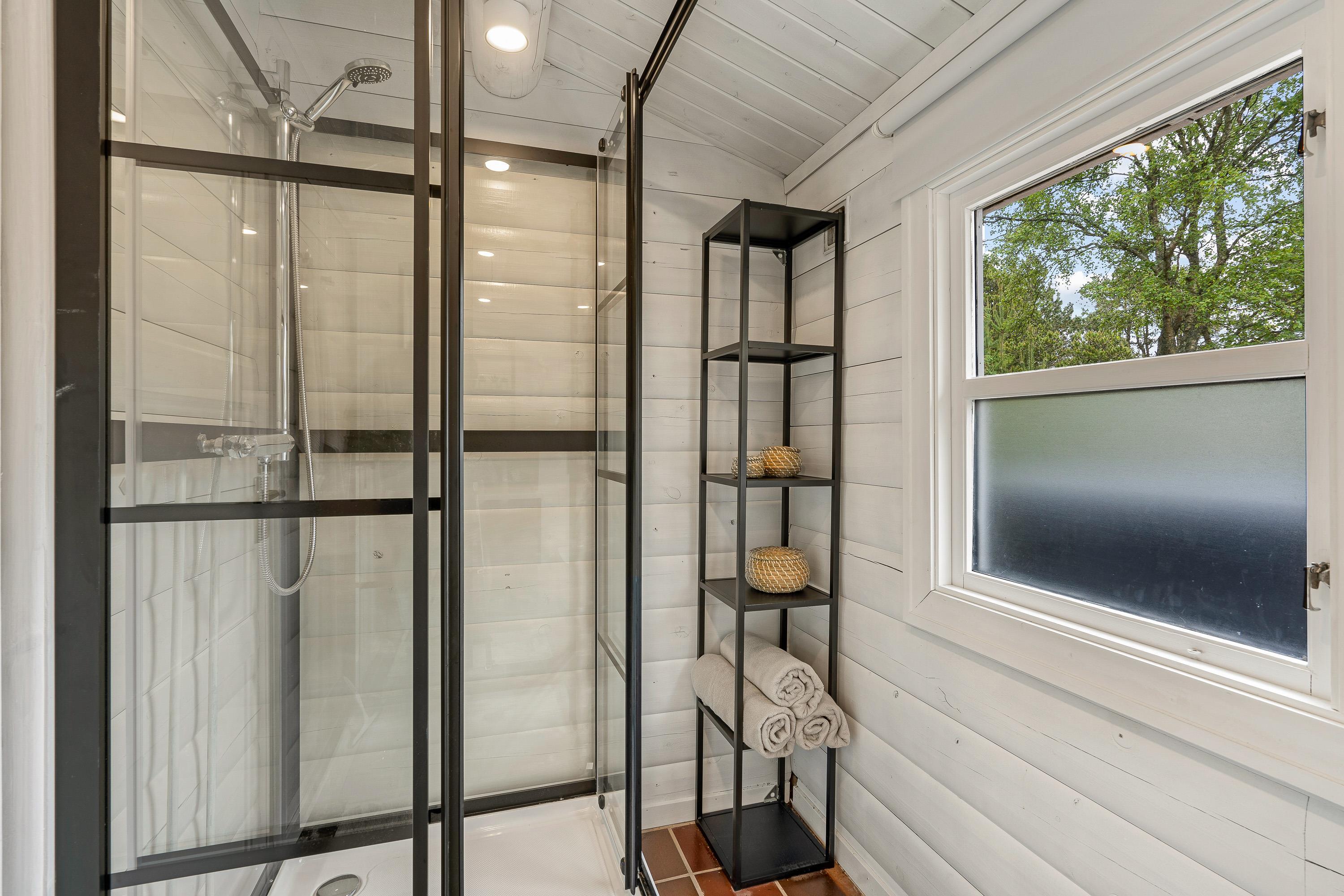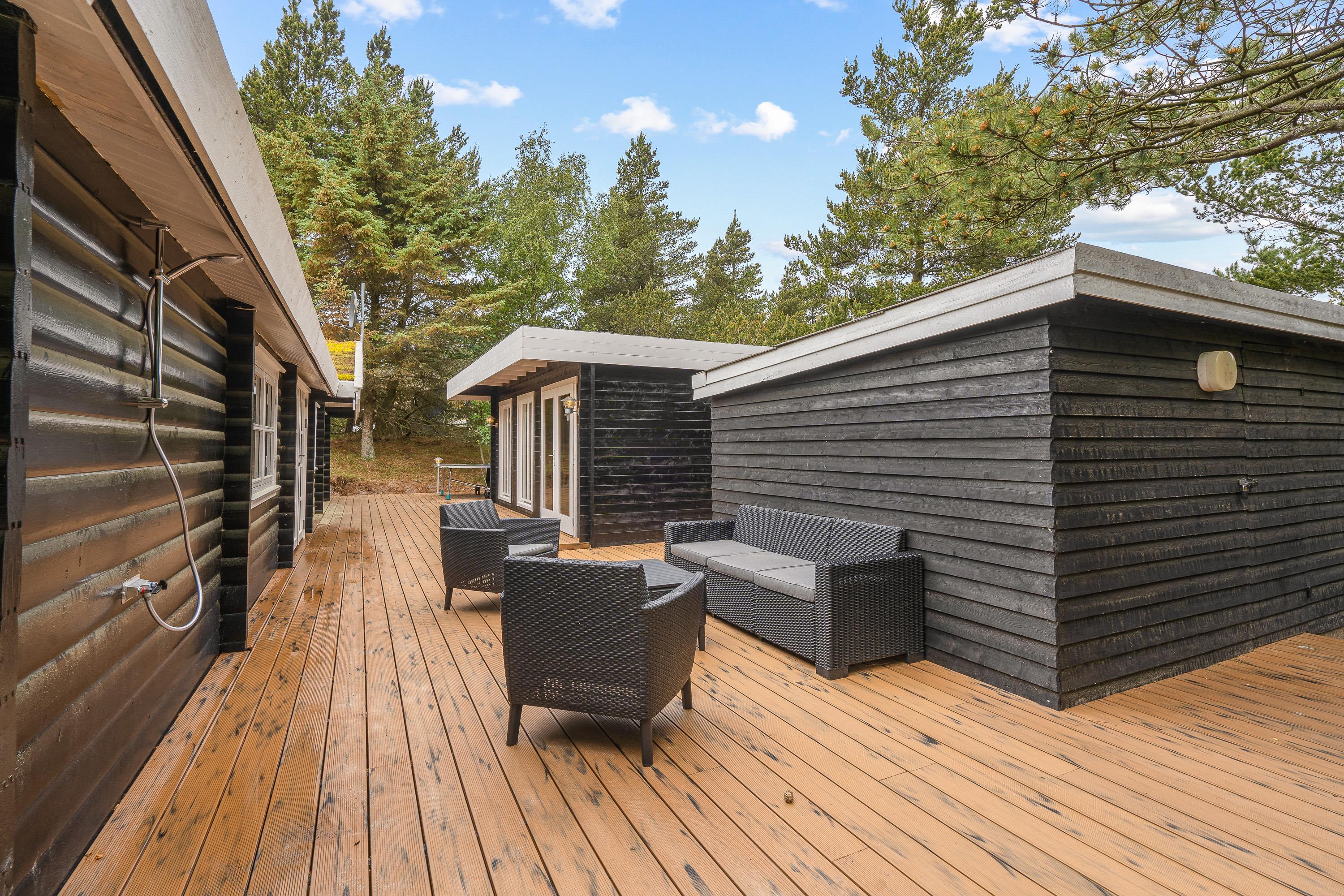 Sommerhusets udendørsfaciliteter bidrager til den afslappende atmosfære. Udespaen byder på varme bobler under åben himmel, hvor I kan nyde udsigten til himlen – om aftenen måske stjernehimlen – og lade kroppen slappe af efter en dag ved stranden eller på ture i naturen. Udesaunaen giver en varm og rolig oplevelse, hvor I kan få varmen og samtidig få et pusterum. Udebruseren er praktisk til at skylle sandet af efter stranden og kan benyttes fra 1. april til 31. oktober.