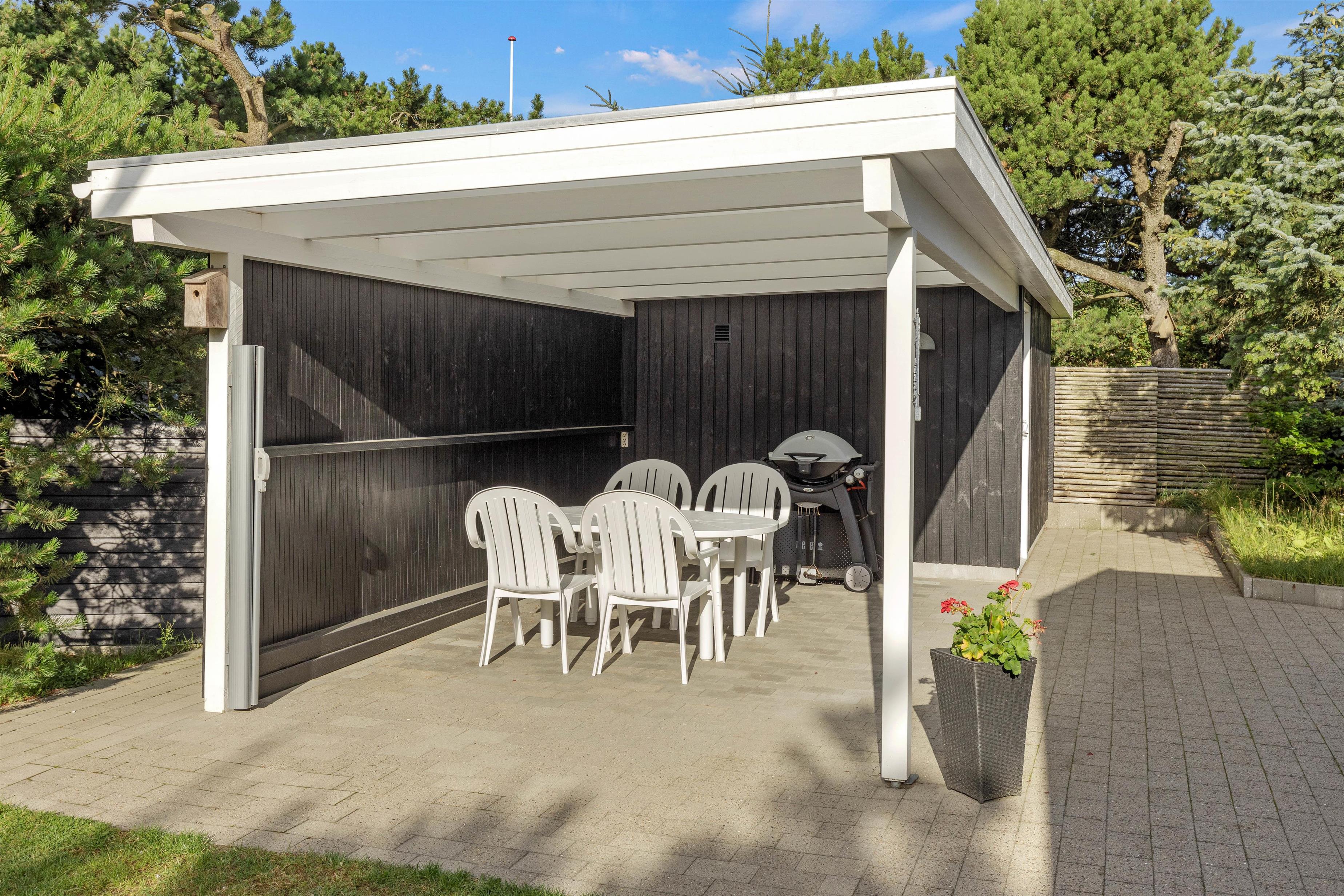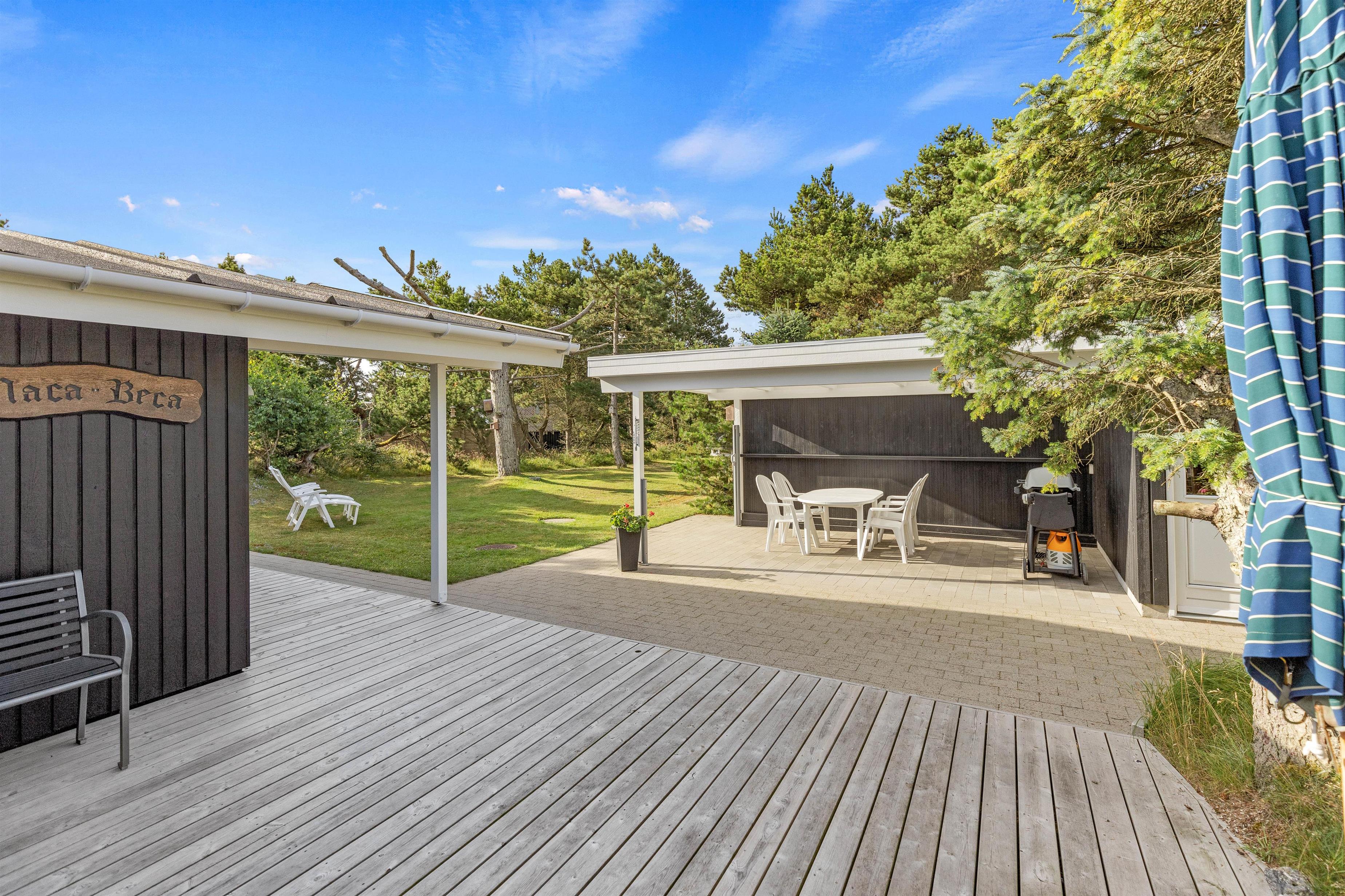 På sommerhusets udeområde er der tænkt på både store og små, og derfor kan I alle tilbringe og nyde de solrige feriedage udendørs. Her venter jer en delvist overdækket og afskærmet terrasse, hvor I kan læne jer godt tilbage i havemøbler og liggestole.