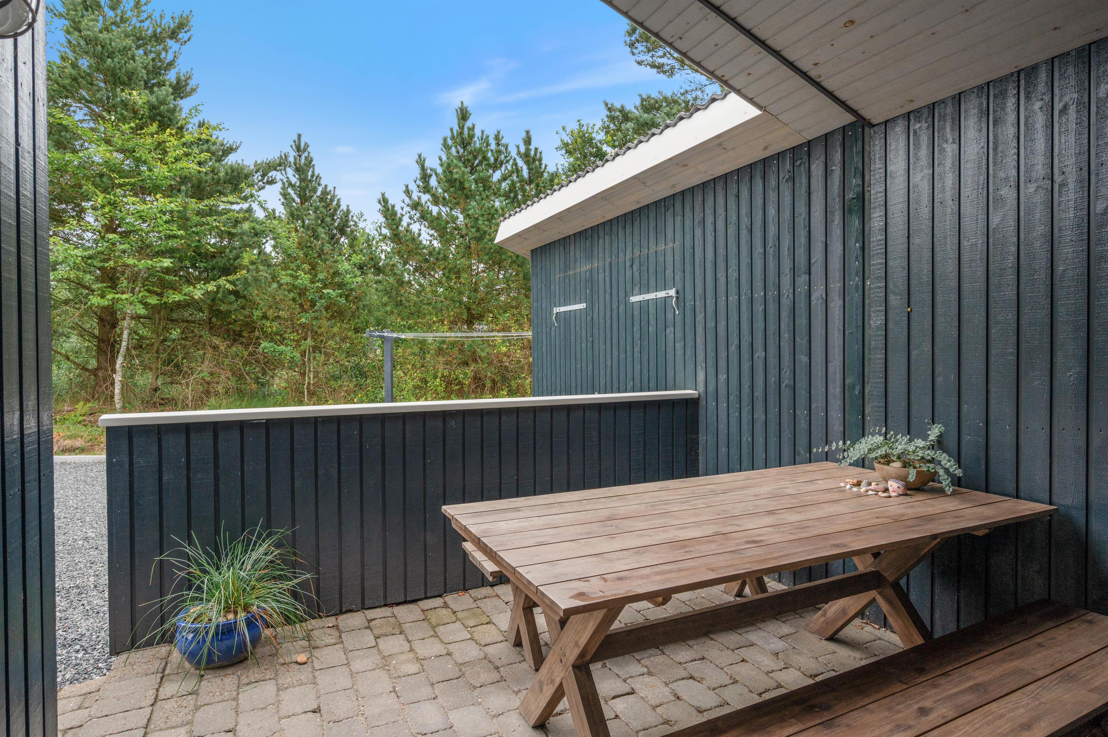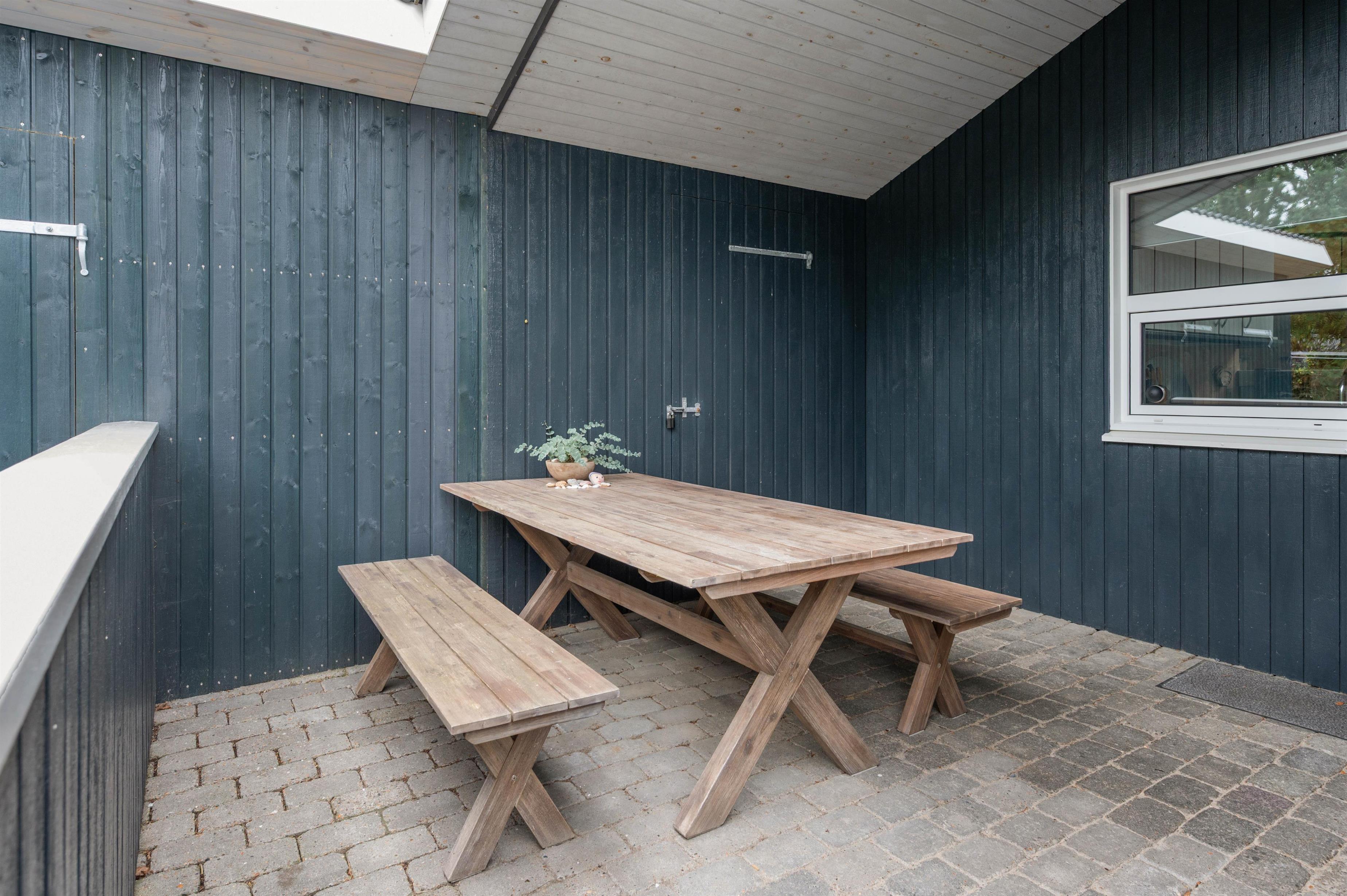 På den store flisebelagte terrasse er der endnu en hyggekrog, ligesom der på modsatte side af feriehuset er en lille terrasse, hvor morgenkaffen kan nydes til fuglesang.