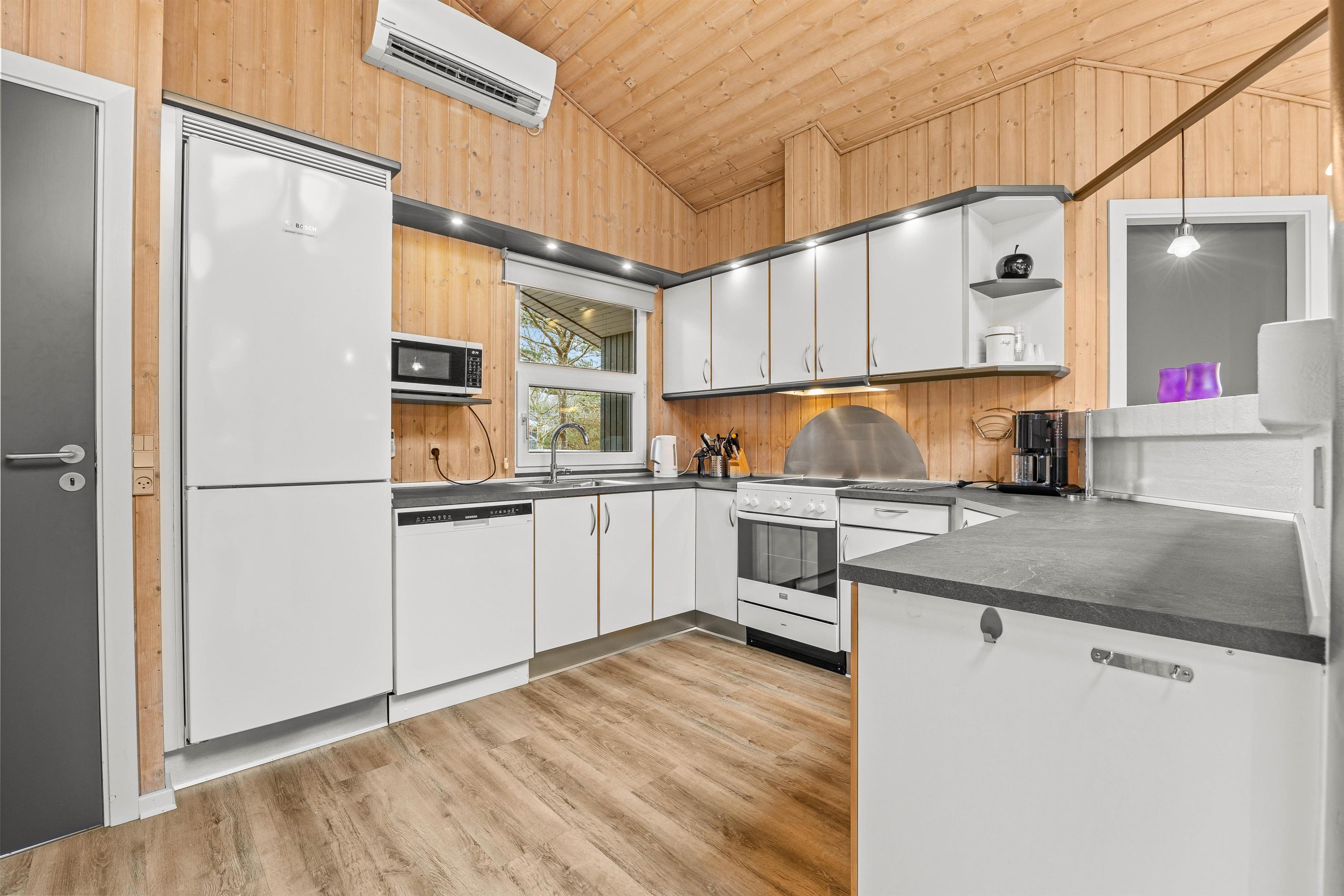 Det store hjerterum i dette dejlige feriehus med det åbne køkken indbyder til fælles feriehygge ved spisebordet eller de gode sofaer. Slap af med en god bog, et spil eller en god kop kaffe foran brændeovnens knitrende flammer efter en god dag. De flotte ovenlysvinduet og vinduespartier giver smukt lysindfald og varmepumpen sørger for et dejligt indeklima.
