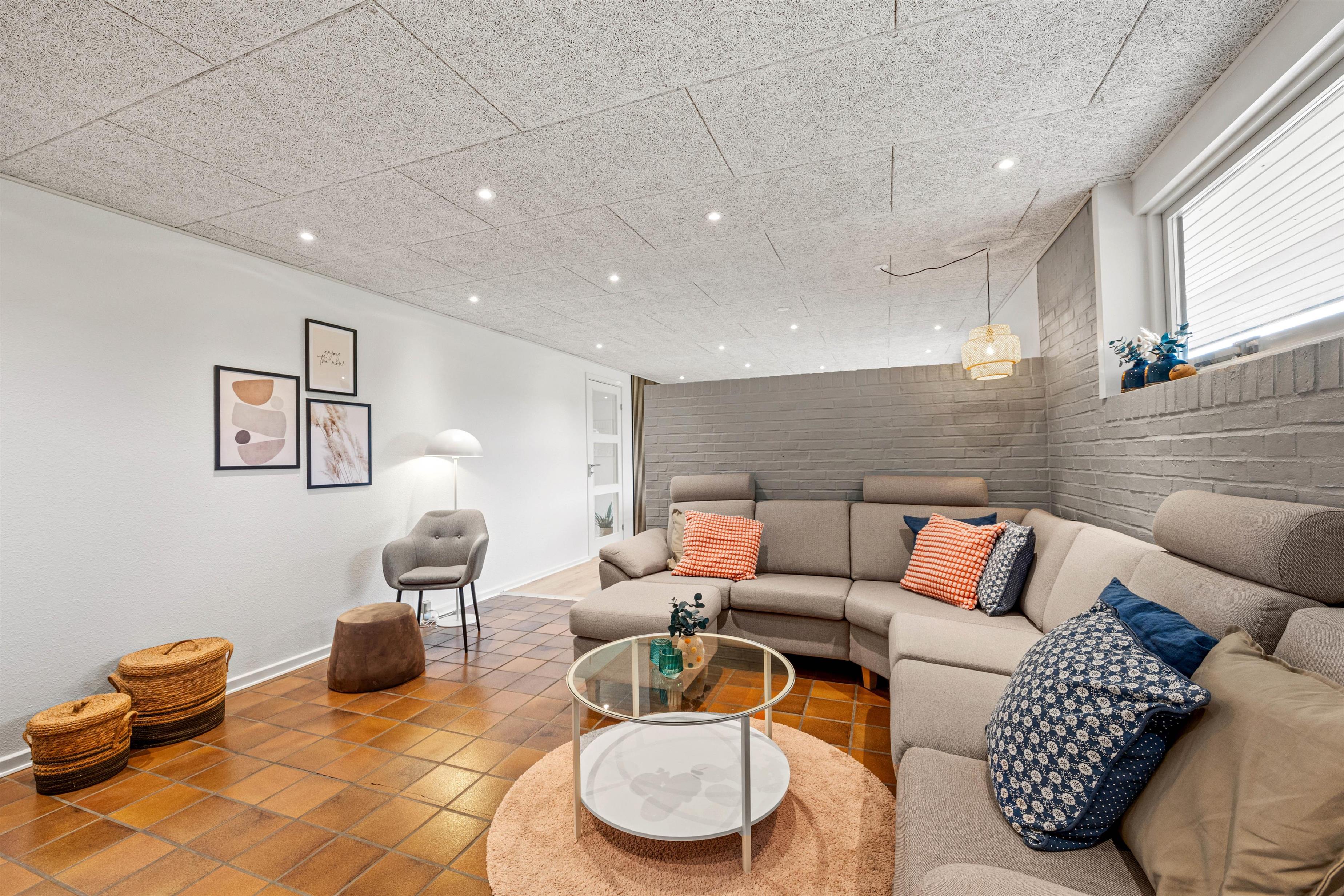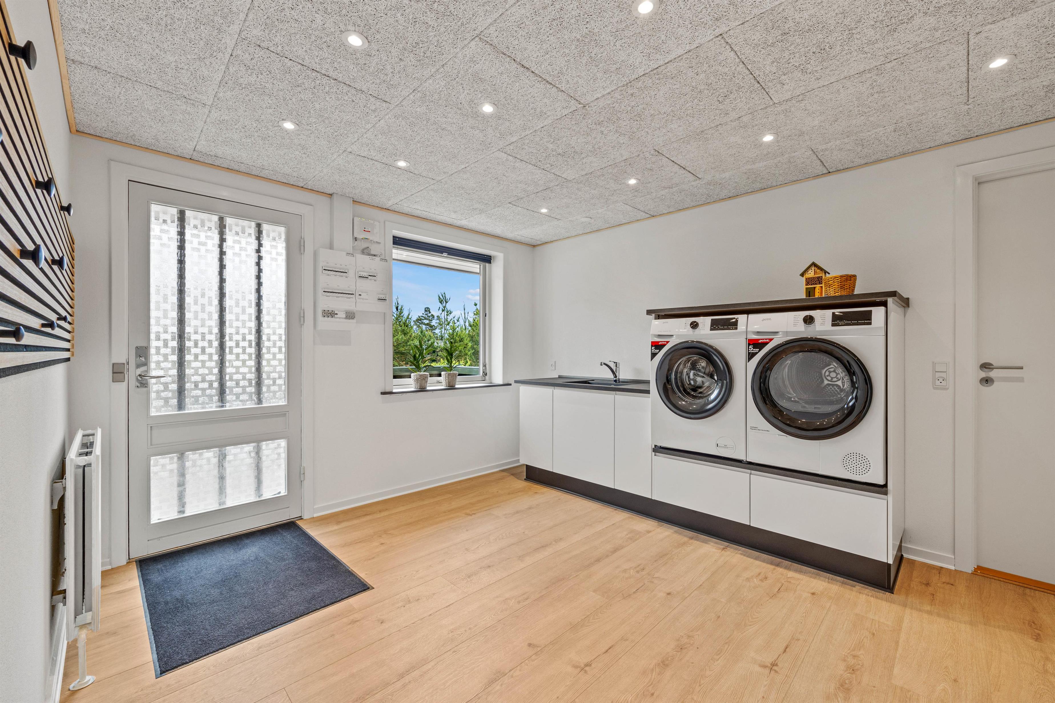 I det største badeværelse kan du hurtigt tørre håndklæderne på håndklædetørreren, og når tøjvasken kalder, kan du lade vaskemaskine og tørretumbler gøre arbejdet for dig i den store entré, hvor der også er rigeligt med plads til overtøj og fodtøj.