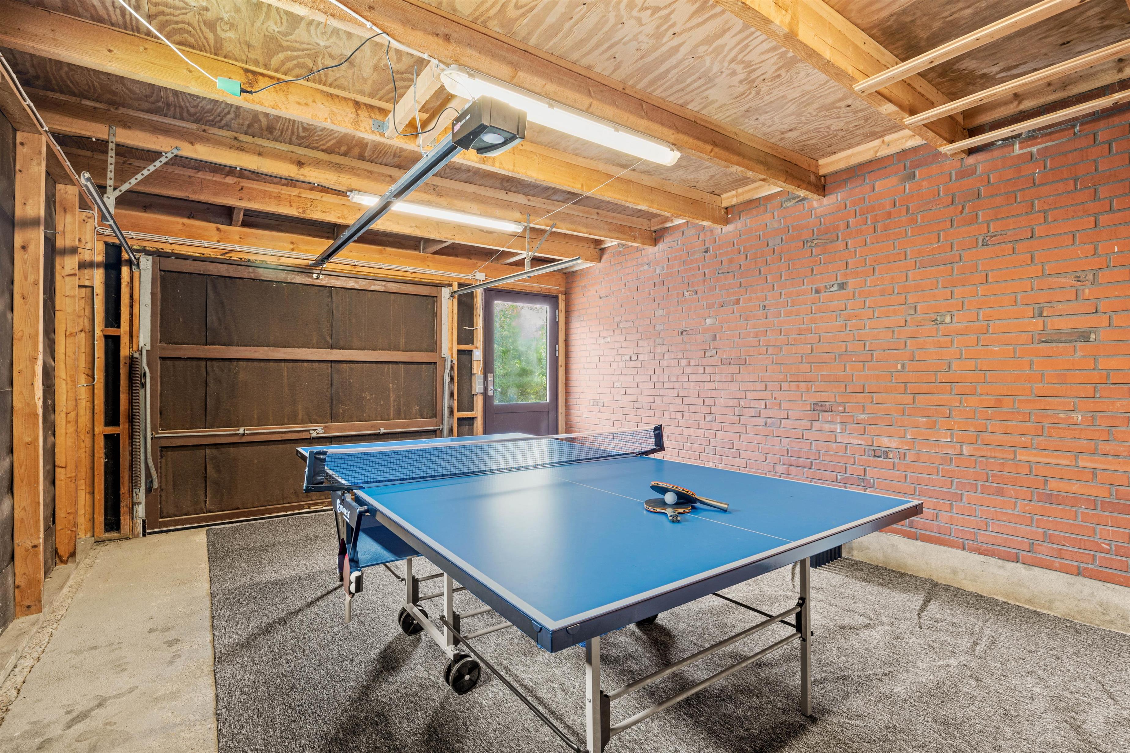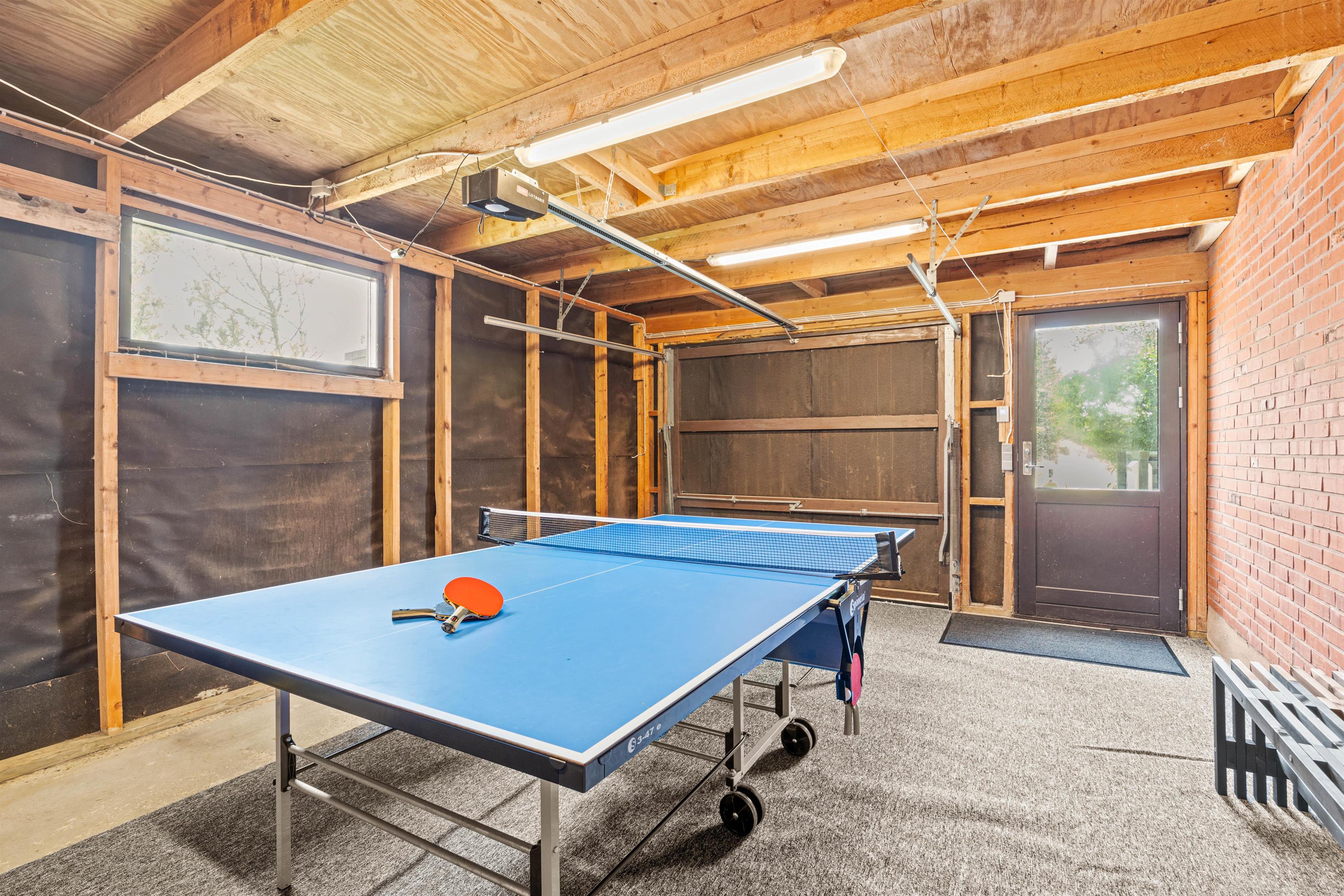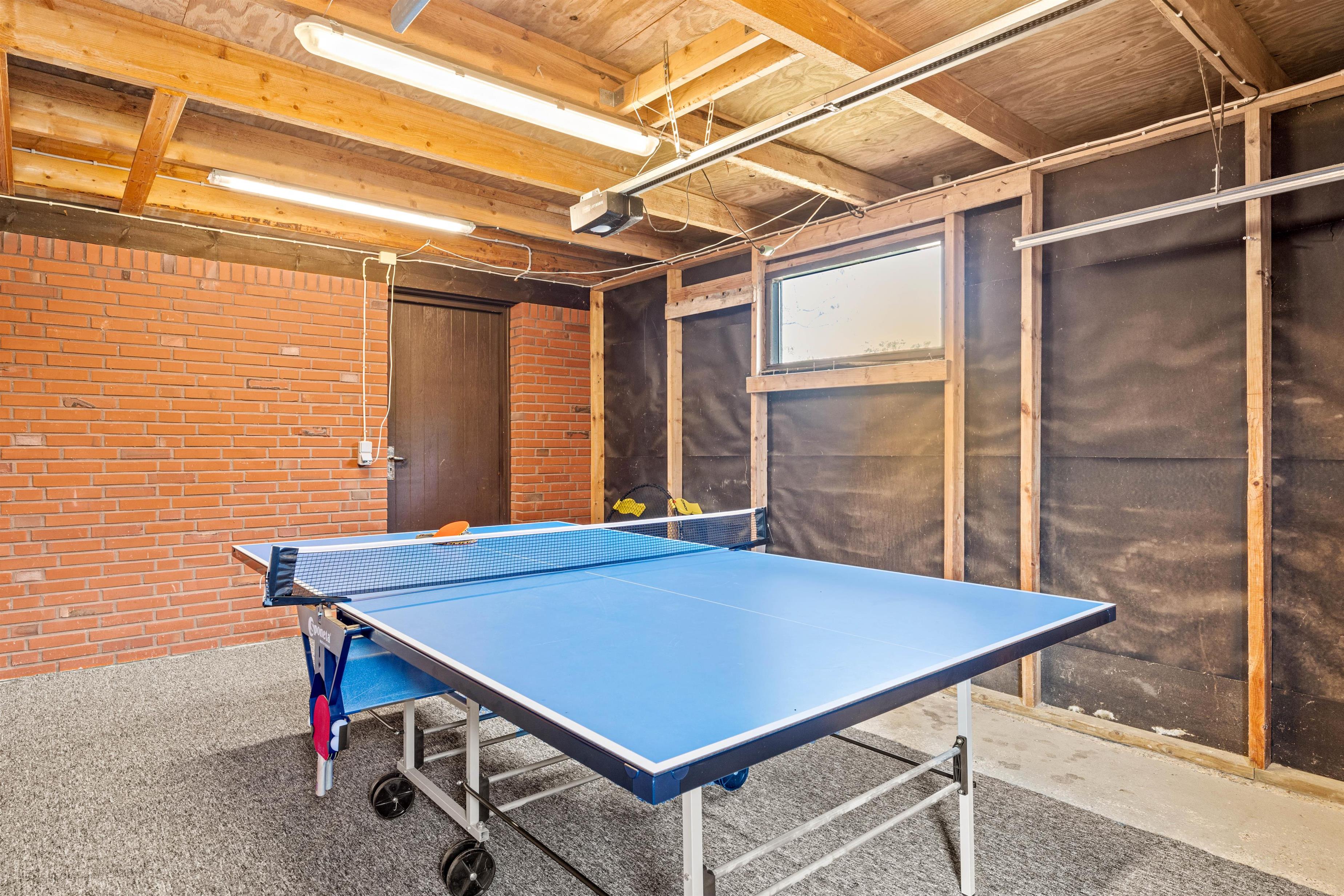 I garagen kan I få et slag bordtennis og hente kølige drikke i køleskabet eller en is i fryseren, og fra den store terrasse på sommerhusets bagside kan I følge med i hinandens aktiviteter på græsplænen, volleyballbanen eller i sandkassen.