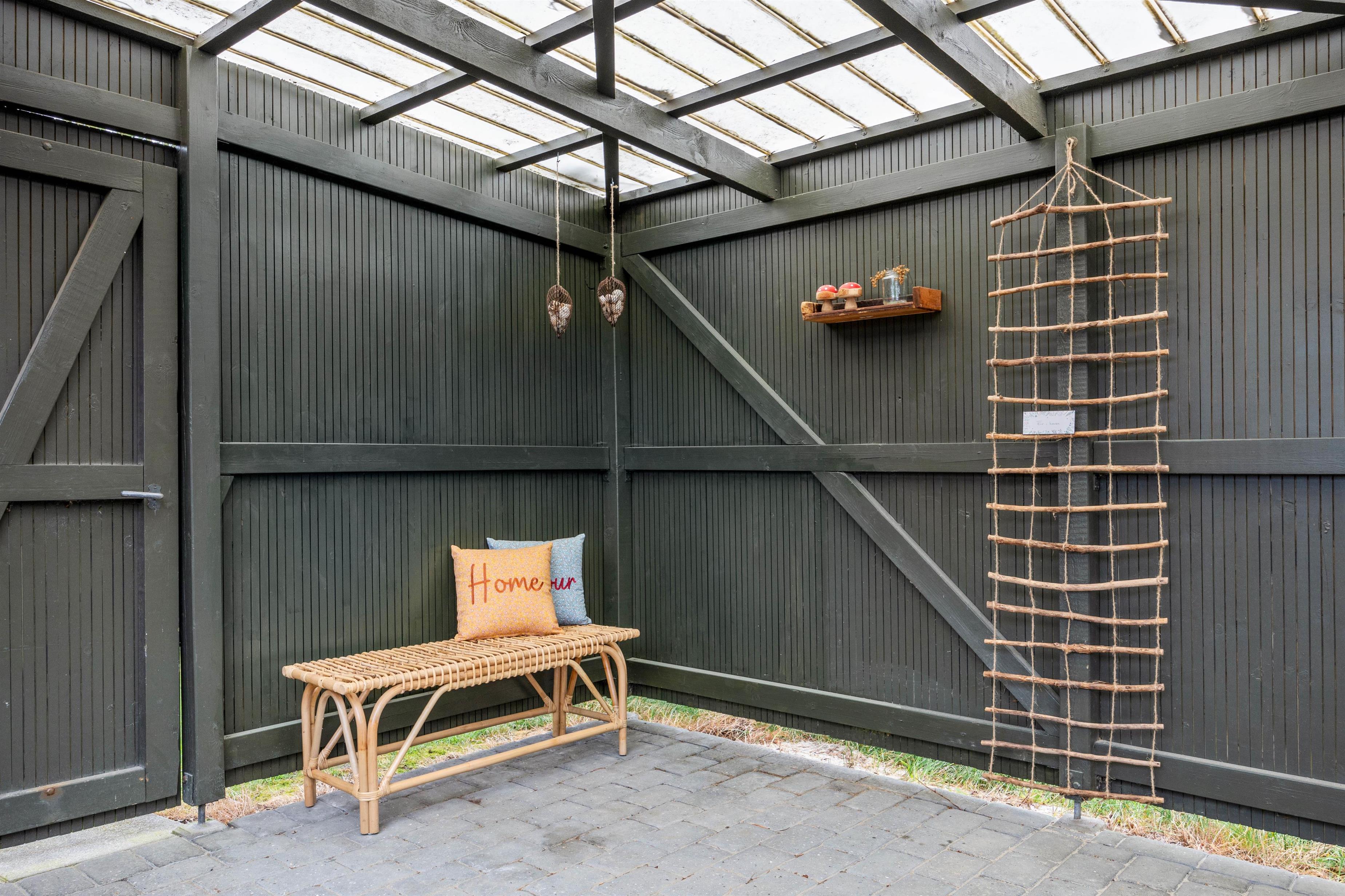 Morgenmaden kan I nyde i den delvist lukkede udestue på sommerhusets forside, hvor du også kan hygge med en god bog på en lun regnvejrsdag, mens regnen trommer på taget.