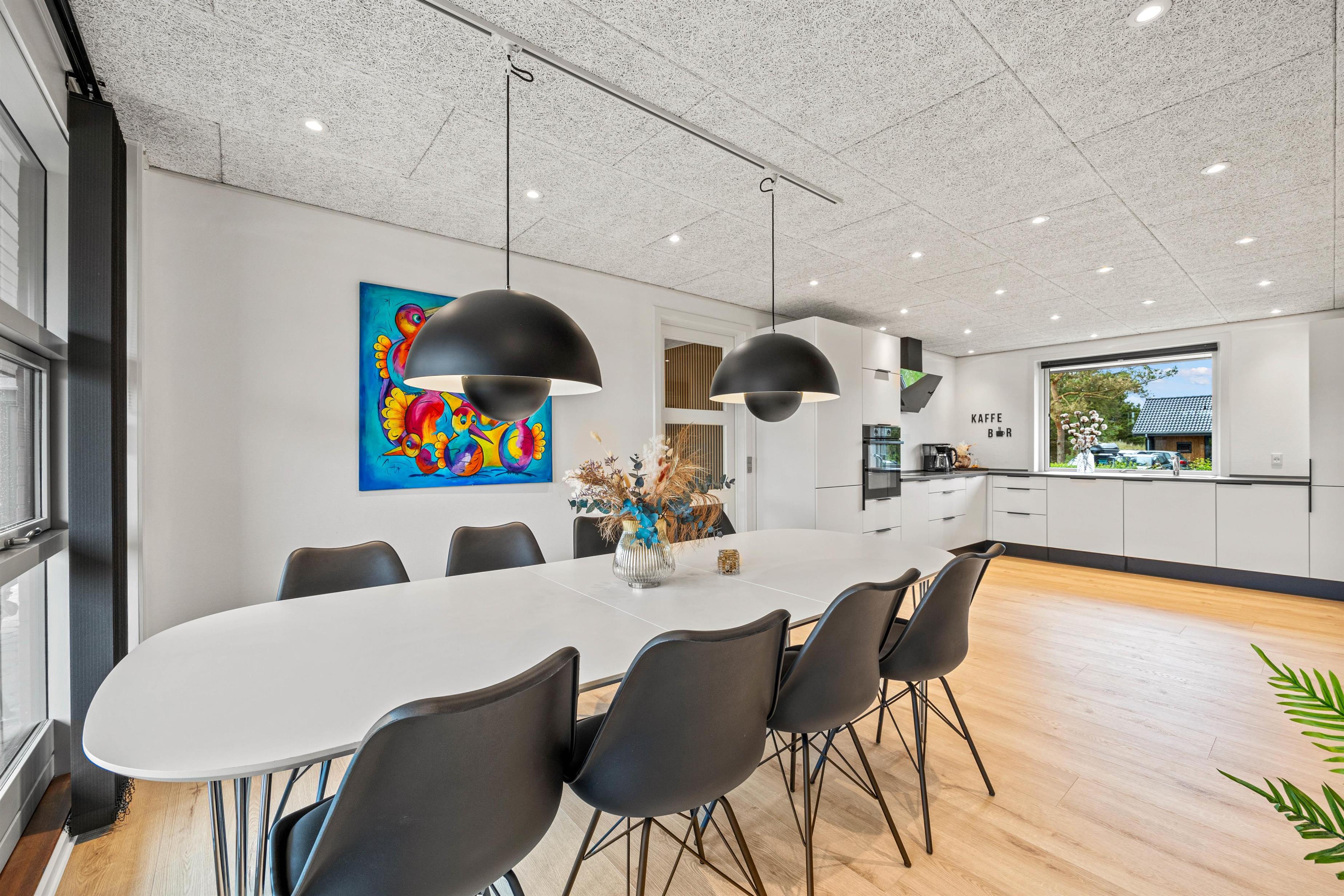 I det smagfuldt indrettede feriehus finder I alt, hvad I har brug for til et skønt ophold i Blåvand. Det dejlige, lyse køkken/alrum i sommerhusets hjerte har god plads og er udstyret med opvaskemaskine og mikroovn samt en 70 liters fryser, ligesom der er en ekstra køle/fryse-søjle i garagen.