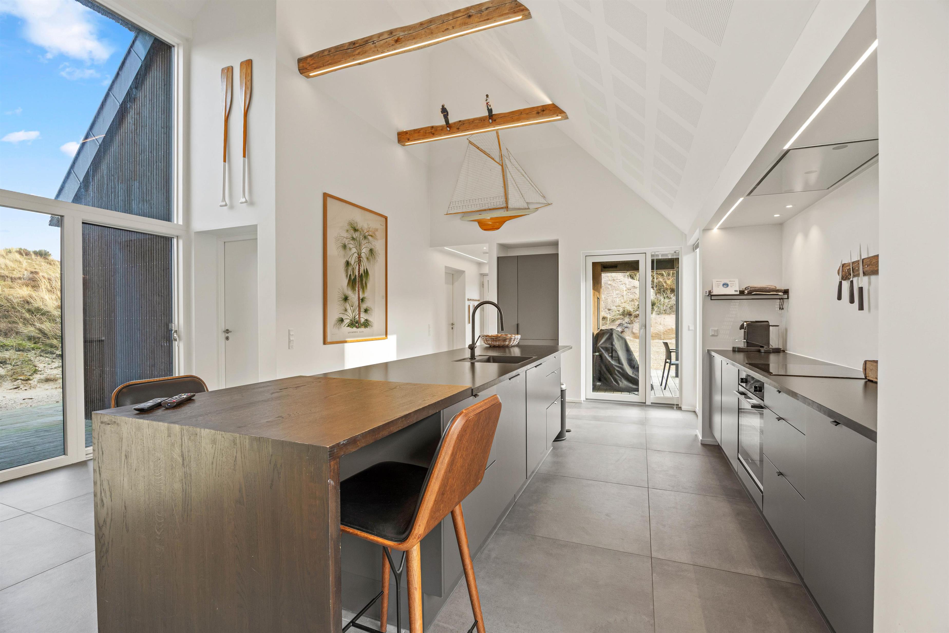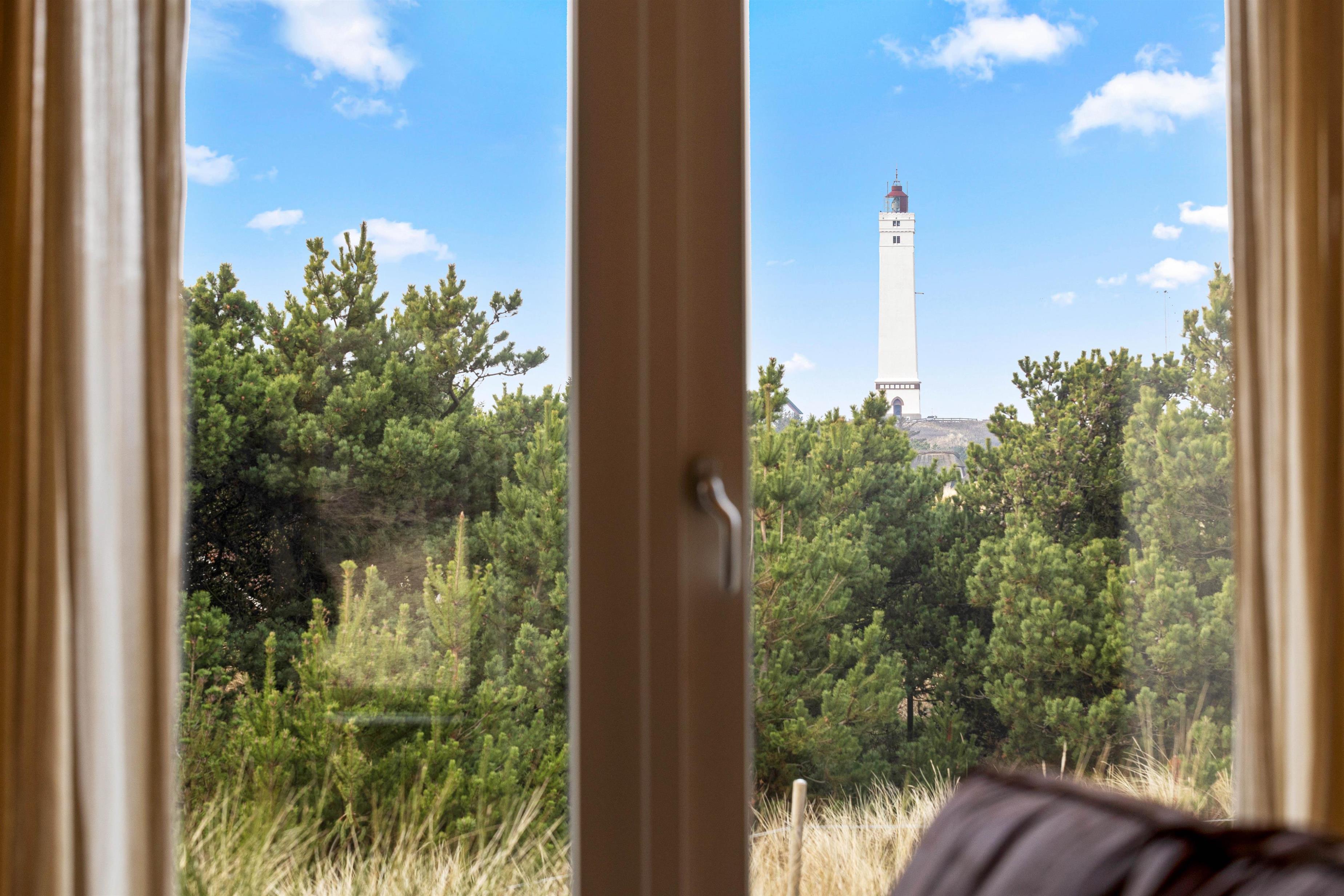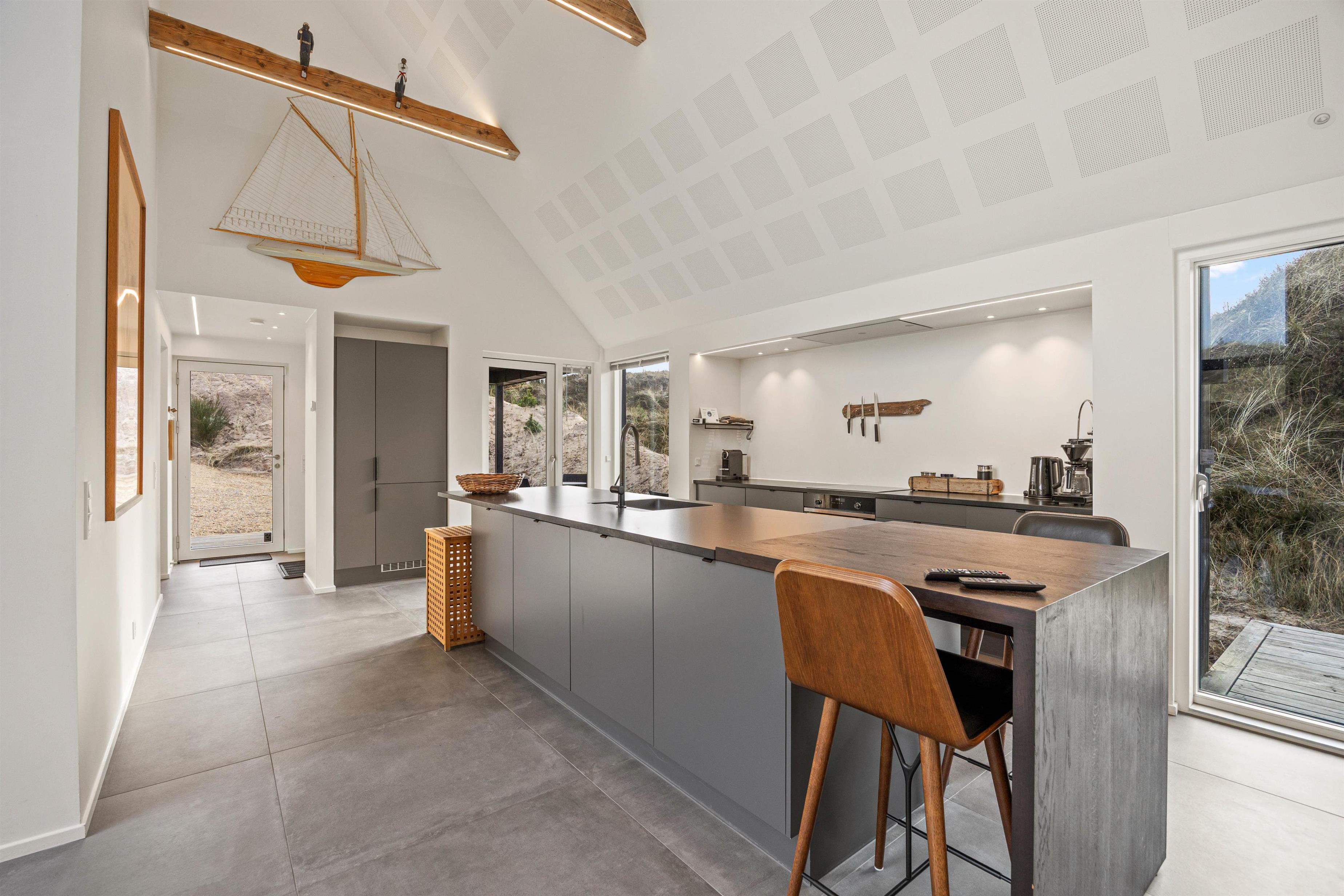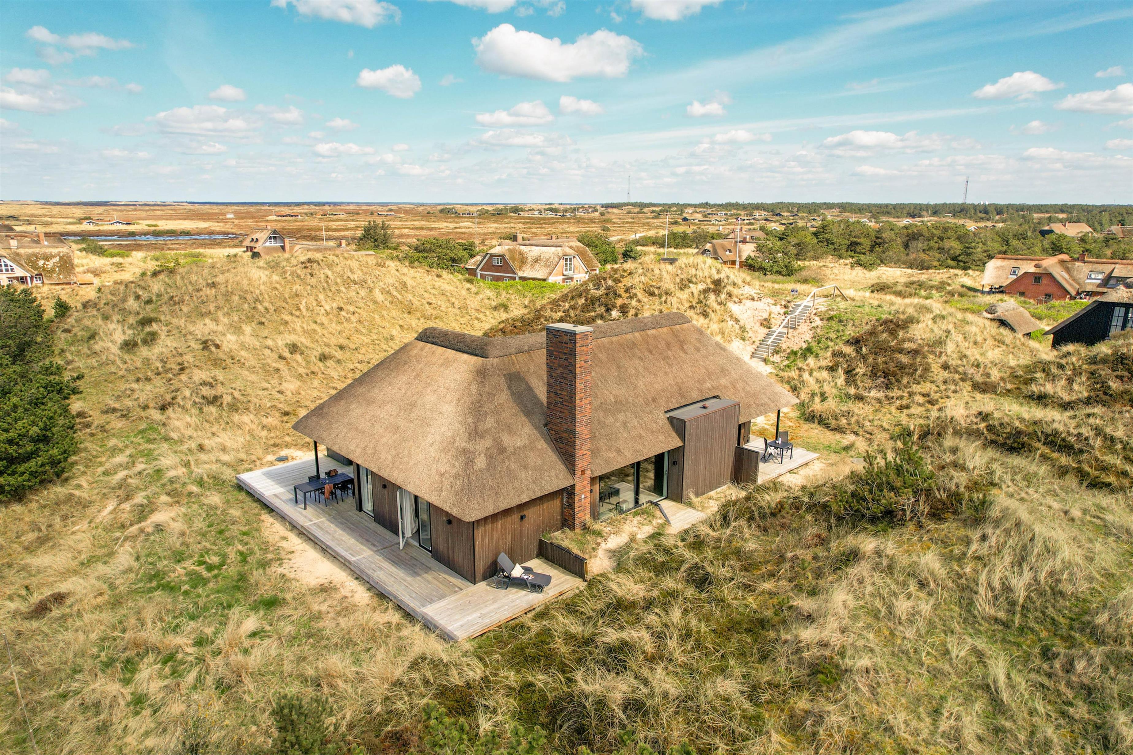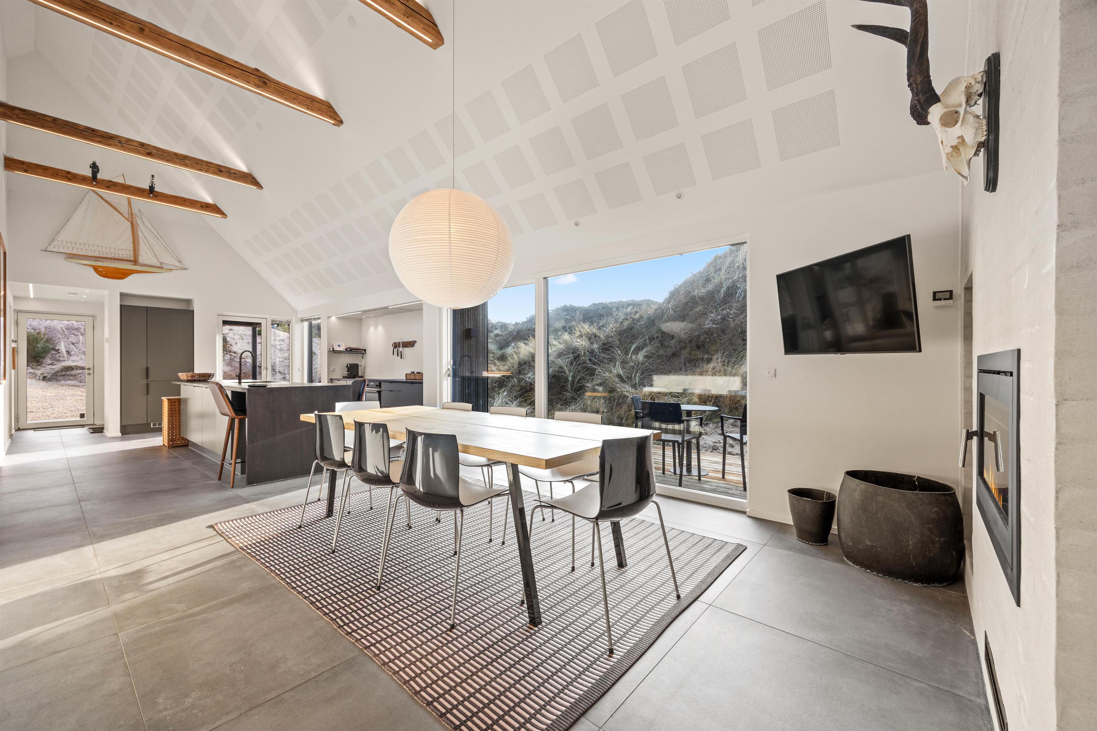Det store køkken/alrum er adskilt fra opholdsrummet via en mur med integreret, gennemgående pejs, der sikrer hygge og varme i begge afdelinger. Atmosfæren i det lyse sommerhus, samt den vidunderlige udsigt ud over det omkringliggende klitlandskab og fyret i Blåvandshuk, er unik. Her kan du tilbringe en uforglemmelig ferie.