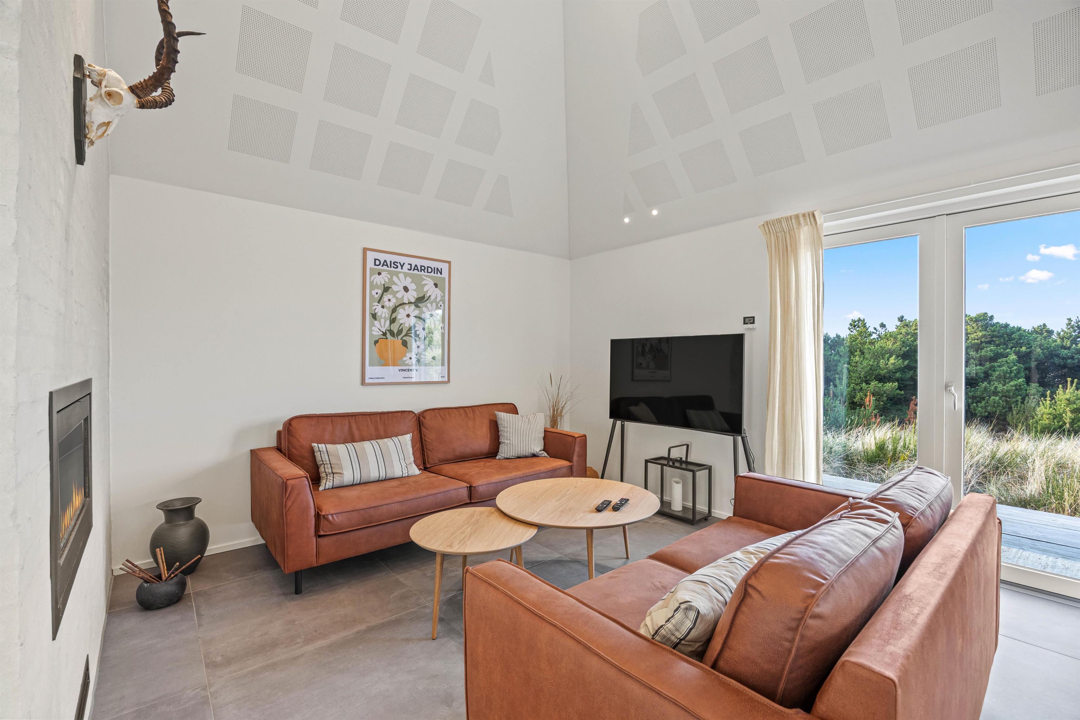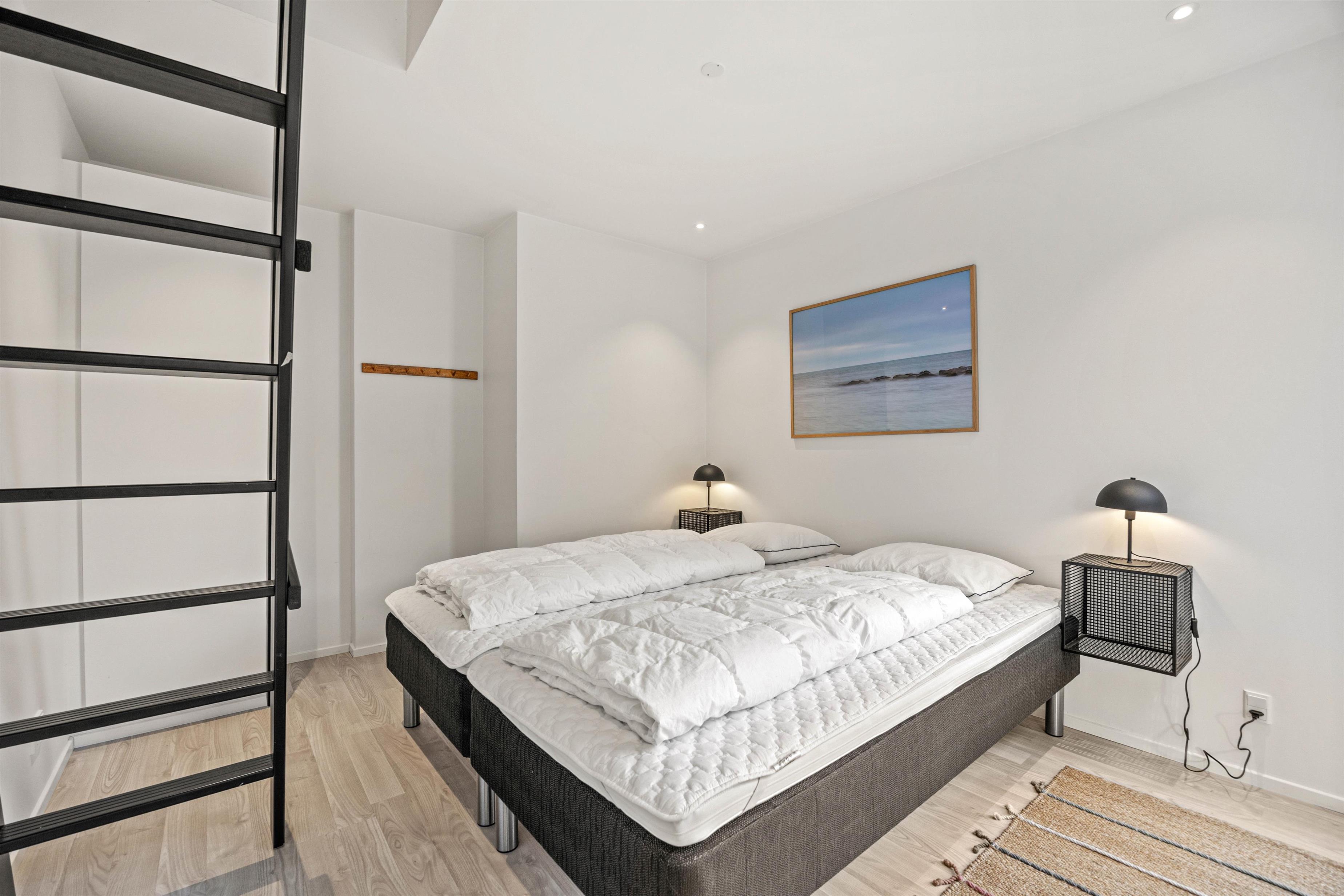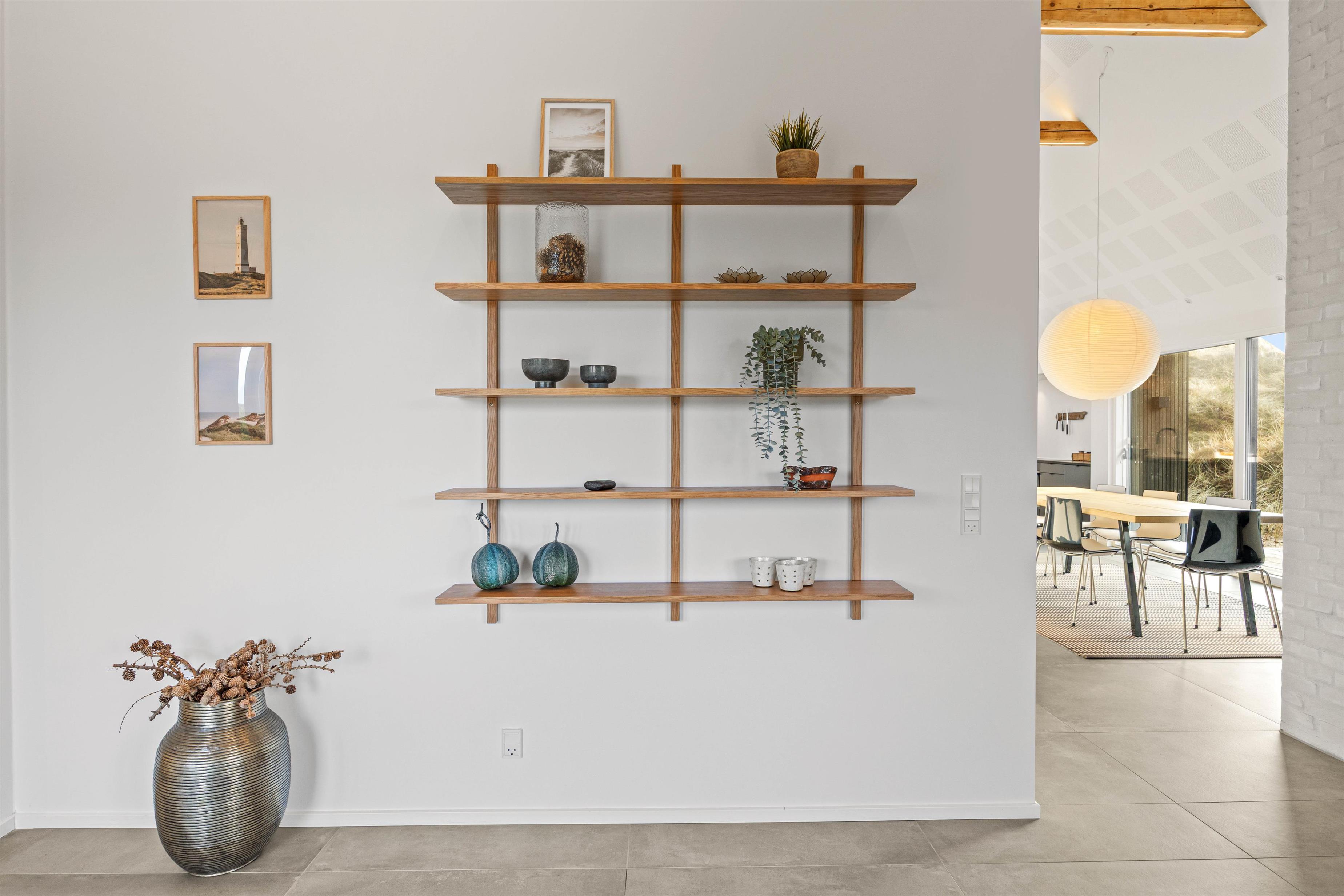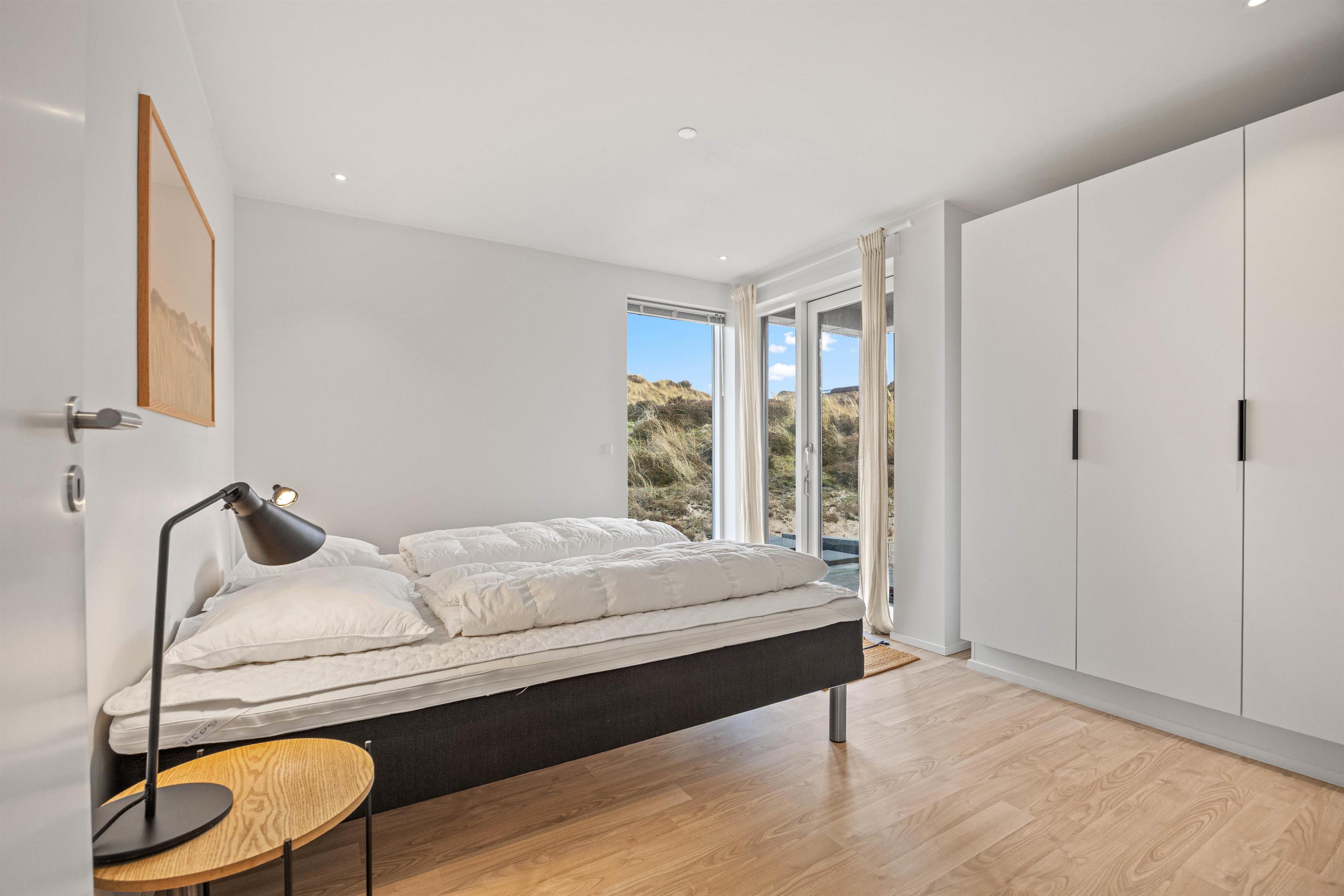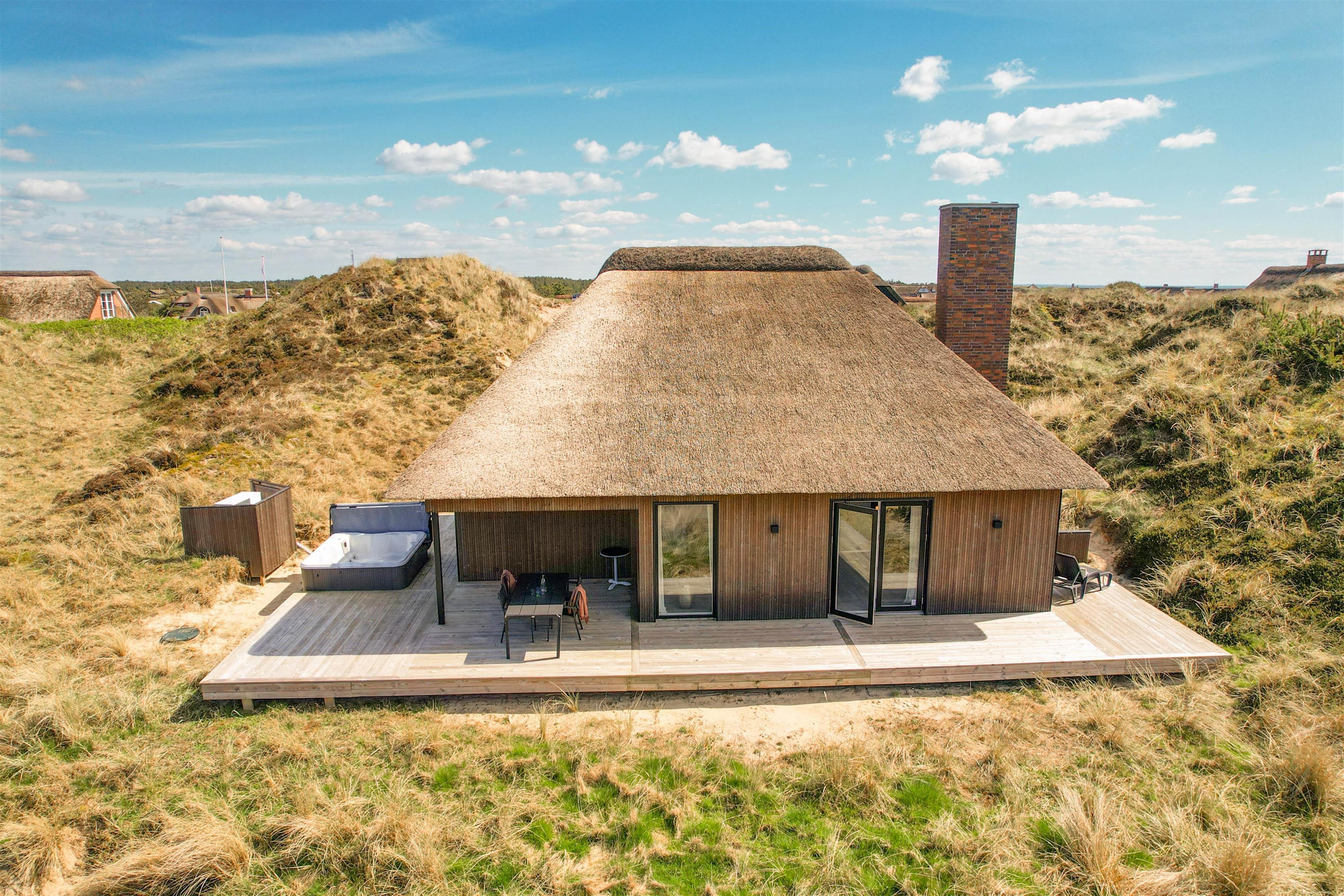 Det store køkken/alrum er adskilt fra opholdsrummet via en mur med integreret, gennemgående pejs, der sikrer hygge og varme i begge afdelinger. Atmosfæren i det lyse sommerhus, samt den vidunderlige udsigt ud over det omkringliggende klitlandskab og fyret i Blåvandshuk, er unik. Her kan du tilbringe en uforglemmelig ferie.