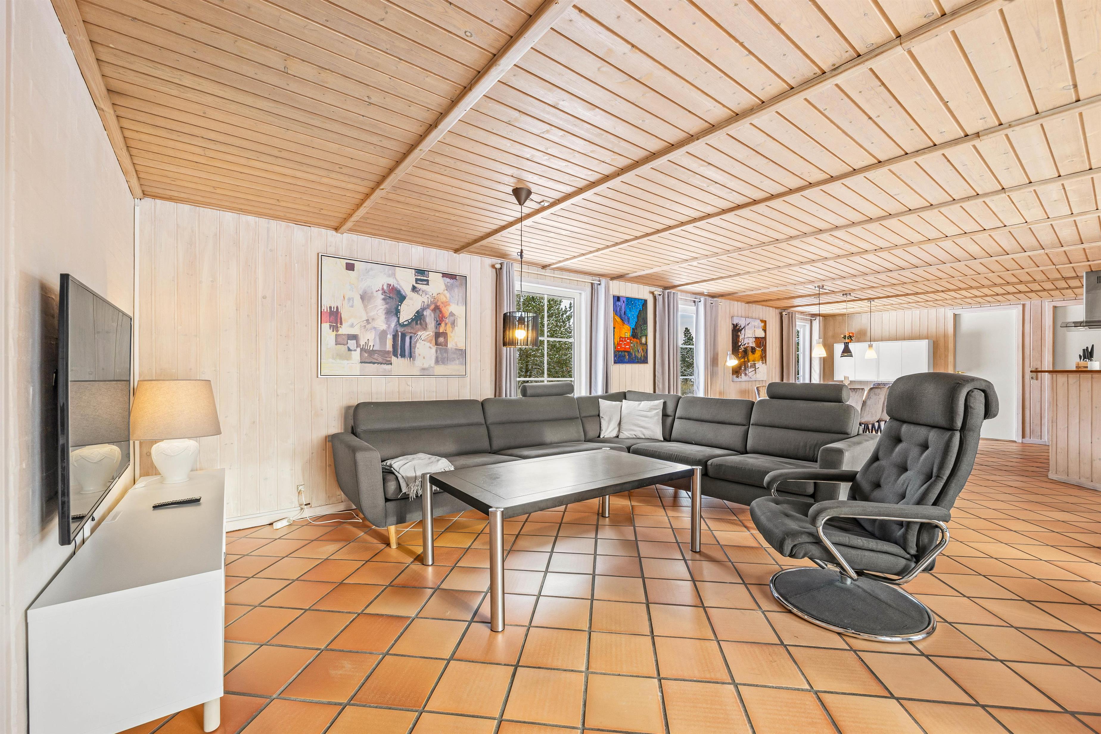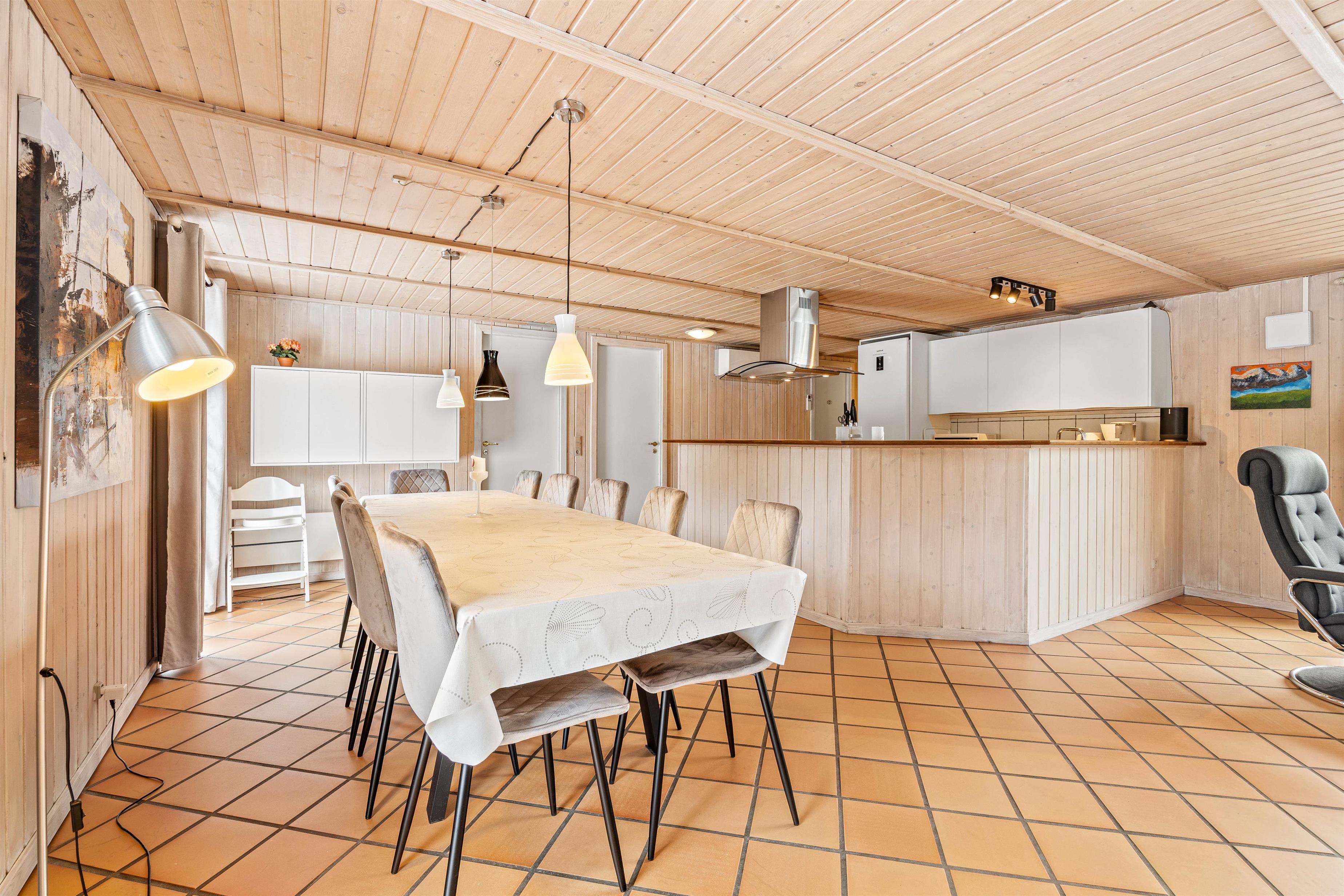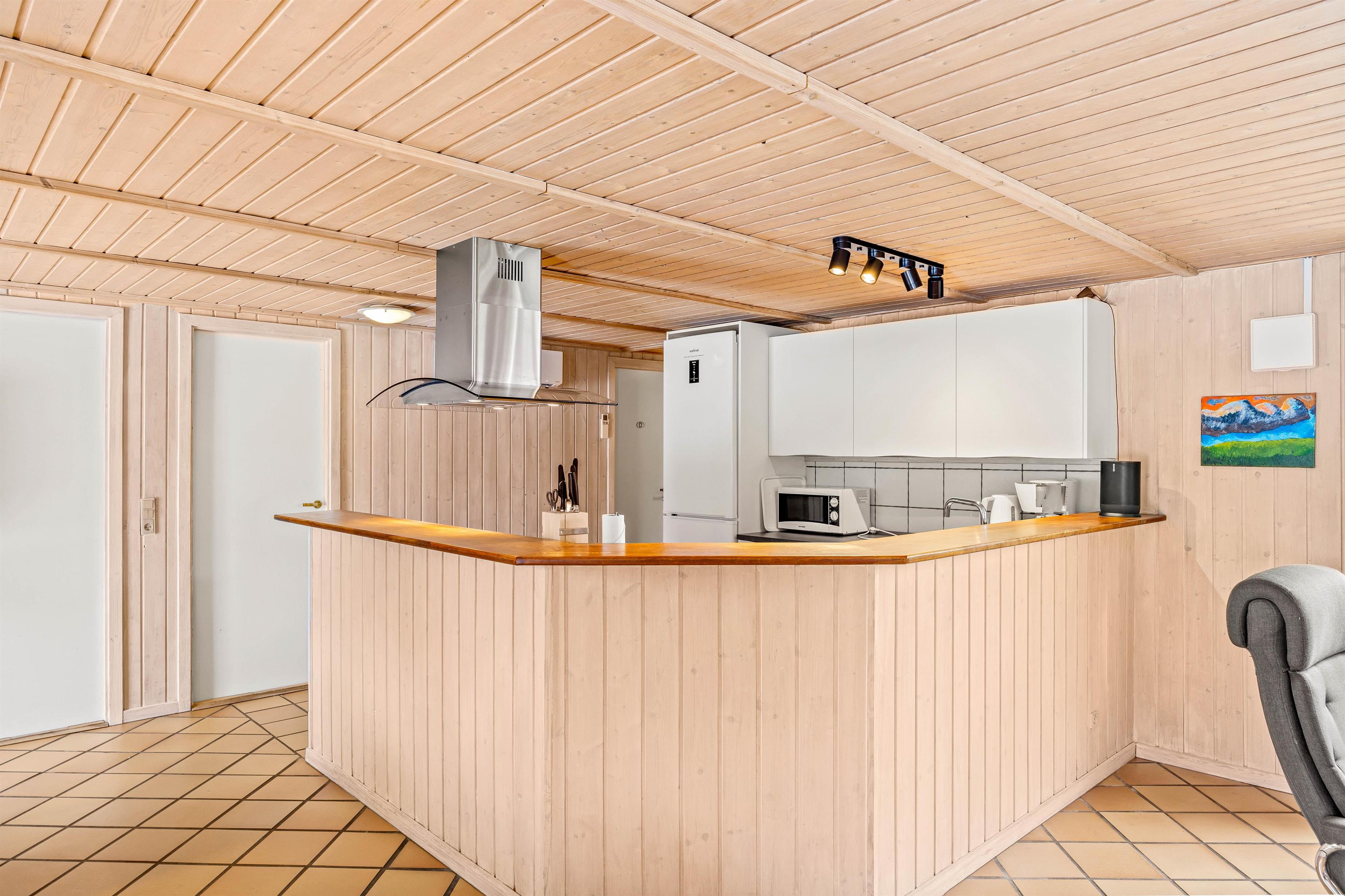 Mellem de 2 fløje med henholdsvis værelser og poolrum ligger alrummet, hvor stue, spiseplads og køkken ligger i åben forbindelse. Her kan I samles til hyggelige stunder med hele familien, mens brændeovnen knitrer i baggrunden. Desuden har sommerhuset en energibesparende varmepumpe, som I med fordel kan benytte jer af.