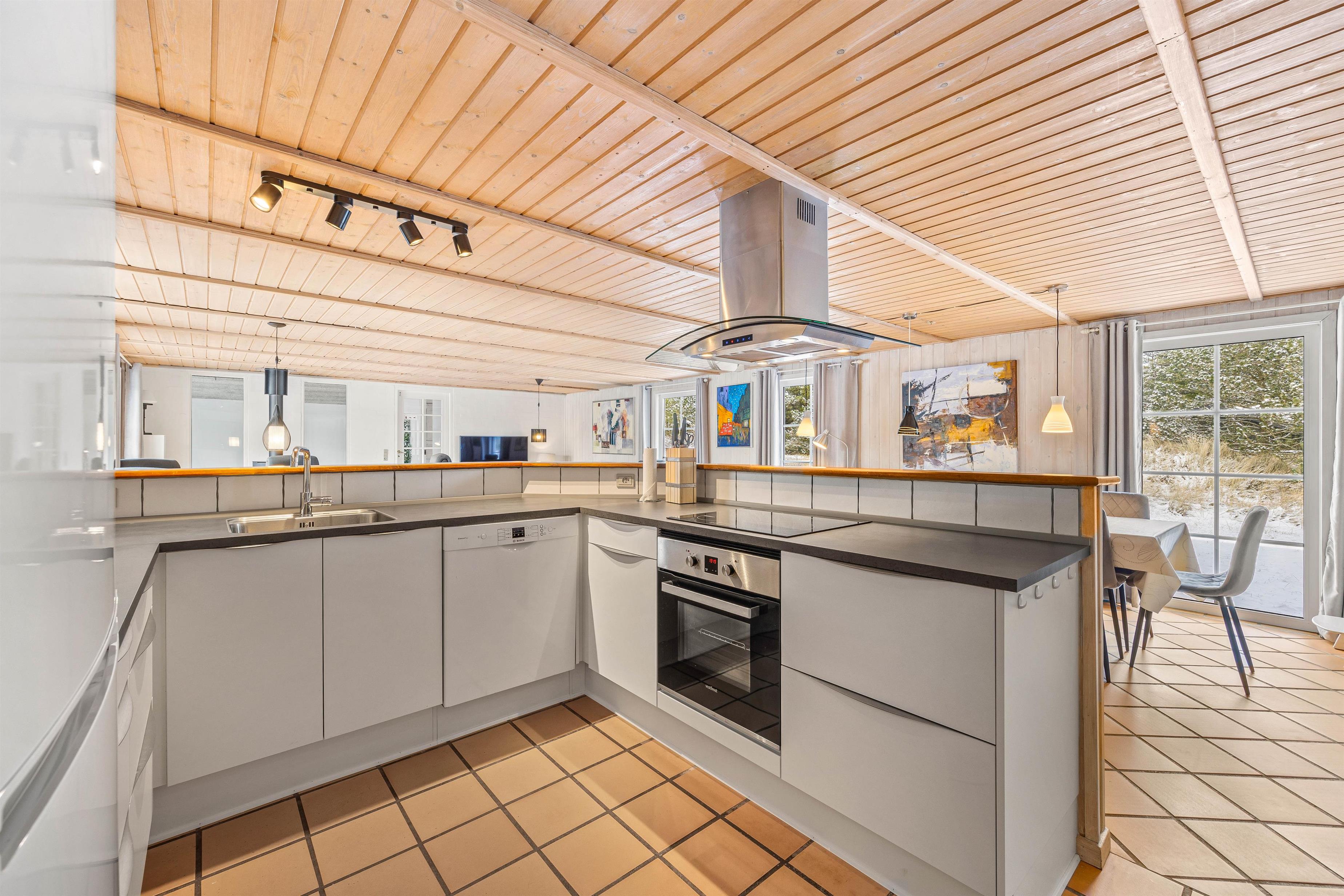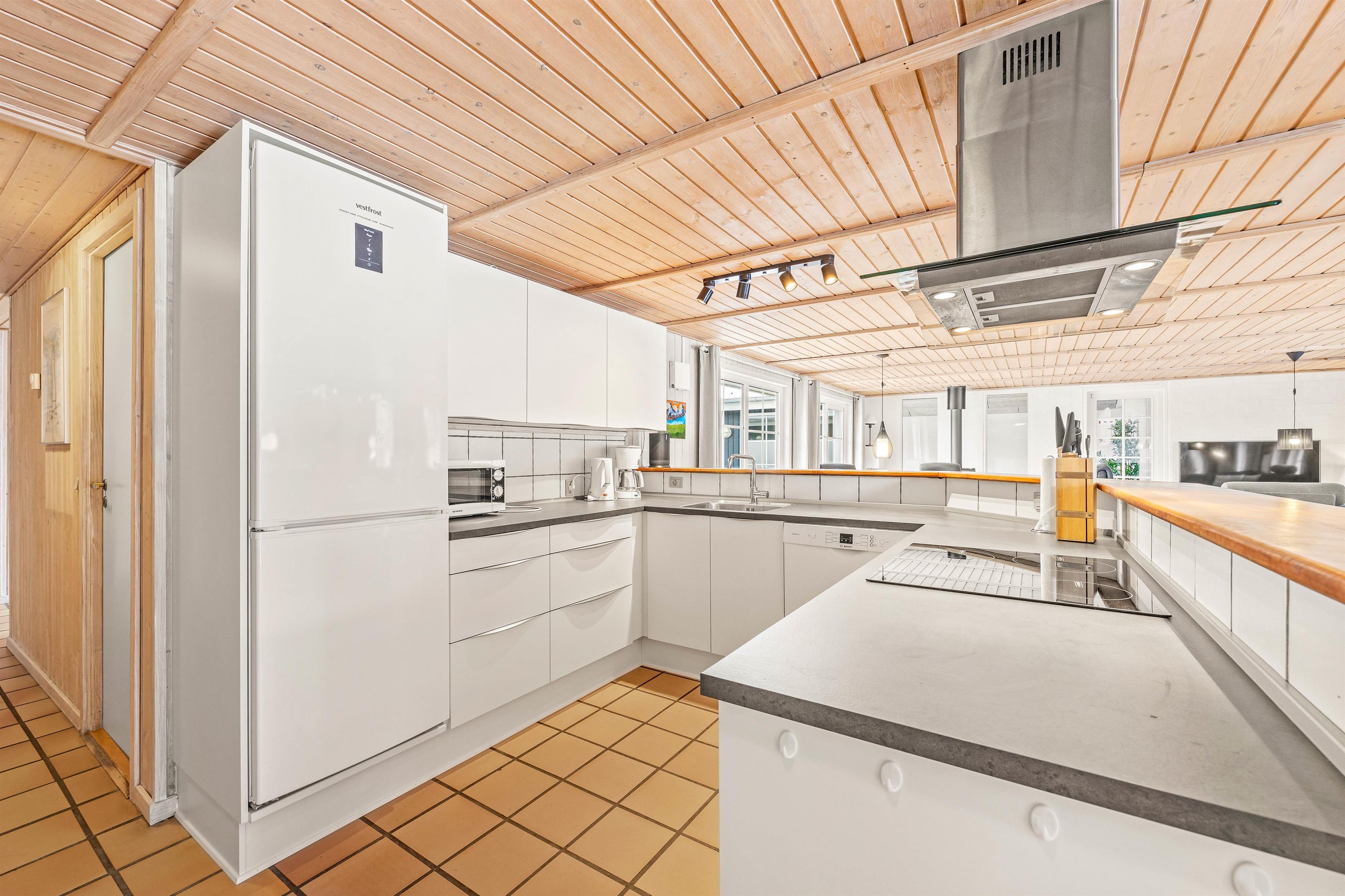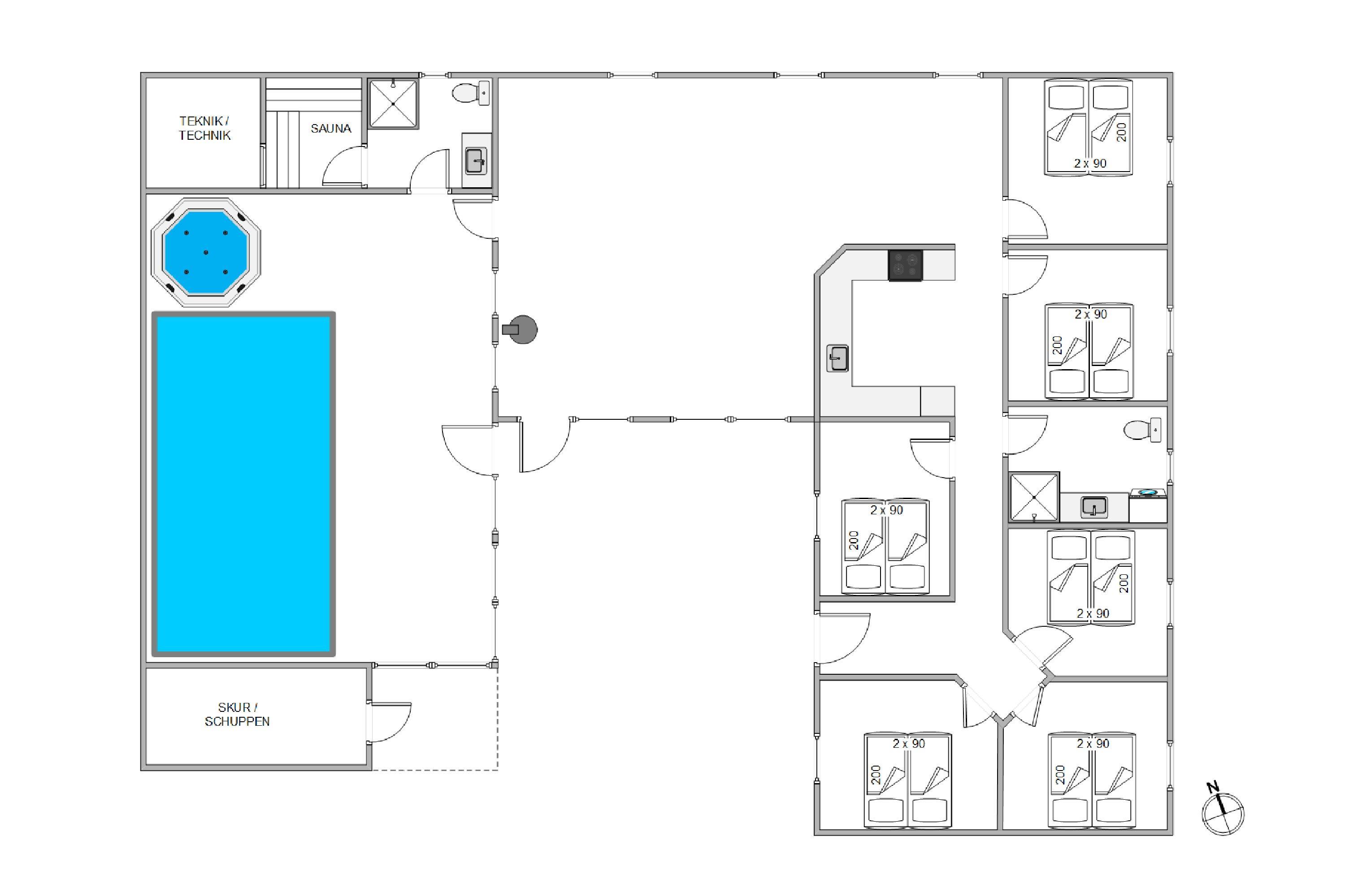 Mellem de 2 fløje med henholdsvis værelser og poolrum ligger alrummet, hvor stue, spiseplads og køkken ligger i åben forbindelse. Her kan I samles til hyggelige stunder med hele familien, mens brændeovnen knitrer i baggrunden. Desuden har sommerhuset en energibesparende varmepumpe, som I med fordel kan benytte jer af.