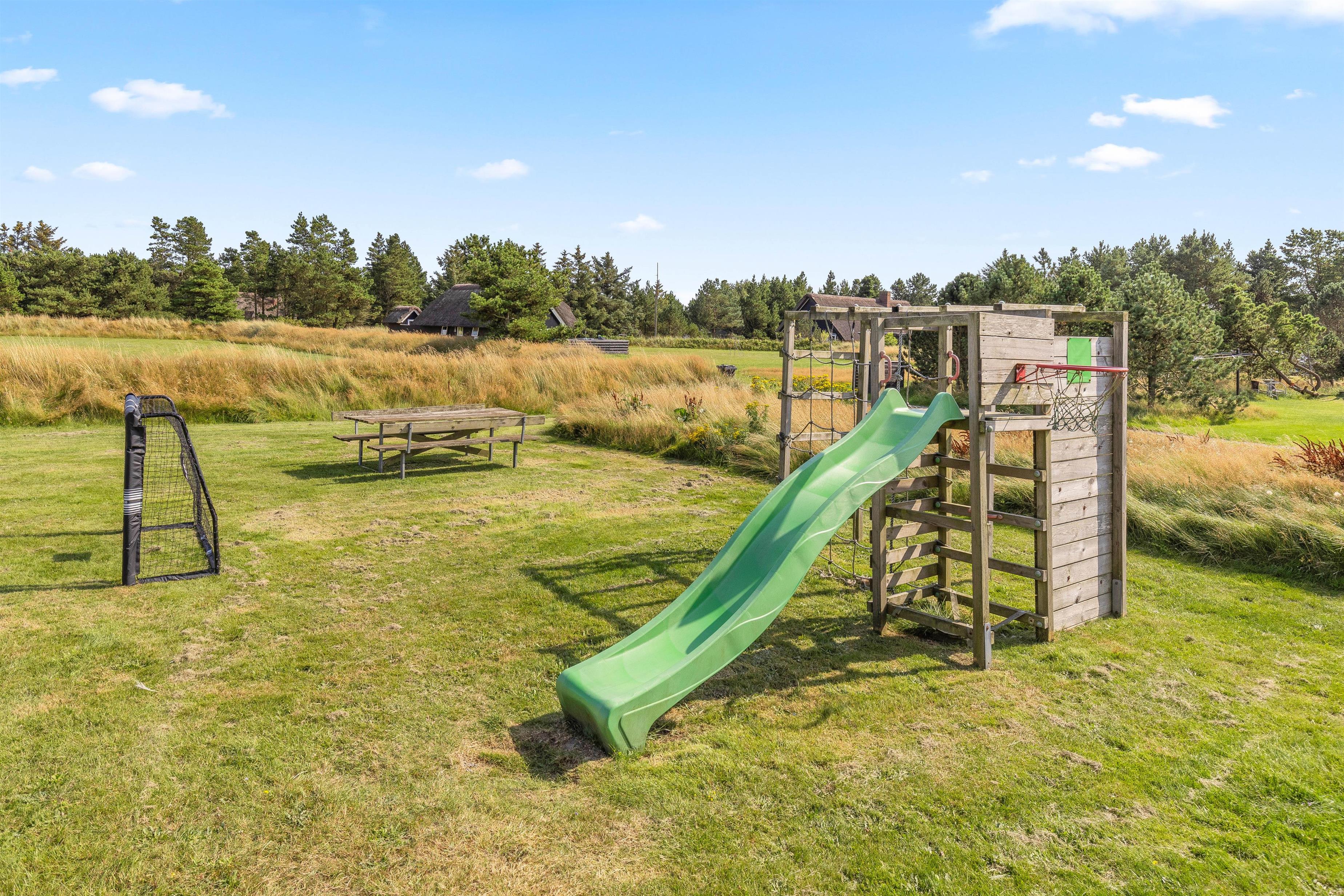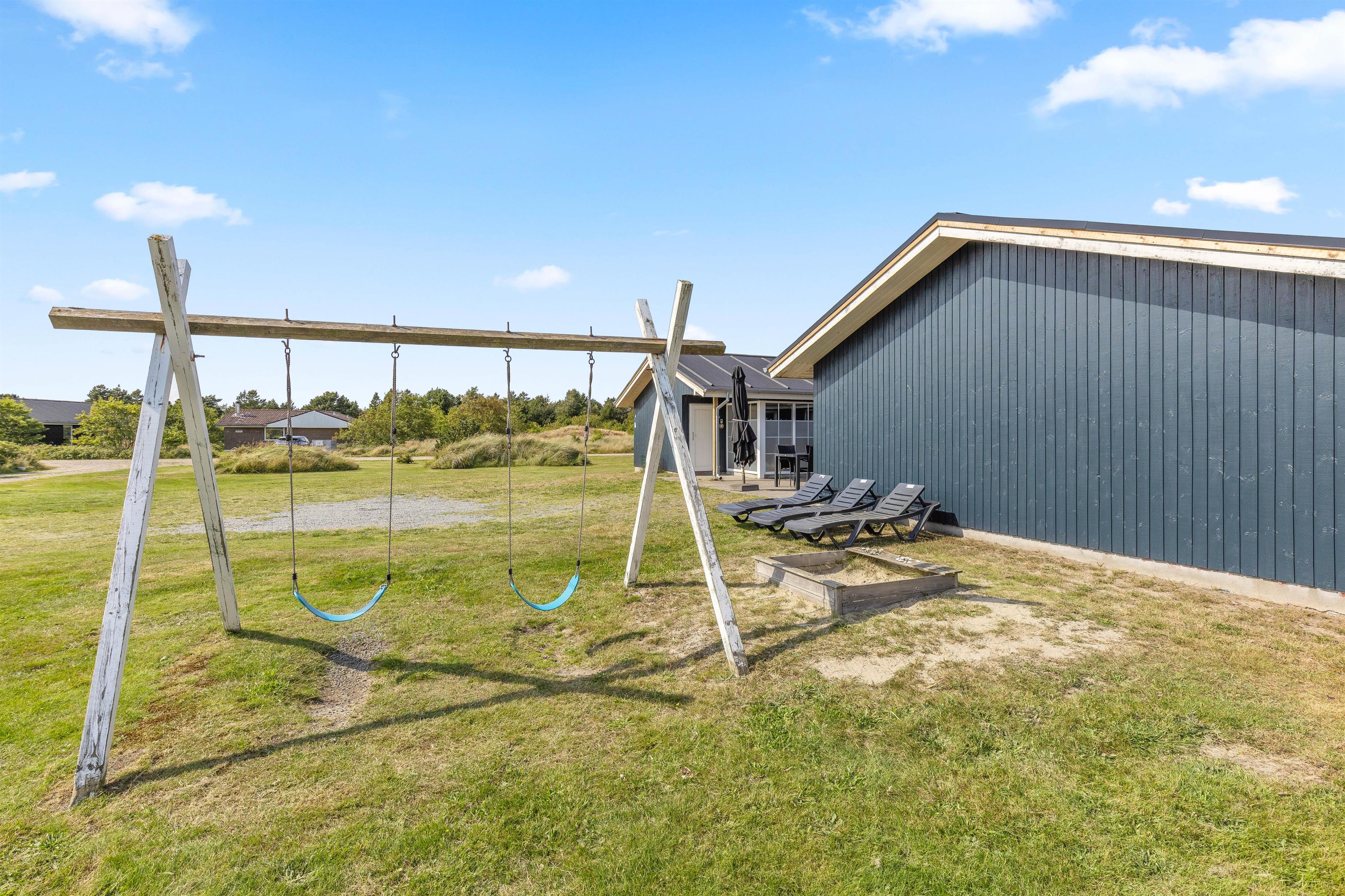Udendørs er der en skøn terrasse, hvor I kan nyde de solrige dage, mens børnene boltrer sig på den store plænegrund. Her er der både sandkasse og gynge til familiens yngste.