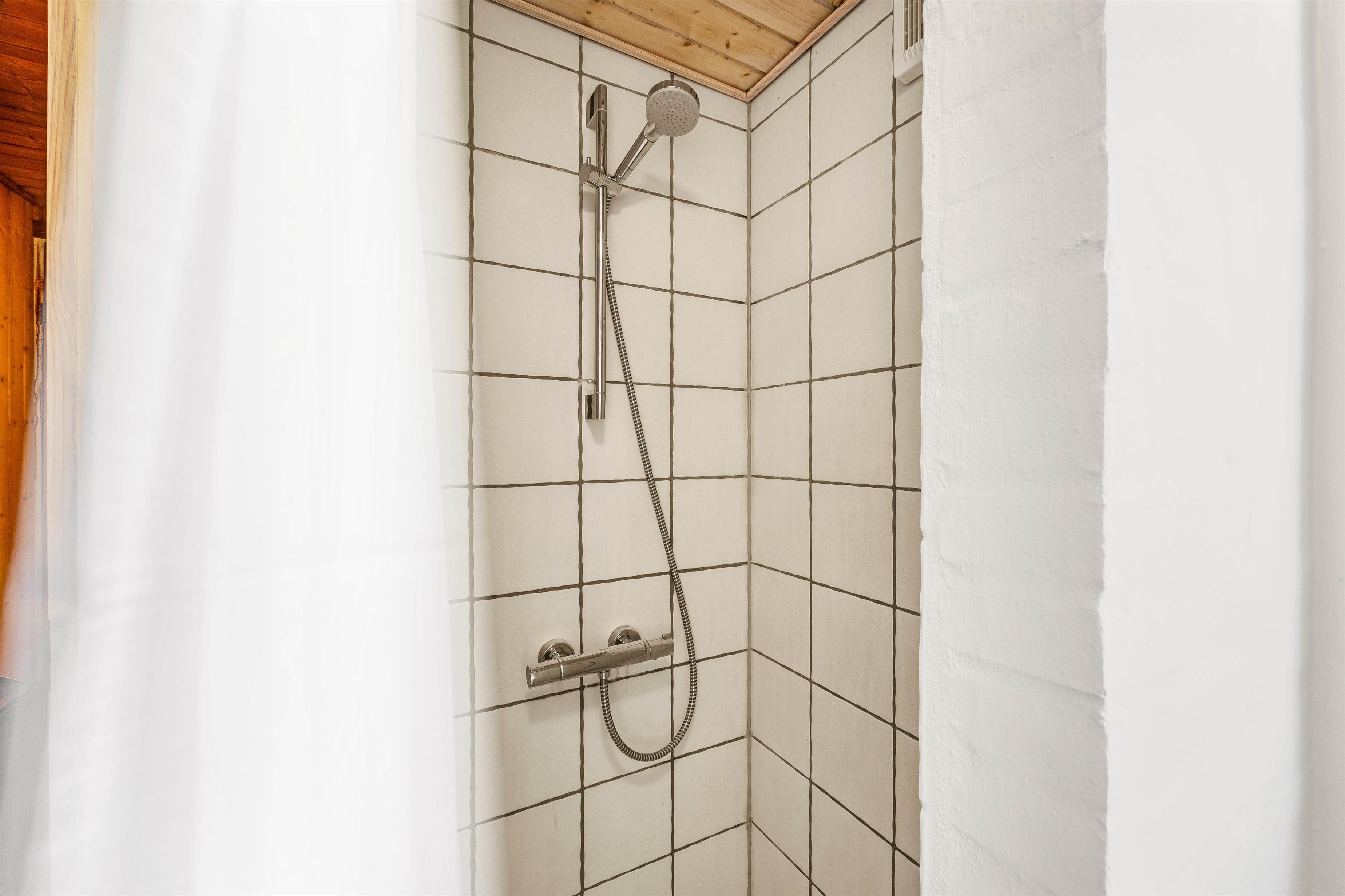 Saunaen ligger ved det ene af sommerhusets i alt 2 badeværelser med gulvvarme, der ligger i forbindelse med poolrummet.
