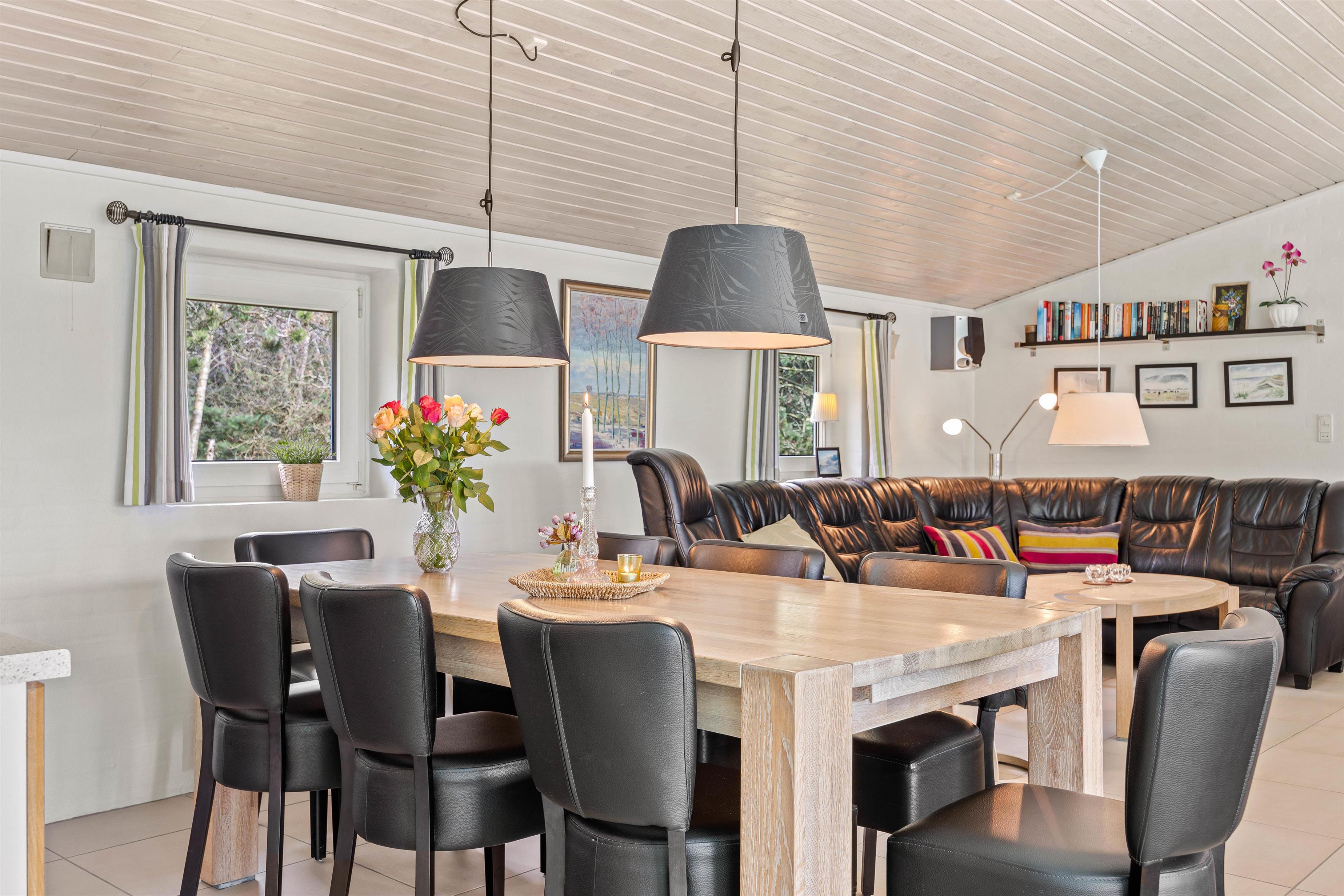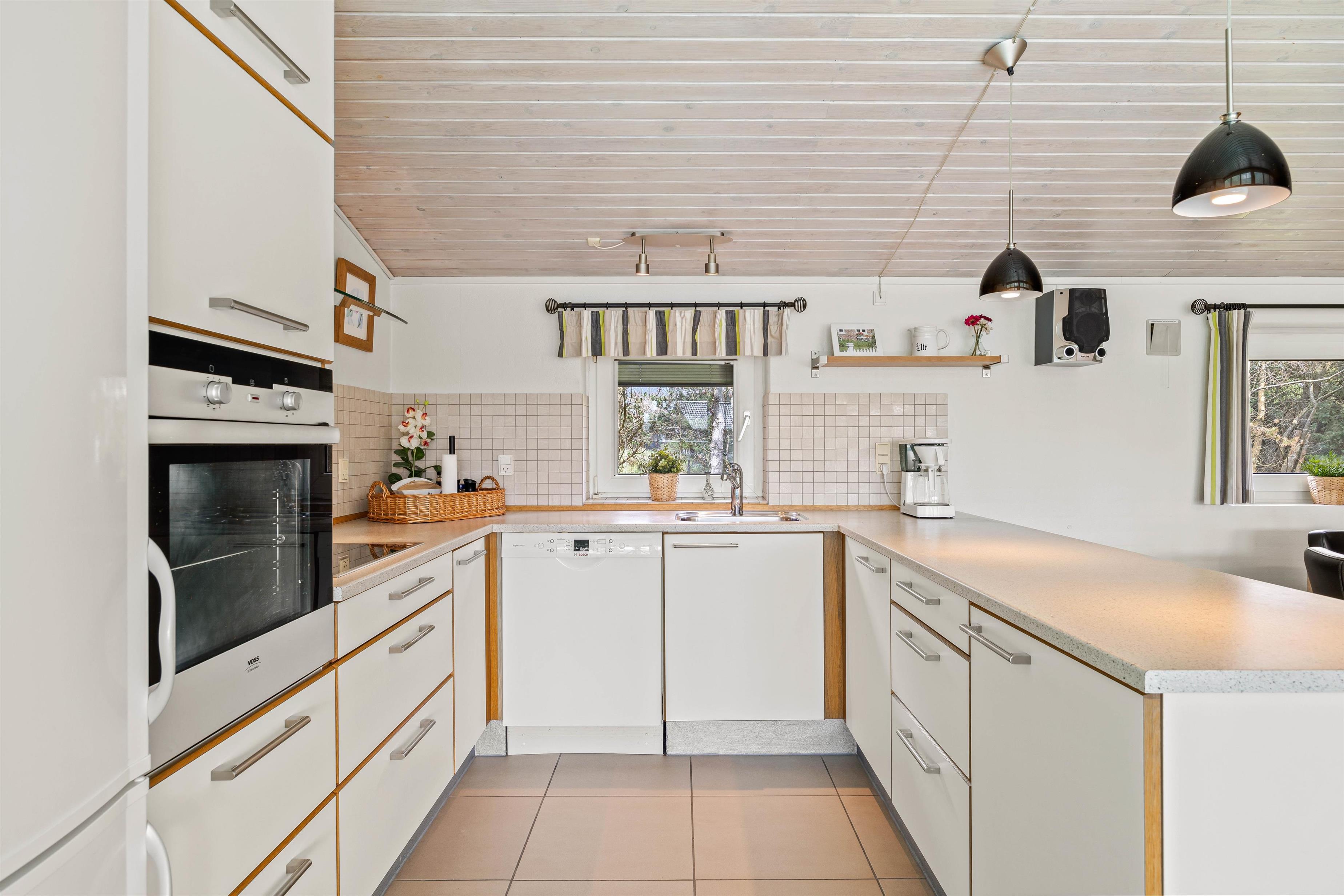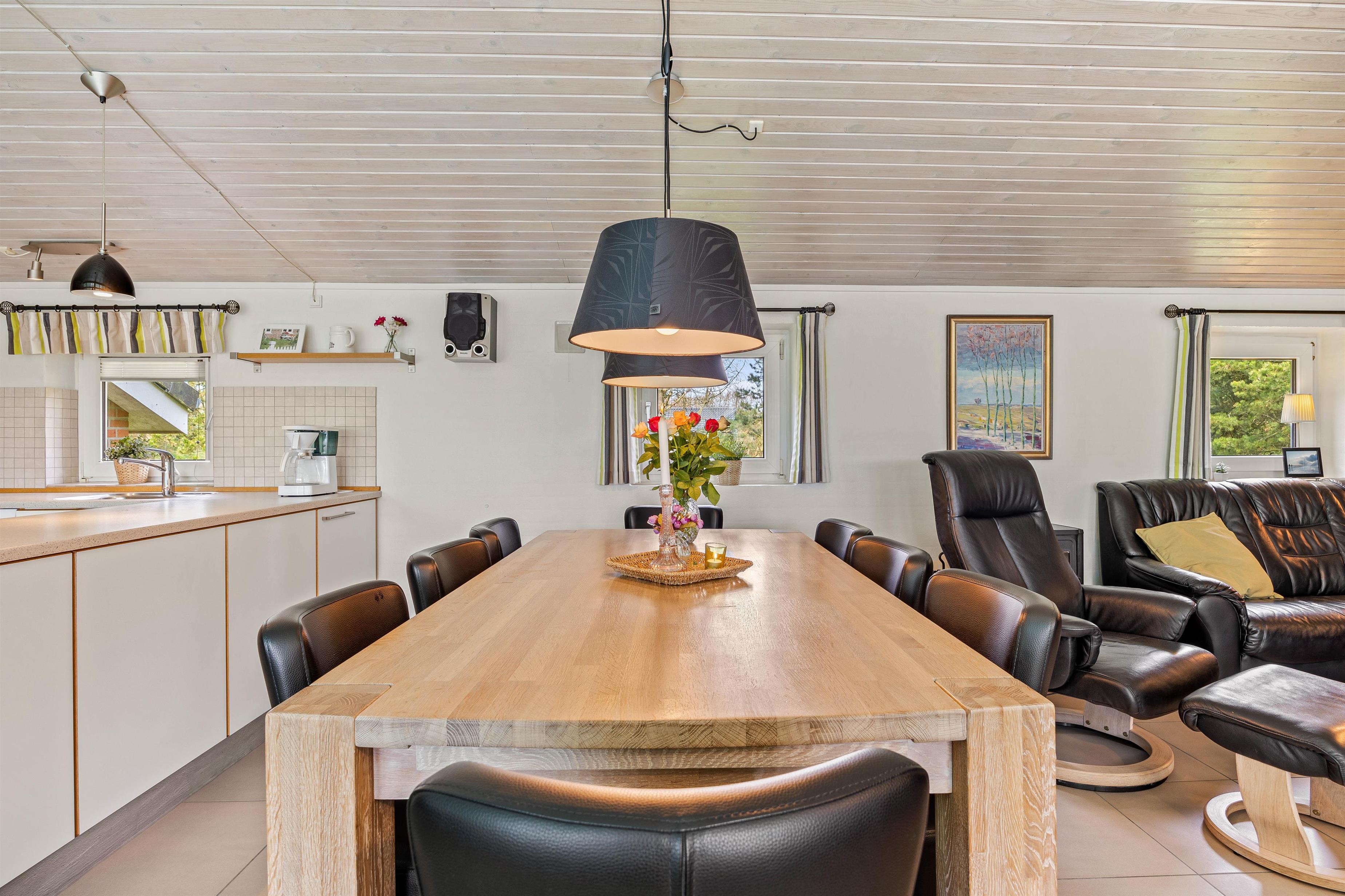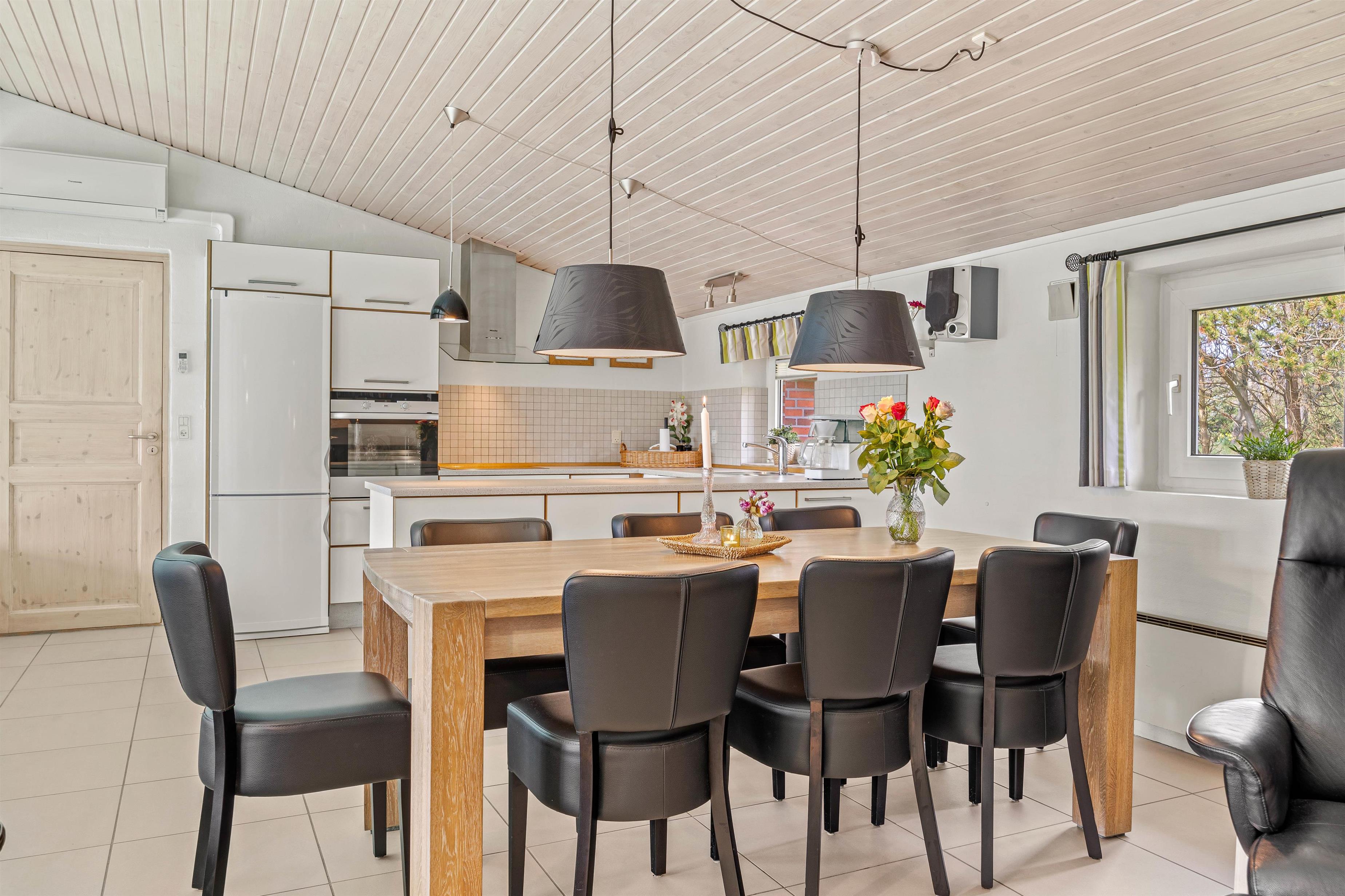 Poolen falder helt sikkert i god jord hos især børnene, der kan få timevis af sjov med dykning eller en badebold, imens den står på afslapning i spaen eller i den unikke infrarødsauna, som giver en rar varm fornemmelse i kroppen. Indefra poolrummet kan man gennem det store glasparti se ud i køkkenalrummet. Det veludstyrede køkken står klar til brug, og i modsatte ende kan I dumpe ned i sofaarrangementet efter en lang dag i poolen eller i Blåvand. I hjørnet af stuen findes også pejsen, som spreder hygge og varme.