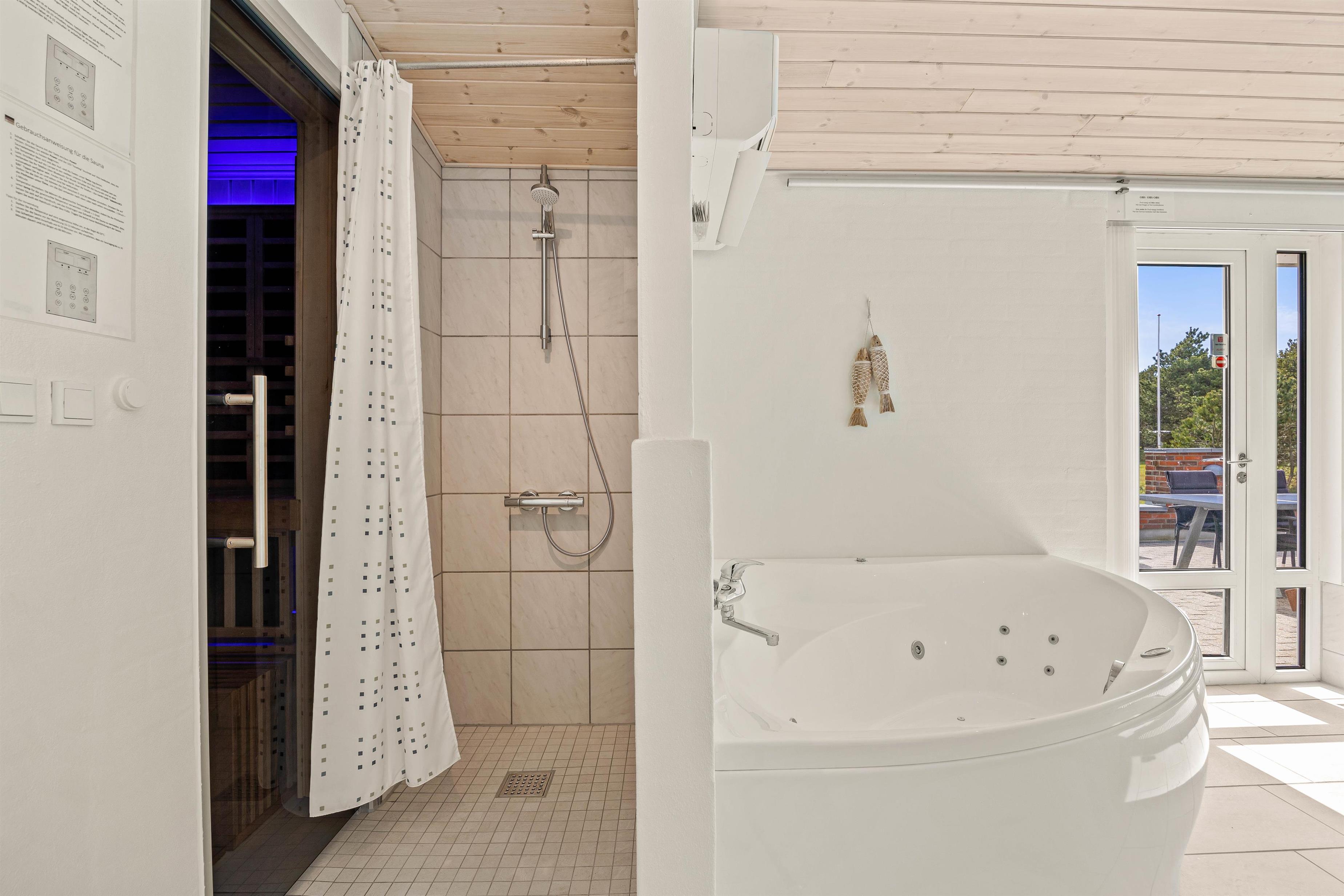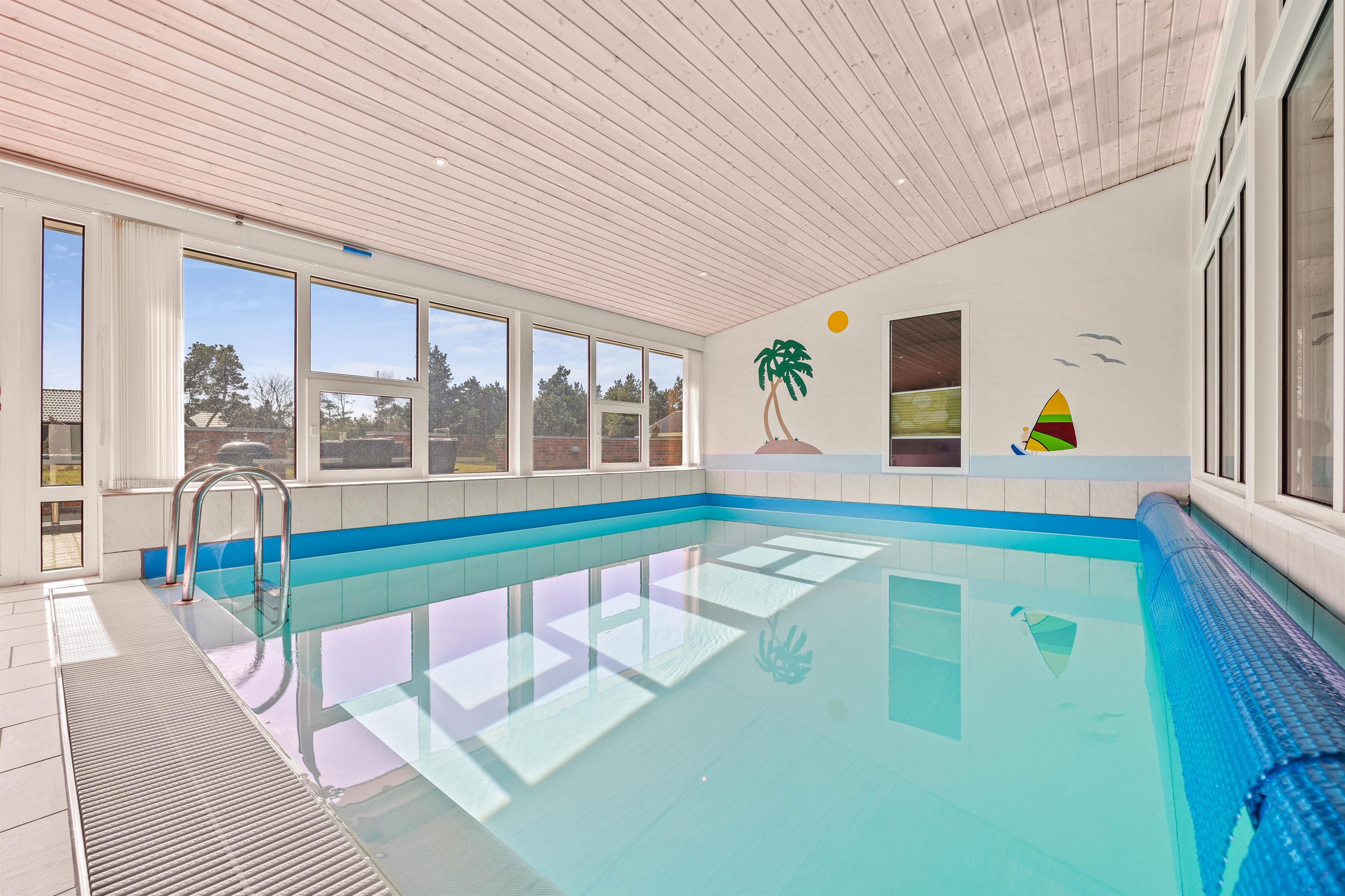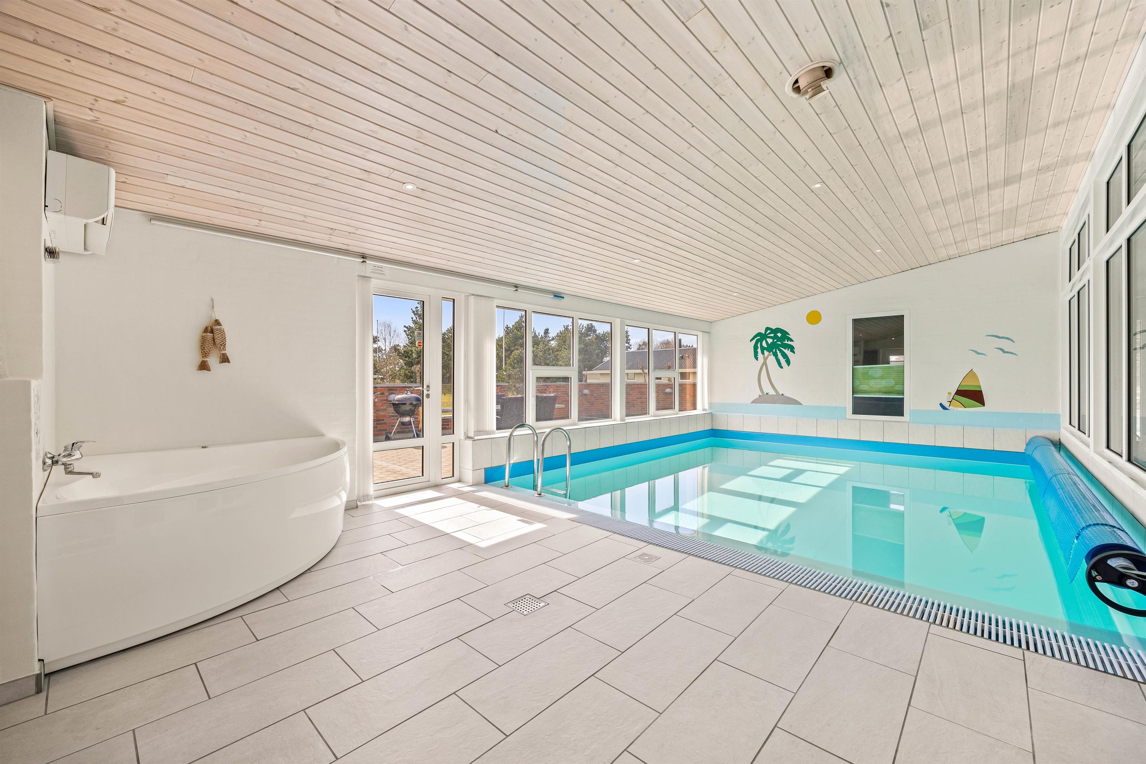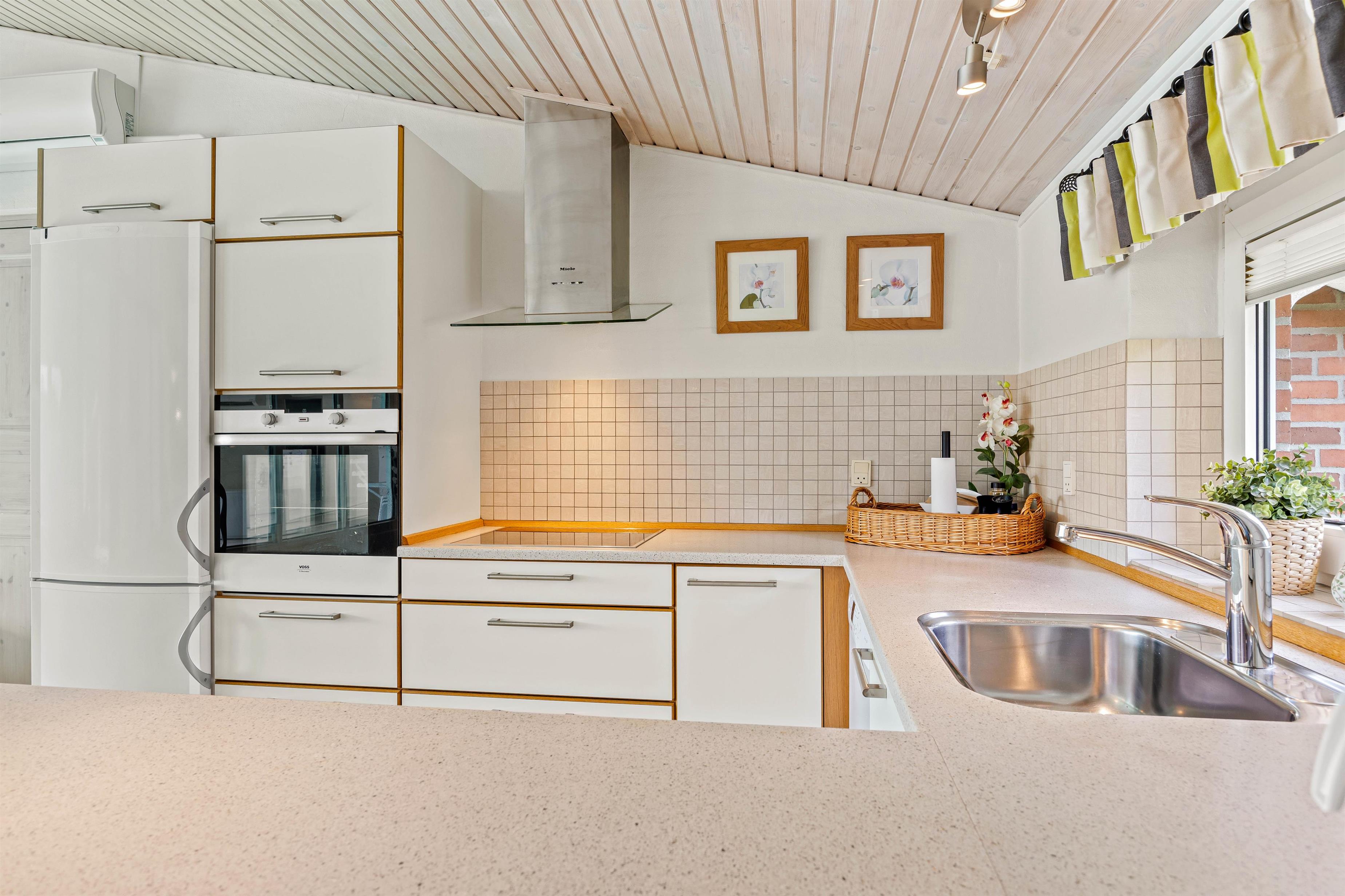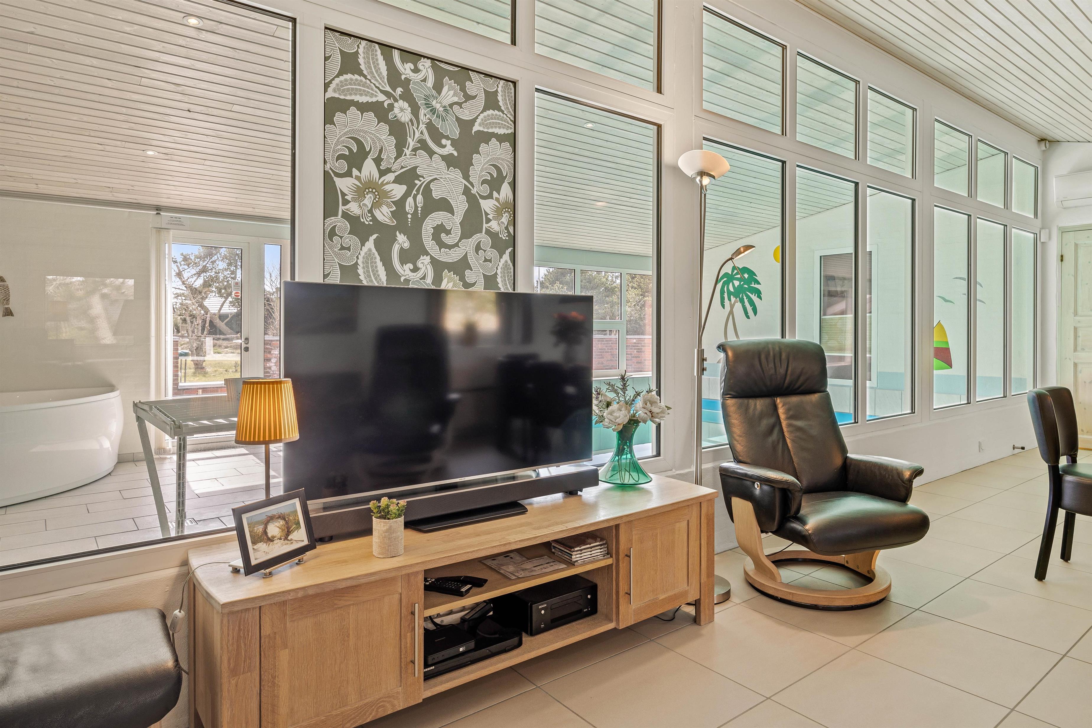 Poolen falder helt sikkert i god jord hos især børnene, der kan få timevis af sjov med dykning eller en badebold, imens den står på afslapning i spaen eller i den unikke infrarødsauna, som giver en rar varm fornemmelse i kroppen. Indefra poolrummet kan man gennem det store glasparti se ud i køkkenalrummet. Det veludstyrede køkken står klar til brug, og i modsatte ende kan I dumpe ned i sofaarrangementet efter en lang dag i poolen eller i Blåvand. I hjørnet af stuen findes også pejsen, som spreder hygge og varme.