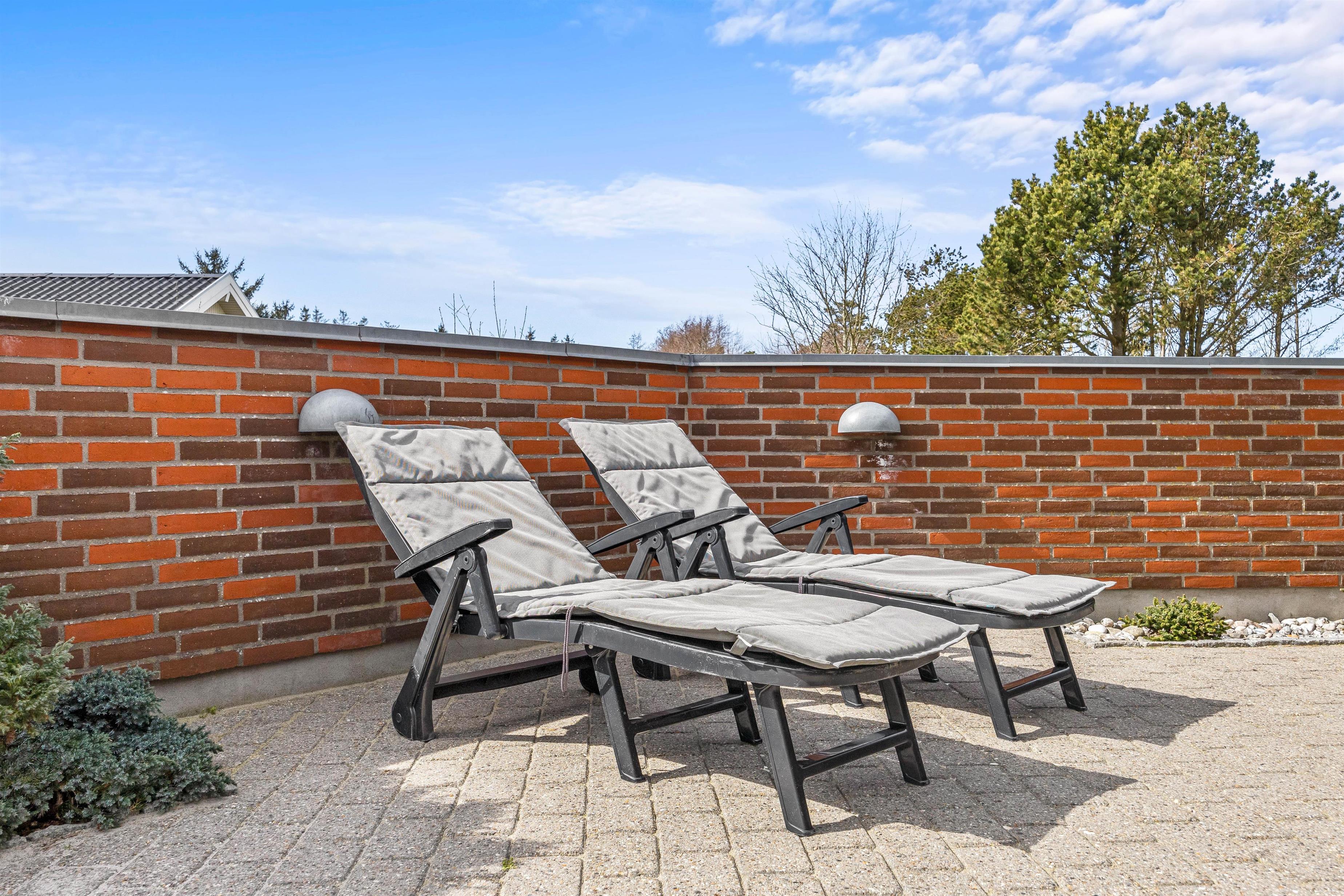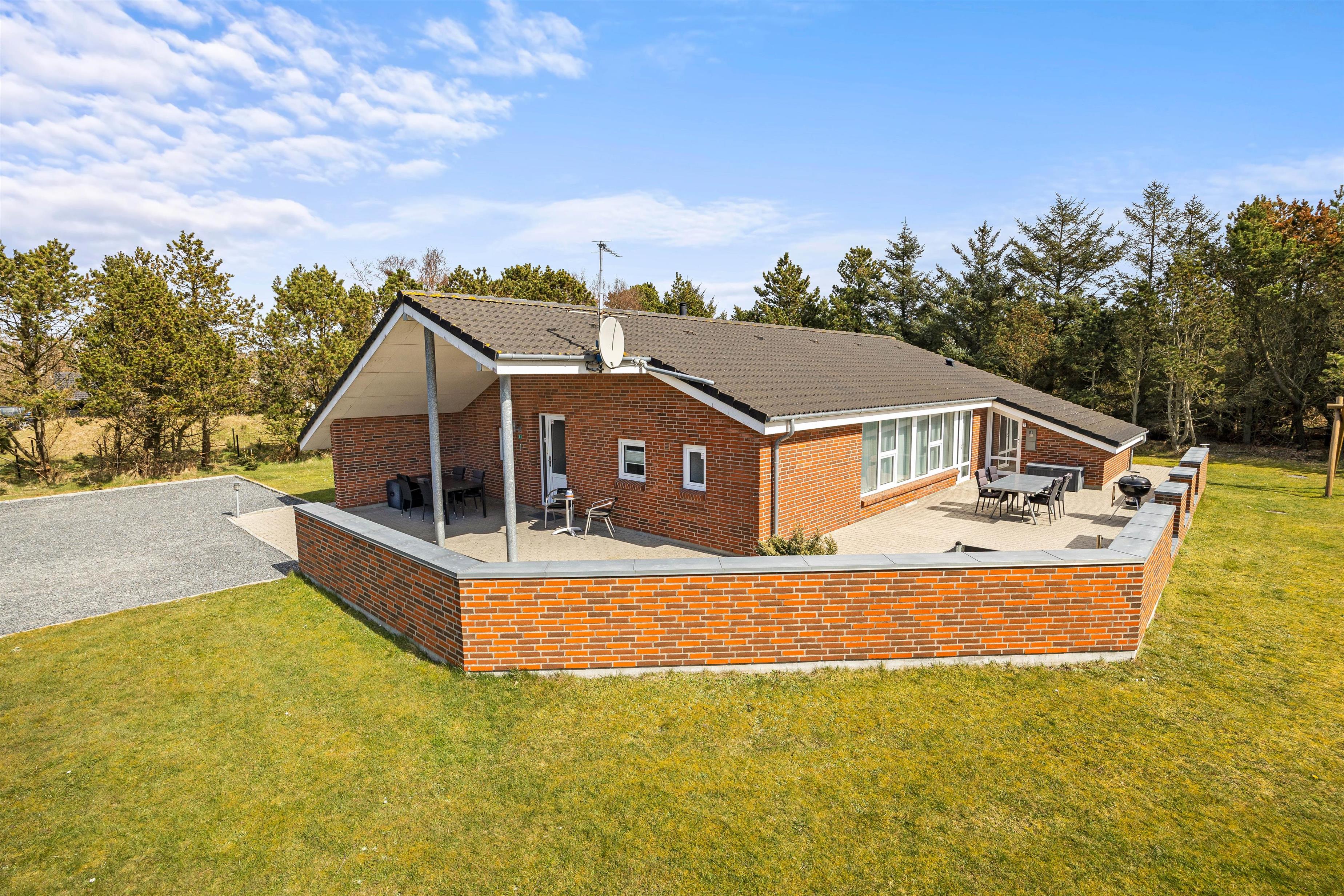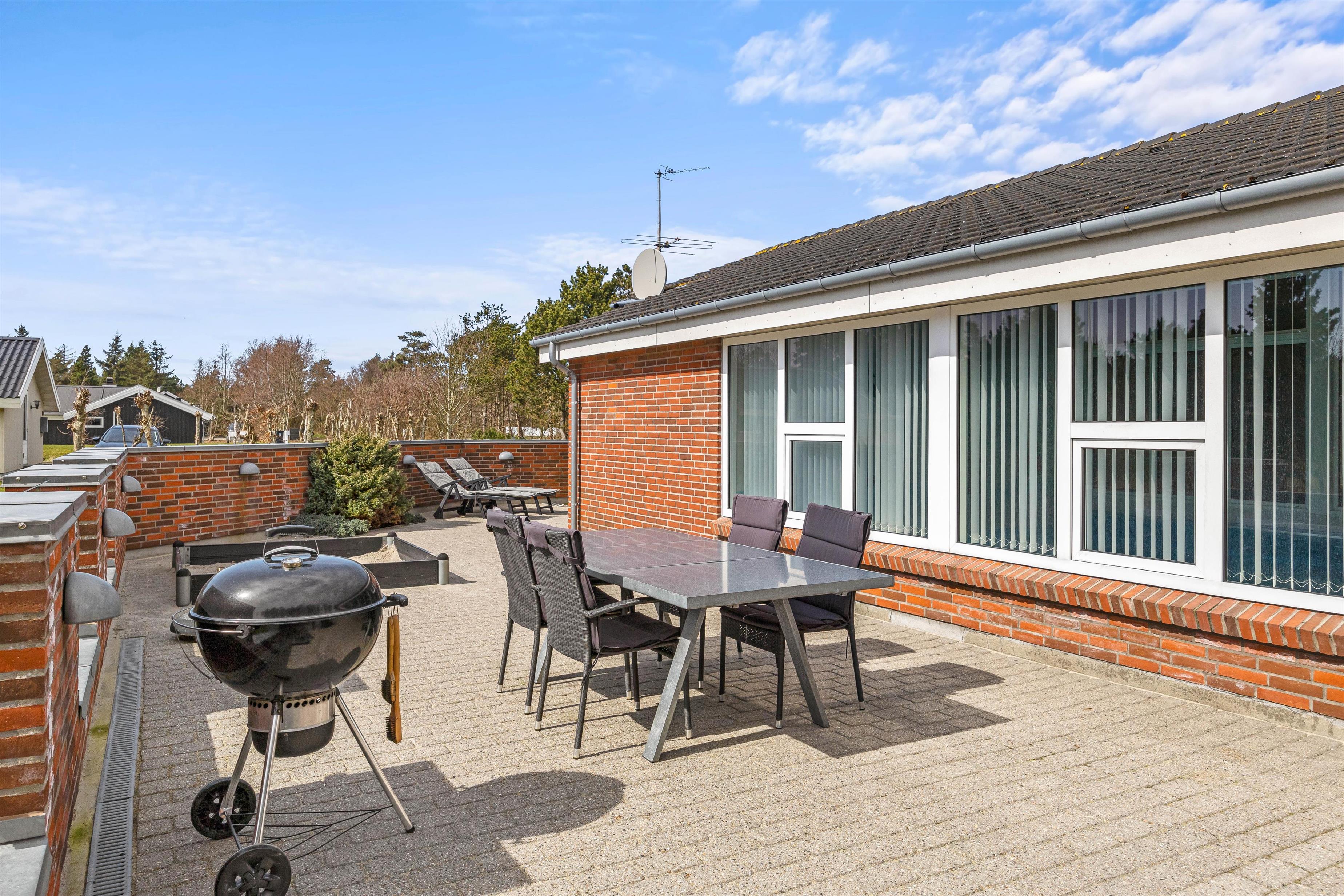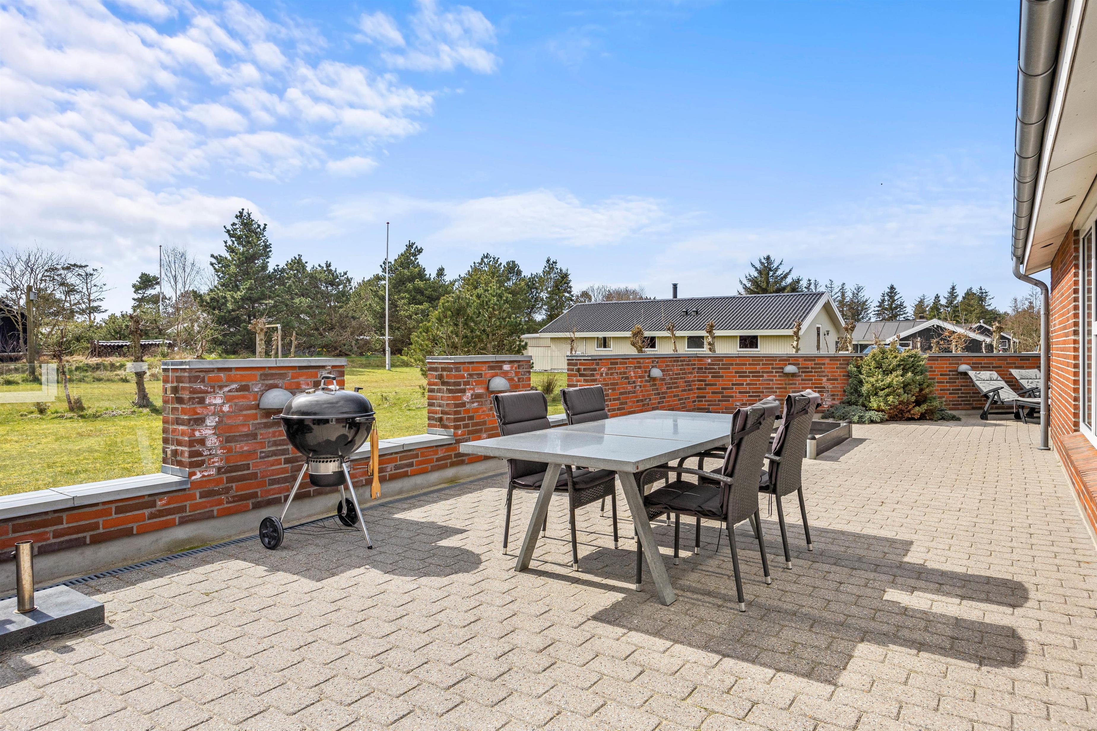 Sommerhuset, der kun ligger 800 meter fra stranden, er beliggende på en stor plænegrund og har en stor, afskærmet og delvist overdækket terrasse. Der står havemøbler og liggestole klar til jer, så I kan finde jer godt til rette på en god plet på terrassen. Desuden kan I takket være grillen spise en lækker grillmiddag på terrassen på de lune sommeraftener.