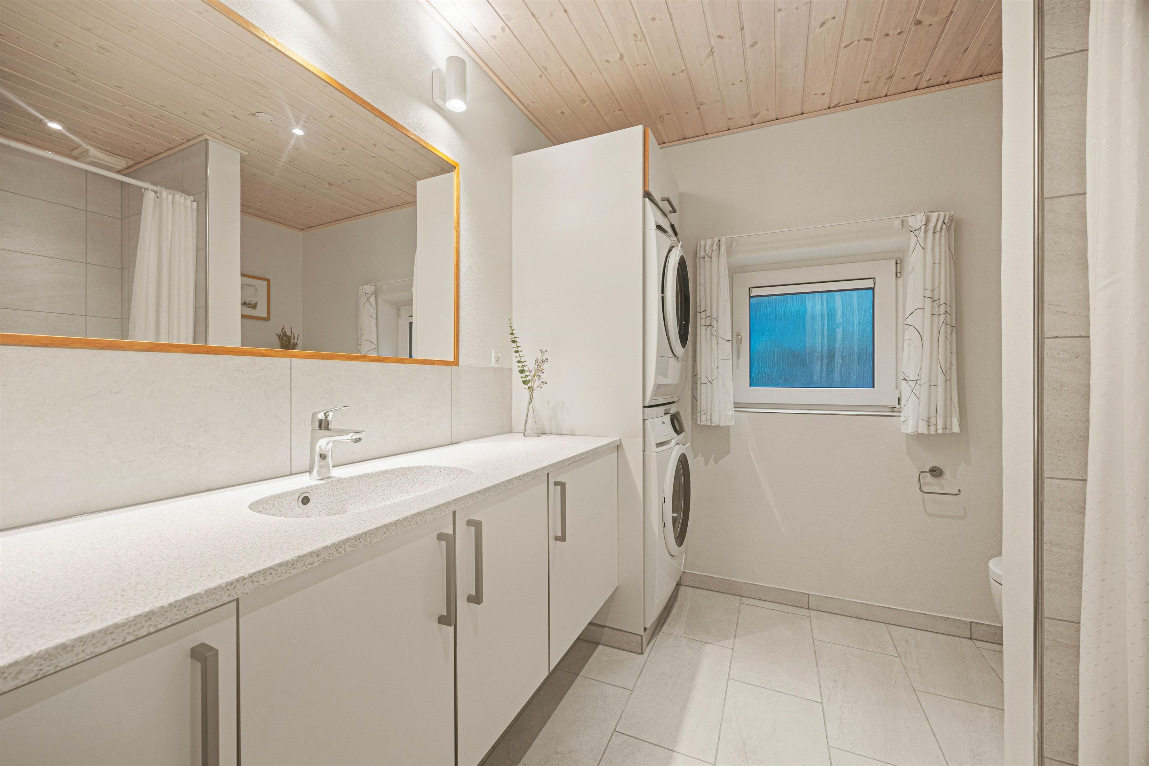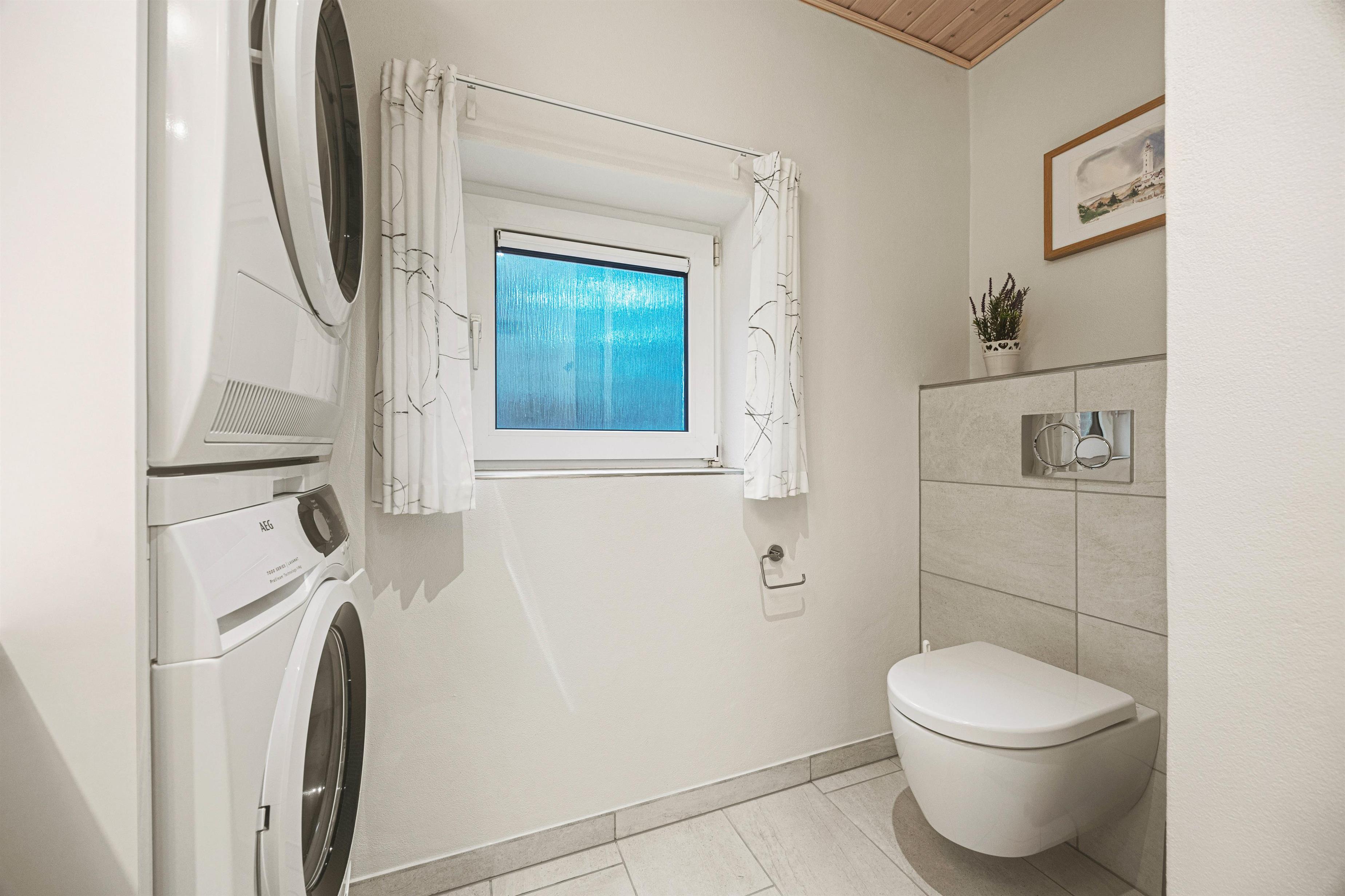 På et af de to badeværelser har I mulighed for at ordne det praktiske gøremål: at vaske tøj, da vaskemaskine og tørretumbler her er tilgængelige. Det samme gør sig gældende for kontoret, hvis nogen er nødt til at få ordnet noget arbejde på ferien.