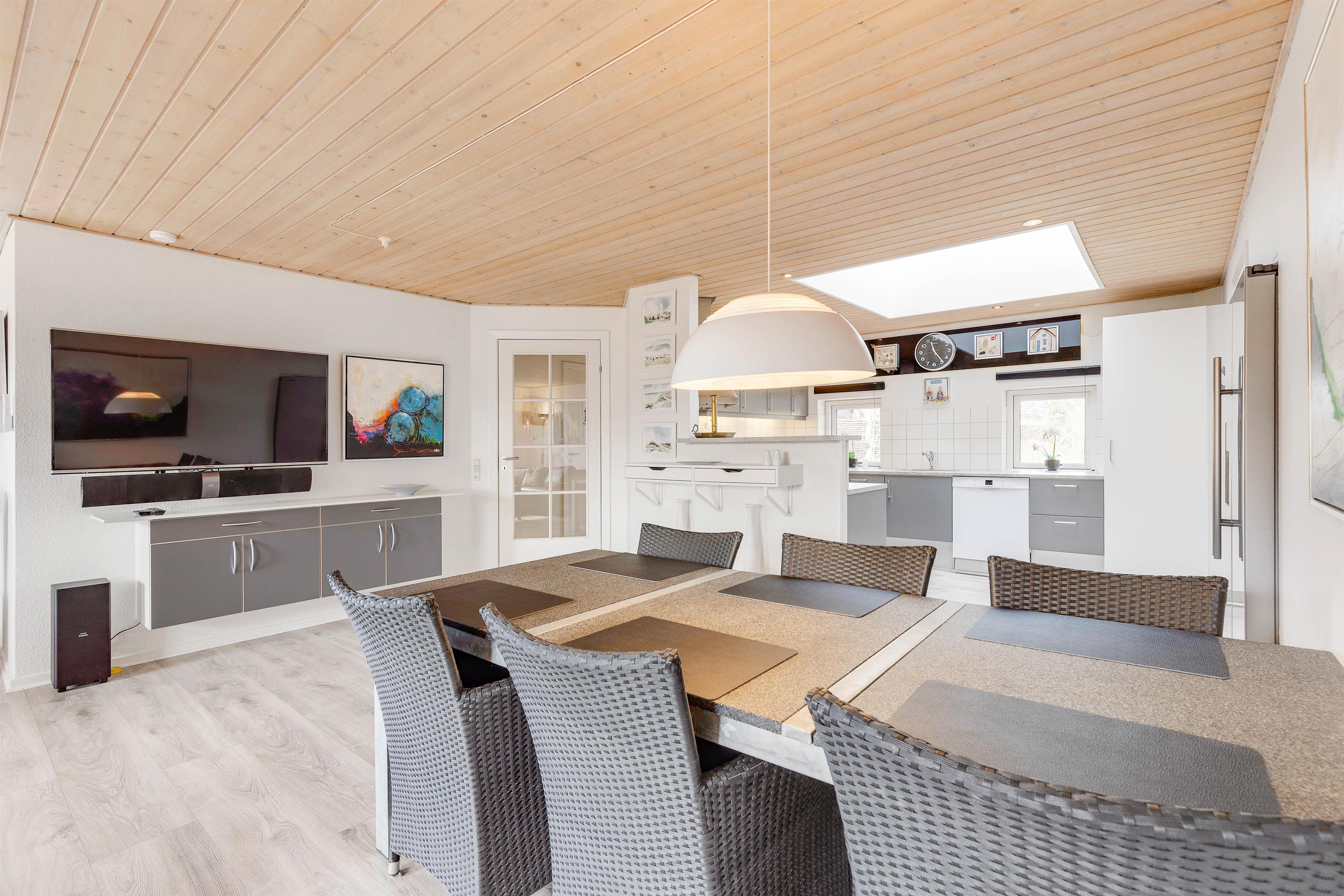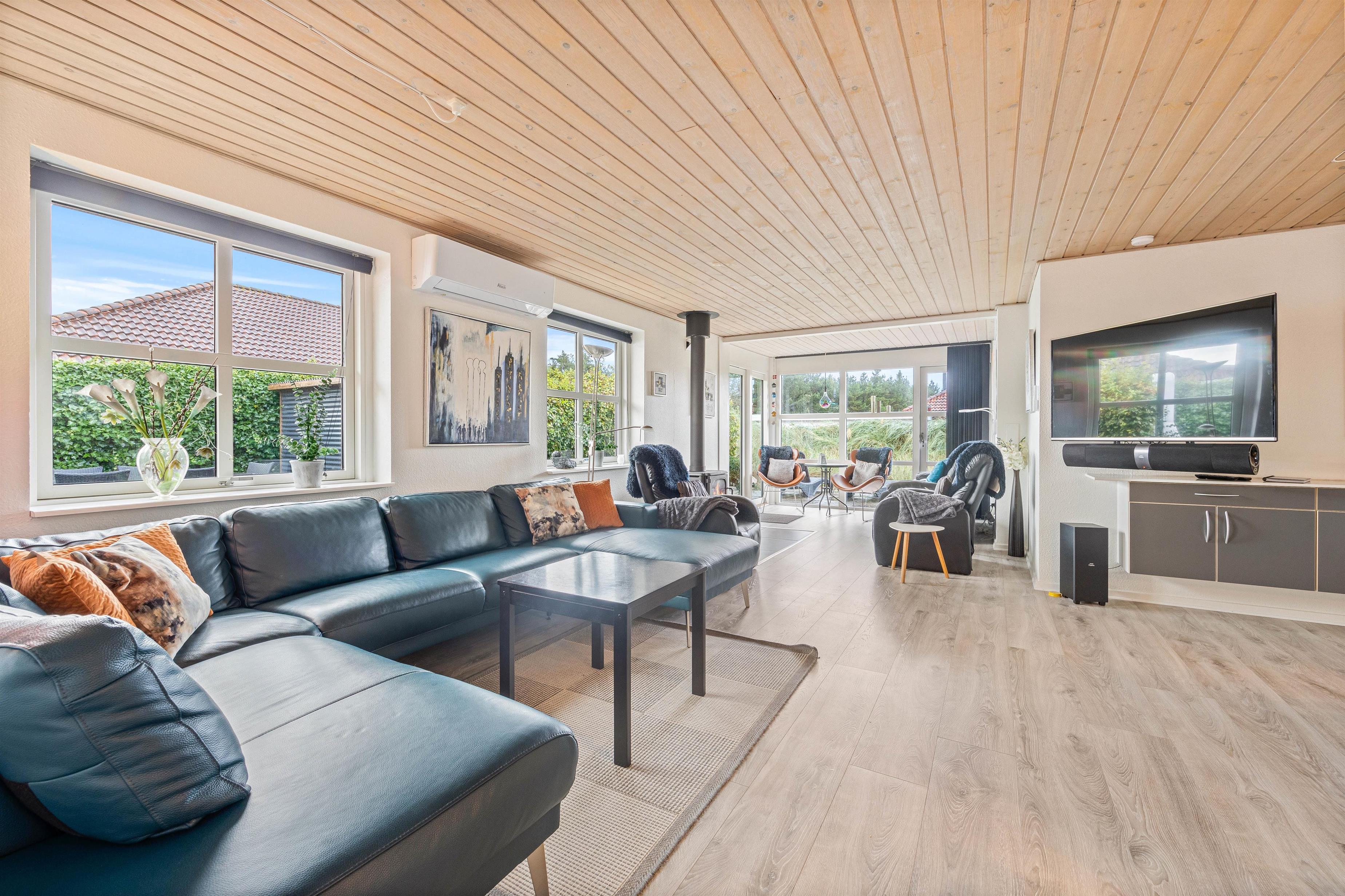 Det åbne opholdsrum samler køkken og stue i ét fællesrum, hvor hele familien kan samles om morgenkaffen, madlavningen og de sene filmaftener på sofaen foran det det store fladskærm-tv, mens brændeovnen knitrer i baggrunden. Her er garanti for masser af nye ferieminder. Feriehusets soveværelser er alle udstyret med dobbeltsenge og det store badeværelse har gulvvarme.