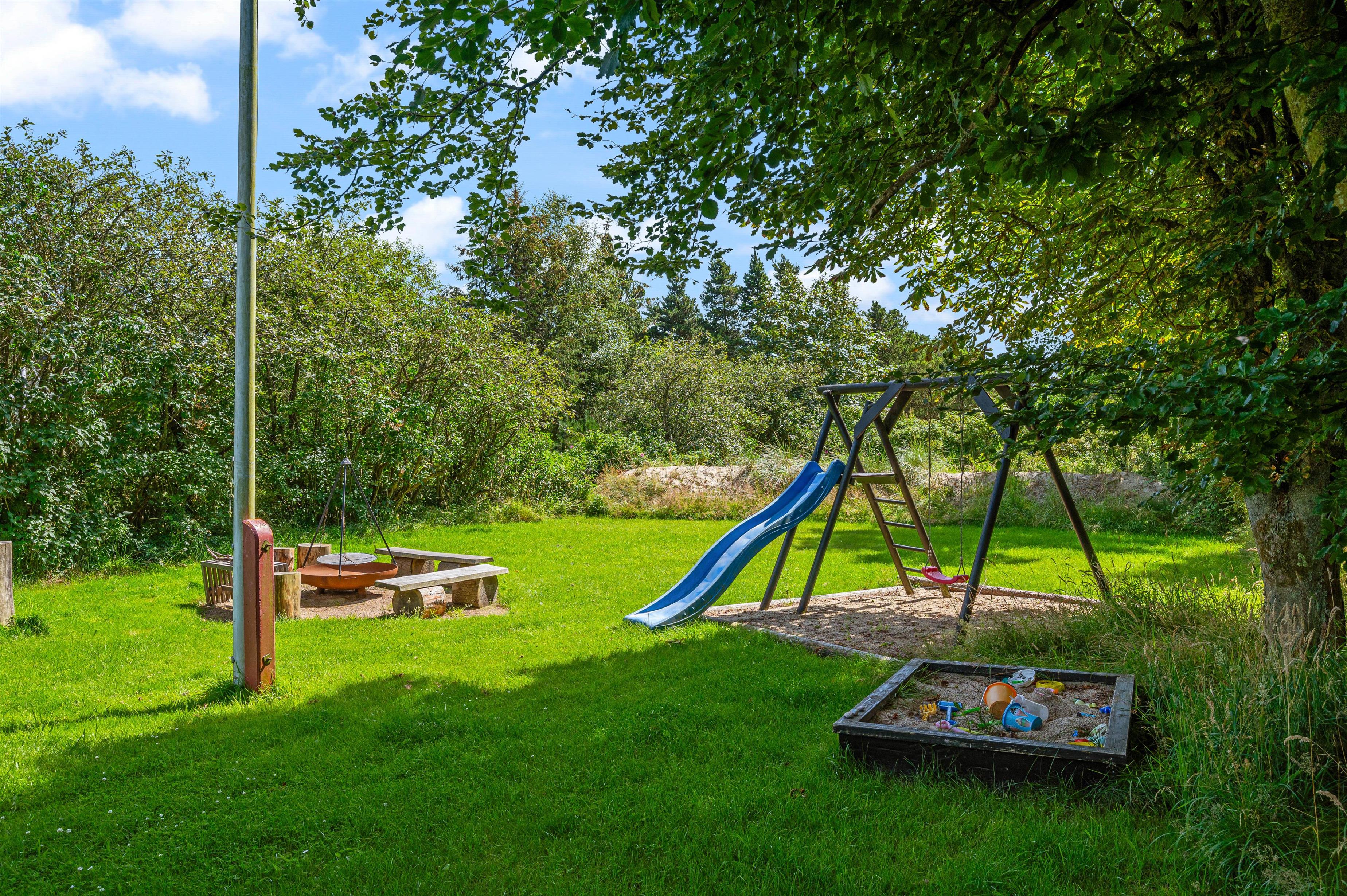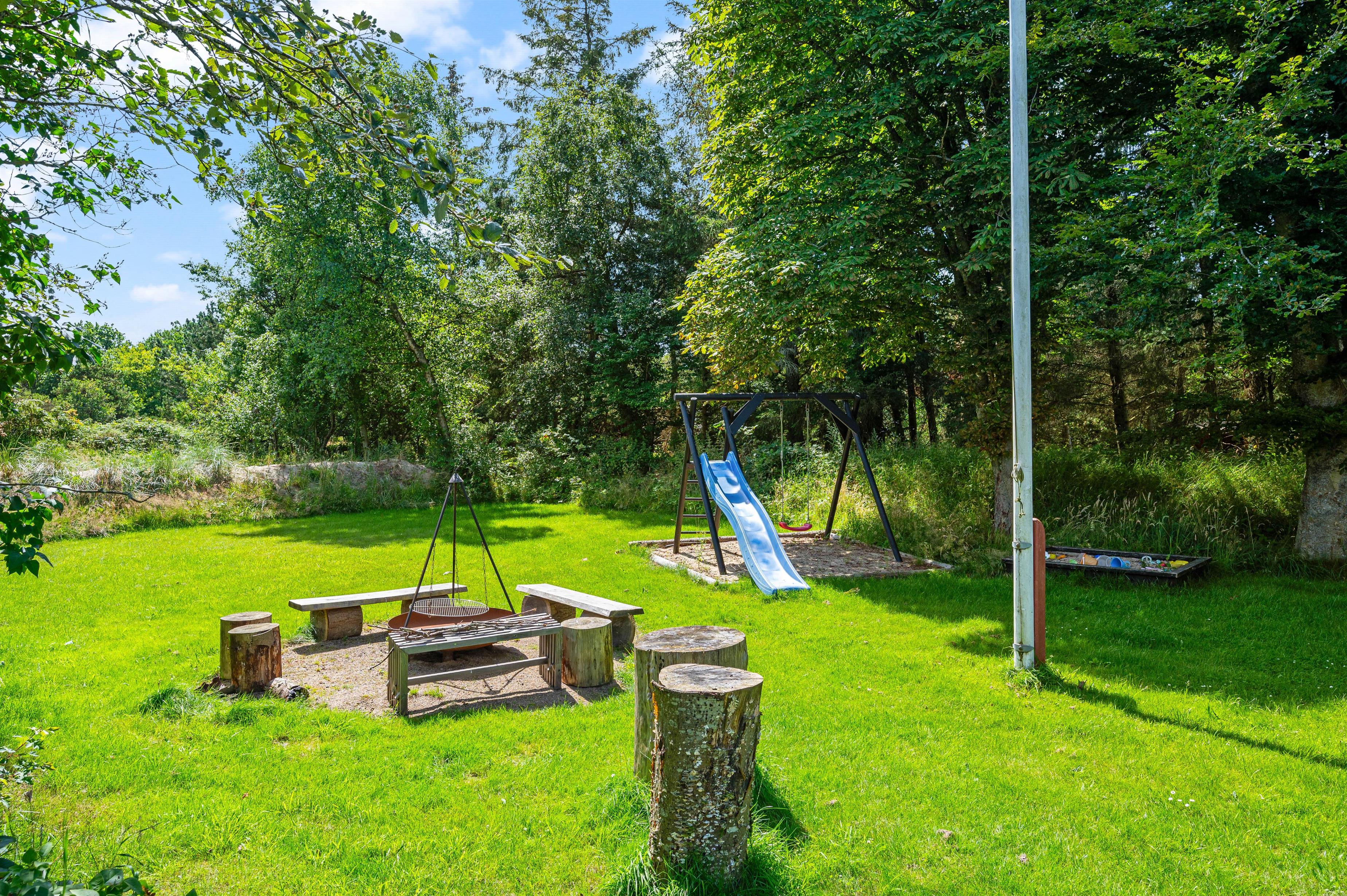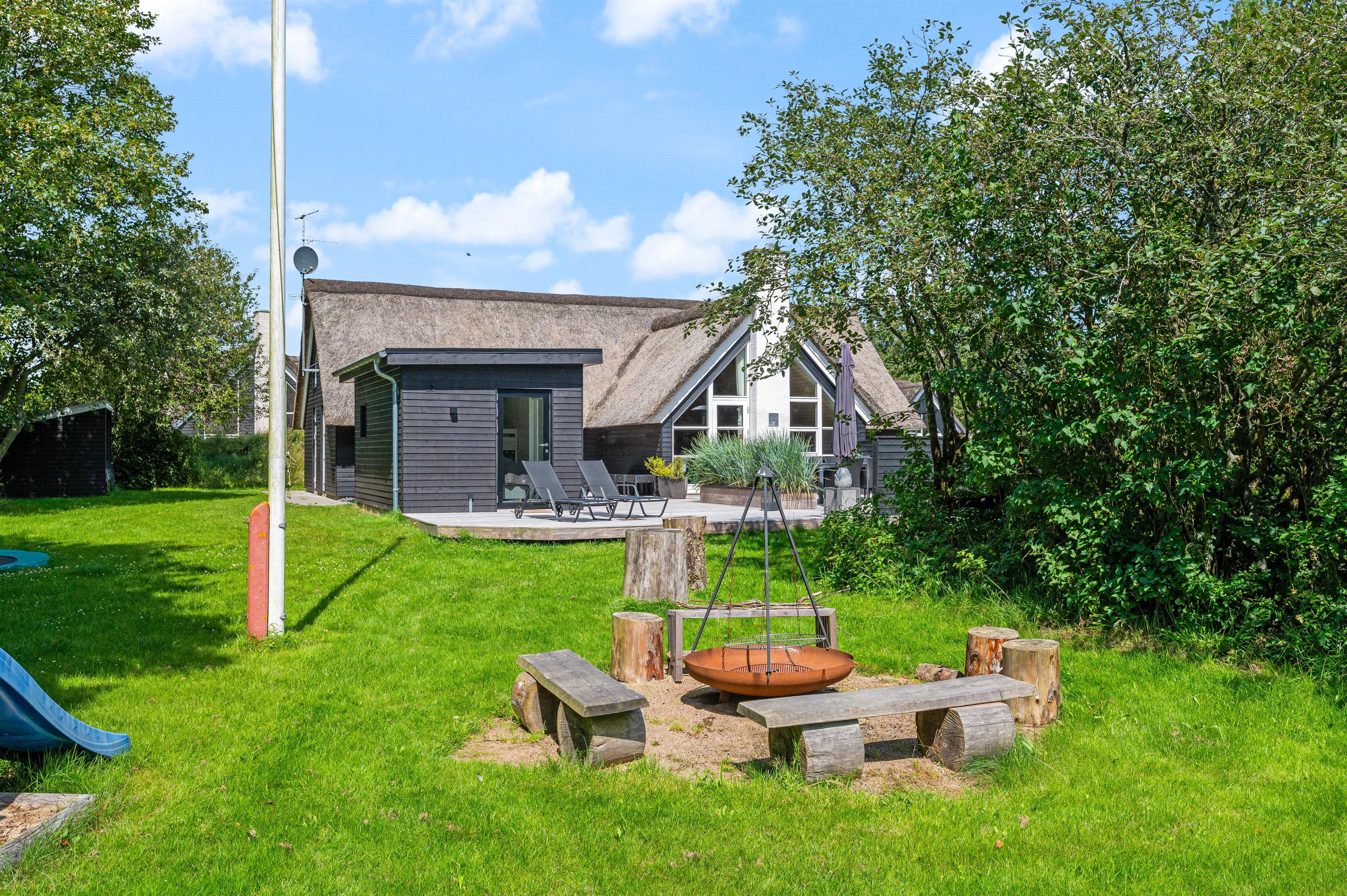 Har I lyst til udeleg, er der både bålplads, sandkasse, gynger og trampolin. Her kan børnene brænde energi af, hvis der er mere tilovers fra dagens aktiviteter, og plænen giver god plads til boldspil og leg. Den store træterrasse lægger op til samvær omkring havebordet, hvor også lidt lækkert fra grillen kan nydes, og ved havens andre hyggekroge kan I finde læ for vestenvinden.