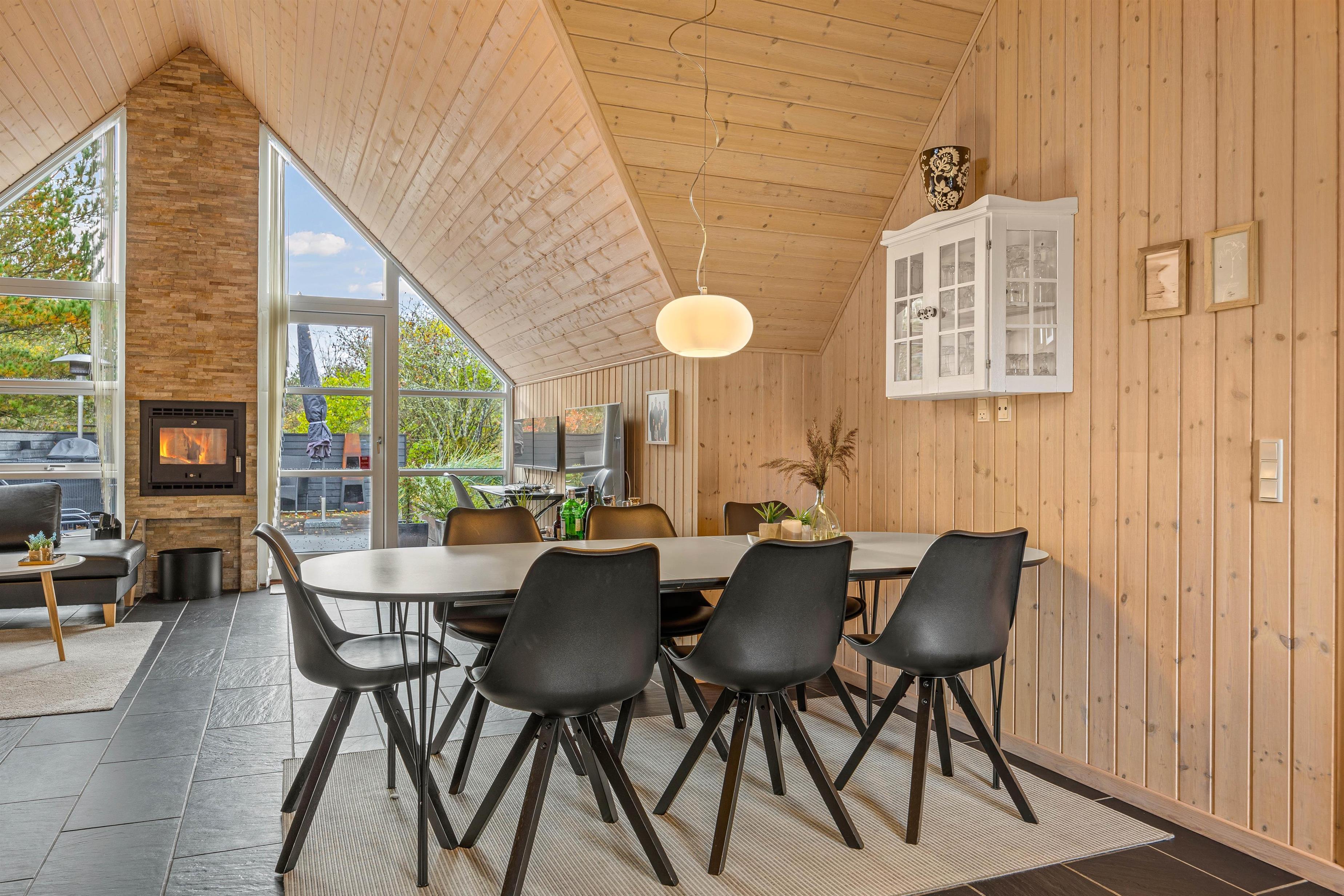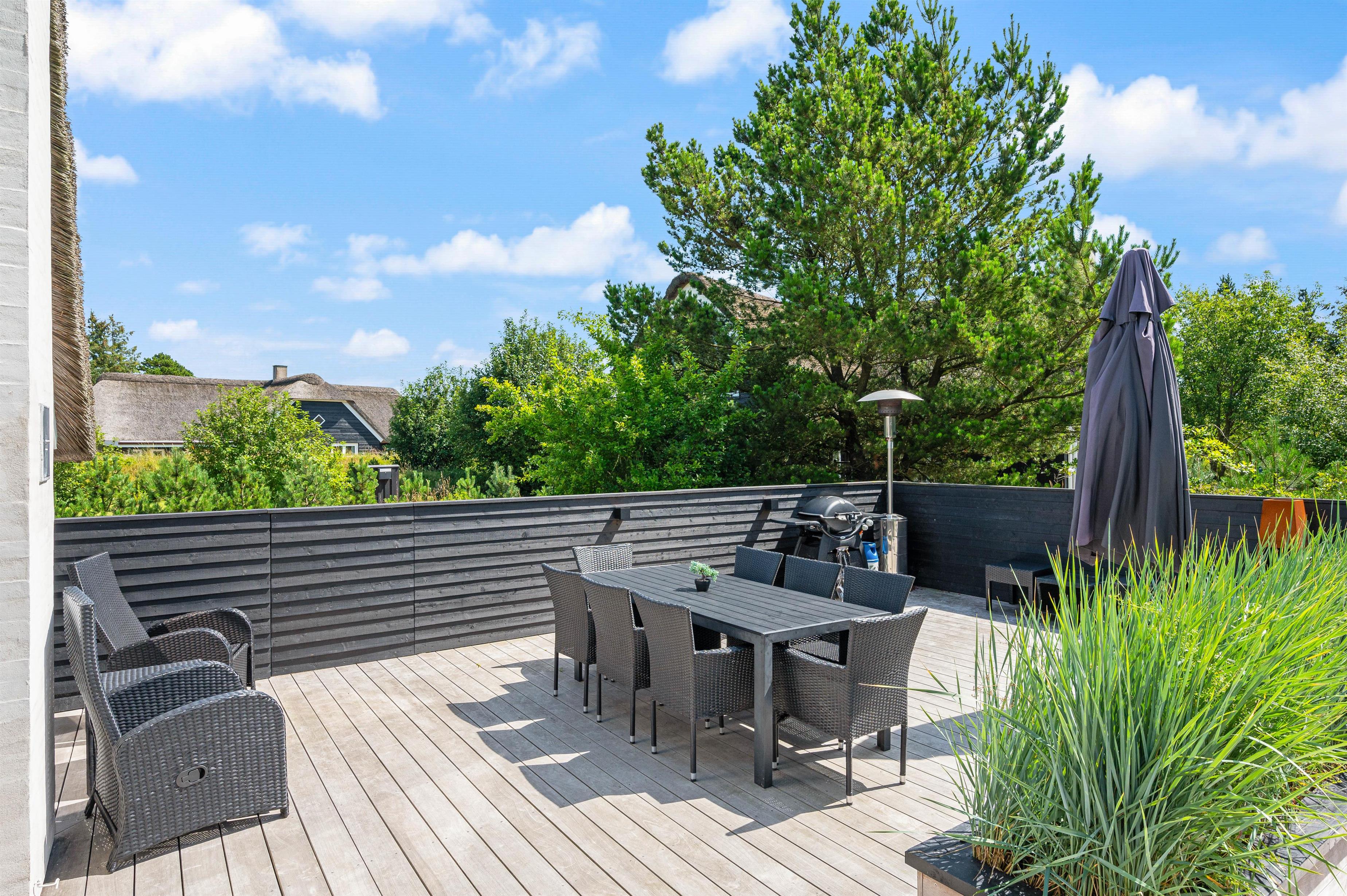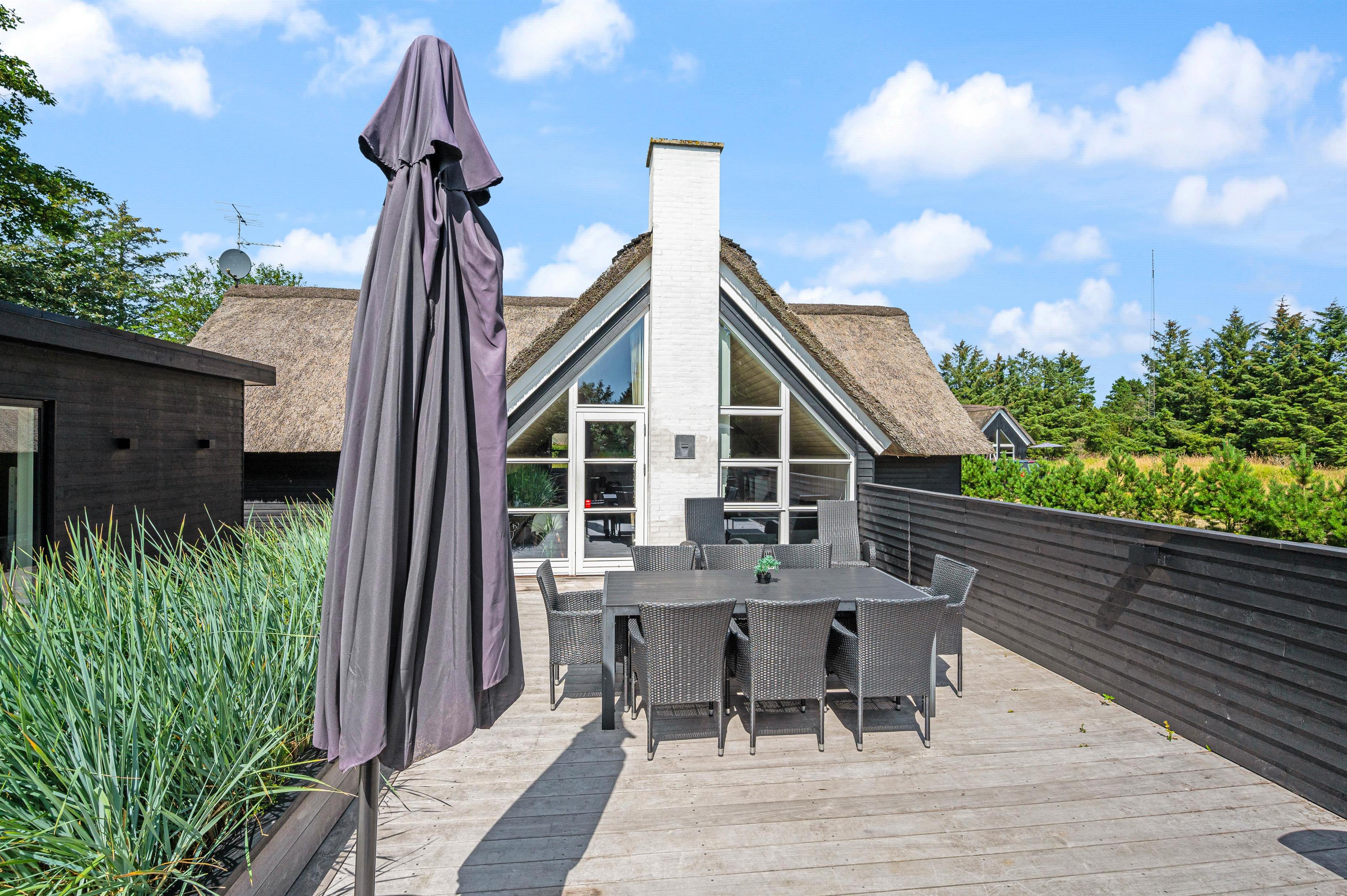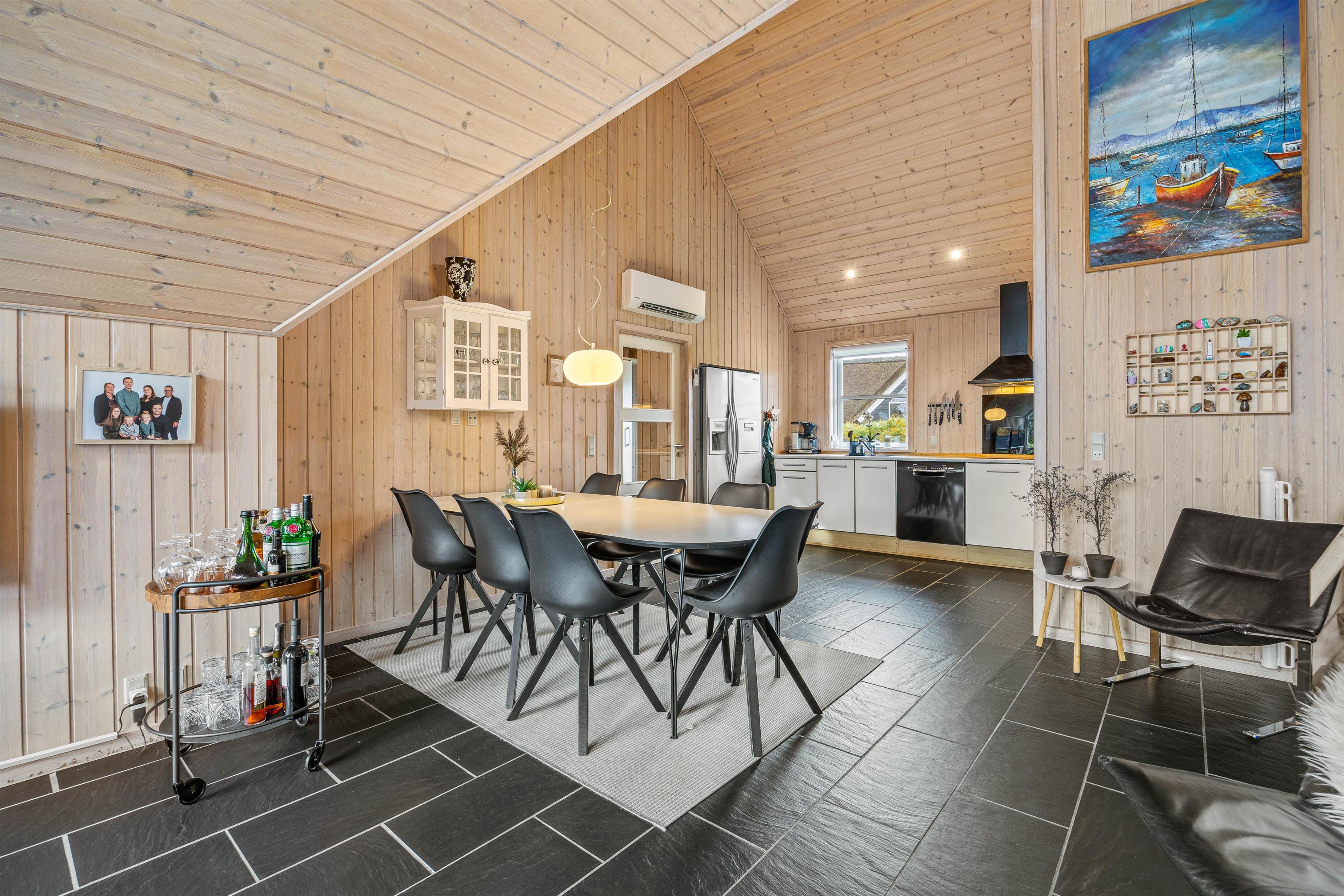 Et moderne stråtækt feriehus kalder på op til 8 feriegæster som står klar med veludstyret køkken i direkte sammenhæng med spisepladser og stilfuld stue. Gulvvarme, brændeovn og varmepumpe sørger for behagelig temperatur i det højloftede rum, og der er gjort plads til hygge og samvær for flere vennepar eller en større familie.