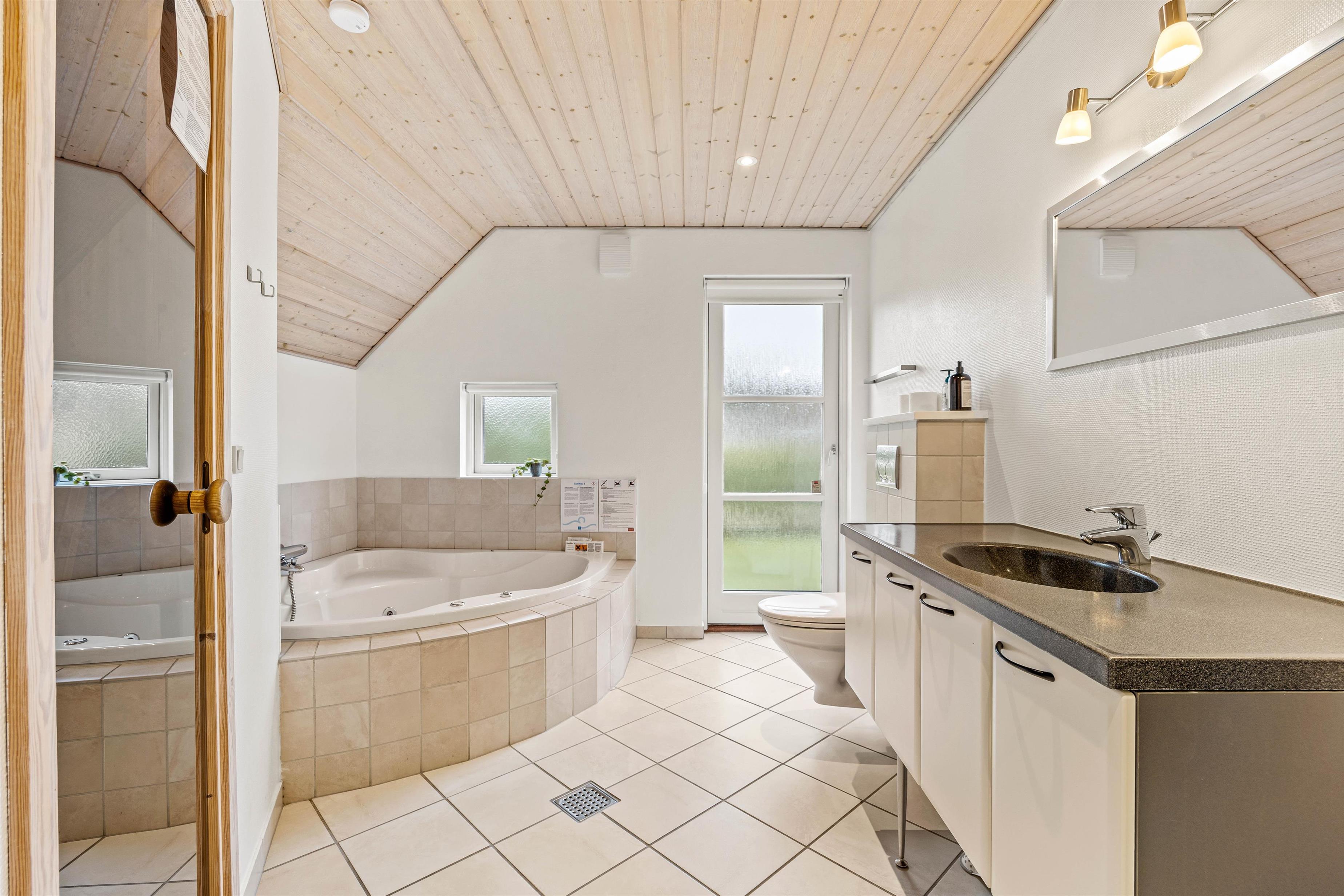 Der er i alt 3 badeværelser, hvoraf det ene befinder sig i annekset. I feriehuset er der 2 badeværelser, hvoraf det ene også indeholder en lækker 2-personers spa og en dejlig sauna. Der er naturligvis gulvvarme i alle badeværelser, og der forefindes vaskemaskine og tørretumbler i huset.