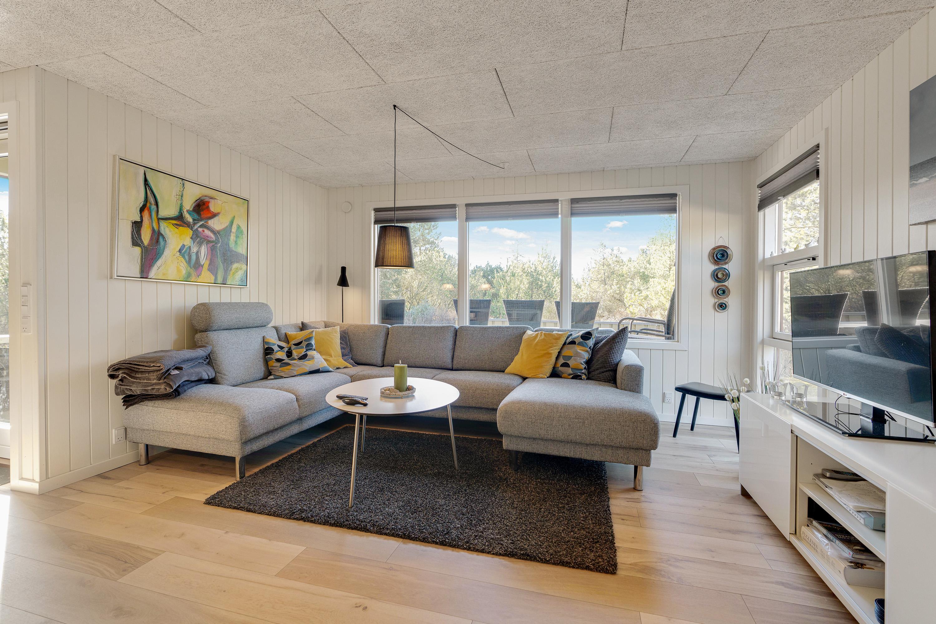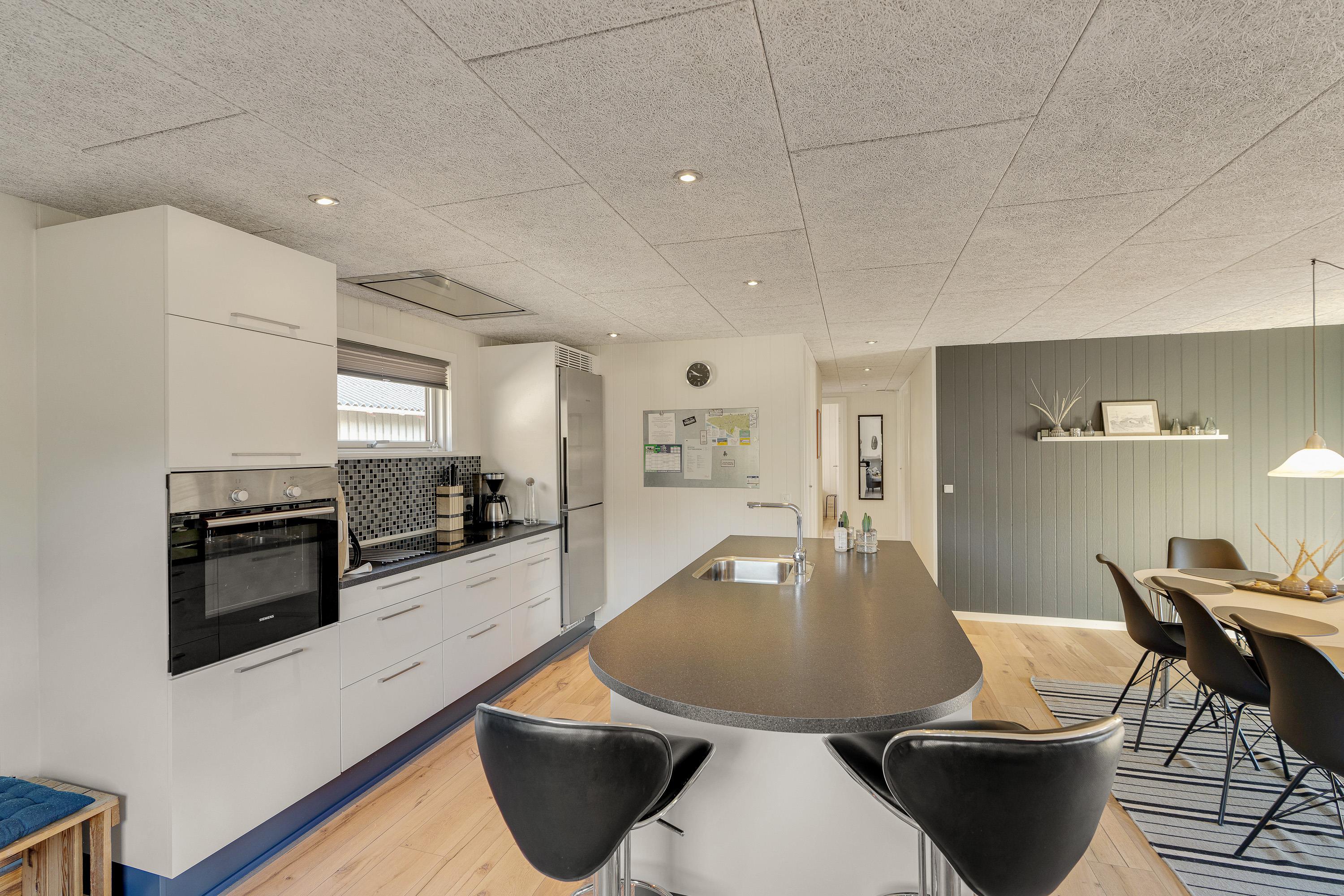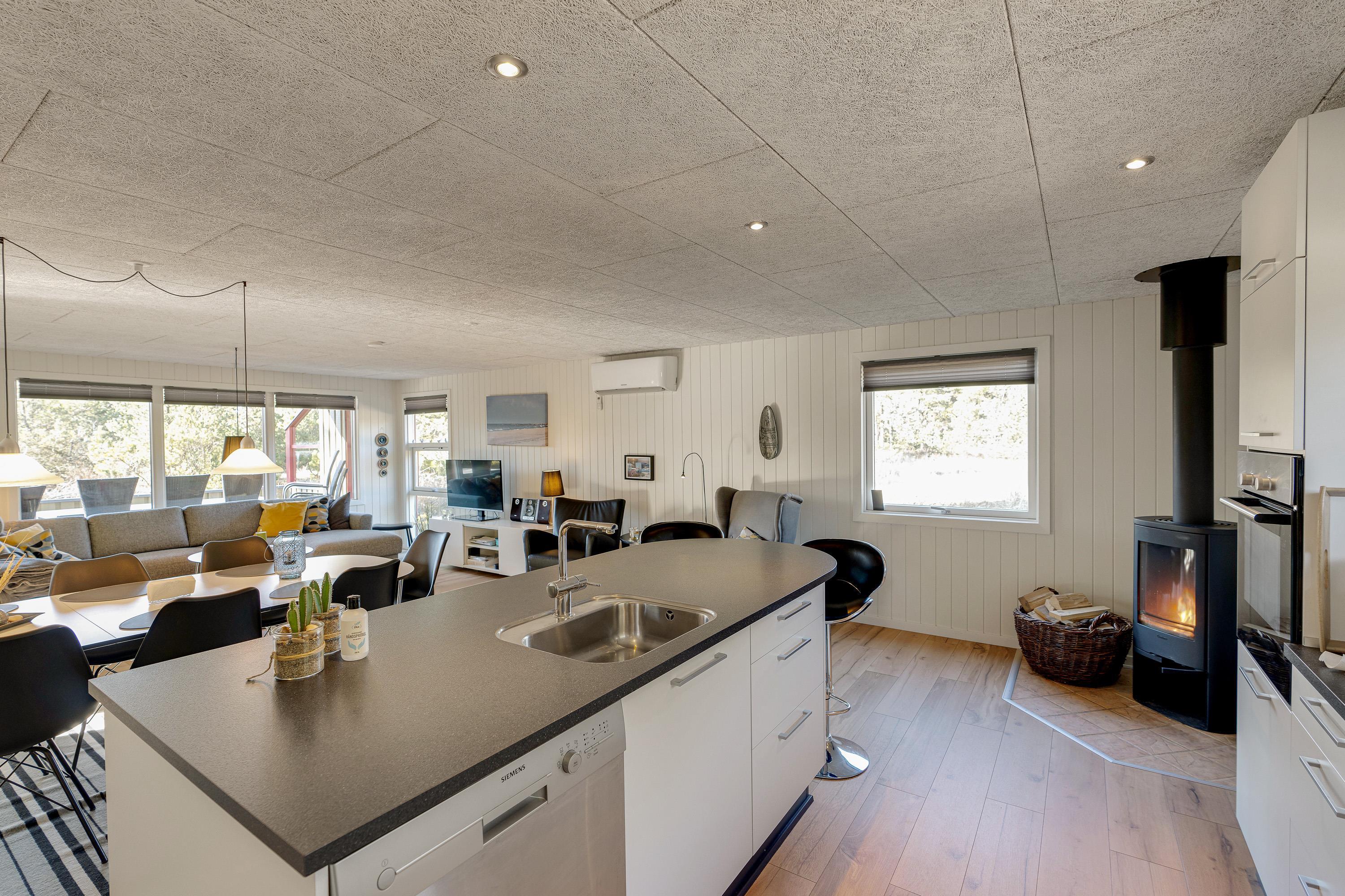 Indvendigt er der et stort og flot køkken, hvor alle faciliteter er i top. Ved køkkenøen kan I samles og sammen tilberede jeres yndlingsret. Fra køkkenet har man udsyn over stuen og det store vinduesparti ud til naturen, og det skaber også et flot lysindfald. Desuden øger brændeovnen kun hyggen til næste niveau, når den sender varme og en behagelig lyd af knitren ud i rummet. Her er der tale om feriestemning på kolde aftener.