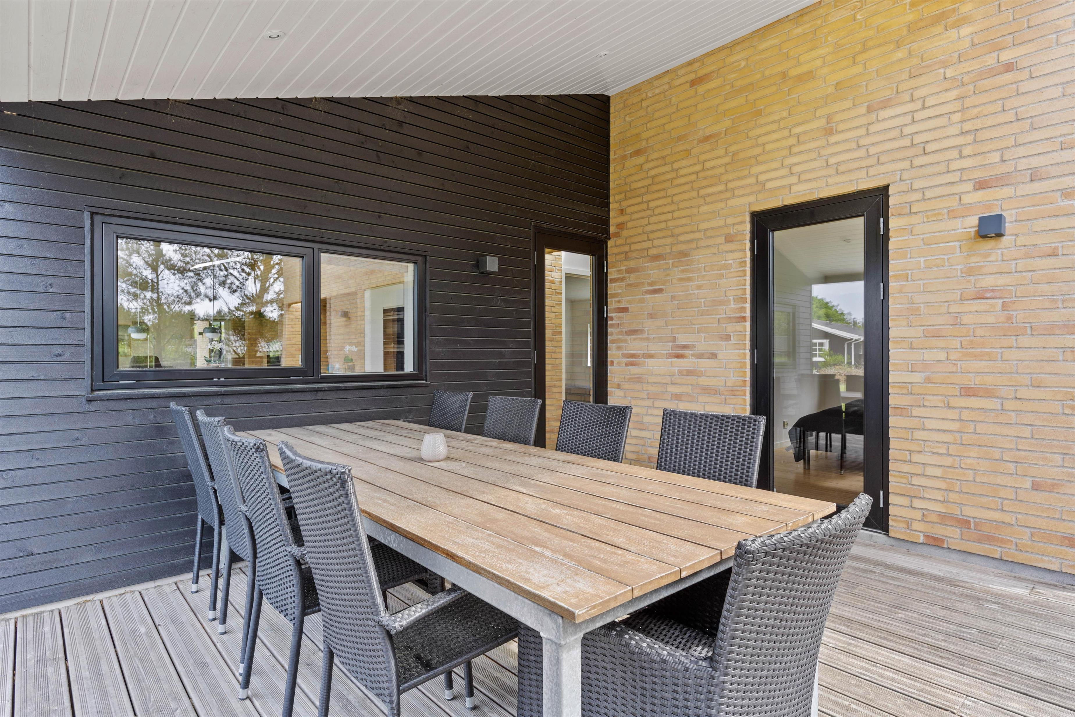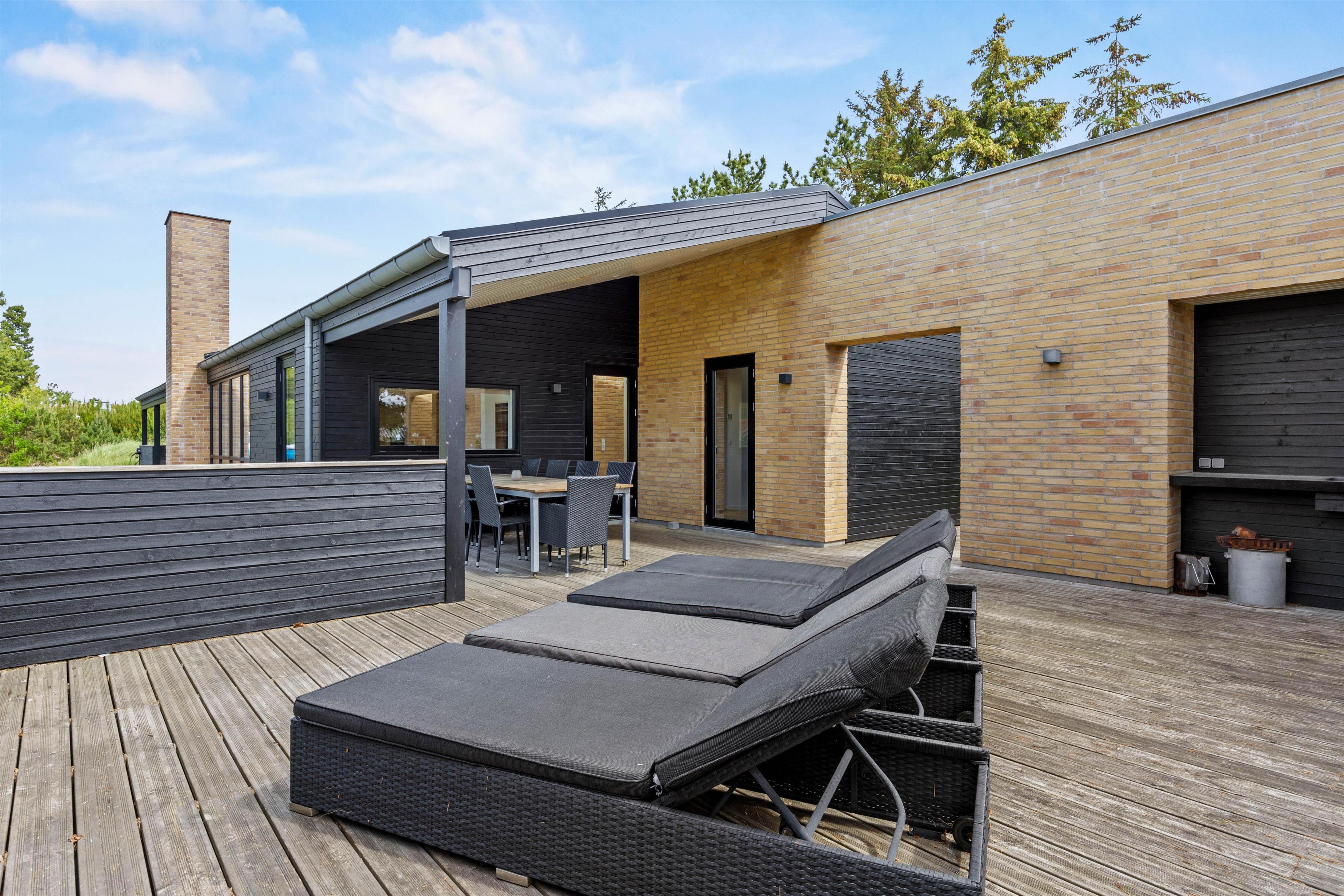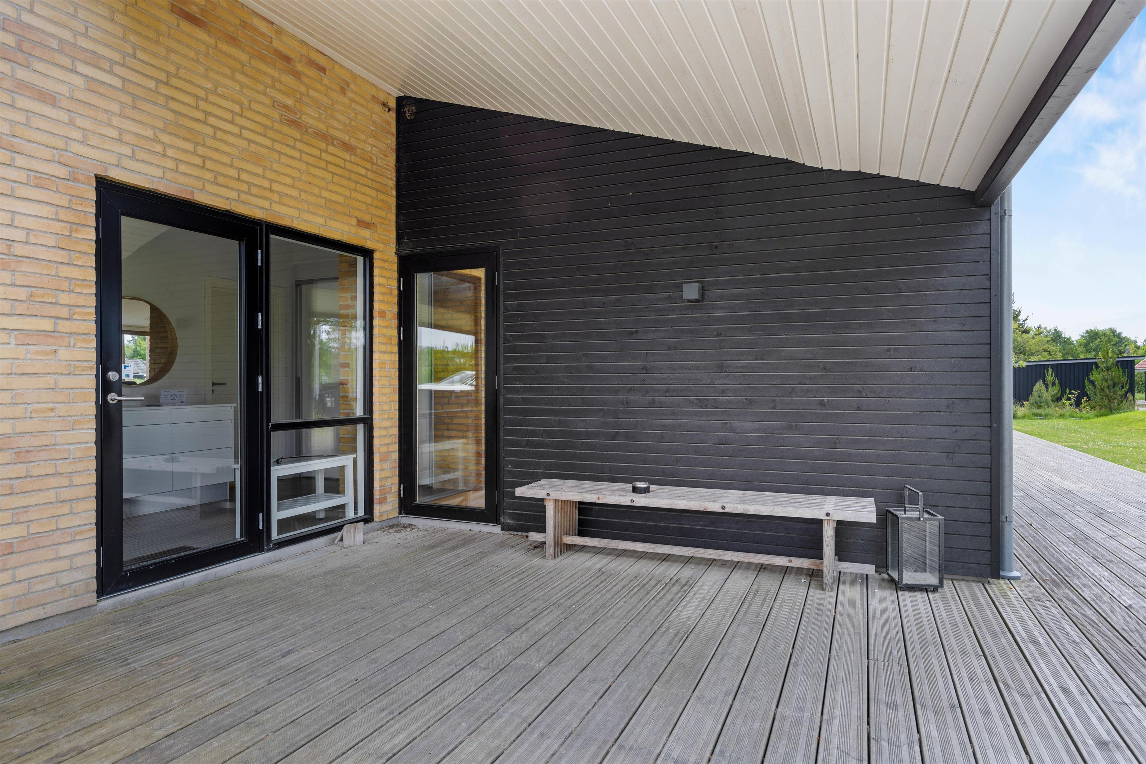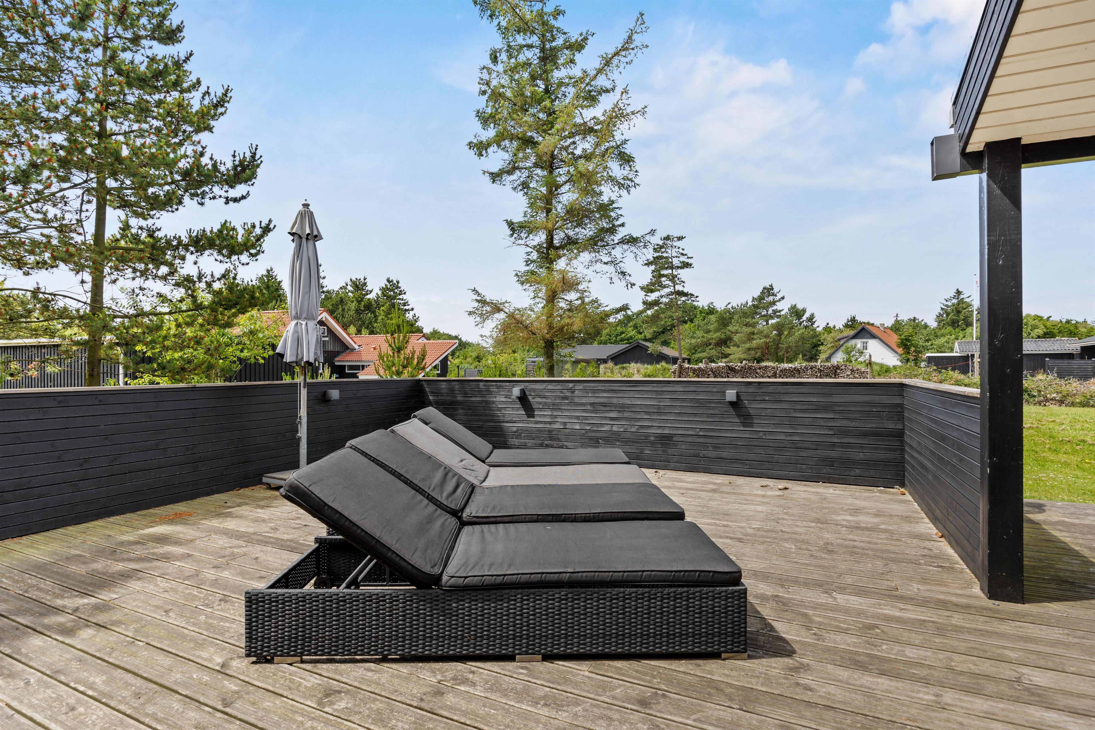 I har mere end god plads til at nyde de skønne solrige dage helt ugeneret på terrassen, der løber hele vejen rundt om huset. Her står både havemøbler og liggestole klar til jer, så I kan holde en dejlig dovnedag i de flotte omgivelser.