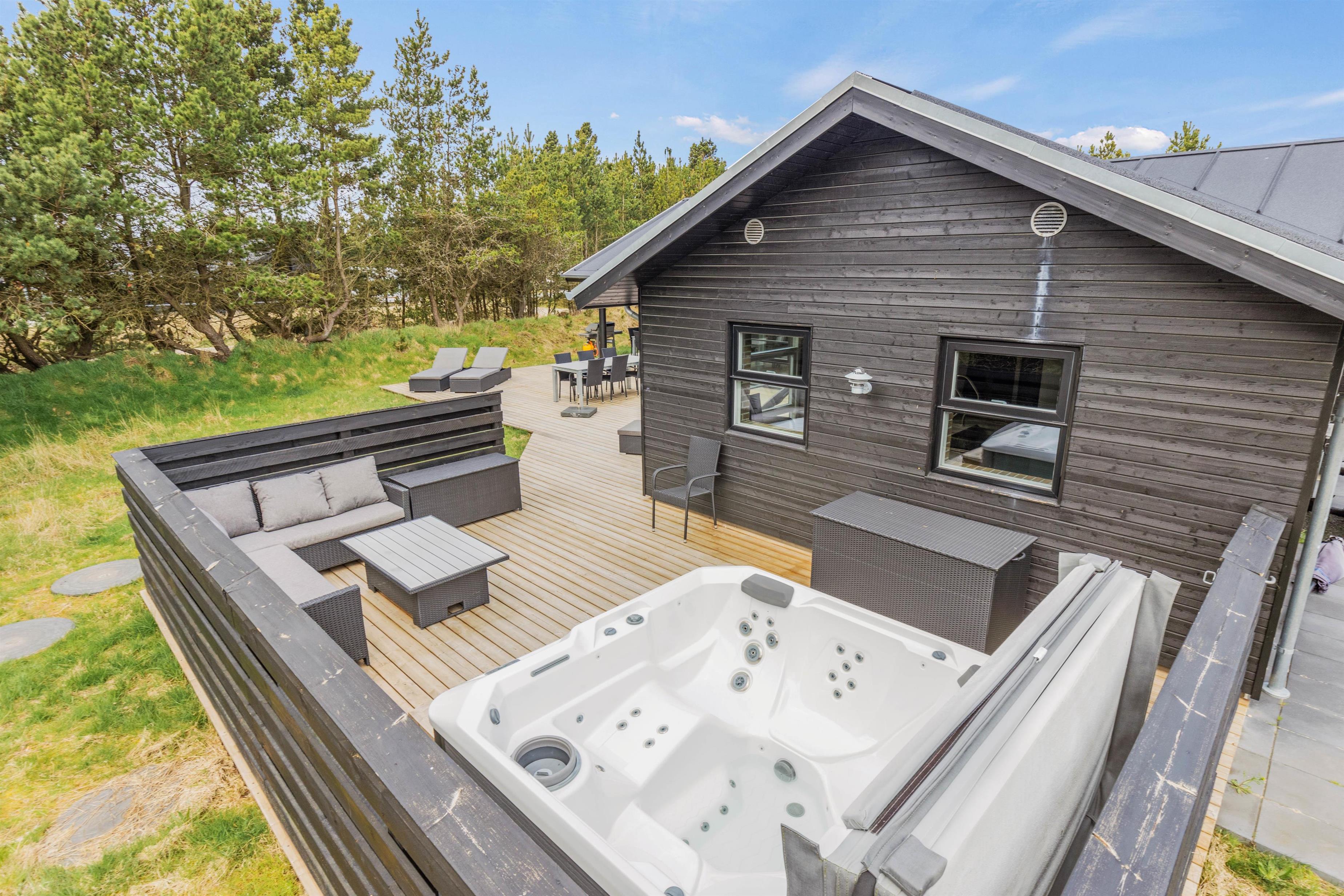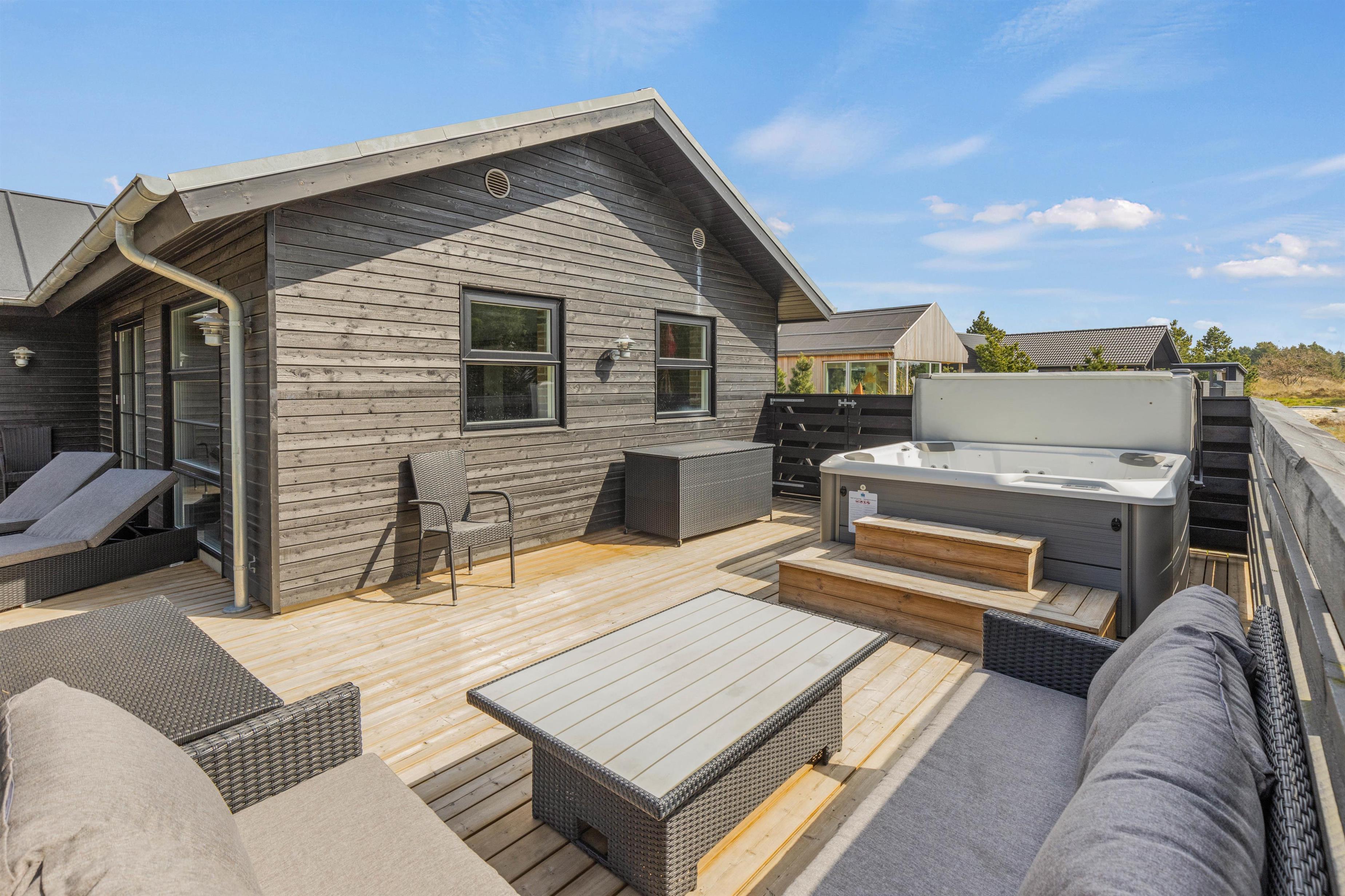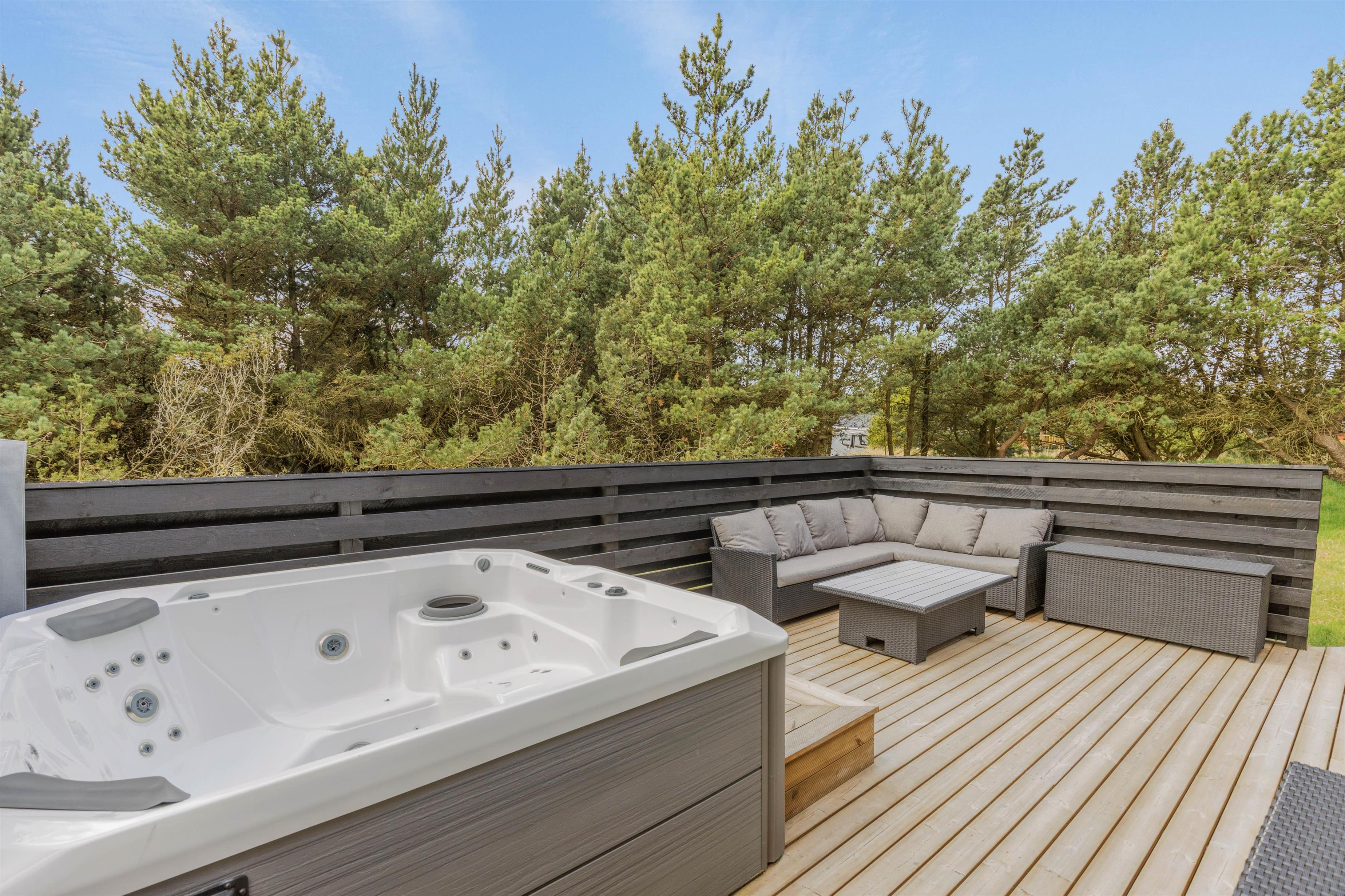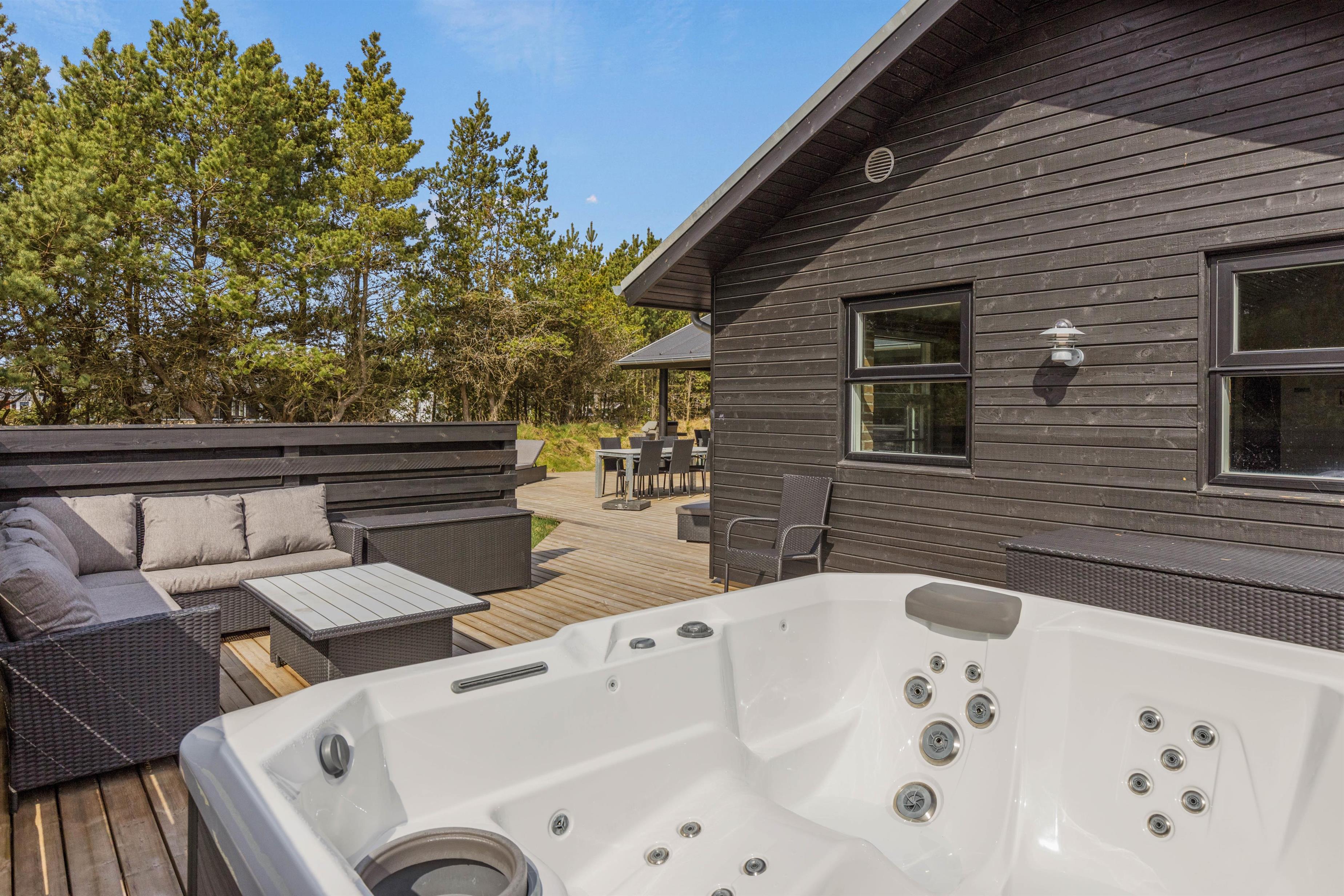 Fra poolområdet er der udgang til ferieboligens lækre terrasse. Med afskærmning og delvis overdækning kan I altid være sikre på at have ly og læ, mens I nyder den friske luft og Blåvands naturskønne omgivelser. På terrassen står desuden et stort udendørs spabad, der giver anledning til masser af wellnessoplevelser i det fri. Her kan I sidde under stjernehimlen og nyde tilværelsen med et koldt glas vin.