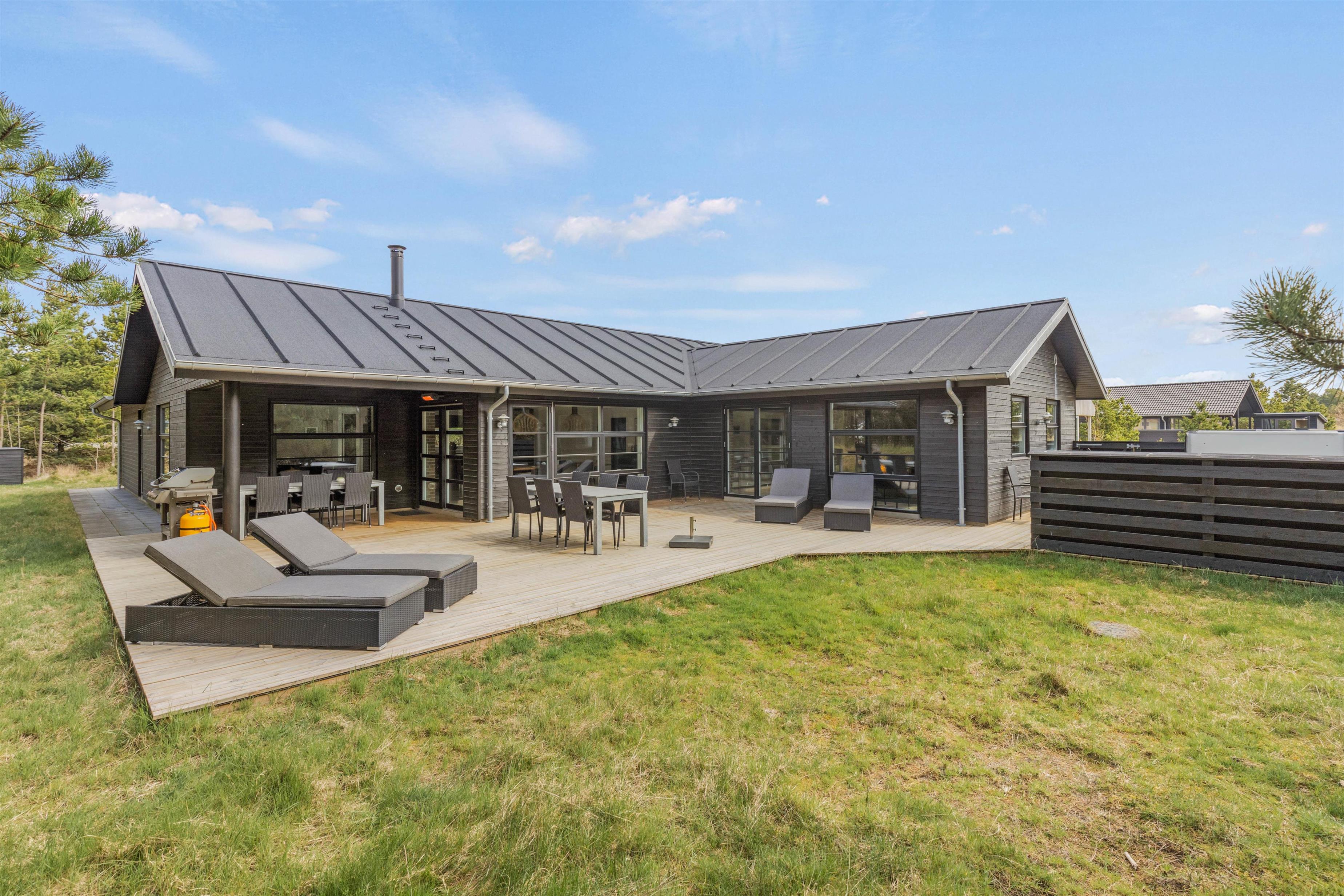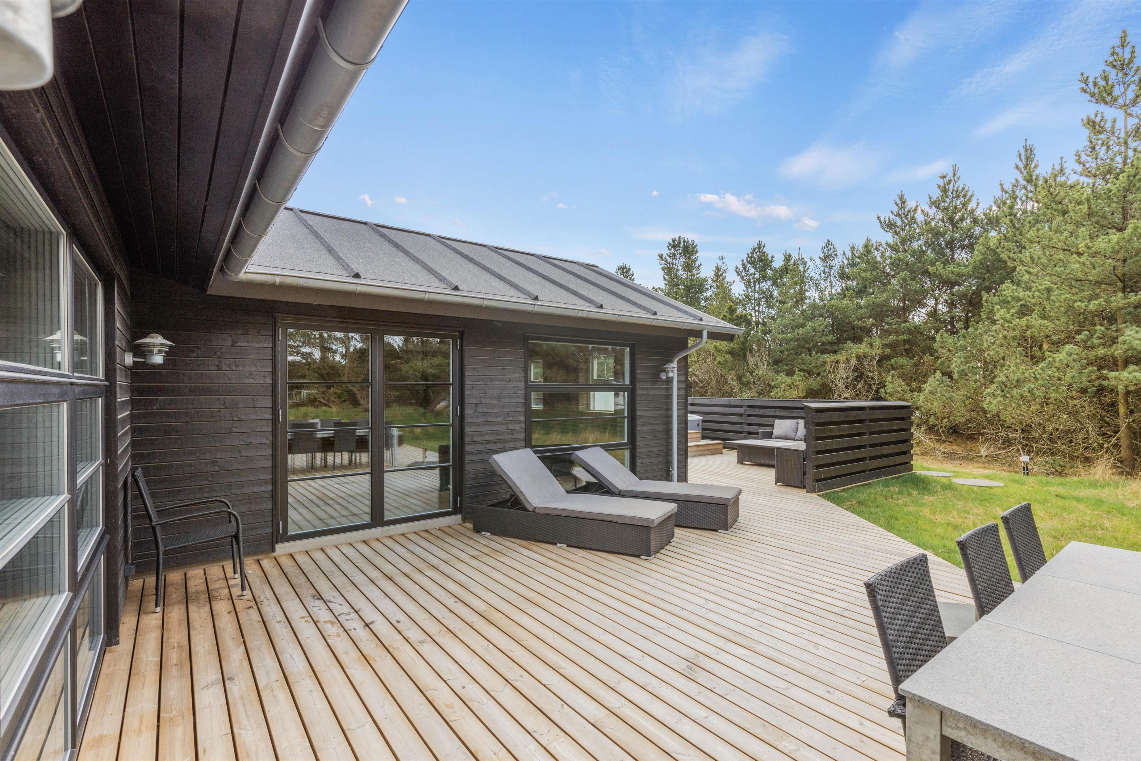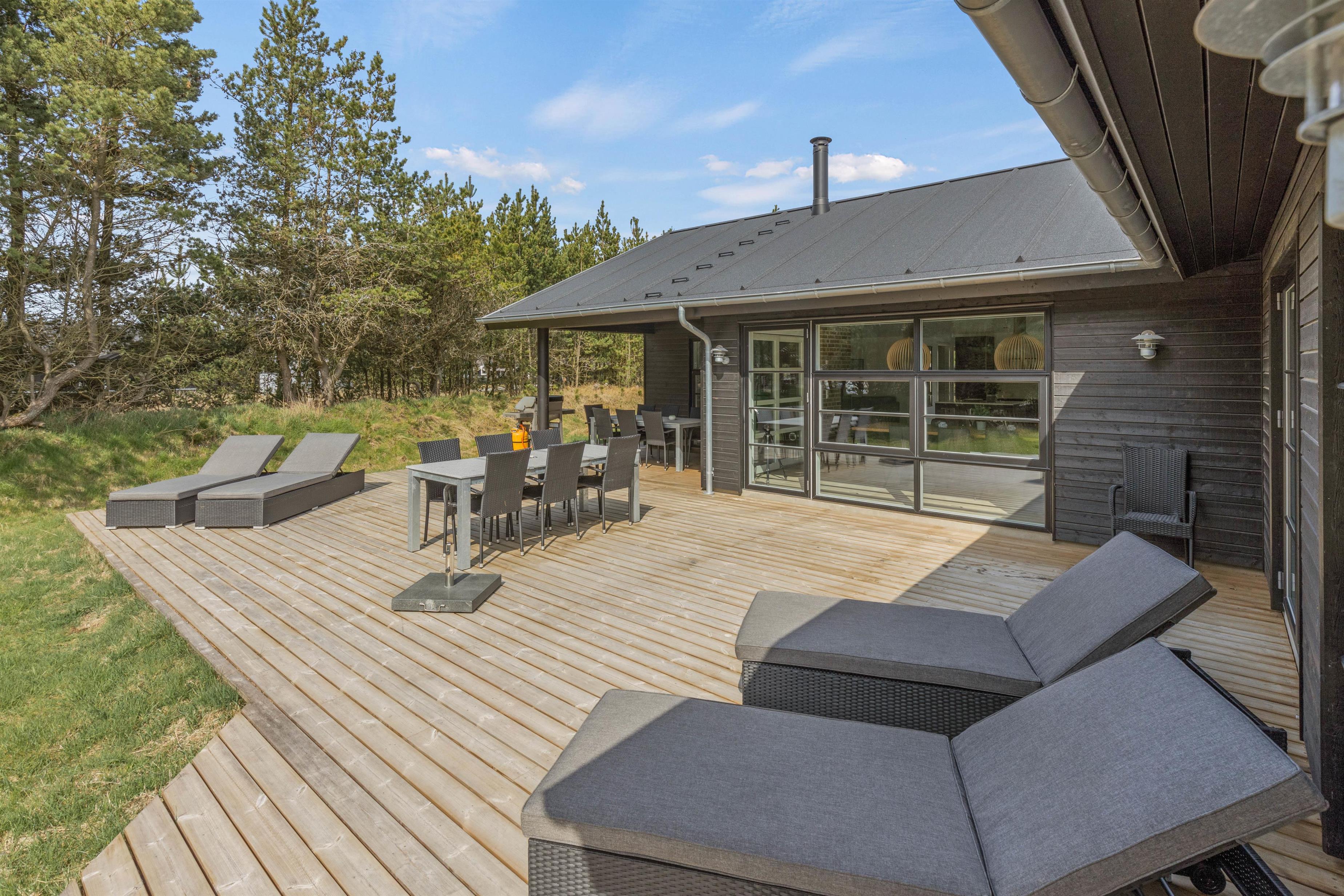 Fra poolområdet er der udgang til ferieboligens lækre terrasse. Med afskærmning og delvis overdækning kan I altid være sikre på at have ly og læ, mens I nyder den friske luft og Blåvands naturskønne omgivelser. På terrassen står desuden et stort udendørs spabad, der giver anledning til masser af wellnessoplevelser i det fri. Her kan I sidde under stjernehimlen og nyde tilværelsen med et koldt glas vin.