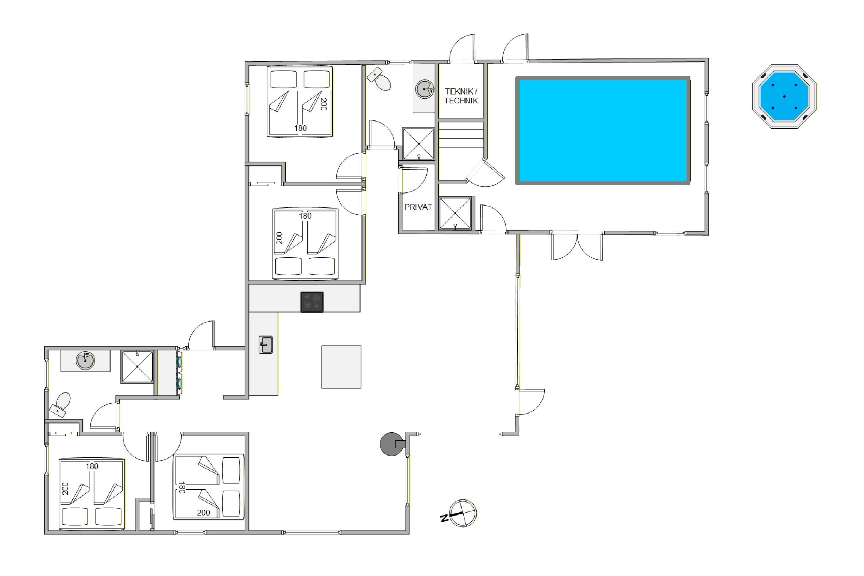 Med ferieadresse på Søren Gades Mark 22A er I sikret en masse fede highlights på ferien. Her kan I for eksempel holde badeferie hele året rundt, eftersom feriehuset rummer en stor poolafdeling med swimmingpool, sauna og ekstra bruser.