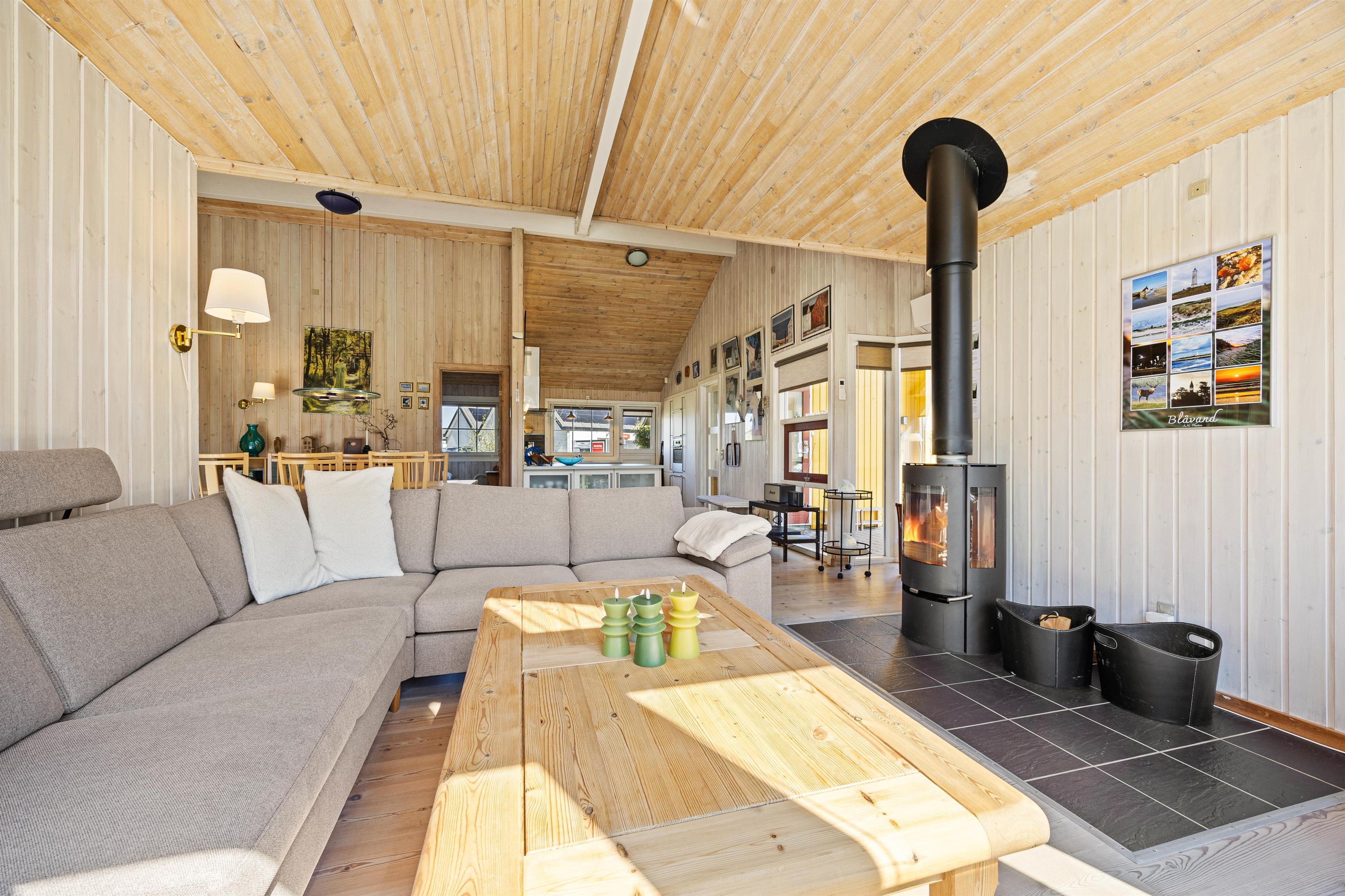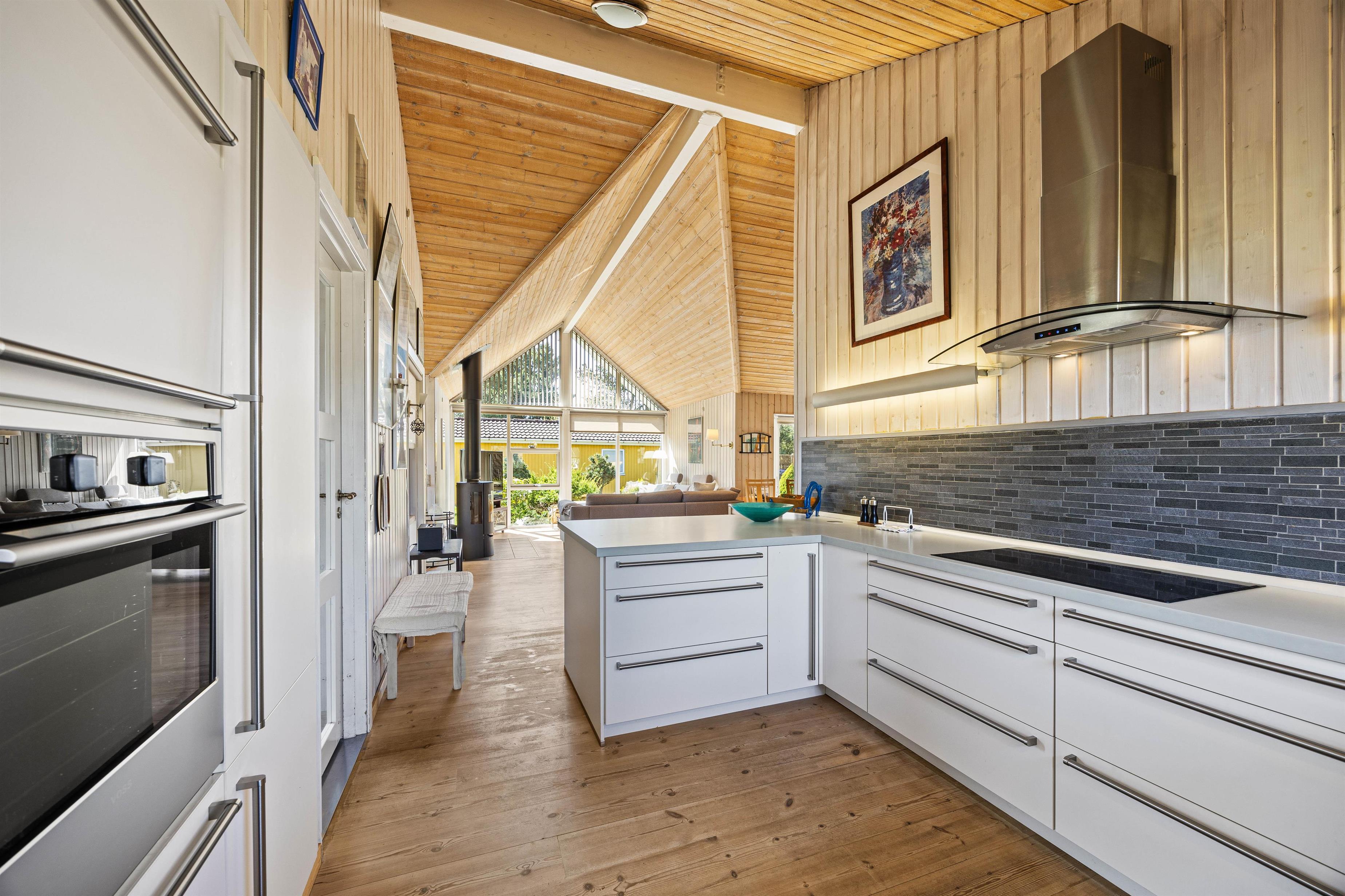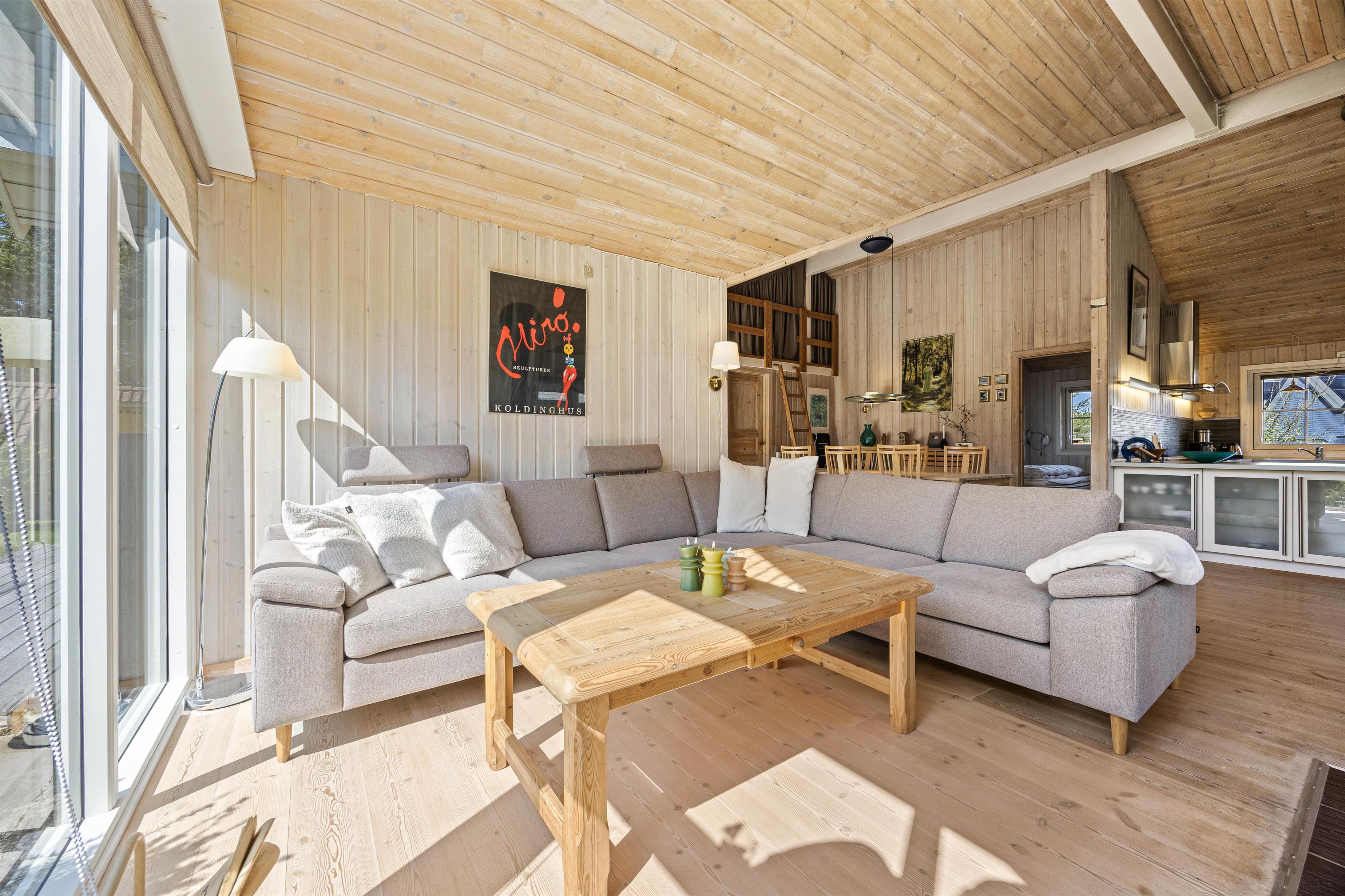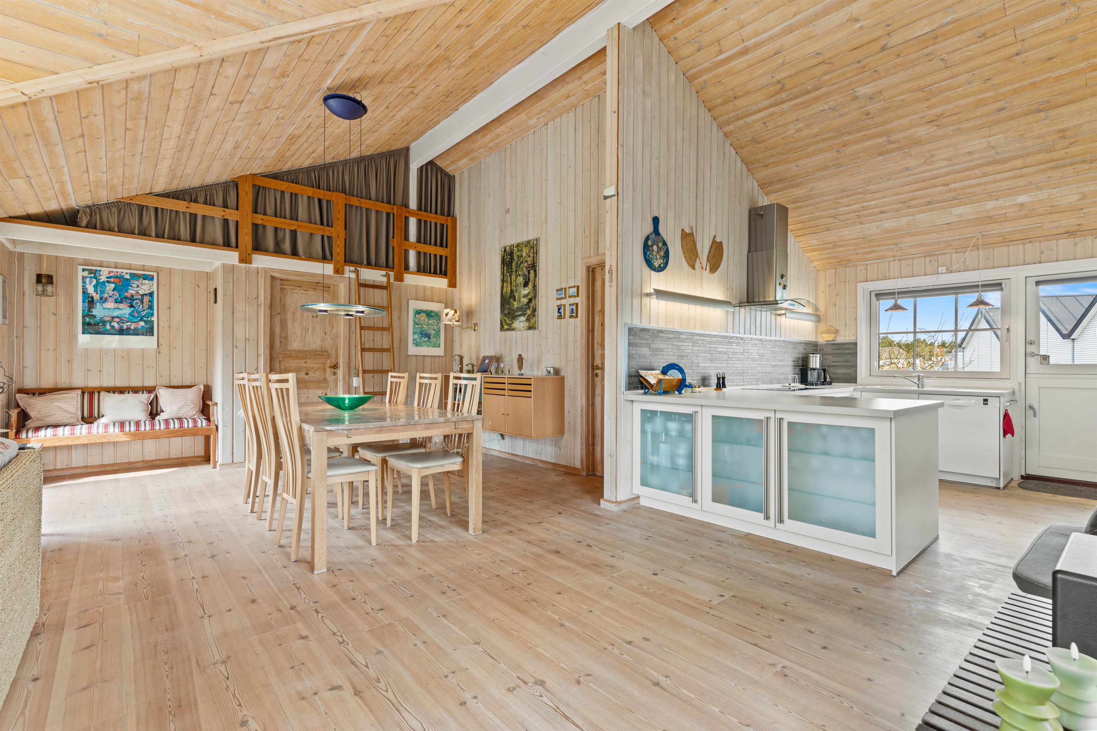 Det velindrettede køkken ligger i forbindelse med spisestuen og opholdsstuen med kip til loft hvor i sammen vil tilbringe gode ferieøjeblikke med hjemmelavede måltider ved spisebordet.