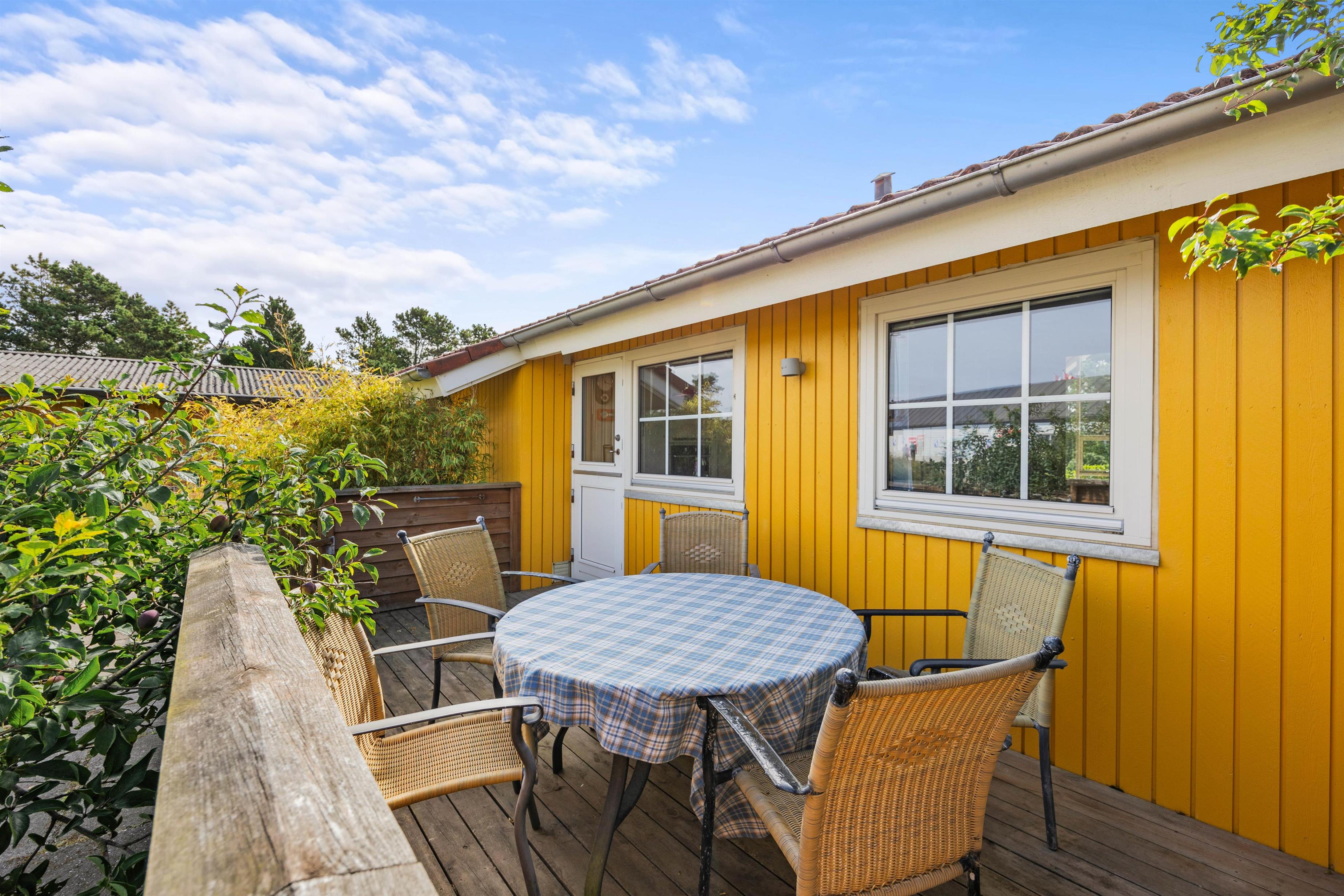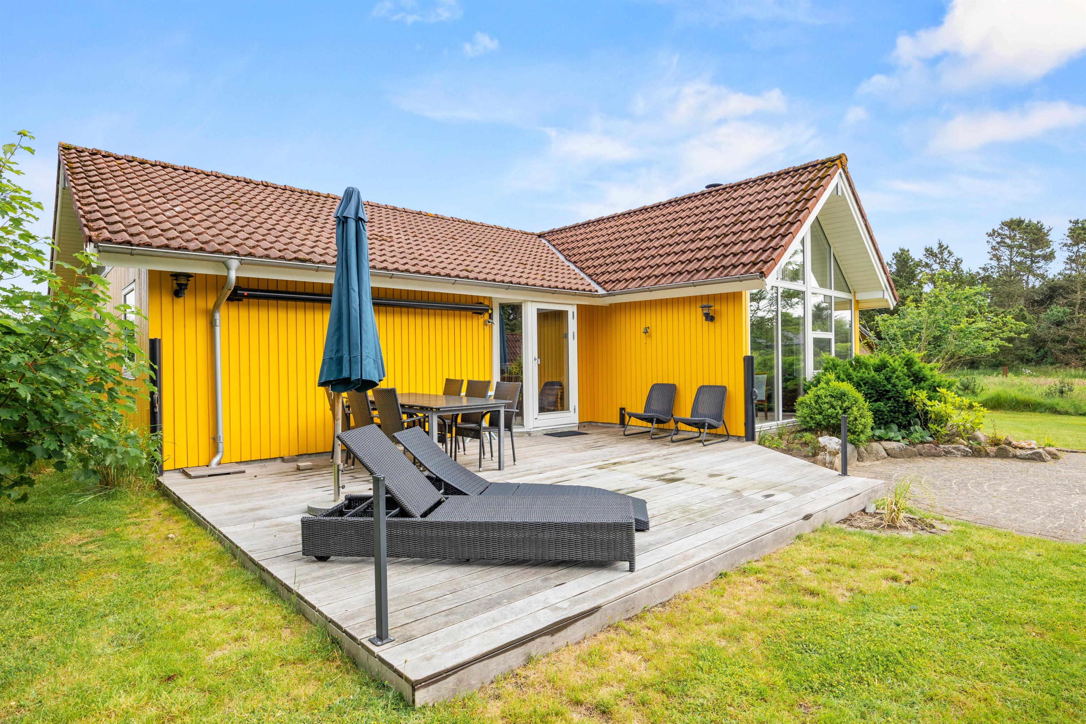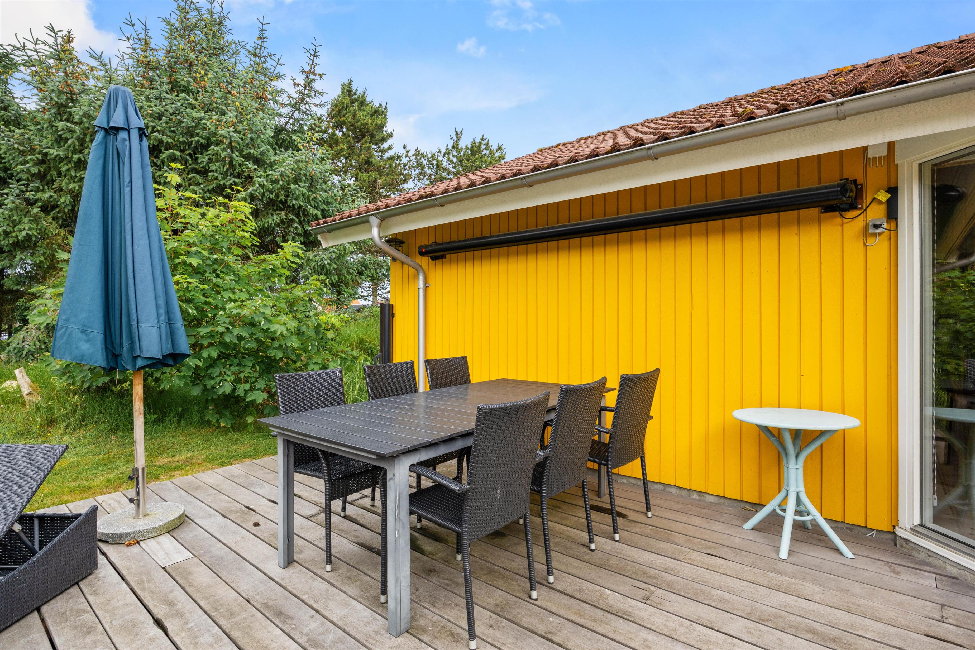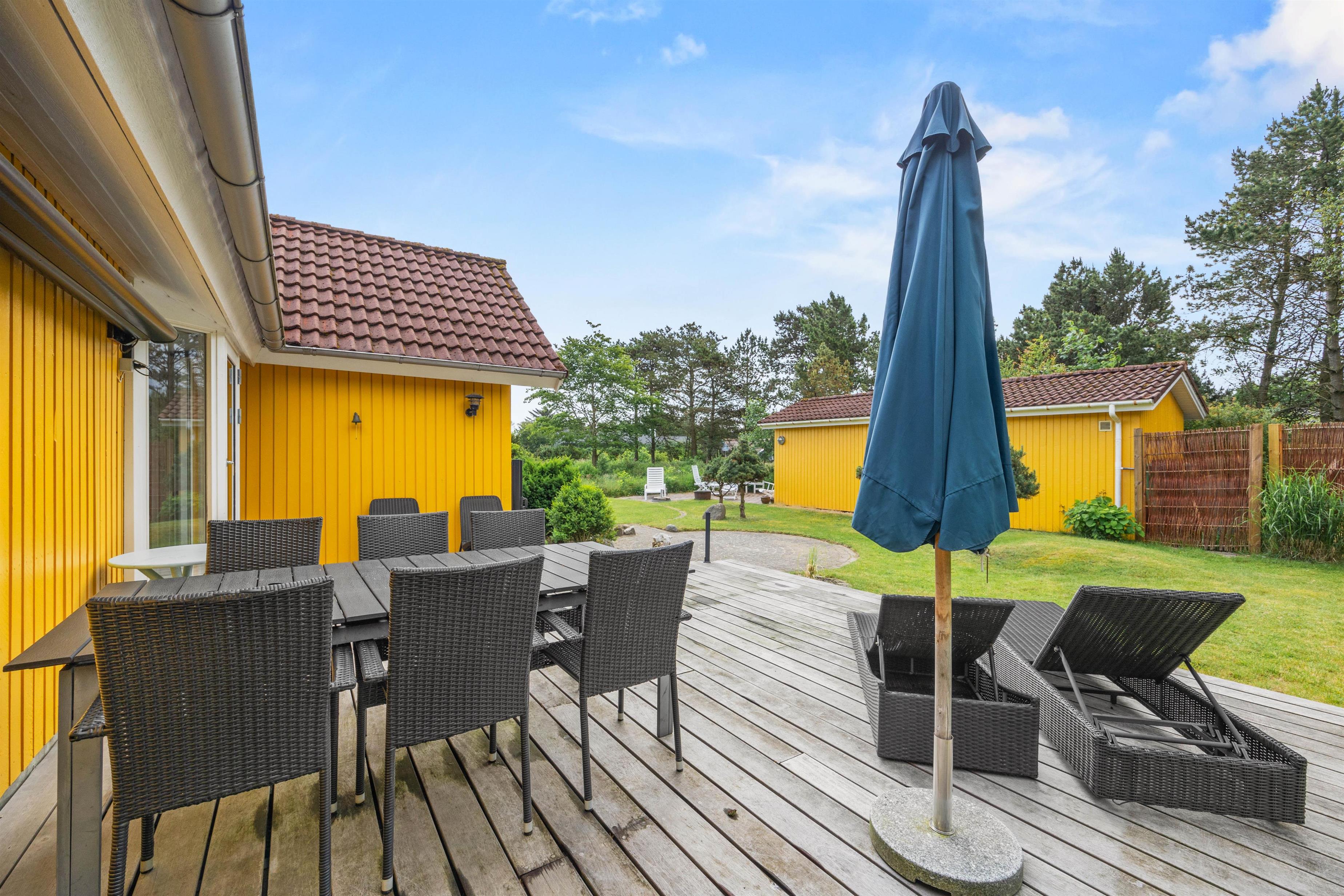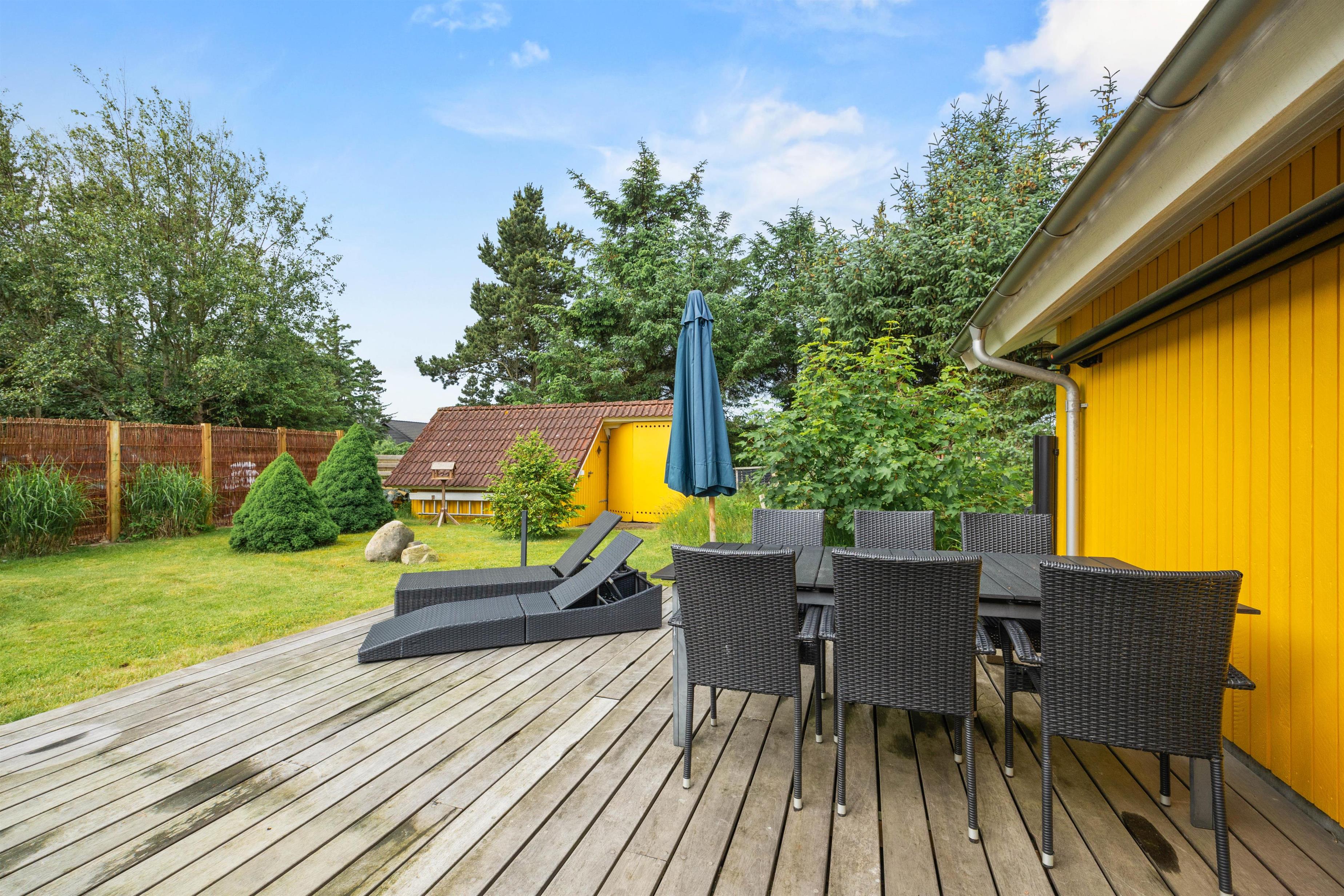Feriehuset råder over 2 gode terrasser - én foran huset og én bagved. Begge terrasser er udstyret med havemøbler. Den bagerste terrasse er også udstyret med 2 liggestole og har en udsigt til en dejlig velanlagt naturgrund. Her kan I nyde solen og opleve hyggelige aftentimer, måske med en dejlig grillmenu.