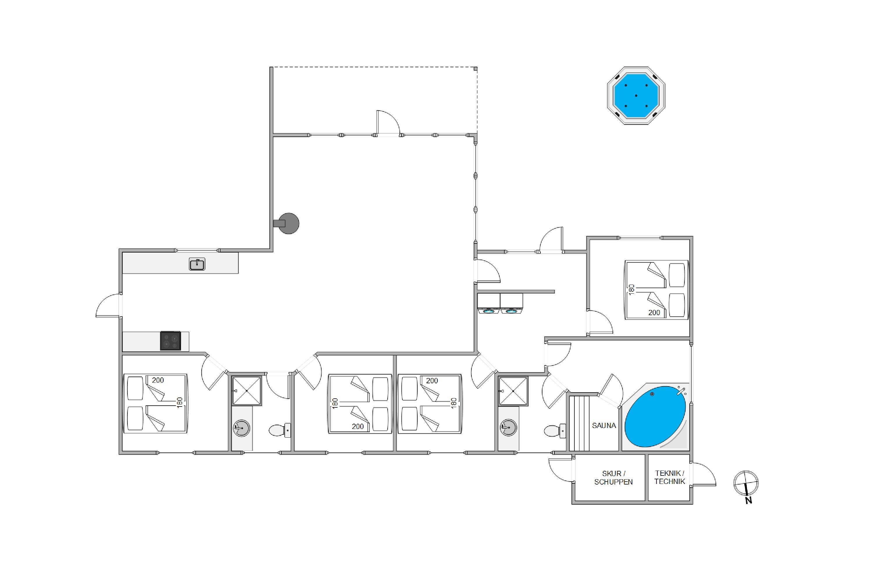 På disse aftner er det også oplagt at holde en velfortjent spaaften. På det ene badeværelse findes et stort boblebad til fem personer. Herfra er der også adgang til den varme sauna, som igen giver jer varmen efter en lang gåtur. Når timerne bliver sene, kan I fordele jer på de fire soveværelser. Alle værelser er udstyret med indbyggede skabe til opbevaring samt komfortable dobbeltsenge, der sikrer jer en god nattesøvn.