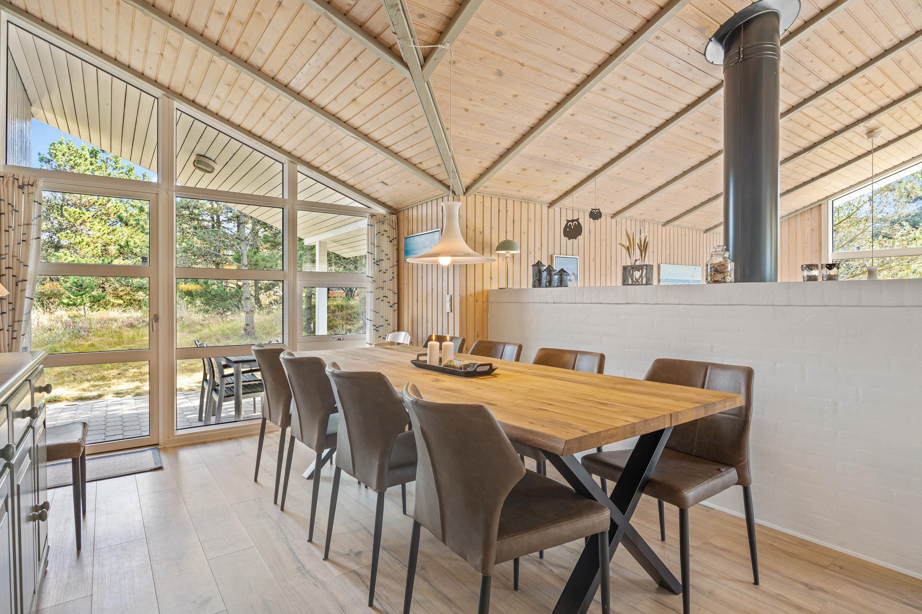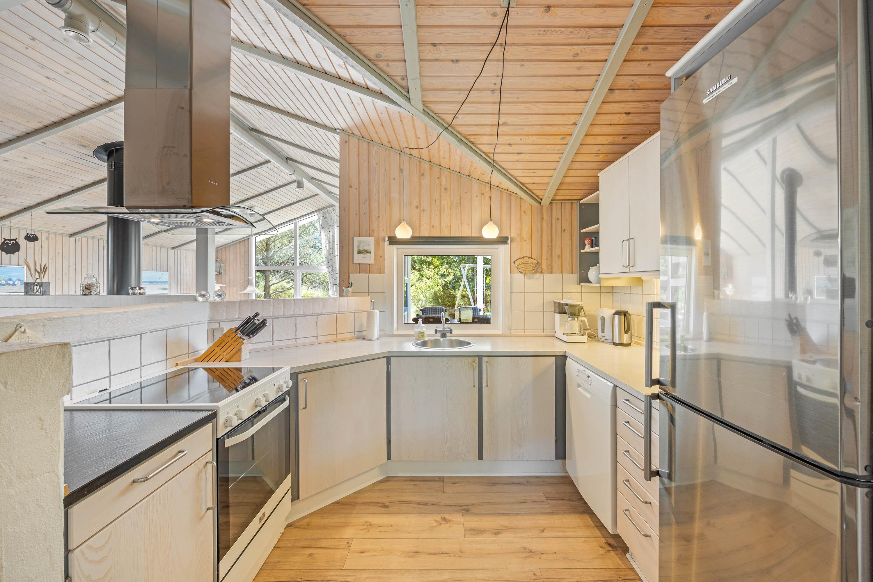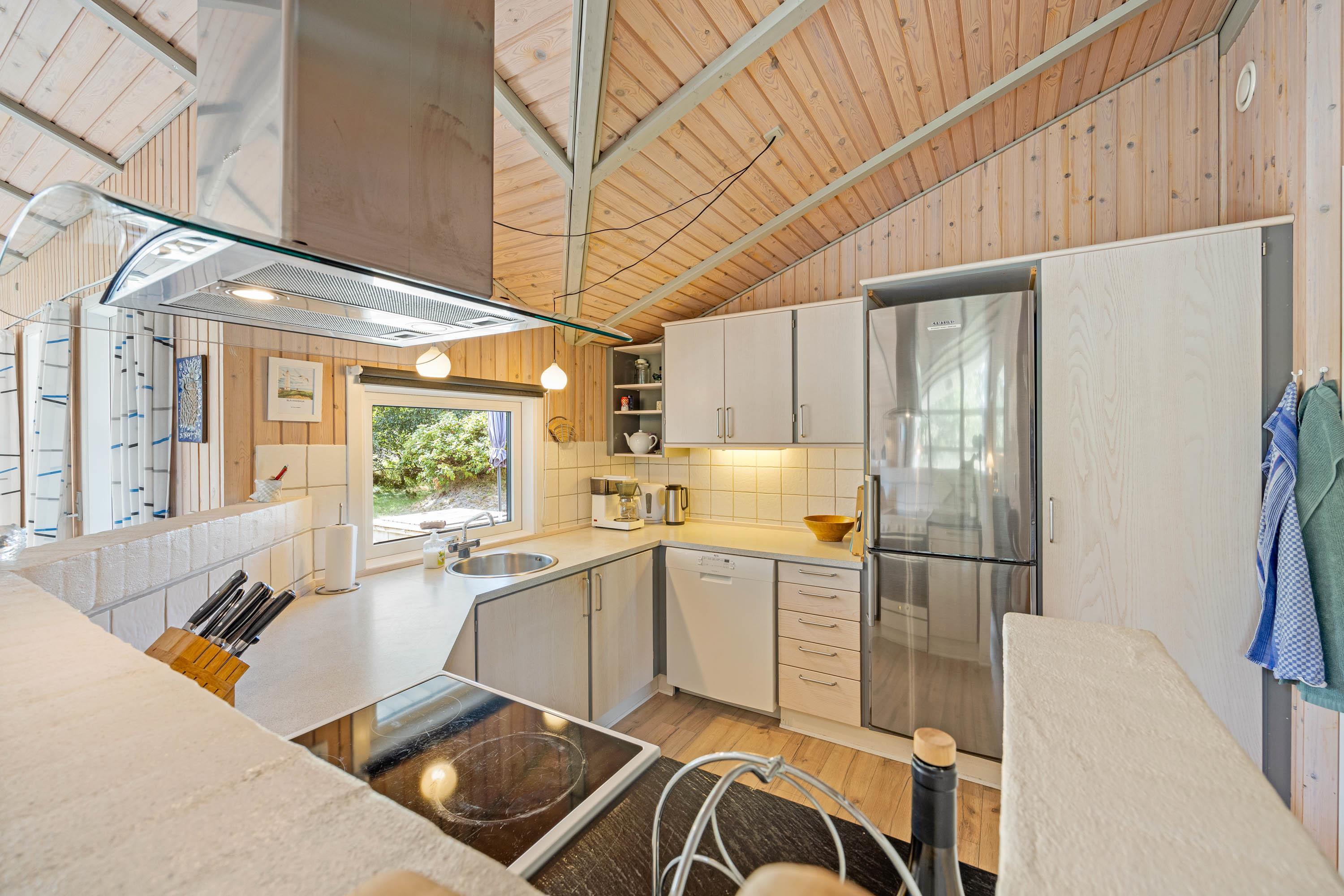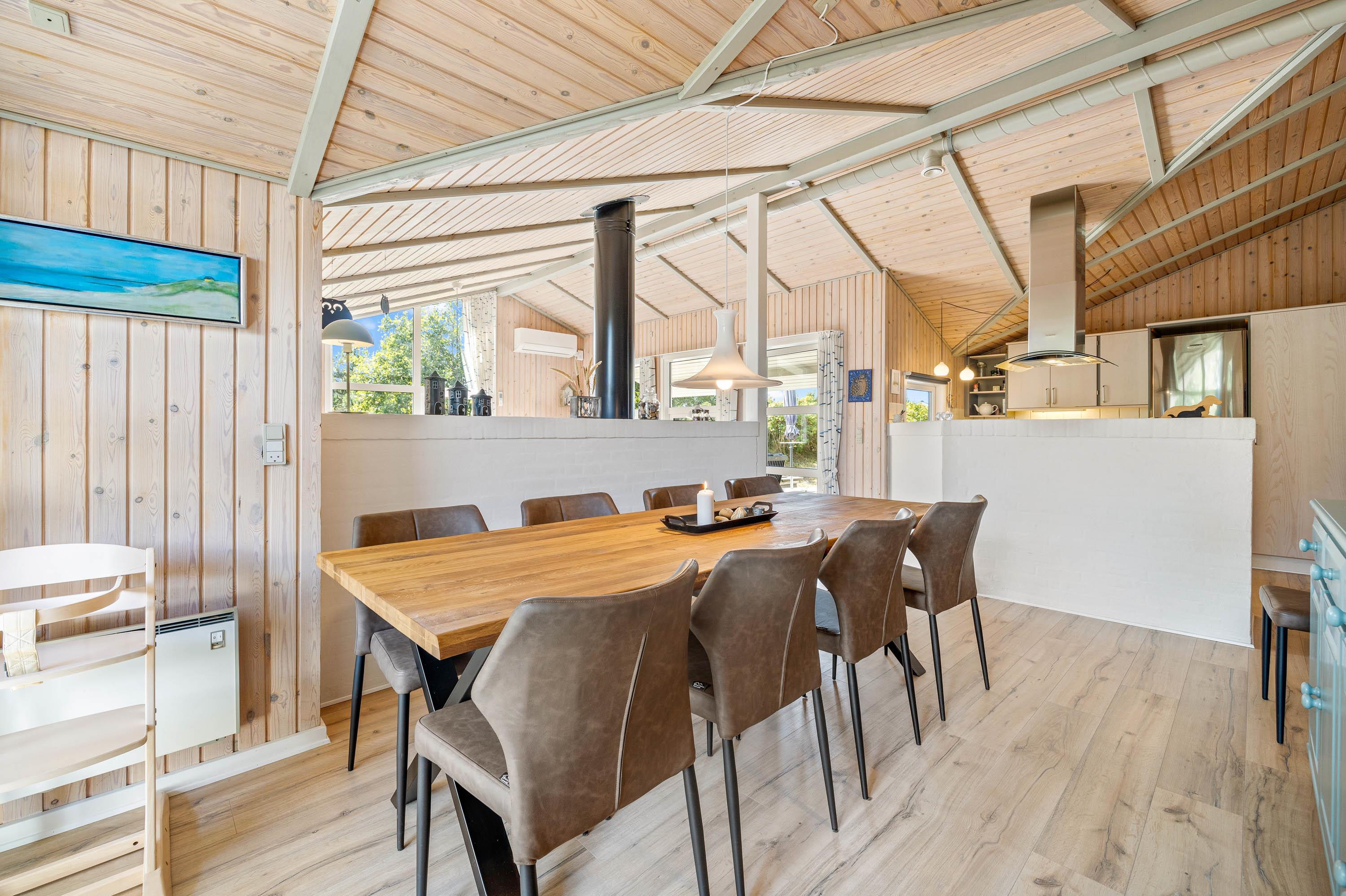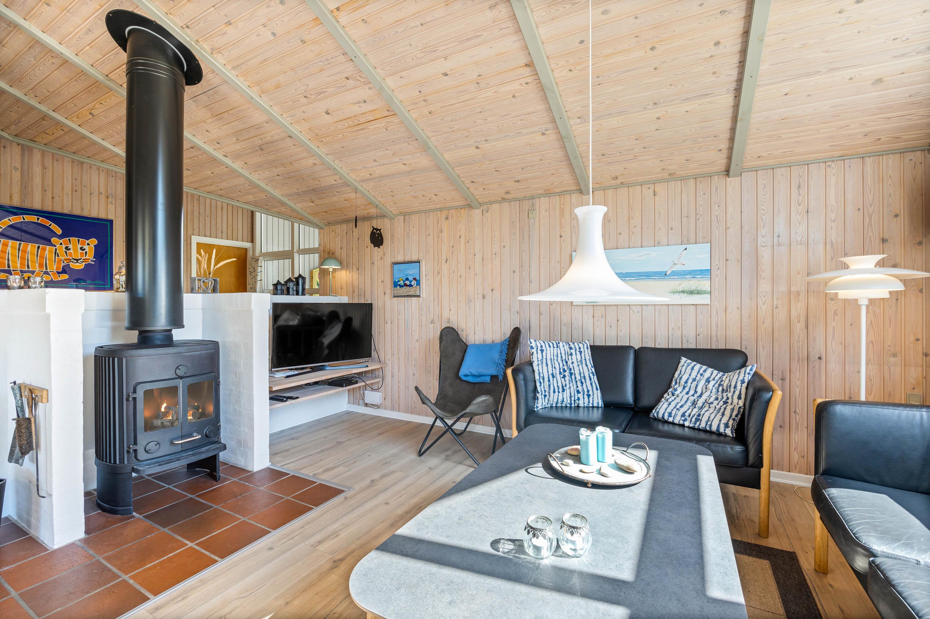 I det 125 kvadratmeter store sommerhus udgør alrummet jeres store samlingspunkt, og her kan I samles til mange hyggelige feriestunder, der akkompagneres af brændeovnens knitrende flammer i baggrunden. I alrummet kan I blandt andet være sammen om madlavningen i køkkenet eller samles i sofaerne til en god film.