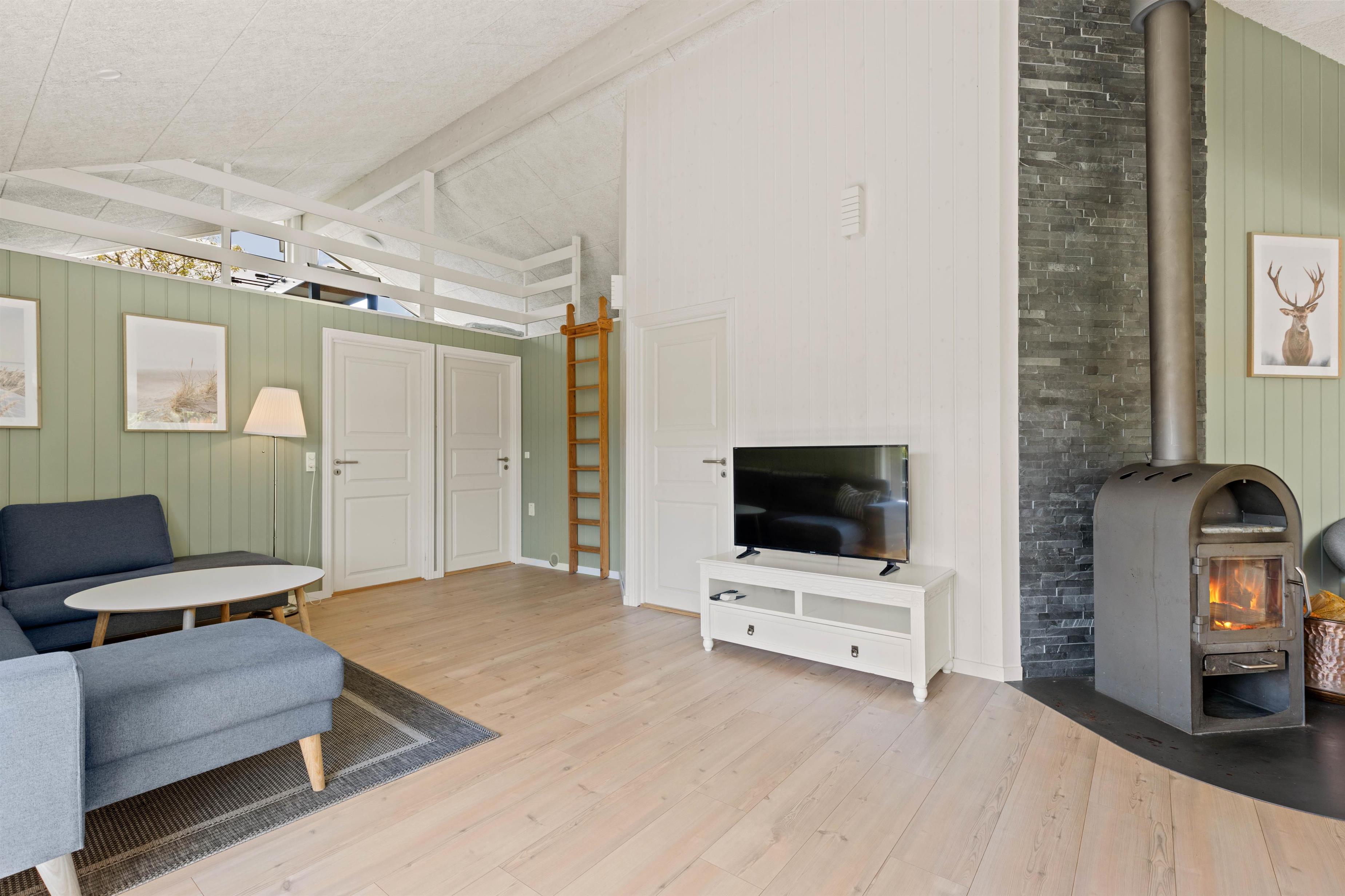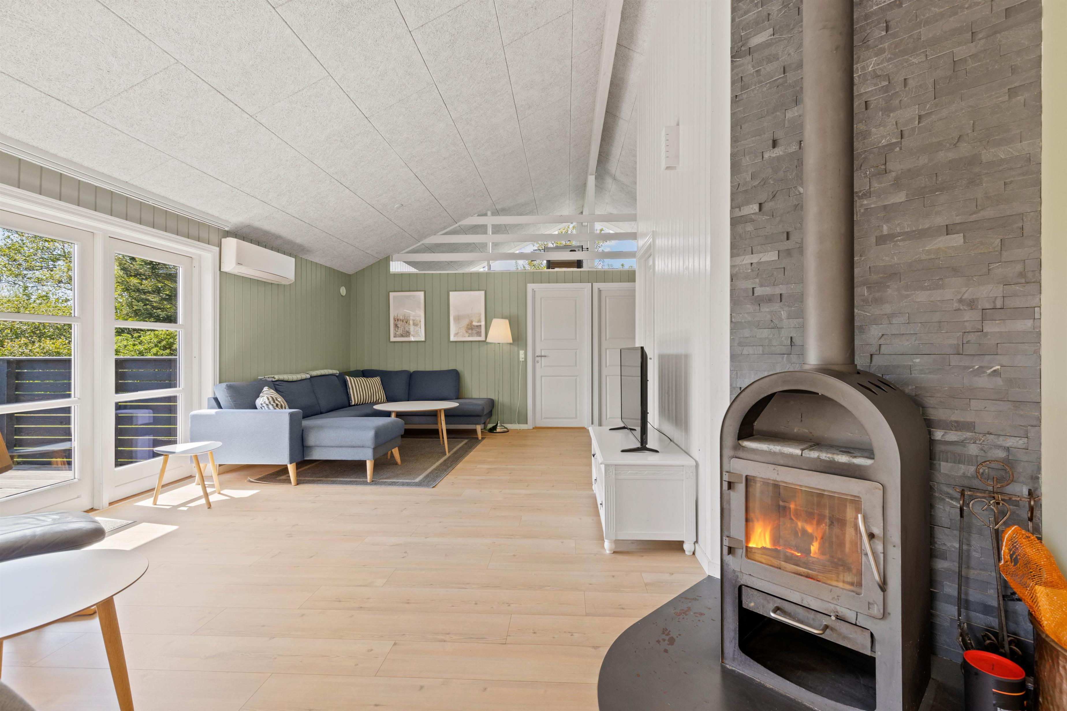 Den energibesparende varmepumpe sørger for, at I har et behageligt rumklima hele året rundt, og på i de kølige årstider bliver brændeovnen et sikkert hit - de knitrende flammer spreder ikke kun varme, men også en skøn atmosfære.