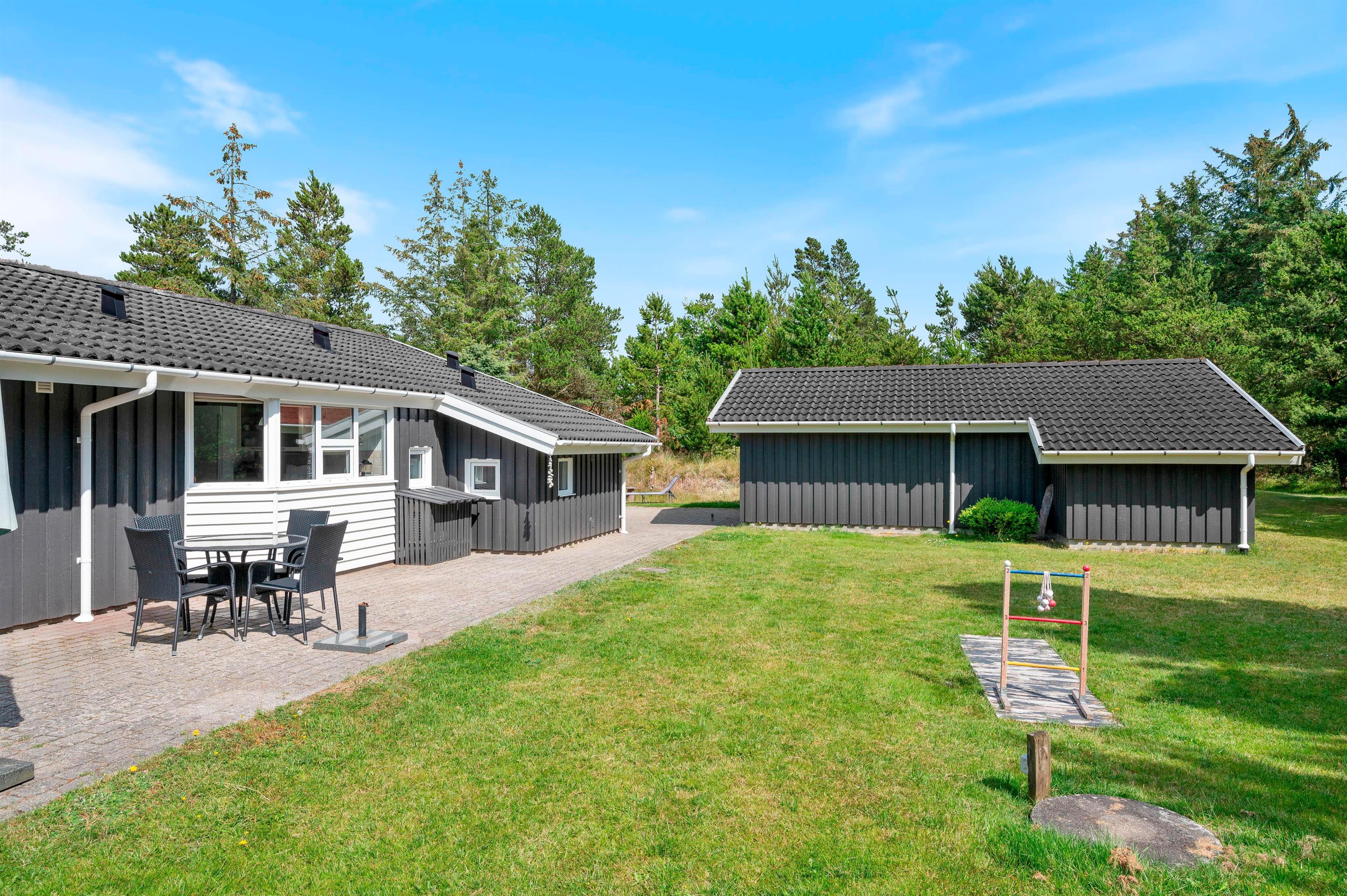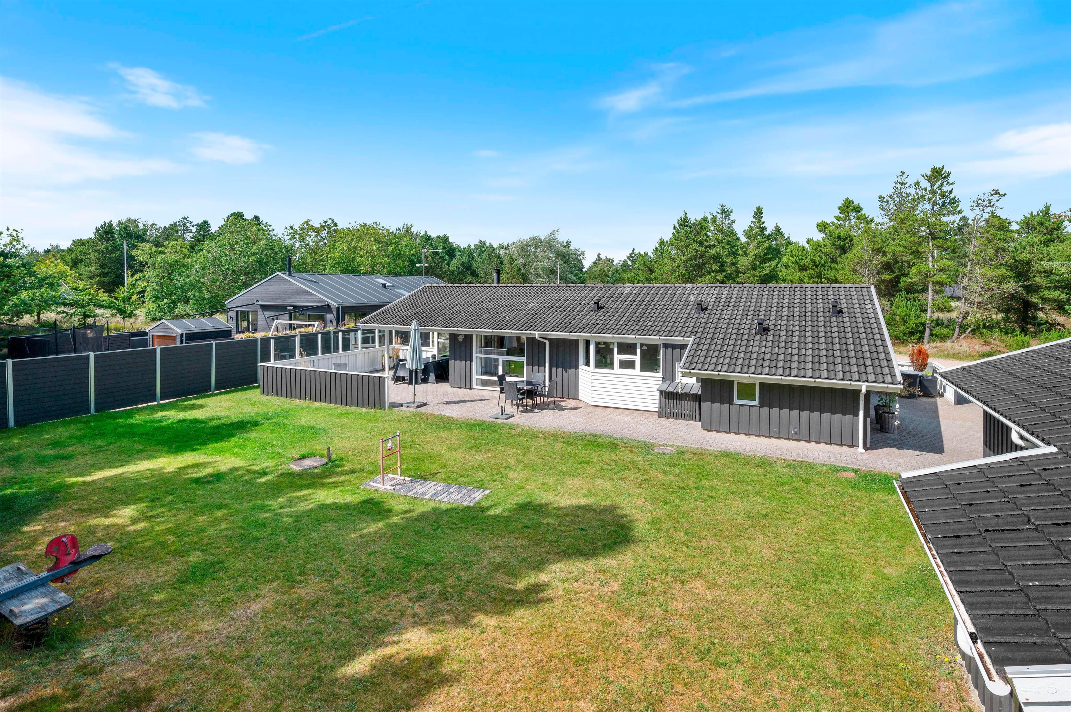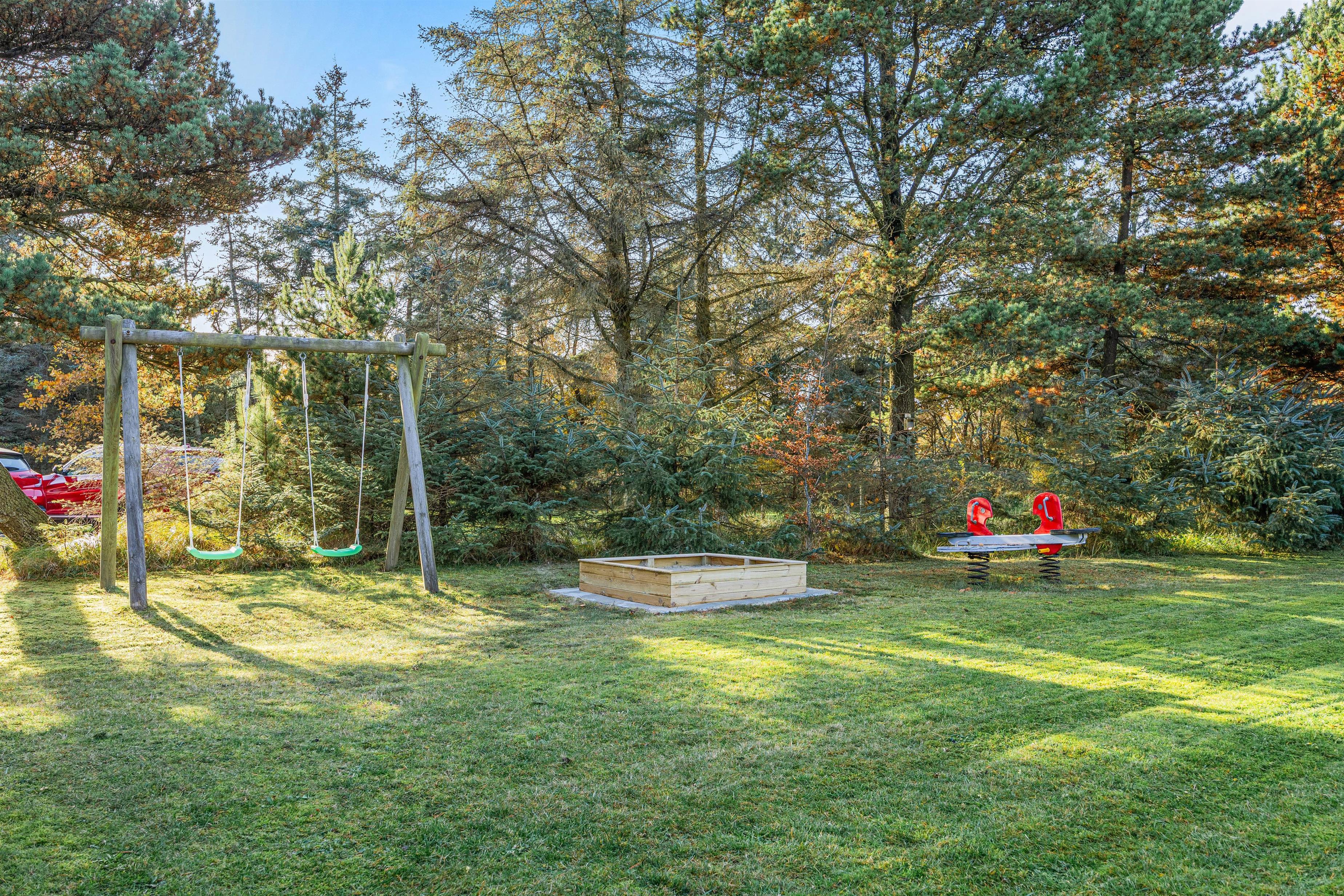 Det skønne feriehus er beliggende på en 2.469 kvadratmeter stor grund, som er omkranset af træer. I får derfor en ferie i private omgivelser med plads til at nyde den dejlige vestjyske natur. Den store naturgrund har et område med plæne samt sandkasse og gyngestativ - det skal nok være et hit hos de yngste feriegæster!