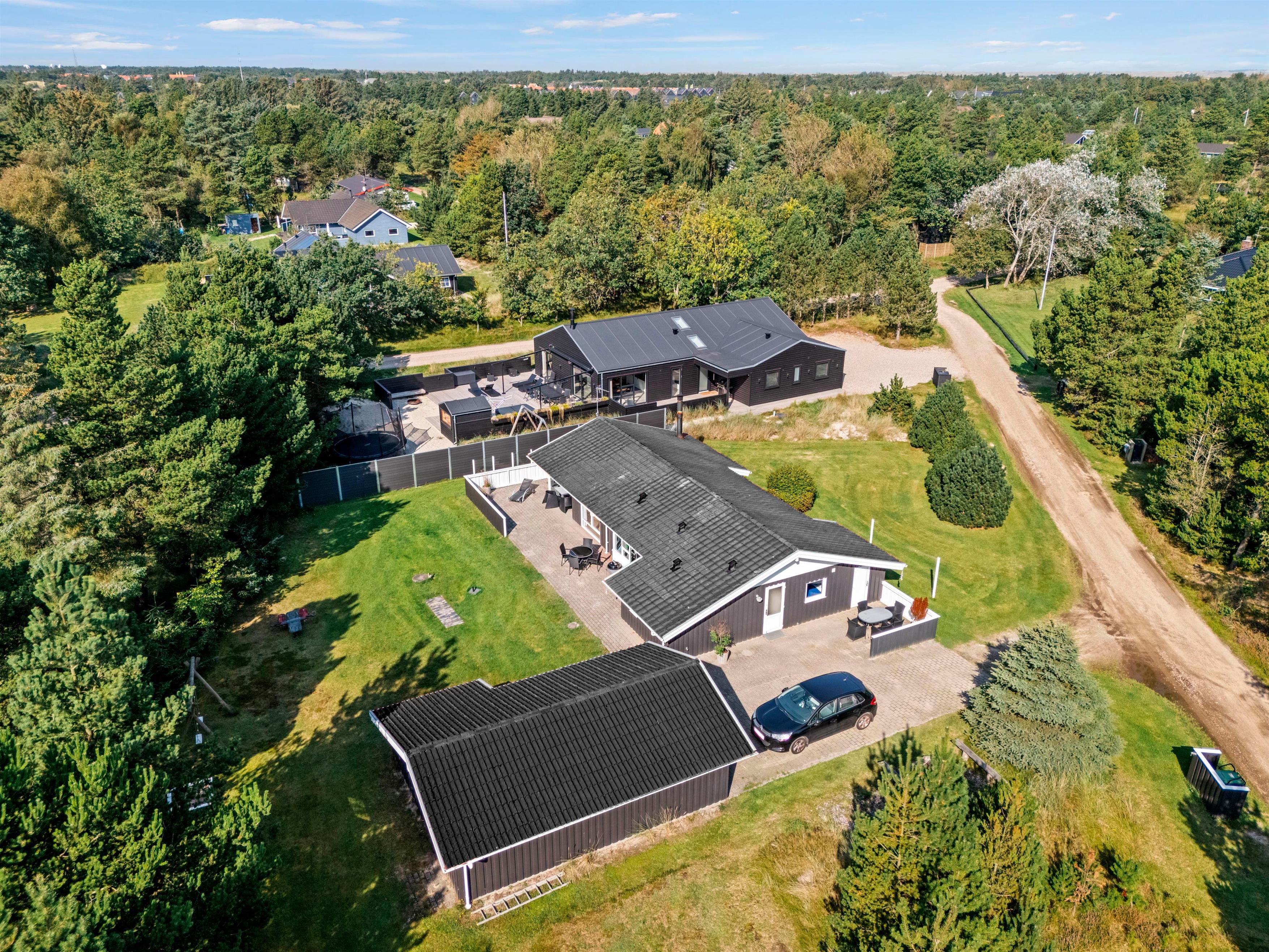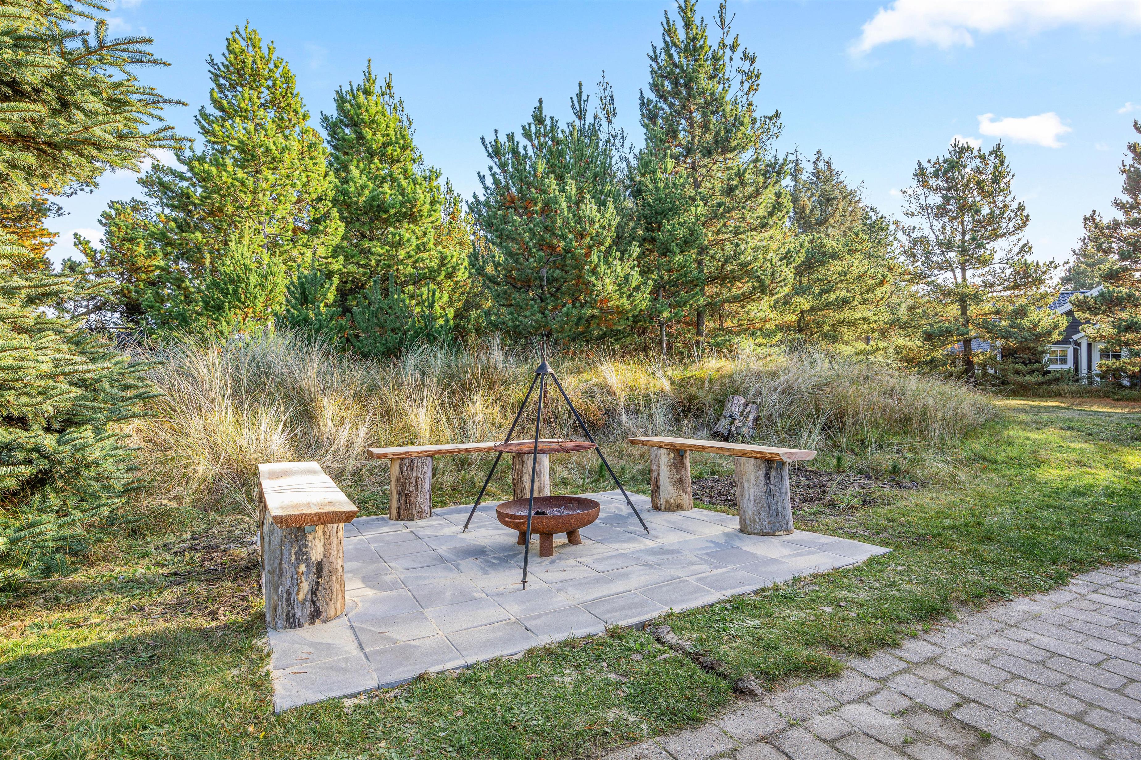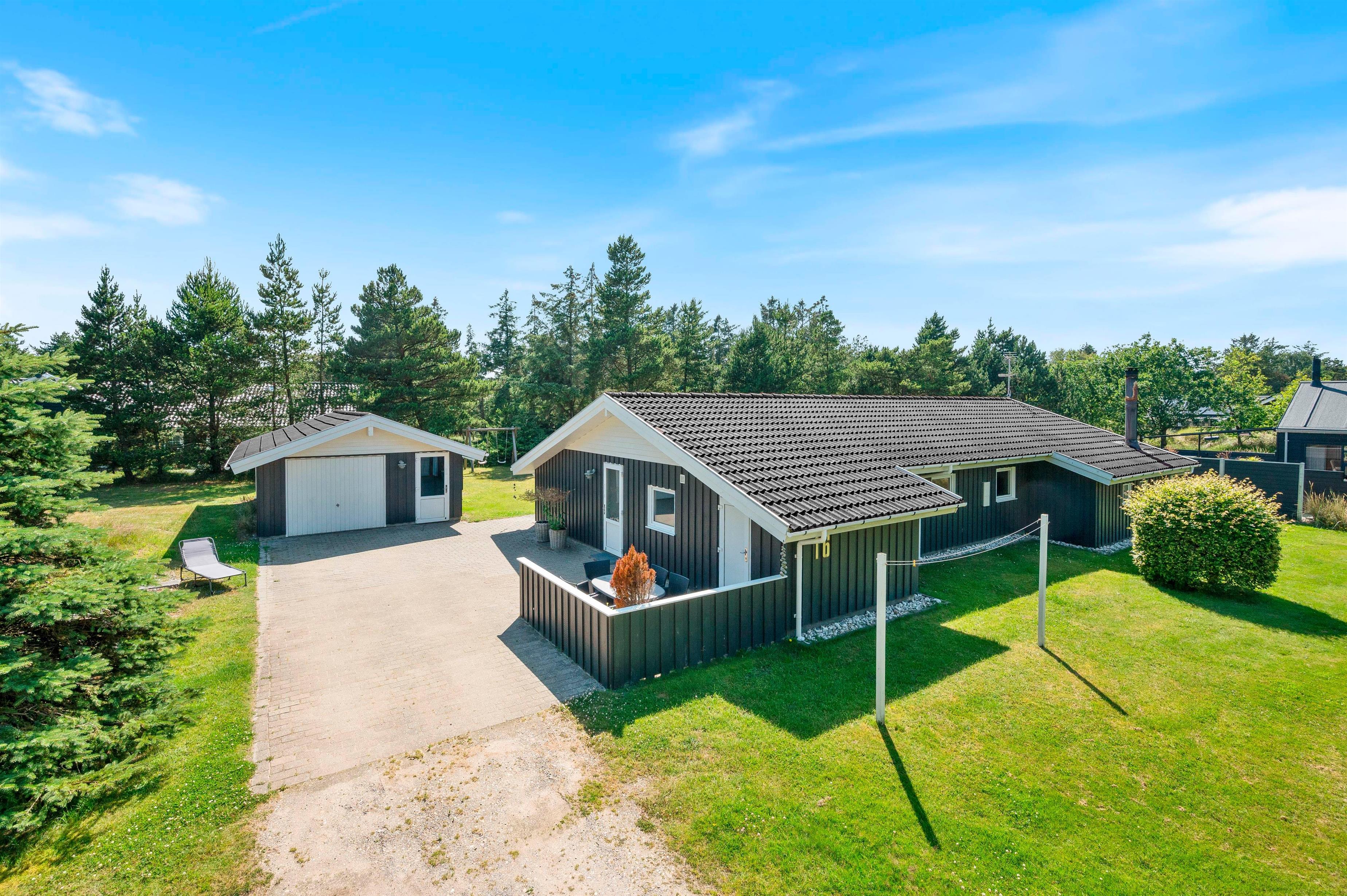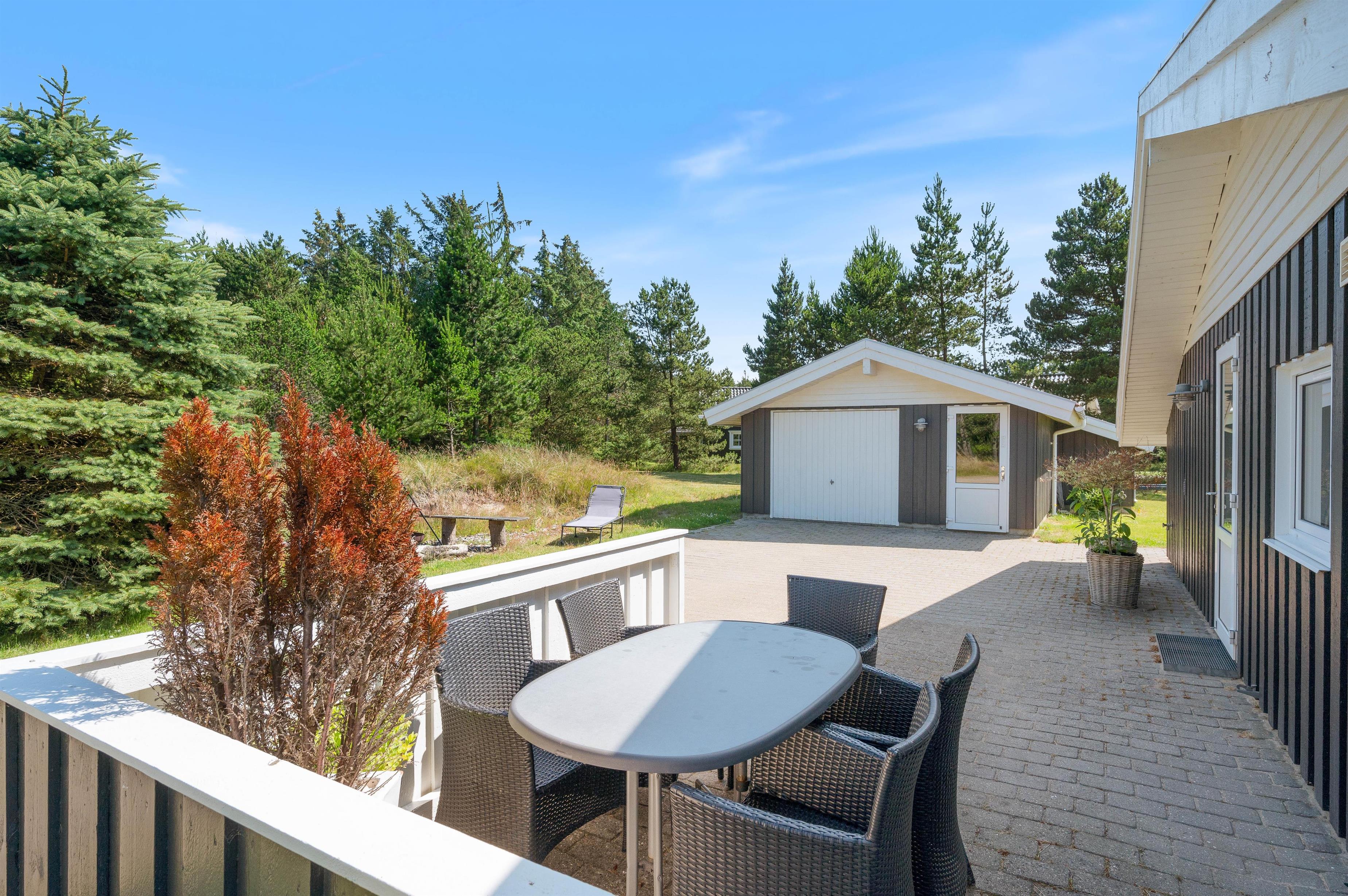 Det skønne feriehus er beliggende på en 2.469 kvadratmeter stor grund, som er omkranset af træer. I får derfor en ferie i private omgivelser med plads til at nyde den dejlige vestjyske natur. Den store naturgrund har et område med plæne samt sandkasse og gyngestativ - det skal nok være et hit hos de yngste feriegæster!